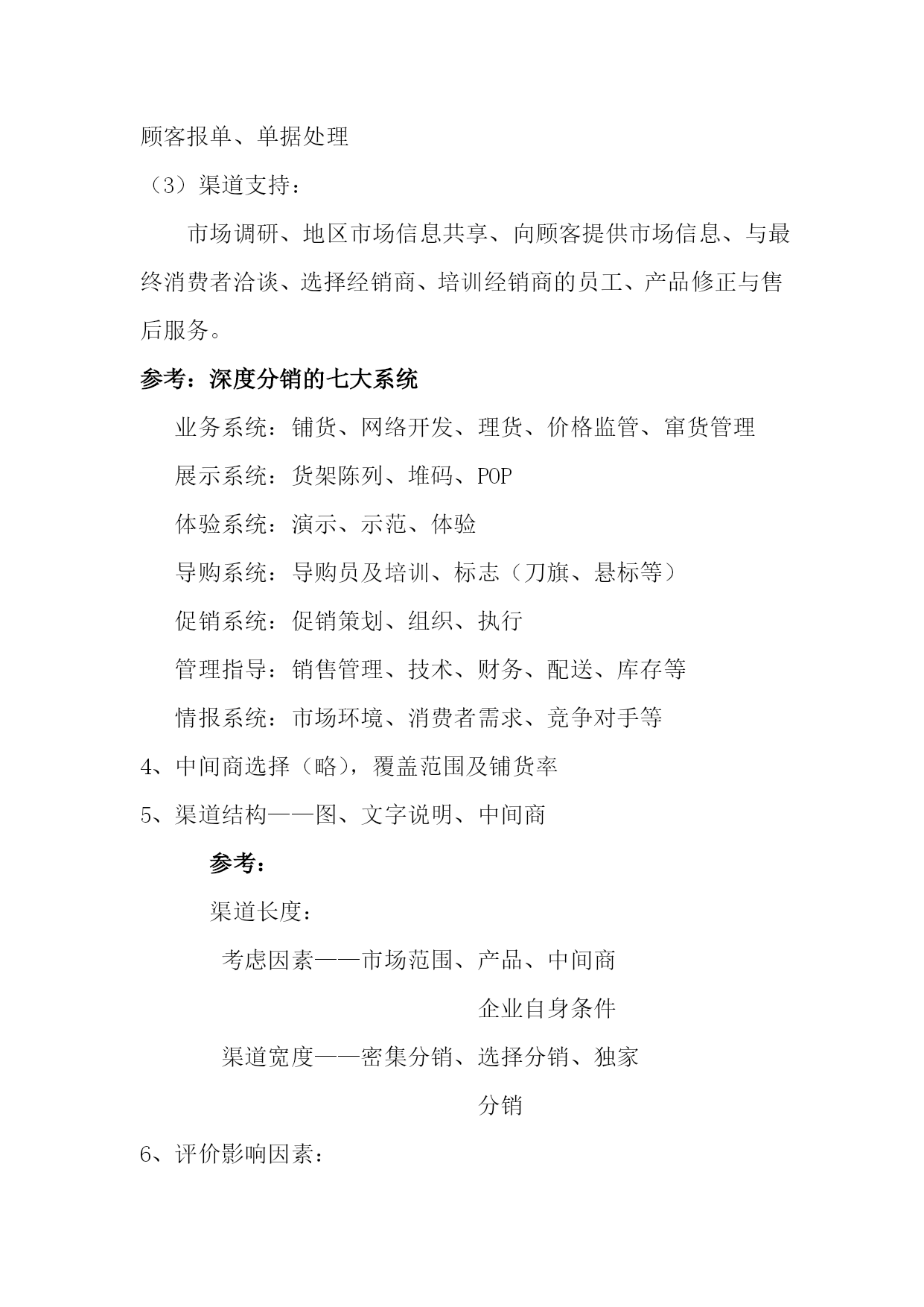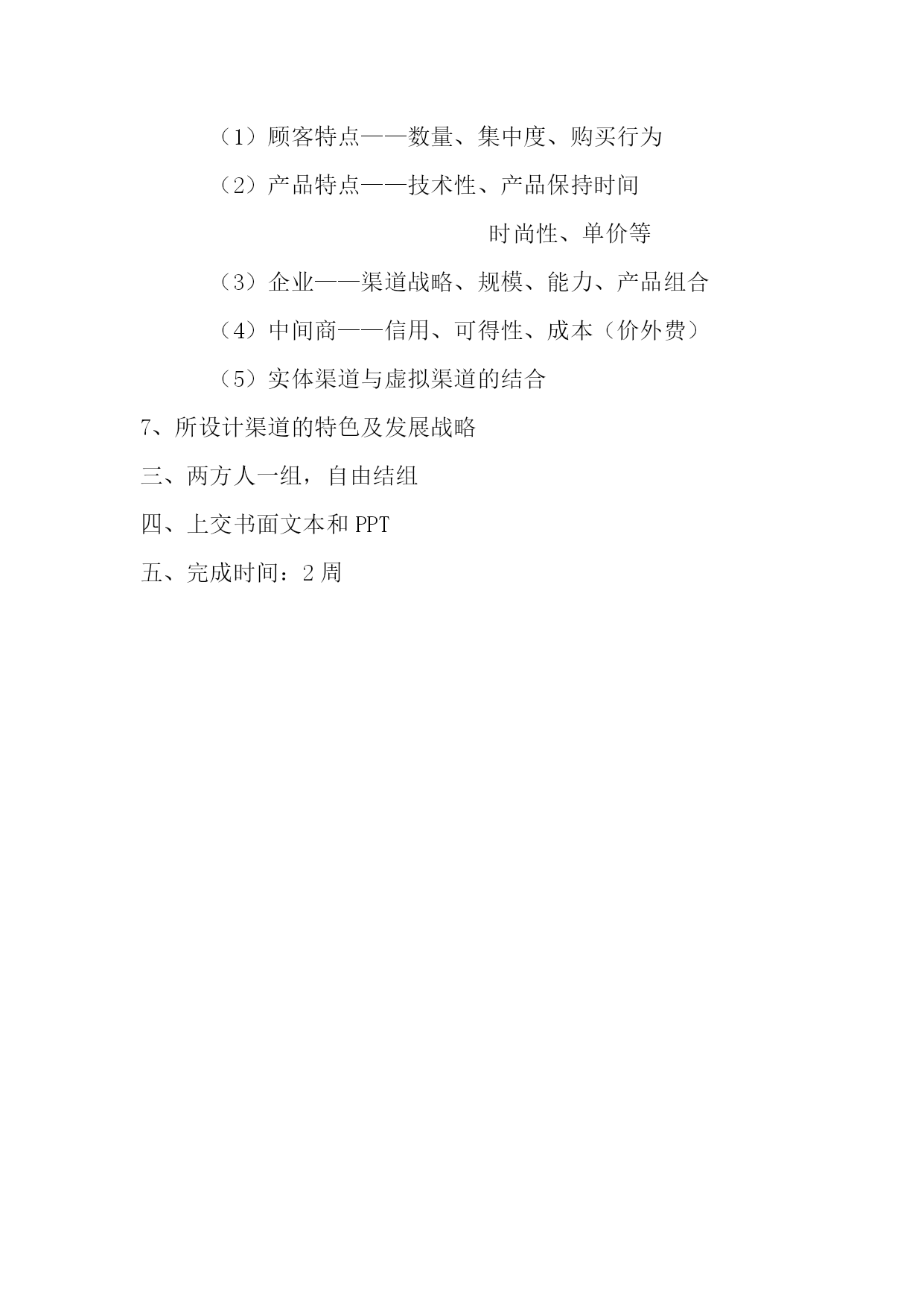 课程设计任务指导书要求:一、下列题目任选其一1、某中小新产品上市的渠道设计2、熟悉的企业的产品渠道设计3、熟悉的产品或企业的市场开发二、任务1、企业及产品特点,消费者分析,竞争对手分析。2、确定渠道结构和模式,直销、分销、长渠道、短渠道等,要求是实体与虚拟渠道结合的复合渠道,并说明选择的依据。3、确定渠道目标和任务渠道目标:市场目标——占领市场、目标顾客市场区域——销售范围市场份额——竞争销售目标——一定时期销售量渠道任务(1)销售:新产品市场推广、现有产品推广、向最终消费者促销、建立零售展厅、价格谈判与销售形式的确定。(2)物流:存货、订单处理、产品运输、与最终消费者的信用交易、向顾客报单、单据处理(3)渠道支持:市场调研、地区市场信息共享、向顾客提供市场信息、与最终消费者洽谈、选择经销商、培训经销商的员工、产品修正与售后服务。参考:深度分销的七大系统业务系统:铺货、网络开发、理货、价格监管、窜货管理展示系统:货架陈列、堆码、POP体验系统:演示、示范、体验导购系统:导购员及培训、标志(刀旗、悬标等)促销系统:促销策划、组织、执行管理指导:销售管理、技术、财务、配送、库存等情报系统:市场环境、消费者需求、竞争对手等4、中间商选择(略),覆盖范围及铺货率5、渠道结构——图、文字说明、中间商参考:渠道长度:考虑因素——市场范围、产品、中间商企业自身条件渠道宽度——密集分销、选择分销、独家分销6、评价影响因素:(1)顾客特点——数量、集中度、购买行为(2)产品特点——技术性、产品保持时间时尚性、单价等(3)企业——渠道战略、规模、能力、产品组合(4)中间商——信用、可得性、成本(价外费)(5)实体渠道与虚拟渠道的结合7、所设计渠道的特色及发展战略三、两方人一组,自由结组四、上交书面文本和PPT五、完成时间:2周