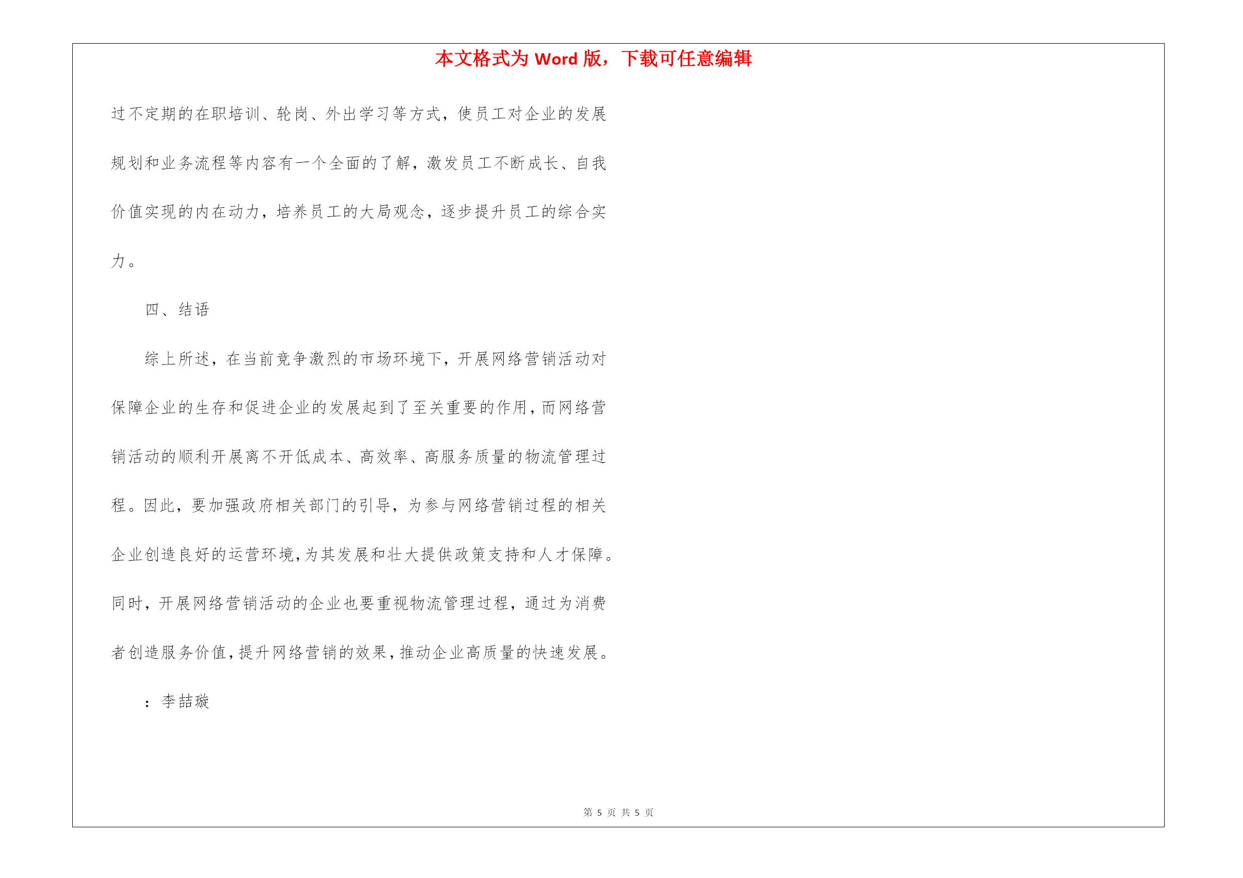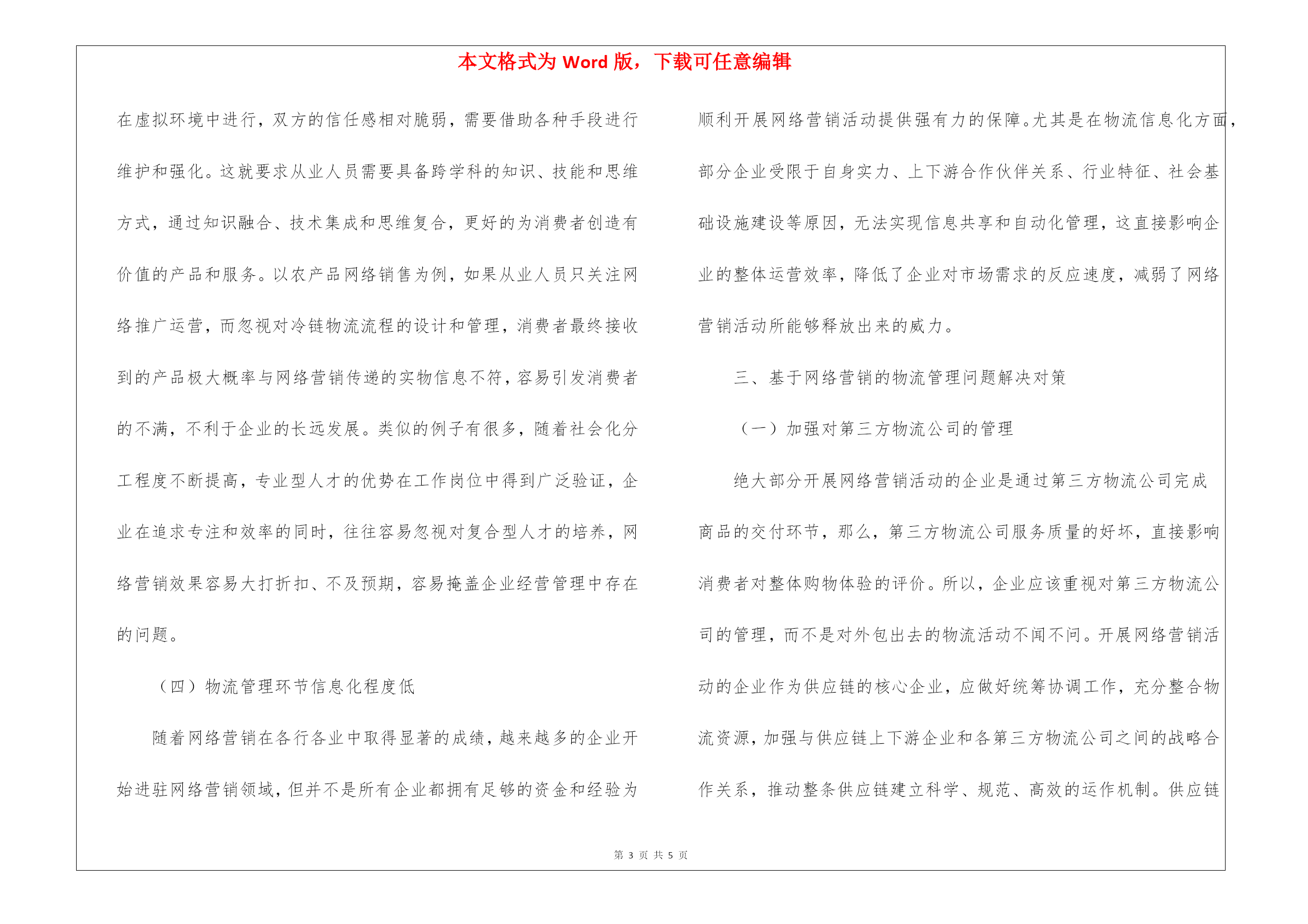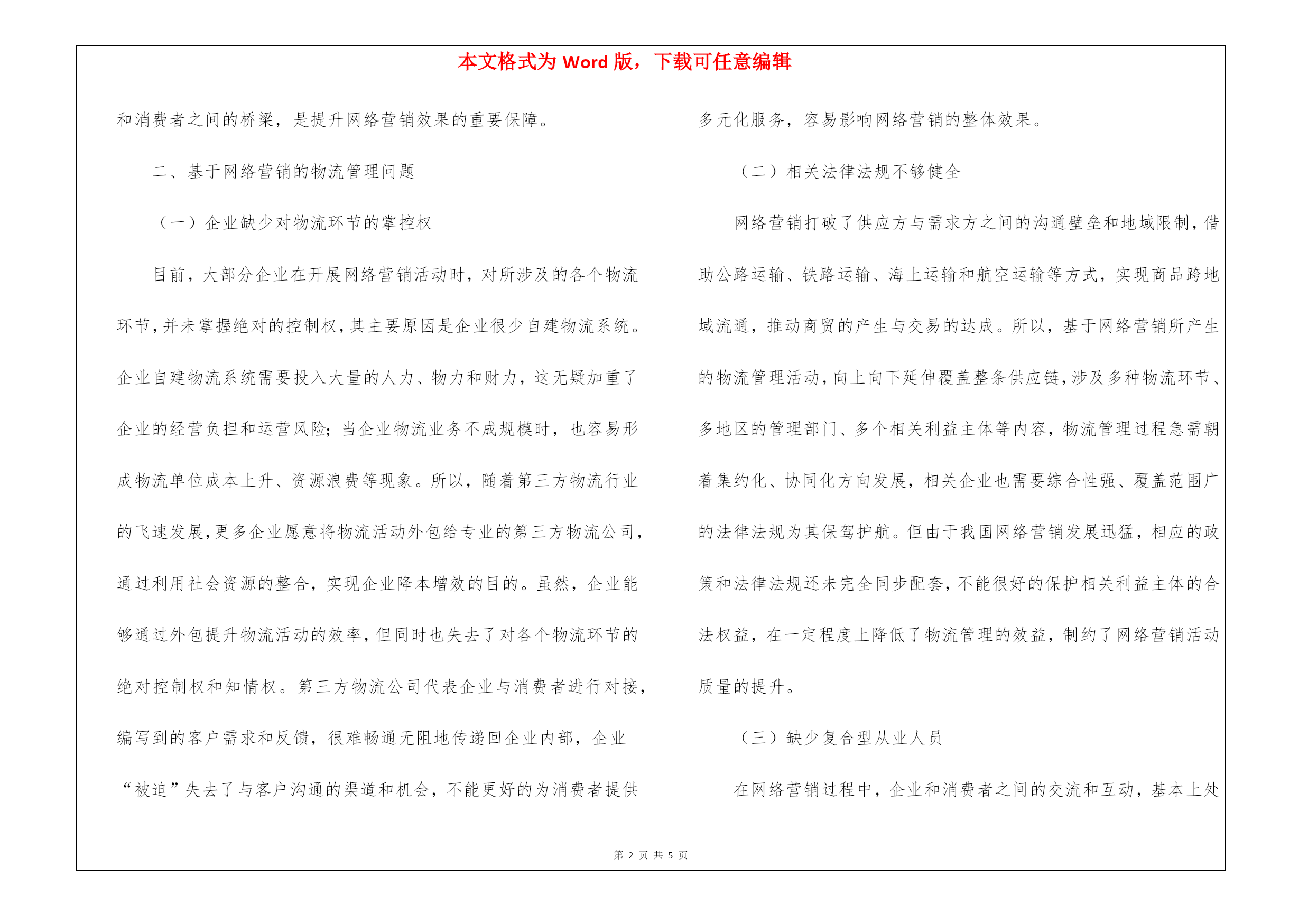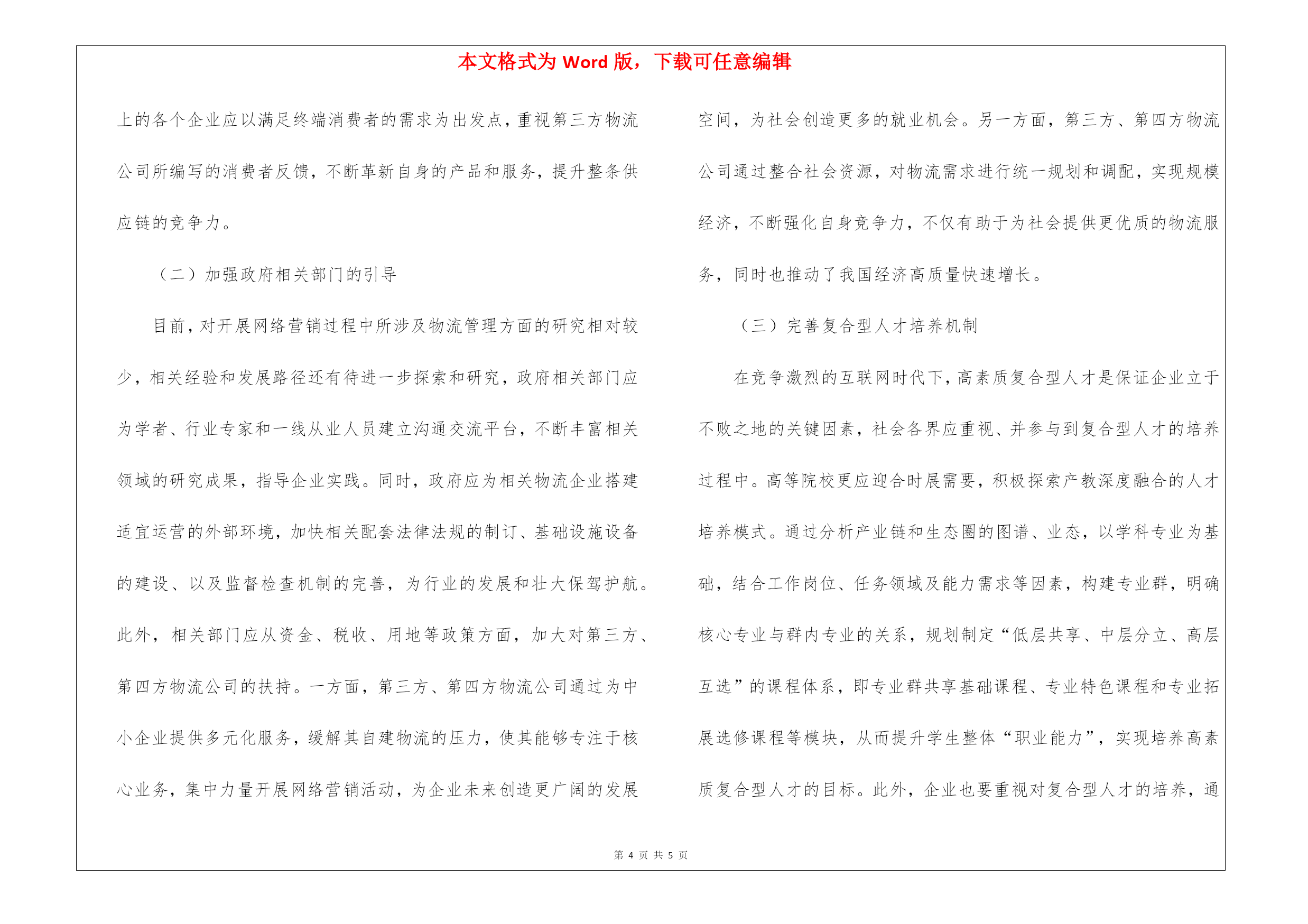 本文格式为Word版,下载可任意编辑第PAGE\*MERGEFORMAT5页共NUMPAGES\*MERGEFORMAT5页网络营销物流管理问题解决对策21世纪是网络化的时代,商业贸易的“主战场”从线下实体店铺逐步转向线上虚拟网络平台,网络营销成为社会经济发展的重要组成部分。企业通过互联网与消费者进行“近距离”的沟通和交流,向消费者传递产品信息、企业文化、品牌认知等内容,为消费者提供个性化服务,潜移默化地影响消费者的行为。尤其是在疫情期间,网络购物方式进一步得到了普及和认可,这为网络营销的发展开辟了广阔的空间。而网络营销效果的好坏,离不开物流活动的支持。加强对物流过程的规划和管理,不仅有助于降低企业运营成本,还能够为消费者创造服务价值,从而促进网络营销活动的顺利开展。一、网络营销与物流(一)网络营销网络营销是一种综合性的服务活动,它借助互联网技术将企业与消费者连接起来,通过为用户提供有价值的产品与服务,满足用户的实际需求,来实现企业自身的战略目标。与传统营销相比,网络营销可以打破时间与空间的限制,与消费者进行互动和交流;能够更好的挖掘不同人群的潜在需求,有针对性的提供个性化服务;能够为企业发展注入新的活力,带来新的生机。(二)物流物流的发展经历了漫长而曲折的过程,直到近现代物流的概念才被各国学者明确定义下来,即物流是物品从供应地向接收地实体流动的过程,根据实际需要,将运输、储存、装卸搬运、包装、流通加工、配送、信息处理等基本功能实施有机地结合。(三)网络营销与物流的关系物流是网络营销过程的重要环节之一,它发生在消费者做出购买决策之后,决定了消费者的购物体验、消费者的购买决策是否继续执行、消费者能否转化为忠实用户、企业能否树立良好的品牌形象等问题。因此,物流在网络营销过程中,承担着承上启下的作用,是企业和消费者之间的桥梁,是提升网络营销效果的重要保障。二、基于网络营销的物流管理问题(一)企业缺少对物流环节的掌控权目前,大部分企业在开展网络营销活动时,对所涉及的各个物流环节,并未掌握绝对的控制权,其主要原因是企业很少自建物流系统。企业自建物流系统需要投入大量的人力、物力和财力,这无疑加重了企业的经营负担和运营风险;当企业物流业务不成规模时,也容易形成物流单位成本上升、资源浪费等现象。所以,随着第三方物流行业的飞速发展,更多企业愿意将物流活动外包给专业的第三方物流公司,通过利用社会资源的整合,实现企业降本增效的目的。虽然,企业能够通过外包提升物流活动的效率,但同时也失去了对各个物流环节的绝对控制权和知情权。第三方物流公司代表企业与消费者进行对接,编写到的客户需求和反馈,很难畅通无阻地传递回企业内部,企业“被迫”失去了与客户沟通的渠道和机会,不能更好的为消费者提供多元化服务,容易影响网络营销的整体效果。(二)相关法律法规不够健全网络营销打破了供应方与需求方之间的沟通壁垒和地域限制,借助公路运输、铁路运输、海上运输和航空运输等方式,实现商品跨地域流通,推动商贸的产生与交易的达成。所以,基于网络营销所产生的物流管理活动,向上向下延伸覆盖整条供应链,涉及多种物流环节、多地区的管理部门、多个相关利益主体等内容,物流管理过程急需朝着集约化、协同化方向发展,相关企业也需要综合性强、覆盖范围广的法律法规为其保驾护航。但由于我国网络营销发展迅猛,相应的政策和法律法规还未完全同步配套,不能很好的保护相关利益主体的合法权益,在一定程度上降低了物流管理的效益,制约了网络营销活动质量的提升。(三)缺少复合型从业人员在网络营销过程中,企业和消费者之间的交流和互动,基本上处在虚拟环境中进行,双方的信任感相对脆弱,需要借助各种手段进行维护和强化。这就要求从业人员需要具备跨学科的知识、技能和思维方式,通过知识融合、技术集成和思维复合,更好的为消费者创造有价值的产品和服务。以农产品网络销售为例,如果从业人员只关注网络推广运营,而忽视对冷链物流流程的设计和管理,消费者最终接收到的产品极大概率与网络营销传递的实物信息不符,容易引发消费者的不满,不利于企业的长远发展。类似的例子有很多,随着社会化分工程度不断提高,专业型人才的优势在工作岗位中得到广泛验证,企业在追求专注和效率的同时,往往容易忽视对复合型人才的培养,网络营销效果容易大打折扣、不及预期,容易掩盖企业经营管理中存在的问题。(四)物流管理环节信息化程度低随着网络营销在各行各业中取得显著的成绩,越来越多的企业开始进驻网络营销领域,但并不是所有企业都拥有足够的资金和经验为顺利开展网络营销活动提供强有力的保障。尤其是在物流信息化方面,部分企业受限于自身实力、上下游合作伙伴关系、行业特征、社会基础设施建设等原因,无法实现信息共享和自动化管理,这直接影响企业的整体运营效率,降低了企业对市场需求的反应速度,减