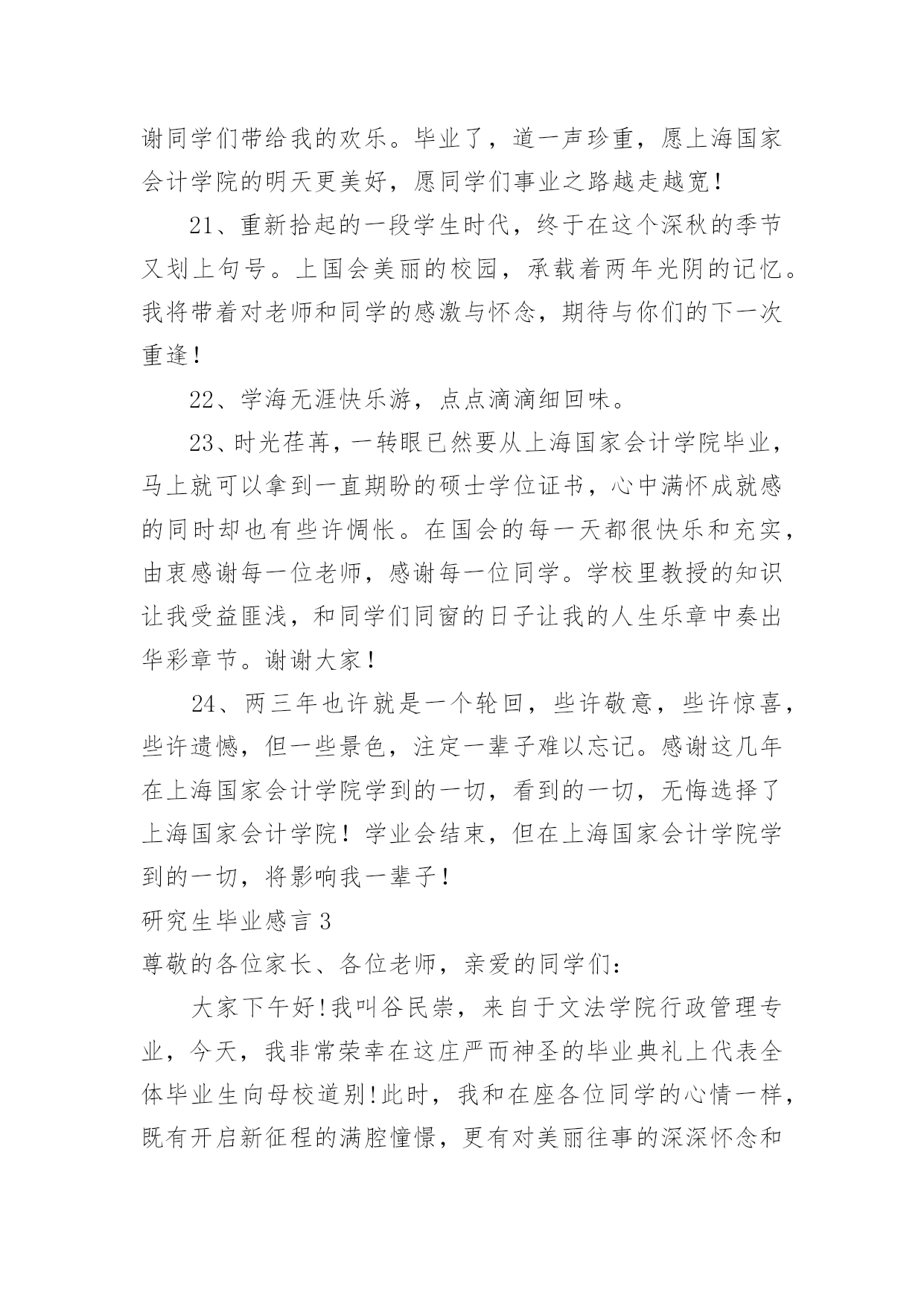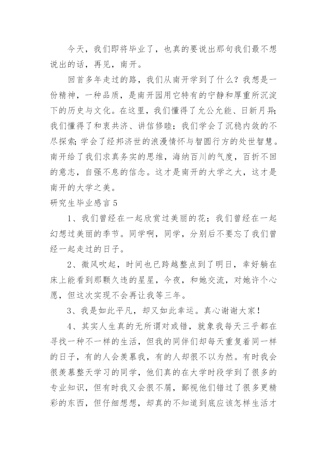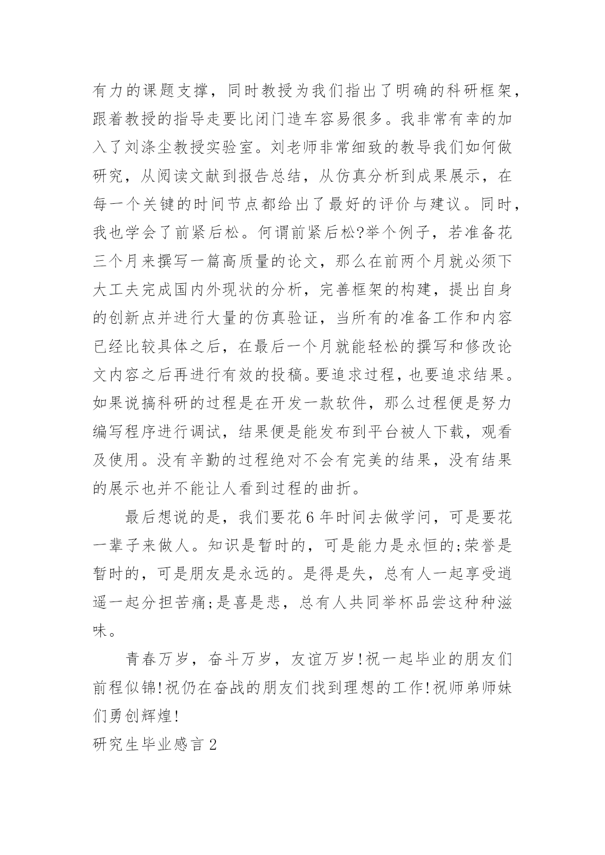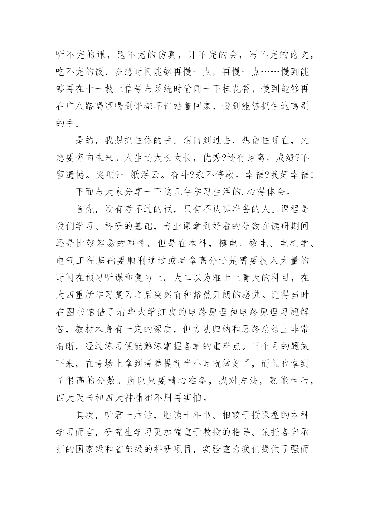 研究生毕业感言[必备]研究生毕业感言在平时的学习、工作或生活中,我们常常会因经历的人和事不同而产生新的感想,这时就可以写一篇感言将其记下来。那么如何写感言才能更有感染力呢?下面是小编为大家收集的研究生毕业感言,欢迎大家分享。研究生毕业感言1又是一年樱花落。徜徉在樱花大道上,似乎看到了第一年的我顶着卷卷短发没心没肺的傻笑,第二年的我牵着温暖大手无忧无虑的漫步,第三年的我揣着紧张情绪步履匆匆的路过,第四年的我捧着清甜椰子走马观花的晃悠,第五年的我端着笨重相机小心翼翼的拍照,今年,突然开始舍不得。舍不得在湖边把头发吹得轻飘飘的大风,舍不得昏黄灯光下三三两两的倒影,舍不得从牌坊走到电气院的小路,舍不得图书馆四楼阅览室鱼缸里的小乌龟,舍不得二食堂的麻辣烫和烧鹅饭,舍不得回忆里的一点一滴,舍不得你。六年前还并不明白什么是电气,而今天电气已经在自己身上留下了深深的烙印。恍惚中,似乎还在寝室里通宵打牌第二天早上四个人去占高数第一排的位子睡觉;似乎还在人文馆的迎新晚会听架子鼓激动的快要泪流;似乎还在运动会夺冠后在明珠园放肆的碰杯和拥抱。美,在回望之时。不知不觉里,走了这么远,走了这么久。念不完的书,听不完的课,跑不完的仿真,开不完的会,写不完的论文,吃不完的饭,多想时间能够再慢一点,再慢一点……慢到能够再在十一教上信号与系统时偷闻一下桂花香,慢到能够再在广八路喝酒喝到谁都不许站着回家,慢到能够抓住这离别的手。是的,我想抓住你的手。想回到过去,想留住现在,又想要奔向未来。人生还太长太长,优秀?还有距离。成绩?不留遗憾。奖项?一纸浮云。奋斗?永不停歇。幸福?我好幸福!下面与大家分享一下这几年学习生活的.心得体会。首先,没有考不过的试,只有不认真准备的人。课程是我们学习、科研的基础,专业课拿到好看的分数在读研期间还是比较容易的事情。但是在本科,模电、数电、电机学、电气工程基础要顺利通过或者拿高分还是需要投入大量的时间在预习听课和复习上。大二以为难于上青天的科目,在大四重新学习复习之后突然有种豁然开朗的感觉。记得当时在图书馆借了清华大学红皮的电路原理和电路原理习题解答,教材本身有一定的深度,但方法归纳和思路总结上非常清晰,经过练习便能熟练掌握各章的重难点。三个月的题做下来,在考场上拿到考卷提前半小时就做好了,而且也拿到了很高的分数。所以只要精心准备,找对方法,熟能生巧,四大天书和四大神捕都不用再害怕。其次,听君一席话,胜读十年书。相较于授课型的本科学习而言,研究生学习更加偏重于教授的指导。依托各自承担的国家级和省部级的科研项目,实验室为我们提供了强而有力的课题支撑,同时教授为我们指出了明确的科研框架,跟着教授的指导走要比闭门造车容易很多。我非常有幸的加入了刘涤尘教授实验室。刘老师非常细致的教导我们如何做研究,从阅读文献到报告总结,从仿真分析到成果展示,在每一个关键的时间节点都给出了最好的评价与建议。同时,我也学会了前紧后松。何谓前紧后松?举个例子,若准备花三个月来撰写一篇高质量的论文,那么在前两个月就必须下大工夫完成国内外现状的分析,完善框架的构建,提出自身的创新点并进行大量的仿真验证,当所有的准备工作和内容已经比较具体之后,在最后一个月就能轻松的撰写和修改论文内容之后再进行有效的投稿。要追求过程,也要追求结果。如果说搞科研的过程是在开发一款软件,那么过程便是努力编写程序进行调试,结果便是能发布到平台被人下载,观看及使用。没有辛勤的过程绝对不会有完美的结果,没有结果的展示也并不能让人看到过程的曲折。最后想说的是,我们要花6年时间去做学问,可是要花一辈子来做人。知识是暂时的,可是能力是永恒的;荣誉是暂时的,可是朋友是永远的。是得是失,总有人一起享受逍遥一起分担苦痛;是喜是悲,总有人共同举杯品尝这种种滋味。青春万岁,奋斗万岁,友谊万岁!祝一起毕业的朋友们前程似锦!祝仍在奋战的朋友们找到理想的工作!祝师弟师妹们勇创辉煌!研究生毕业感言21、友情是一种广度,是一种浩荡宏大,可以随时栖身的理想港湾。艰难的人生我们不可能独立撑舟苦渡,只有大家共同荡起桨才能使渡海之舟乘风破浪,直济沧海!我的朋友们,让我们彼此挂念!2、今天,我要坚强地向这里挥一挥手,道一声:再见了,母校。离别之际,真诚地祝愿曾经给我授业解惑的老师们工作顺利、身体健康;祝愿我的同学们学有所用,事有所成。3、两年时间,匆匆而过,在这两年中,我们一起走来,一起奋斗,我们都有了各自的收获。又到了离别的时候,怀念每个星期大家在一起的时光,一起听着学校各位老师给我们的精彩讲课。如今我们有了更好的起点,祝愿我们都有更好的前程。同学们珍重,多联系!4、时光荏苒欢声笑语依稀绕梁,水乳交融师恩友情浓聚于心,致一份谢意,道一声珍重。5、我从读书到现在一直有一个愿望,就是希望能走出广西,到外面的世界去看一看以丰富自己的