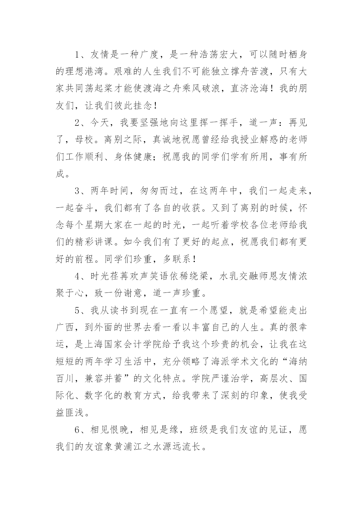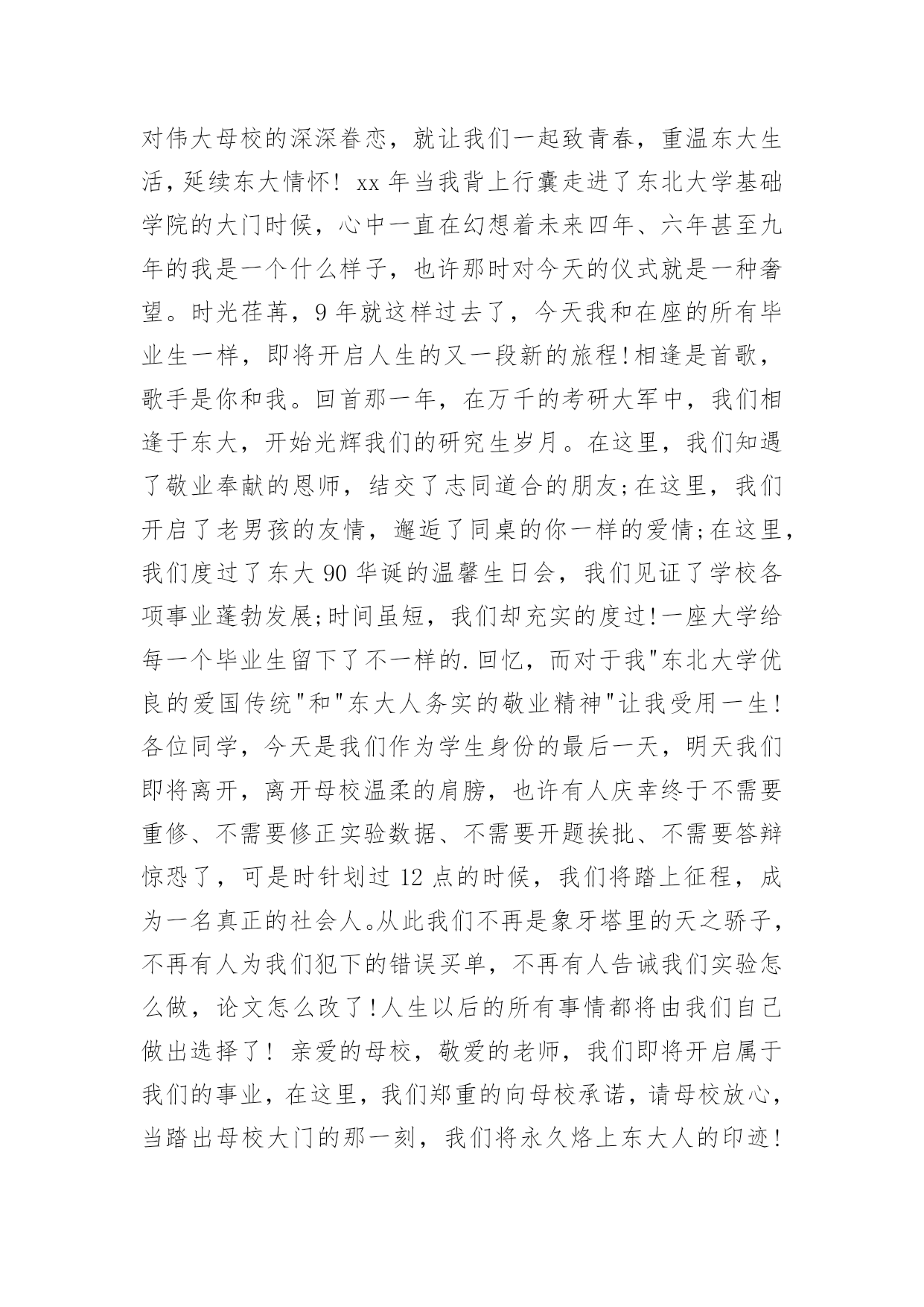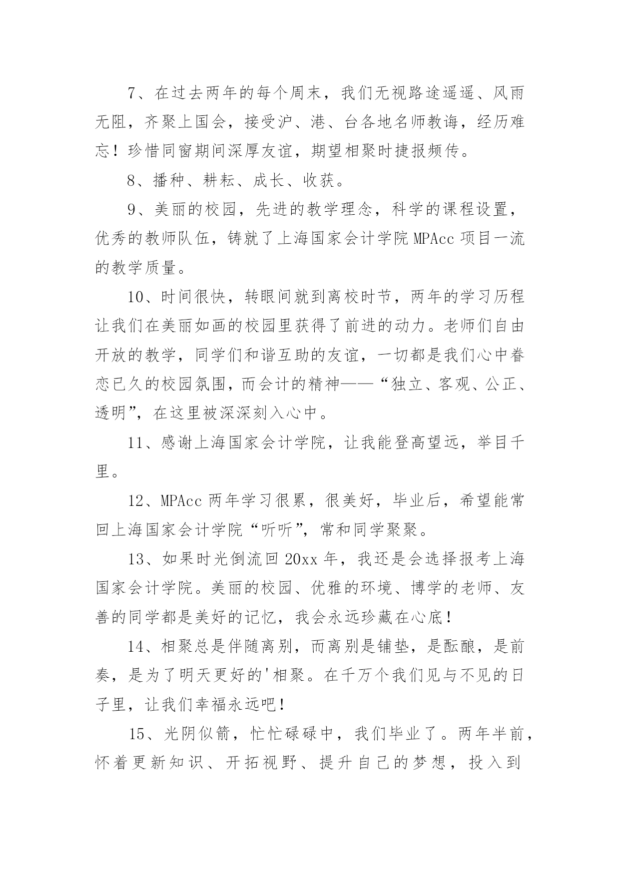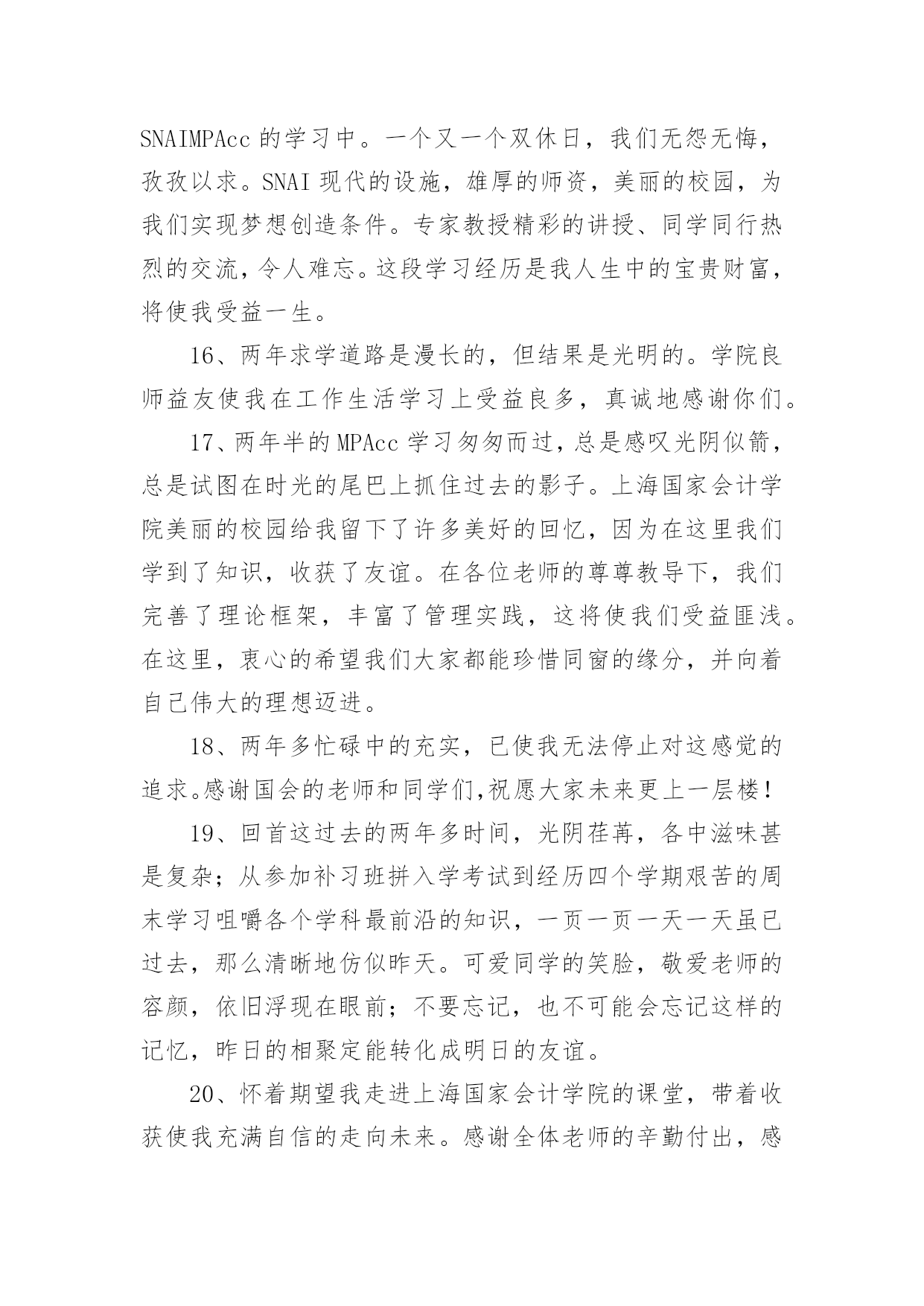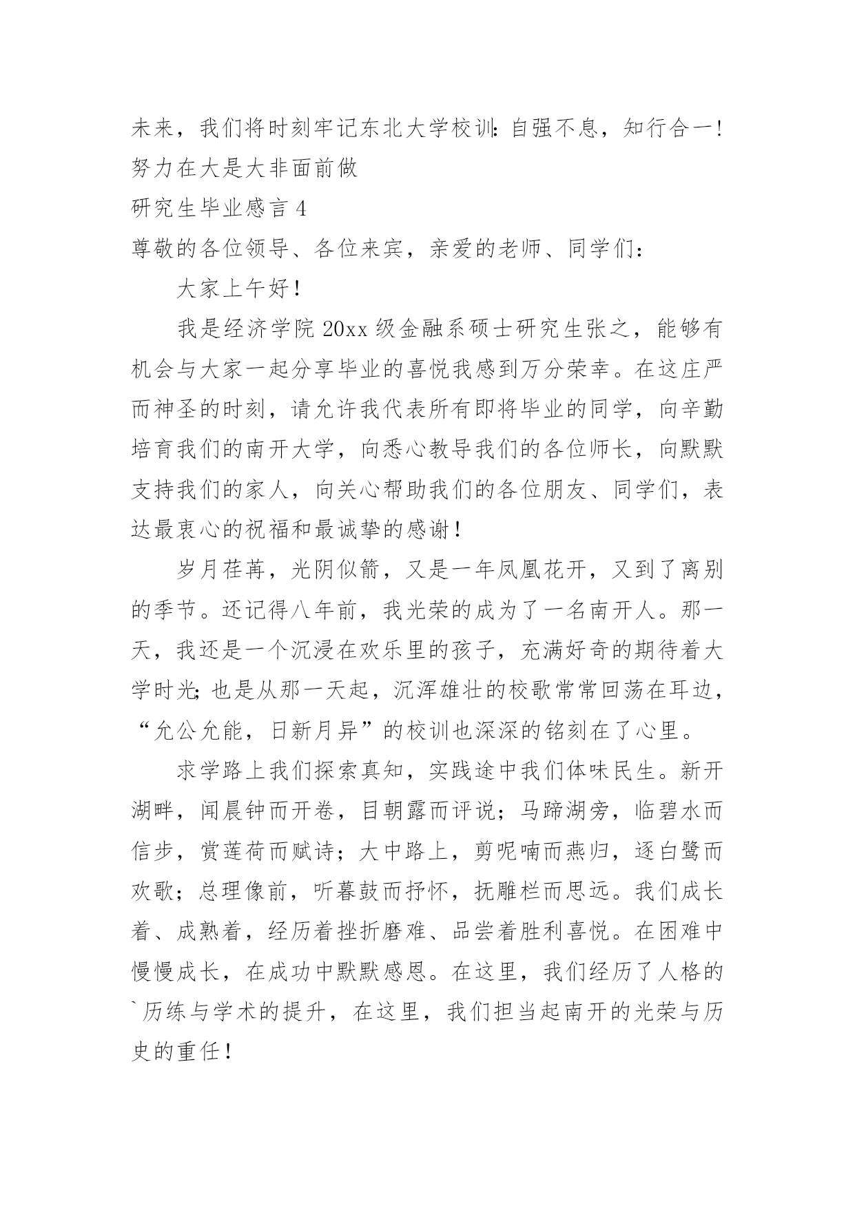 研究生毕业感言[必备]研究生毕业感言在平时的学习、工作或生活中,我们常常会因经历的人和事不同而产生新的感想,这时就可以写一篇感言将其记下来。那么如何写感言才能更有感染力呢?下面是小编为大家收集的研究生毕业感言,欢迎大家分享。研究生毕业感言1又是一年樱花落。徜徉在樱花大道上,似乎看到了第一年的我顶着卷卷短发没心没肺的傻笑,第二年的我牵着温暖大手无忧无虑的漫步,第三年的我揣着紧张情绪步履匆匆的路过,第四年的我捧着清甜椰子走马观花的晃悠,第五年的我端着笨重相机小心翼翼的拍照,今年,突然开始舍不得。舍不得在湖边把头发吹得轻飘飘的大风,舍不得昏黄灯光下三三两两的倒影,舍不得从牌坊走到电气院的小路,舍不得图书馆四楼阅览室鱼缸里的小乌龟,舍不得二食堂的麻辣烫和烧鹅饭,舍不得回忆里的一点一滴,舍不得你。六年前还并不明白什么是电气,而今天电气已经在自己身上留下了深深的烙印。恍惚中,似乎还在寝室里通宵打牌第二天早上四个人去占高数第一排的位子睡觉;似乎还在人文馆的迎新晚会听架子鼓激动的快要泪流;似乎还在运动会夺冠后在明珠园放肆的碰杯和拥抱。美,在回望之时。不知不觉里,走了这么远,走了这么久。念不完的书,听不完的课,跑不完的仿真,开不完的会,写不完的论文,吃不完的饭,多想时间能够再慢一点,再慢一点……慢到能够再在十一教上信号与系统时偷闻一下桂花香,慢到能够再在广八路喝酒喝到谁都不许站着回家,慢到能够抓住这离别的手。是的,我想抓住你的手。想回到过去,想留住现在,又想要奔向未来。人生还太长太长,优秀?还有距离。成绩?不留遗憾。奖项?一纸浮云。奋斗?永不停歇。幸福?我好幸福!下面与大家分享一下这几年学习生活的.心得体会。首先,没有考不过的试,只有不认真准备的人。课程是我们学习、科研的基础,专业课拿到好看的分数在读研期间还是比较容易的事情。但是在本科,模电、数电、电机学、电气工程基础要顺利通过或者拿高分还是需要投入大量的时间在预习听课和复习上。大二以为难于上青天的科目,在大四重新学习复习之后突然有种豁然开朗的感觉。记得当时在图书馆借了清华大学红皮的电路原理和电路原理习题解答,教材本身有一定的深度,但方法归纳和思路总结上非常清晰,经过练习便能熟练掌握各章的重难点。三个月的题做下来,在考场上拿到考卷提前半小时就做好了,而且也拿到了很高的分数。所以只要精心准备,找对方法,熟能生巧,四大天书和四大神捕都不用再害怕。其次,听君一席话,胜读十年书。相较于授课型的本科学习而言,研究生学习更加偏重于教授的指导。依托各自承担的国家级和省部级的科研项目,实验室为我们提供了强而有力的课题支撑,同时教授为我们指出了明确的科研框架,跟着教授的指导走要比闭门造车容易很多。我非常有幸的加入了刘涤尘教授实验室。刘老师非常细致的教导我们如何做研究,从阅读文献到报告总结,从仿真分析到成果展示,在每一个关键的时间节点都给出了最好的评价与建议。同时,我也学会了前紧后松。何谓前紧后松?举个例子,若准备花三个月来撰写一篇高质量的论文,那么在前两个月就必须下大工夫完成国内外现状的分析,完善框架的构建,提出自身的创新点并进行大量的仿真验证,当所有的准备工作和内容已经比较具体之后,在最后一个月就能轻松的撰写和修改论文内容之后再进行有效的投稿。要追求过程,也要追求结果。如果说搞科研的过程是在开发一款软件,那么过程便是努力编写程序进行调试,结果便是能发布到平台被人下载,观看及使用。没有辛勤的过程绝对不会有完美的结果,没有结果的展示也并不能让人看到过程的曲折。最后想说的是,我们要花6年时间去做学问,可是要花一辈子来做人。知识是暂时的,可是能力是永恒的;荣誉是暂时的,可是朋友是永远的。是得是失,总有人一起享受逍遥一起分担苦痛;是喜是悲,总有人共同举杯品尝这种种滋味。青春万岁,奋斗万岁,友谊万岁!祝一起毕业的朋友们前程似锦!祝仍在奋战的朋友们找到理想的工作!祝师弟师妹们勇创辉煌!研究生毕业感言21、友情是一种广度,是一种浩荡宏大,可以随时栖身的理想港湾。艰难的人生我们不可能独立撑舟苦渡,只有大家共同荡起桨才能使渡海之舟乘风破浪,直济沧海!我的朋友们,让我们彼此挂念!2、今天,我要坚强地向这里挥一挥手,道一声:再见了,母校。离别之际,真诚地祝愿曾经给我授业解惑的老师们工作顺利、身体健康;祝愿我的同学们学有所用,事有所成。3、两年时间,匆匆而过,在这两年中,我们一起走来,一起奋斗,我们都有了各自的收获。又到了离别的时候,怀念每个星期大家在一起的时光,一起听着学校各位老师给我们的精彩讲课。如今我们有了更好的起点,祝愿我们都有更好的前程。同学们珍重,多联系!4、时光荏苒欢声笑语依稀绕梁,水乳交融师恩友情浓聚于心,致一份谢意,道一声珍重。5、我从读书到现在一直有一个愿望,就是希望能走出广西,到外面的世界去看一看以丰富自己的