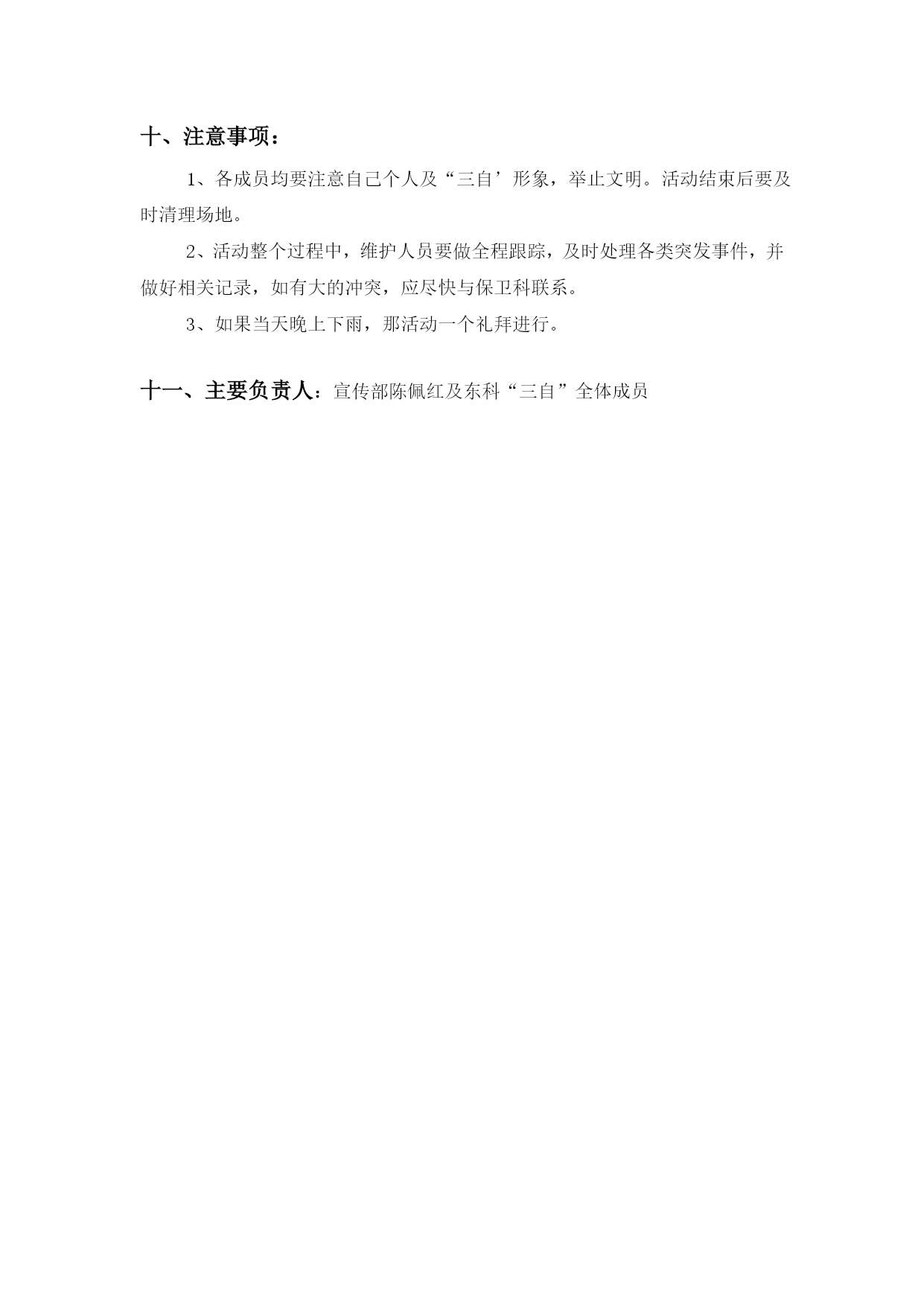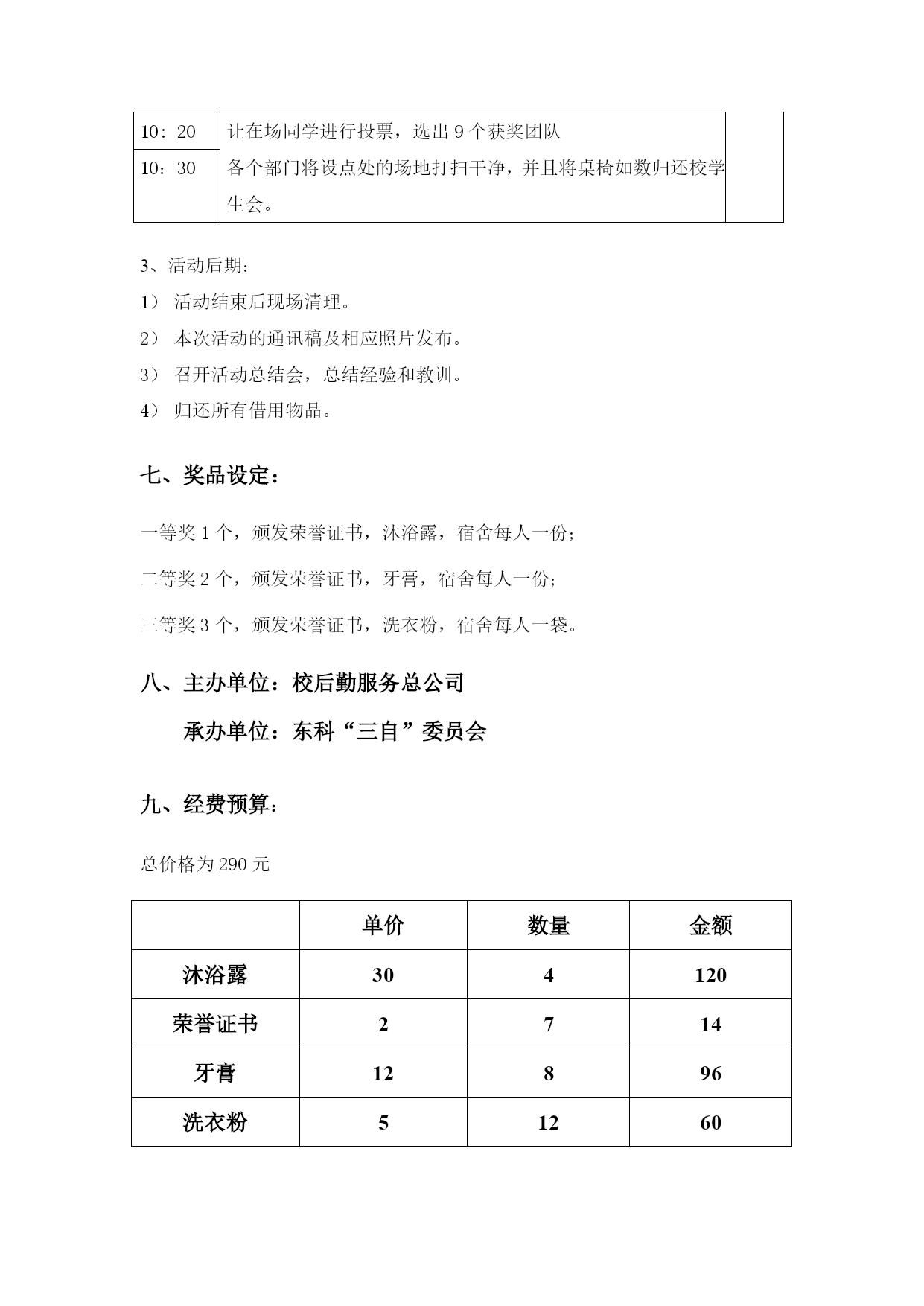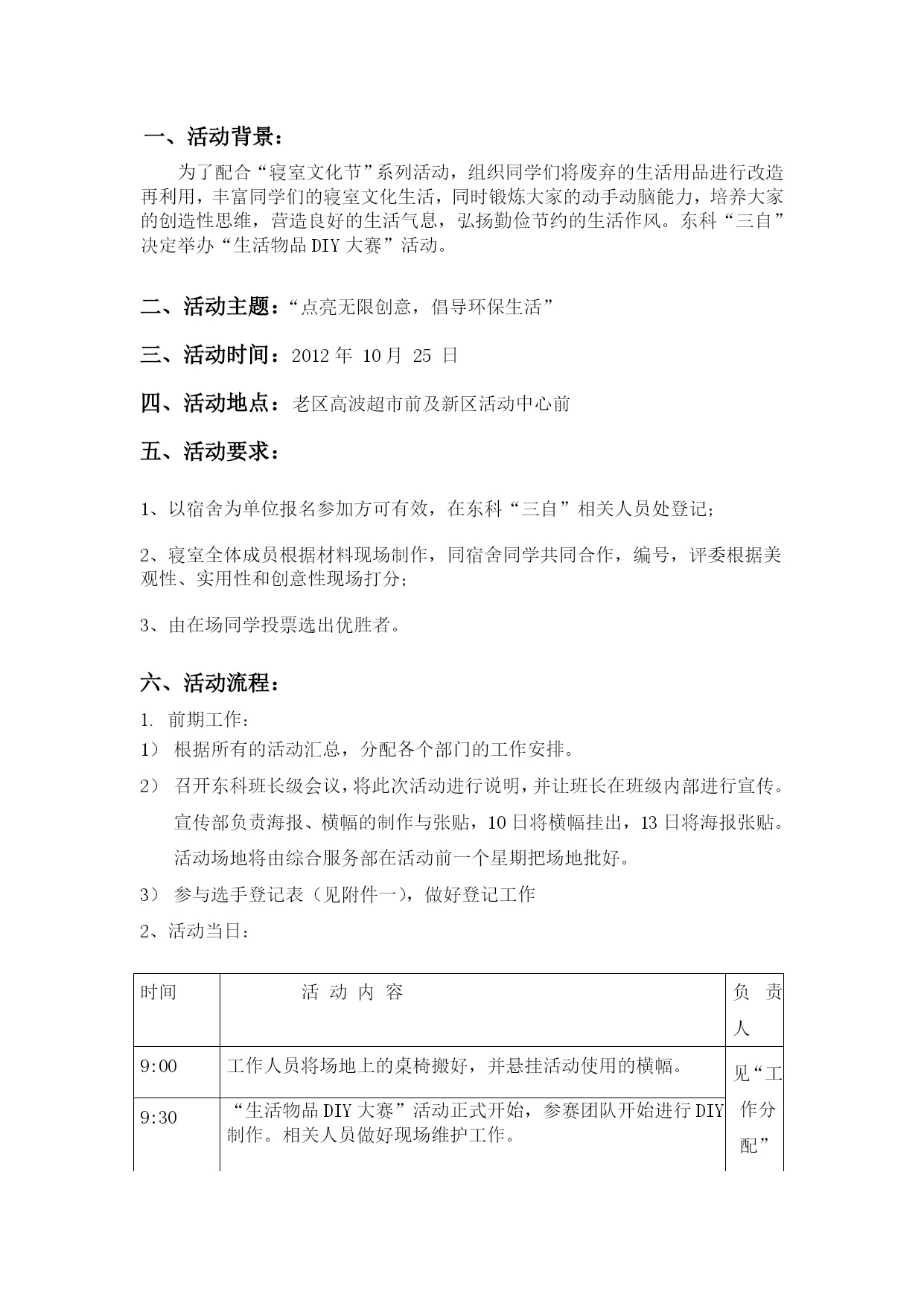 东海科学技术学院“寝室文化节”生活物品DIY大赛策划书东科“三自”学生宿舍委员会2012年7月25日一、活动背景:为了配合“寝室文化节”系列活动,组织同学们将废弃的生活用品进行改造再利用,丰富同学们的寝室文化生活,同时锻炼大家的动手动脑能力,培养大家的创造性思维,营造良好的生活气息,弘扬勤俭节约的生活作风。东科“三自”决定举办“生活物品DIY大赛”活动。二、活动主题:“点亮无限创意,倡导环保生活”三、活动时间:2012年10月25日四、活动地点:老区高波超市前及新区活动中心前五、活动要求:1、以宿舍为单位报名参加方可有效,在东科“三自”相关人员处登记;2、寝室全体成员根据材料现场制作,同宿舍同学共同合作,编号,评委根据美观性、实用性和创意性现场打分;3、由在场同学投票选出优胜者。六、活动流程:前期工作:根据所有的活动汇总,分配各个部门的工作安排。召开东科班长级会议,将此次活动进行说明,并让班长在班级内部进行宣传。宣传部负责海报、横幅的制作与张贴,10日将横幅挂出,13日将海报张贴。活动场地将由综合服务部在活动前一个星期把场地批好。参与选手登记表(见附件一),做好登记工作2、活动当日:时间活动内容负责人9:00工作人员将场地上的桌椅搬好,并悬挂活动使用的横幅。见“工作分配”9:30“生活物品DIY大赛”活动正式开始,参赛团队开始进行DIY制作。相关人员做好现场维护工作。10:20让在场同学进行投票,选出9个获奖团队10:30各个部门将设点处的场地打扫干净,并且将桌椅如数归还校学生会。3、活动后期:活动结束后现场清理。本次活动的通讯稿及相应照片发布。召开活动总结会,总结经验和教训。归还所有借用物品。七、奖品设定:一等奖1个,颁发荣誉证书,沐浴露,宿舍每人一份;二等奖2个,颁发荣誉证书,牙膏,宿舍每人一份;三等奖3个,颁发荣誉证书,洗衣粉,宿舍每人一袋。八、主办单位:校后勤服务总公司承办单位:东科“三自”委员会九、经费预算:总价格为290元单价数量金额沐浴露304120荣誉证书2714牙膏12896洗衣粉51260十、注意事项:1、各成员均要注意自己个人及“三自’形象,举止文明。活动结束后要及时清理场地。2、活动整个过程中,维护人员要做全程跟踪,及时处理各类突发事件,并做好相关记录,如有大的冲突,应尽快与保卫科联系。3、如果当天晚上下雨,那活动一个礼拜进行。十一、主要负责人:宣传部陈佩红及东科“三自”全体成员
