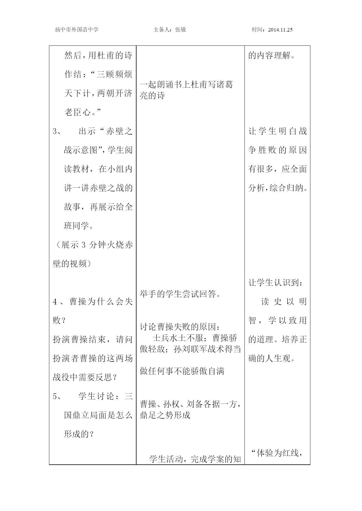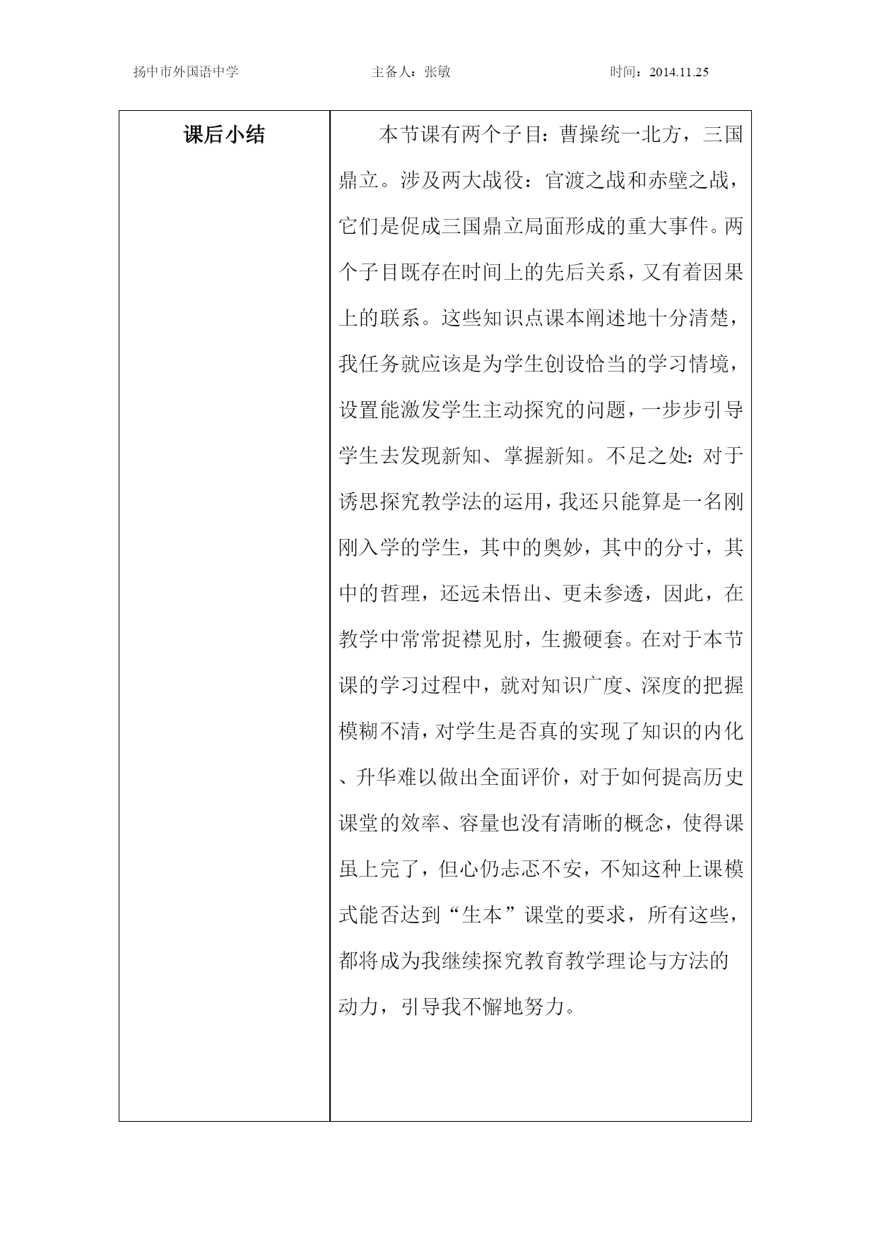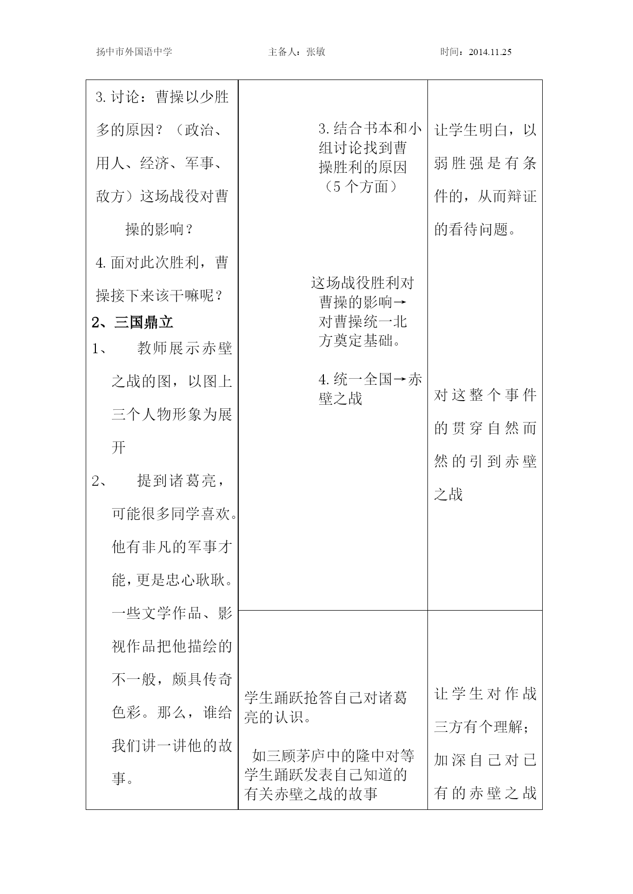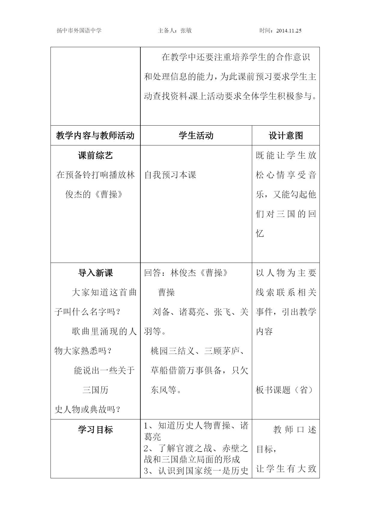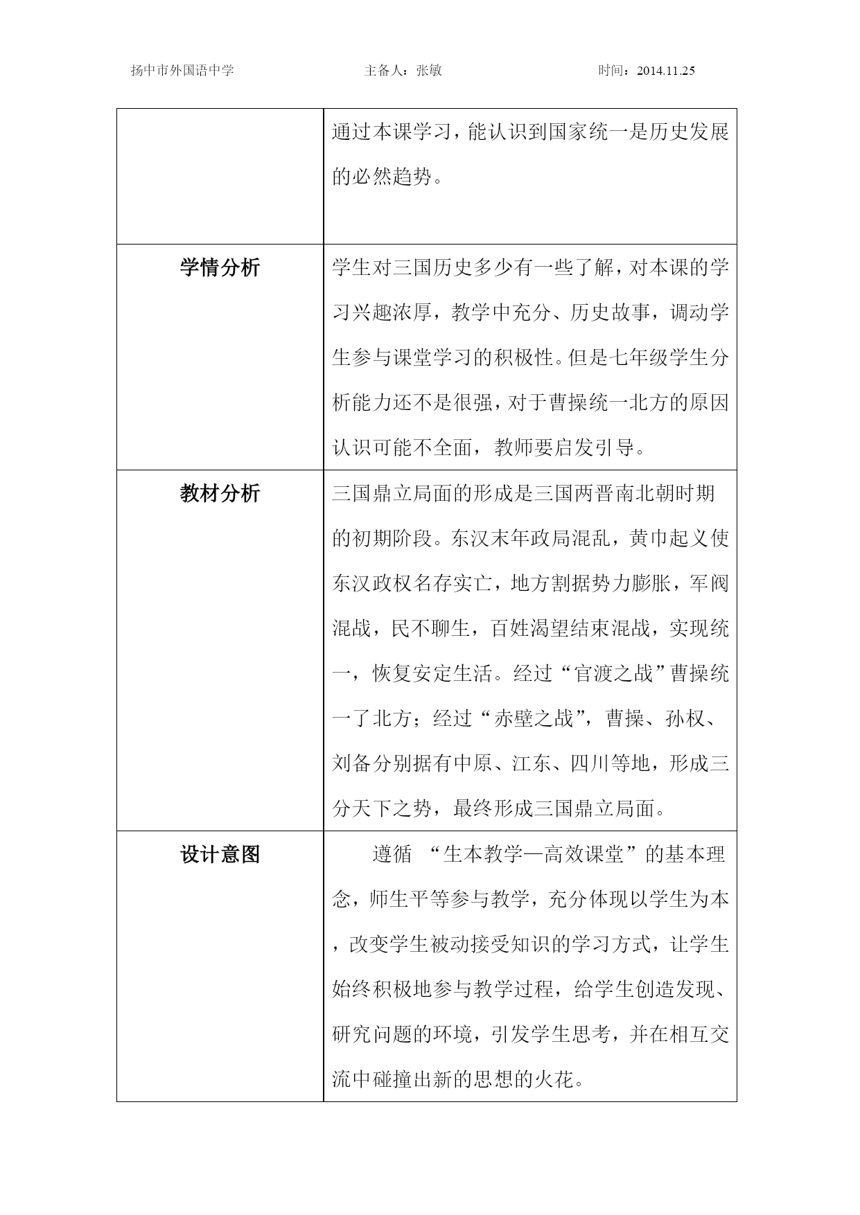 扬中市外国语中学主备人:张敏时间:2014.11.25课题三国鼎立局面的形成课型新授课时1课时教具多媒体、实物投影教法小组合作重点官渡之战、赤壁之战和三国鼎立的形成难点曹操统一北方的原因和三国鼎立局面的形成教学目标知识与技能:知道三国鼎立局面形成过程中的重要历史人物曹操、诸葛亮。了解历史上著名的战役“官渡之战”与“赤壁之战”。简述三国鼎立局面的形成以及它对历史发展产生的影响。过程与方法:阅读课文内容,了解三国鼎立局面形成的相关史实。观看历史地图及视频,了解官渡之战和赤壁之战。阅读课文,找出曹操统一北方的原因,提高从课文中获取有效信息的能力。赤壁之战的情感态度与价值观:通过本课学习,能认识到国家统一是历史发展的必然趋势。学情分析学生对三国历史多少有一些了解,对本课的学习兴趣浓厚,教学中充分、历史故事,调动学生参与课堂学习的积极性。但是七年级学生分析能力还不是很强,对于曹操统一北方的原因认识可能不全面,教师要启发引导。教材分析三国鼎立局面的形成是三国两晋南北朝时期的初期阶段。东汉末年政局混乱,黄巾起义使东汉政权名存实亡,地方割据势力膨胀,军阀混战,民不聊生,百姓渴望结束混战,实现统一,恢复安定生活。经过“官渡之战”曹操统一了北方;经过“赤壁之战”,曹操、孙权、刘备分别据有中原、江东、四川等地,形成三分天下之势,最终形成三国鼎立局面。设计意图遵循“生本教学—高效课堂”的基本理念,师生平等参与教学,充分体现以学生为本,改变学生被动接受知识的学习方式,让学生始终积极地参与教学过程,给学生创造发现、研究问题的环境,引发学生思考,并在相互交流中碰撞出新的思想的火花。在教学中还要注重培养学生的合作意识和处理信息的能力,为此课前预习要求学生主动查找资料,课上活动要求全体学生积极参与。教学内容与教师活动学生活动设计意图课前综艺在预备铃打响播放林俊杰的《曹操》自我预习本课既能让学生放松心情享受音乐,又能勾起他们对三国的回忆导入新课大家知道这首曲子叫什么名字吗?歌曲里涌现的人物大家熟悉吗?能说出一些关于三国历史人物或典故吗?回答:林俊杰《曹操》曹操刘备、诸葛亮、张飞、关羽等。桃园三结义、三顾茅庐、草船借箭万事俱备,只欠东风等。以人物为主要线索联系相关事件,引出教学内容板书课题(省)学习目标1、知道历史人物曹操、诸葛亮2、了解官渡之战、赤壁之战和三国鼎立局面的形成3、认识到国家统一是历史发展的必然趋势教师口述目标,让学生有大致的认识自主学习(完成导学案)布置任务:阅读P101~104,完成两次战争的卡片对比和填空学生回答(略)在课间让他们有个预习的过程,做到对课本内容熟悉。授课与活动1、曹操统一北方本课以穿越剧贯穿,以一个学生扮演曹操的口吻给大家讲述曹操的经历。1.东汉末年的时局图2.为统一发生了什么战争?简述战争过程?3.讨论:曹操以少胜多的原因?(政治、用人、经济、军事、敌方)这场战役对曹操的影响?4.面对此次胜利,曹操接下来该干嘛呢?2、三国鼎立教师展示赤壁之战的图,以图上三个人物形象为展开提到诸葛亮,可能很多同学喜欢。他有非凡的军事才能,更是忠心耿耿。一些文学作品、影视作品把他描绘的不一般,颇具传奇色彩。那么,谁给我们讲一讲他的故事。然后,用杜甫的诗作结:“三顾频烦天下计,两朝开济老臣心。”出示“赤壁之战示意图”,学生阅读教材,在小组内讲一讲赤壁之战的故事,再展示给全班同学。(展示3分钟火烧赤壁的视频)4、曹操为什么会失败?扮演曹操结束,请问扮演者曹操的这两场战役中需要反思?学生讨论:三国鼎立局面是怎么形成的?分组整理三国鼎立形成的表格教师出示“三国鼎立示意图”学生指图回答。学生回答:1.东汉末年时局混乱,军阀割据,人民渴望统一。2.官渡之战看课本以及形势图,简单概括出官渡之战的经过。3.结合书本和小组讨论找到曹操胜利的原因(5个方面)这场战役胜利对曹操的影响→对曹操统一北方奠定基础。4.统一全国→赤壁之战以学生来演绎曹操的口吻,能激起学生的兴趣。再以讲故事比赛的方式让学生积极参与其中。让学生明白,以弱胜强是有条件的,从而辩证的看待问题。对这整个事件的贯穿自然而然的引到赤壁之战学生踊跃抢答自己对诸葛亮的认识。如三顾茅庐中的隆中对等学生踊跃发表自己知道的有关赤壁之战的故事一起朗诵书上杜甫写诸葛亮的诗举手的学生尝试回答。讨论曹操失败的原因:士兵水土不服;曹操骄傲轻敌;孙刘联军战术得当做任何事不能骄傲自满曹操、孙权、刘备各据一方,鼎足之势形成学