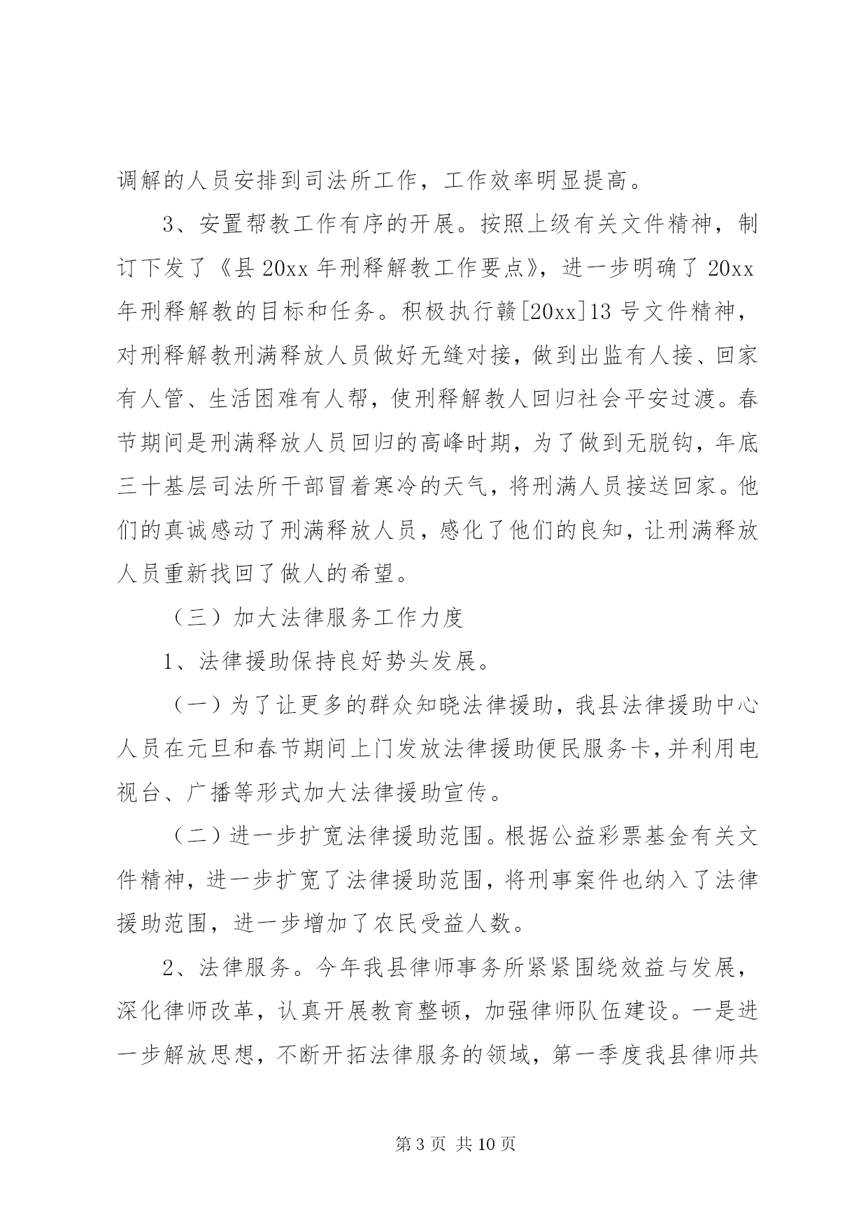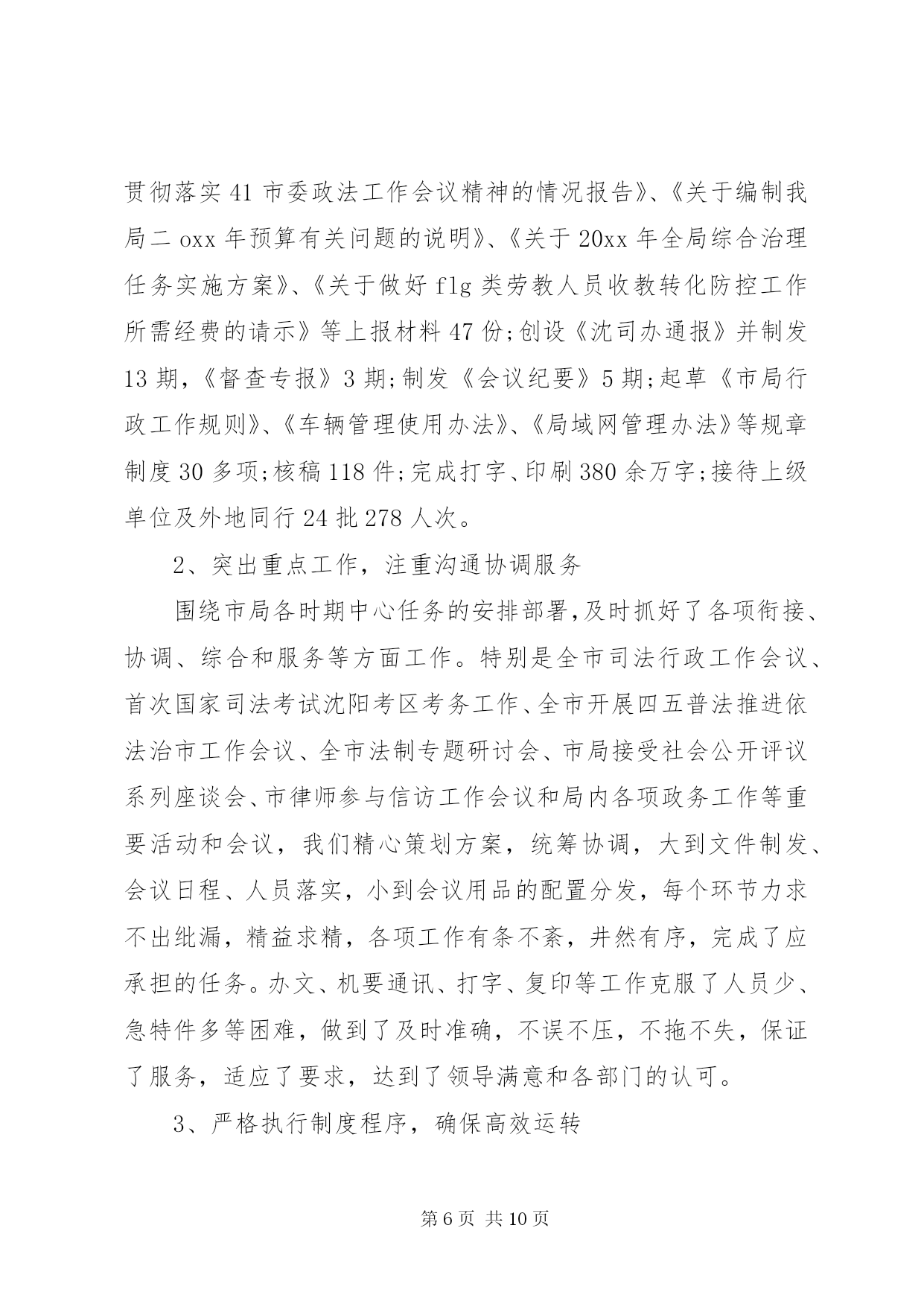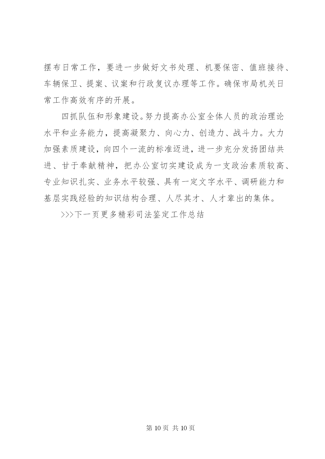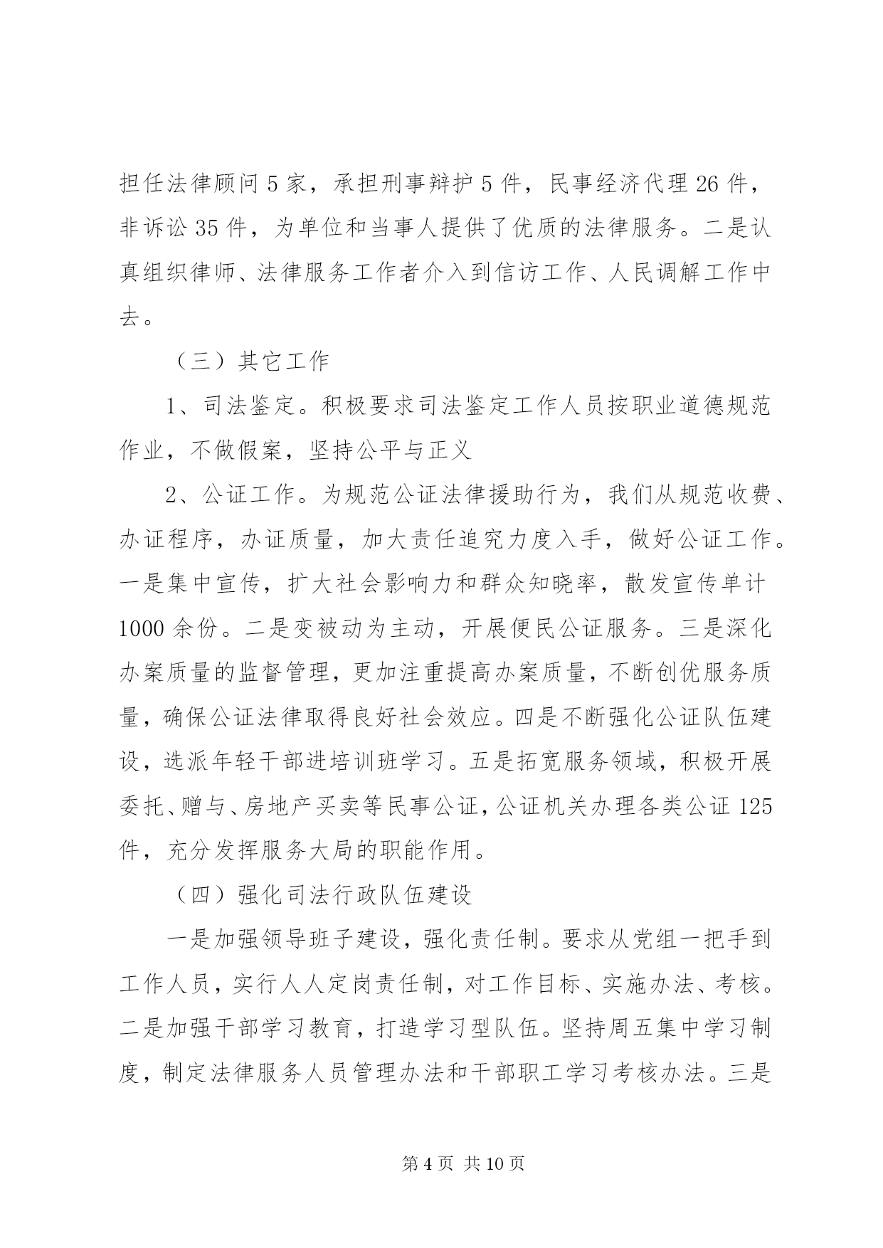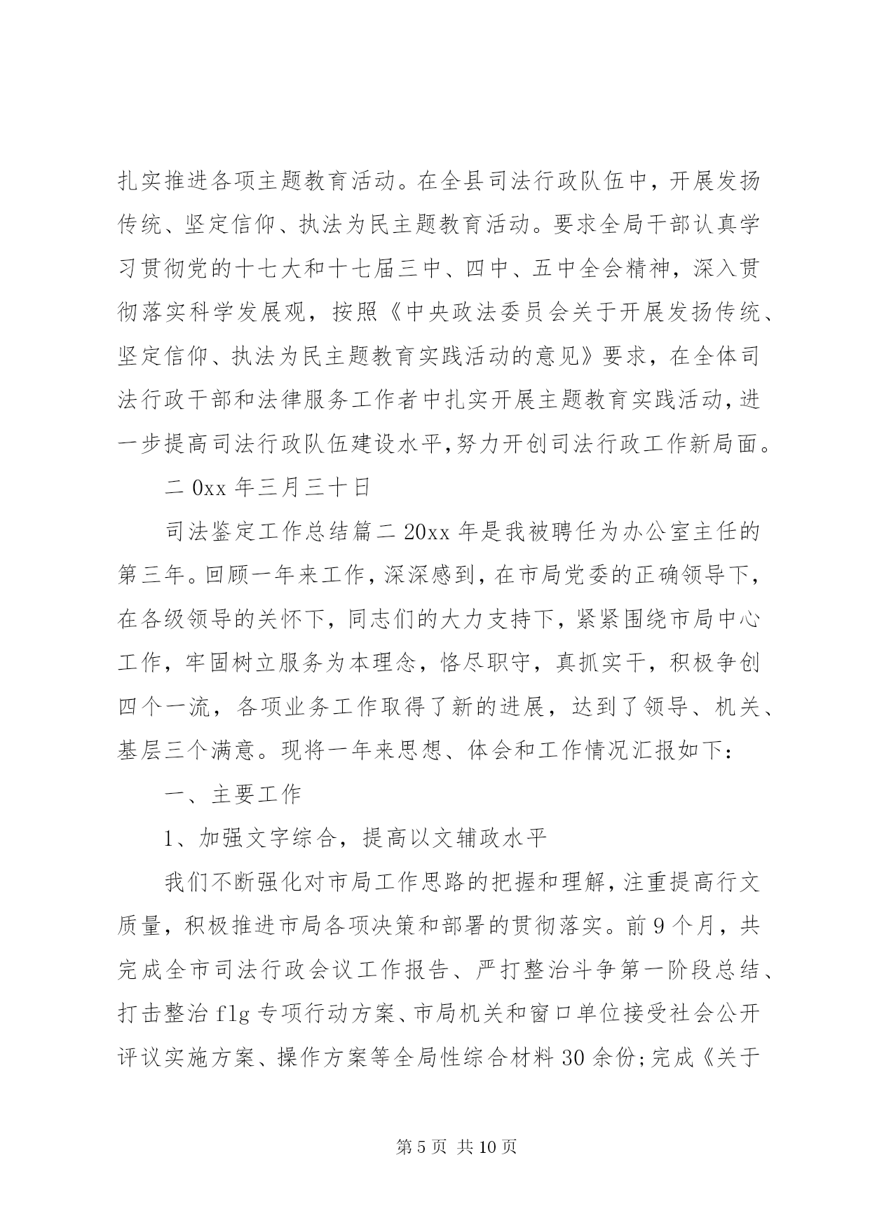 第PAGE\*Arabic\*MERGEFORMAT10页共NUMPAGES\*MERGEFORMAT10页司法鉴定工作总结司法鉴定工作总结篇一20xx年伊始之际,按照司法部、省厅、市局的文件要求和工作目标,立足我县实际,紧紧围绕民生工程为重点,积极开展司法行政工作。我局充分发挥法律保障、法律服务、法制宣传教育、安置帮教职能作用,大力加强基层队伍建设,狠抓各项工作责任目标落实,不断推进司法行政工作的改革和发展,取得了较好的成效。现将20xx年第一季度工作情况汇报如下:(一)高位推进普法依法治理工作1、法制宣传工作。一是举办形式各样的普法宣传活动。利用元旦、春节等大型节日开展内容丰富的普法宣传。律师们利用自己的法律知识,为群众解答咨询820余人次,发放宣传资料1000余份,得到了群众的好评。二是进一步推广法律进祠堂活动。在全县大大小小100多个祠堂内,陆续开展六个一(建立一个法制宣传墙、设置一个法律图书柜、建立一个预警提示栏、配备一套多媒体设备、成立一个普法宣传队)进驻活动,丰富了群众的娱乐文化生活,让社会恶习得到改善,有力促进全县农村社会治安状况的根本好转。三是加强青少年法制教育和机关干部学法用法宣传。联合县教育局配齐配强全县中小学法制副校长,法制副校长由公安干警、律师及法律服务者担任,每学期为学生上1至2节法制课,做到经常性法制教育不放松,并积极参与到学校周边环境整治当中,做好法制宣传。2、平安建设工作。结合六五普法依法治县的工作经验以及六六普法依法治县的实施方案,紧扣一学三讲主题,积极开展民主法治示范村、民主法治社区法治莲花创建和法律六进活动,推进平安创建工作。(二)基层工作扎实开展1、大力加强矛盾纠纷调解排查。第一季度恰逢春节前和两会召开时期,是群体性事件和矛盾纠纷高发期,为进一步维护特殊时期社会治安稳定工作,我局召开了司法行政工作会议,会议上强调各基层单位要加强对各地区的排查力度,针对社会热点、难点问题,集中力量,重点排查多发性,易激化矛盾纠纷,积极主动参与群体性矛盾、群体性上访纠纷的调解,及时把矛盾化解在基层,消灭在萌芽状态。为确保这项工作落到实处,我局领导多次带队到各基层司法所、调委会进行检查和指导,有力的推动了人民调解工作的有序开展。一季度,全县各乡镇、社区共调解民间纠纷89宗、排查民间纠纷68宗、制止上访232人次,为维护全县社会稳定做出了积极贡献。2、司法所规范化建设。认真贯彻中央关于加强两所一庭建设的精神,始终把司法所规范化建设当作基础性工作来抓。不断加强司法所的硬件和软件建设,全县十三个乡镇司法所都评为规范化司法所,并配齐配强司法所人员,选拔法律知识渊博、善于调解的人员安排到司法所工作,工作效率明显提高。3、安置帮教工作有序的开展。按照上级有关文件精神,制订下发了《县20xx年刑释解教工作要点》,进一步明确了20xx年刑释解教的目标和任务。积极执行赣[20xx]13号文件精神,对刑释解教刑满释放人员做好无缝对接,做到出监有人接、回家有人管、生活困难有人帮,使刑释解教人回归社会平安过渡。春节期间是刑满释放人员回归的高峰时期,为了做到无脱钩,年底三十基层司法所干部冒着寒冷的天气,将刑满人员接送回家。他们的真诚感动了刑满释放人员,感化了他们的良知,让刑满释放人员重新找回了做人的希望。(三)加大法律服务工作力度1、法律援助保持良好势头发展。(一)为了让更多的群众知晓法律援助,我县法律援助中心人员在元旦和春节期间上门发放法律援助便民服务卡,并利用电视台、广播等形式加大法律援助宣传。(二)进一步扩宽法律援助范围。根据公益彩票基金有关文件精神,进一步扩宽了法律援助范围,将刑事案件也纳入了法律援助范围,进一步增加了农民受益人数。2、法律服务。今年我县律师事务所紧紧围绕效益与发展,深化律师改革,认真开展教育整顿,加强律师队伍建设。一是进一步解放思想,不断开拓法律服务的领域,第一季度我县律师共担任法律顾问5家,承担刑事辩护5件,民事经济代理26件,非诉讼35件,为单位和当事人提供了优质的法律服务。二是认真组织律师、法律服务工作者介入到信访工作、人民调解工作中去。(三)其它工作1、司法鉴定。积极要求司法鉴定工作人员按职业道德规范作业,不做假案,坚持公平与正义2、公证工作。为规范公证法律援助行为,我们从规范收费、办证程序,办证质量,加大责任追究力度入手,做好公证工作。一是集中宣传,扩大社会影响力和群众知晓率,散发宣传单计1000余份。二是变被动为主动,开展便民公证服务。三是深化办案质量的监督管理,更加注重提高办案质量,不断创优服务质量,确保公证法律取得良好社会效应。四是不断强化公证队伍建设,选派年轻干部进培训班学习。五是拓宽服务领域,积极开展委托、赠与、房地产买卖等民事公证,公证机关办理各类公证125件