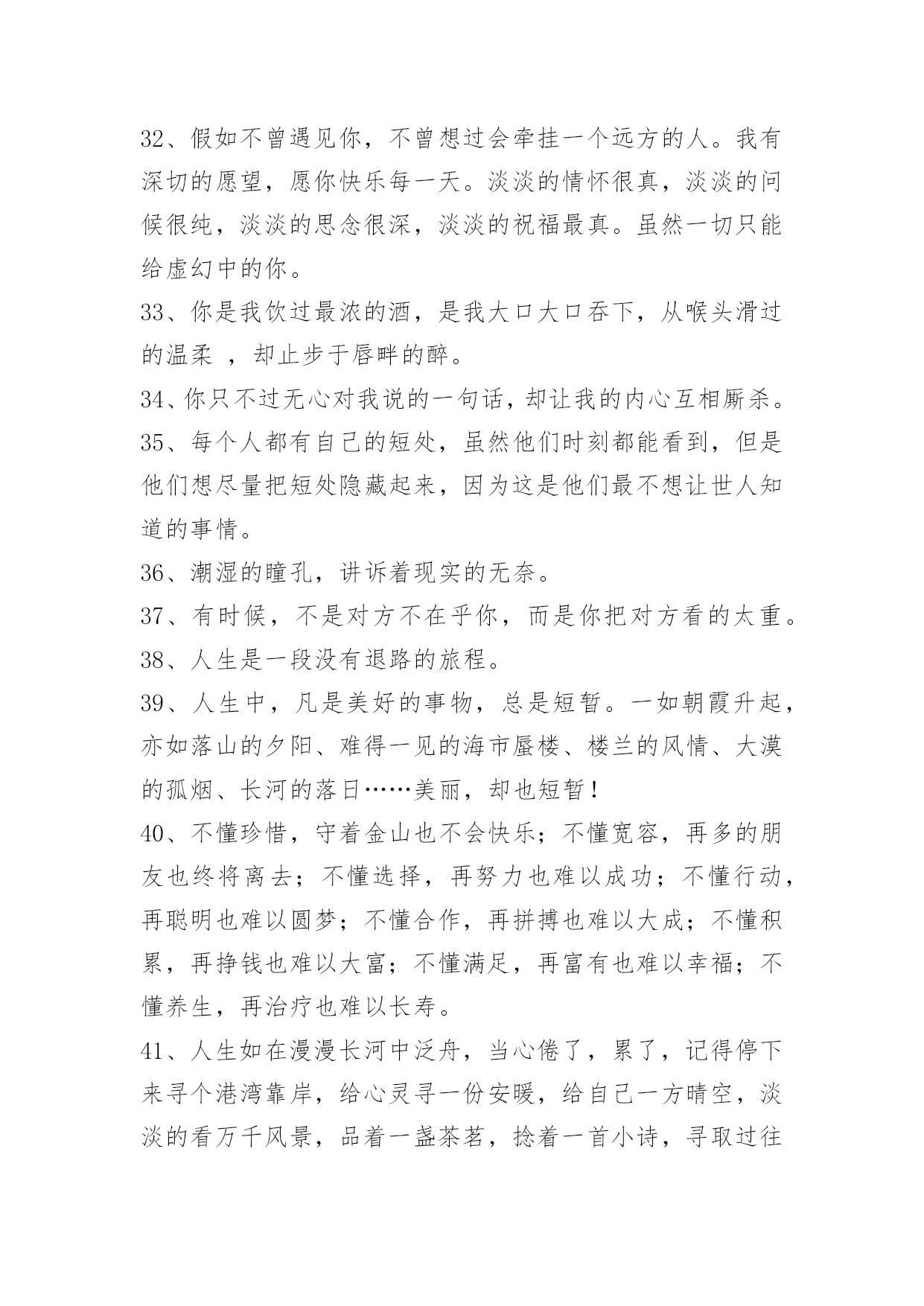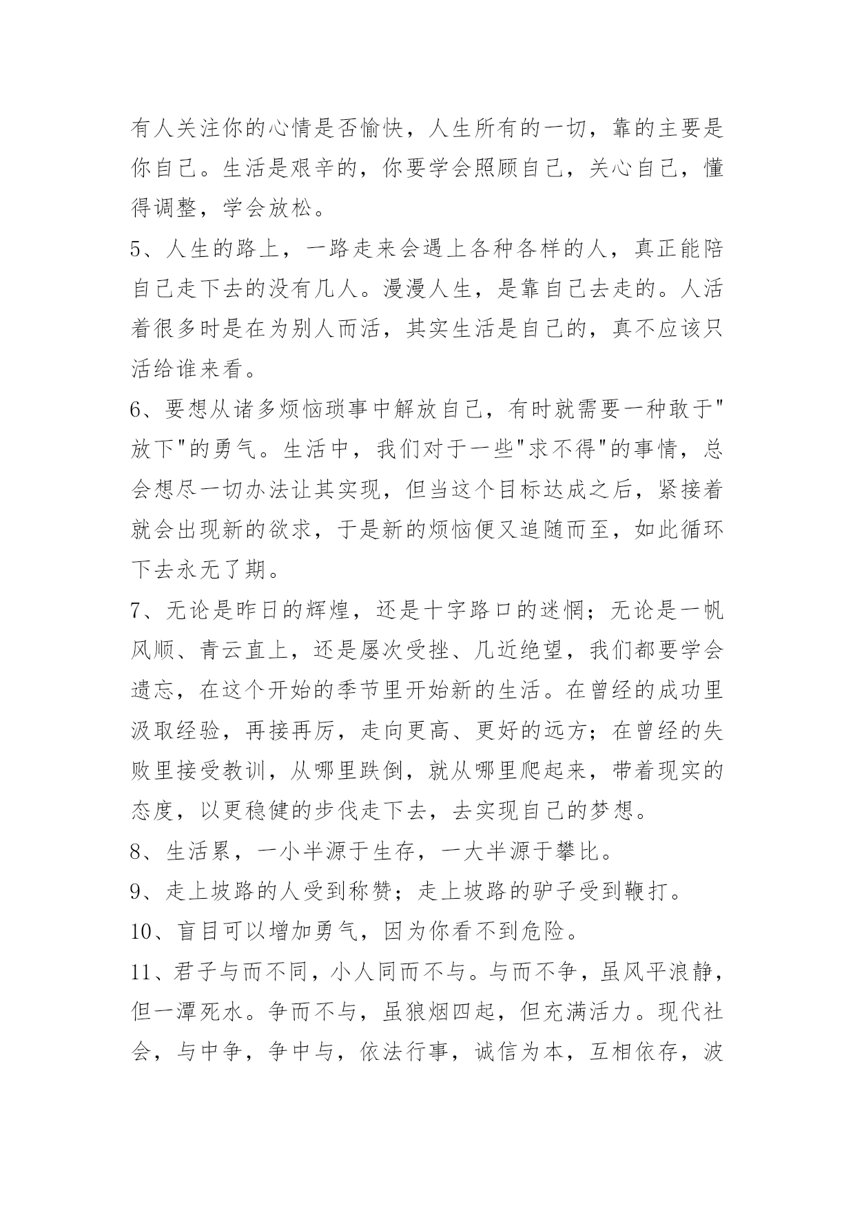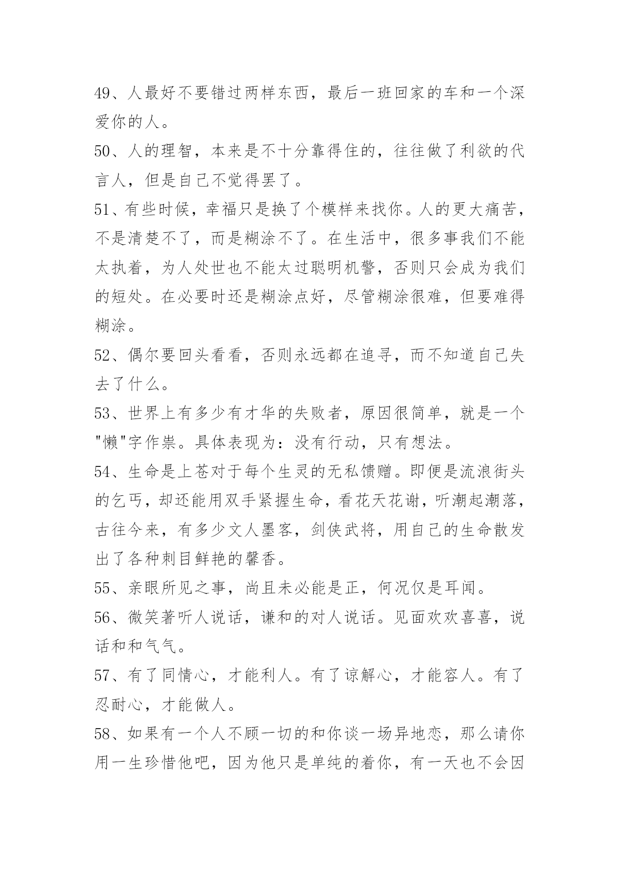 人生感悟名句58条人生感悟名句汇编58条要有济人之心,物质有厚薄,精神无囿限;要有赞人之口,好言令冬暖,恶语使夏寒;要有纯净之眼,你看简单了,众生并不复杂;要有助人之手,少些锦上添花,多点雪中送炭;要有忍人之胸,你接纳多少,就能收获多少。以下是小编为大家准备的人生感悟名句58条,感兴趣的一起来看看吧。1、人的一生只有三天:昨天、今天、明天!昨天已成过去,明天还没到来。我们无法把昨天请回来,明天也不能提前拥有,我们可以把握的只有今天。我们总认为今天是最重要的,今天好像能代表我们生命的全部,今天把握不好,就会成为不好的昨天。昨天好象是一朵凋零的黄花不足珍惜。明天就不用说了,一首《明日歌》好象明天就是蹉跎岁月,就是惰性的借口,就是我们碌碌无为的诱因。当然,我们应该抓住今天,但我们决不能抛弃昨天,更不要放弃明天。2、人,在看不见前面的希望和光明时,往往控制不住地跌进回忆里不能自拔。回忆并不伤人,但如果回想得太多而钻起牛角尖来,那就很苦了,因为我们不能改变已经发生了的事情。3、发自己的光就好,不要吹灭别人的灯。4、身体是自己的,心情也是自己的,你的身体只有你去打理,你的心情只有你去调整。没有人知道你身体的好坏,没有人关注你的心情是否愉快,人生所有的一切,靠的主要是你自己。生活是艰辛的,你要学会照顾自己,关心自己,懂得调整,学会放松。5、人生的路上,一路走来会遇上各种各样的人,真正能陪自己走下去的没有几人。漫漫人生,是靠自己去走的。人活着很多时是在为别人而活,其实生活是自己的,真不应该只活给谁来看。6、要想从诸多烦恼琐事中解放自己,有时就需要一种敢于"放下"的勇气。生活中,我们对于一些"求不得"的事情,总会想尽一切办法让其实现,但当这个目标达成之后,紧接着就会出现新的欲求,于是新的烦恼便又追随而至,如此循环下去永无了期。7、无论是昨日的辉煌,还是十字路口的迷惘;无论是一帆风顺、青云直上,还是屡次受挫、几近绝望,我们都要学会遗忘,在这个开始的季节里开始新的生活。在曾经的成功里汲取经验,再接再厉,走向更高、更好的远方;在曾经的失败里接受教训,从哪里跌倒,就从哪里爬起来,带着现实的态度,以更稳健的步伐走下去,去实现自己的梦想。8、生活累,一小半源于生存,一大半源于攀比。9、走上坡路的人受到称赞;走上坡路的驴子受到鞭打。10、盲目可以增加勇气,因为你看不到危险。11、君子与而不同,小人同而不与。与而不争,虽风平浪静,但一潭死水。争而不与,虽狼烟四起,但充满活力。现代社会,与中争,争中与,依法行事,诚信为本,互相依存,波浪前进。12、选择不对,努力白费。人生,需要努力,更需要学会选择。人一辈子,关键的路也就那么几步,该慎重的时候,一定要深思熟虑,集思广益;该果断的时候,千万不要战战兢兢,畏首畏尾。有时候,不作任何选择,也是一种选择。人生无论做出怎样的.选择,都不要选择违背自己的心。13、最后一滴眼泪,是我对你的告别,如今,你在我心里什么都算不上。14、当你觉得辛苦的时候,别想着放弃,因为比你优秀的人比你还努力。正能量的人生,才是灿烂的人生。每天都是新的开始。15、人一辈子没有出息,往往是因为朋友太少。如果你的命不好,改变命运的唯一办法是"找命好的人和他交朋友",跟着他们,你的命就好。一生中选择与谁合作,怎么合作,需要技巧和方法。见高人不交,见高师不拜,人生遗憾也。16、无论你有多好,总会有不珍惜你的人;幸好,到了最后,所有不珍惜的人,都会成为过去。你要找的不是一个完美的人,而是一个对你而言最合适的人。每个人都有缺陷和伤疤,不用自卑,你也有属于你的最美、有些人,有些事,就像是光一样。即使你碰不到,可它一直都在你身旁。17、人生只要你开始为将来做打算,那么就会发自内心地不断提醒自己,哪怕是一分半秒的时间也是弥足珍贵的。18、青年像白纸,可以打上任何印记。19、你的未来所面临的最大危险,莫过于无动于衷四个字。20、如果你想这辈子有所成就,那么早上把你叫醒的,不应该是闹钟,而应该是你的执着追求的人生梦想。21、时时刻刻要有危机意识,别认为自己命好运也好,一时的运气不代表一世的运气。22、任何事想要成功,最重要的是"现在就做"。23、幸福是一种感觉,与贫富无关。24、任何确立了生活目标的人只有不懈地努力工作才会成功。25、成功后,不要居功,因为不居功,所以得到的荣誉才不会失去。26、如果可以把快乐与哀愁都慢慢吸收,细细体会,那么快乐与哀愁就很值得回味,人生从此变得很有意思。27、快乐很简单就能做到,只要每一天对生活充满期待与激情。28、一匹骆驼是不可能穿越辽阔沙漠的,而一支驼队却能够越过沙漠的死亡地带。29、福随心来:有一颗随缘心,便会更洒脱。有一颗平常心,便会更从容。有一颗慈悲心,便会更善良。有一颗感恩心,便会更知足。有一颗因果心,你便会更睿智。有一颗
