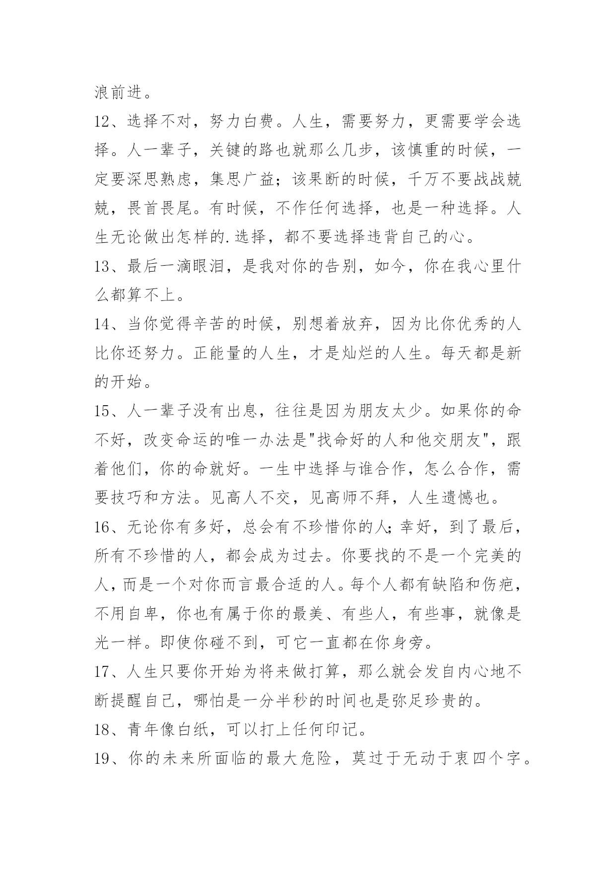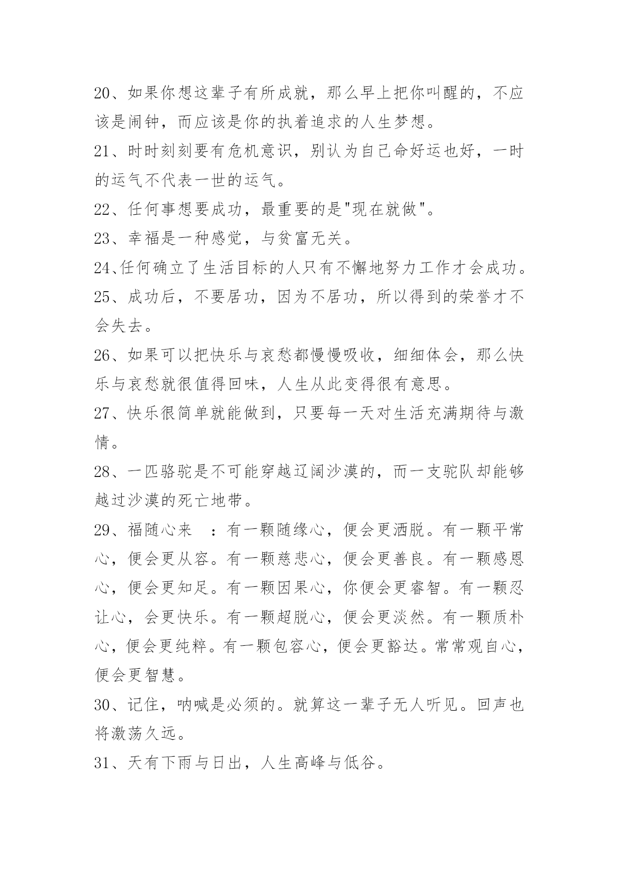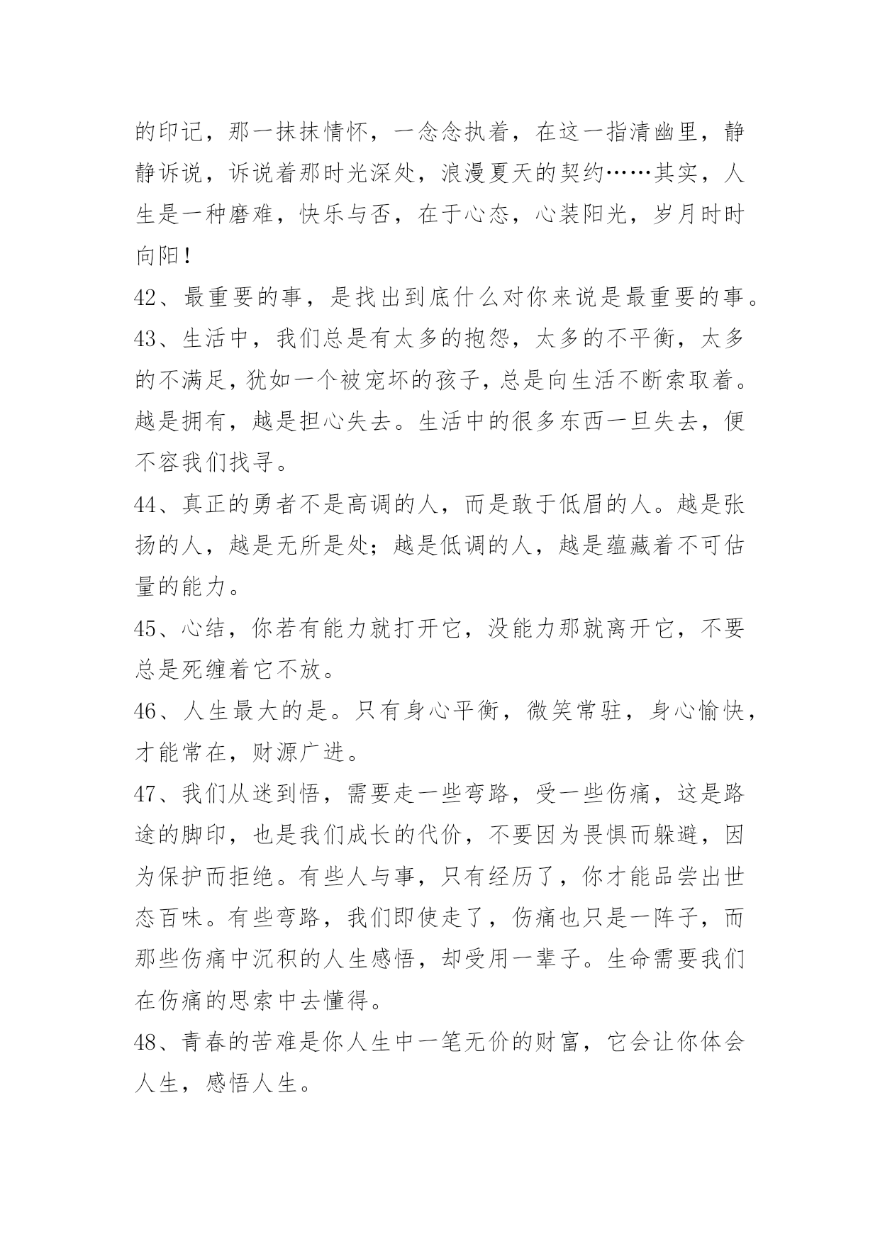 人生感悟名句58条人生感悟名句汇编58条要有济人之心,物质有厚薄,精神无囿限;要有赞人之口,好言令冬暖,恶语使夏寒;要有纯净之眼,你看简单了,众生并不复杂;要有助人之手,少些锦上添花,多点雪中送炭;要有忍人之胸,你接纳多少,就能收获多少。以下是小编为大家准备的人生感悟名句58条,感兴趣的一起来看看吧。1、人的一生只有三天:昨天、今天、明天!昨天已成过去,明天还没到来。我们无法把昨天请回来,明天也不能提前拥有,我们可以把握的只有今天。我们总认为今天是最重要的,今天好像能代表我们生命的全部,今天把握不好,就会成为不好的昨天。昨天好象是一朵凋零的黄花不足珍惜。明天就不用说了,一首《明日歌》好象明天就是蹉跎岁月,就是惰性的借口,就是我们碌碌无为的诱因。当然,我们应该抓住今天,但我们决不能抛弃昨天,更不要放弃明天。2、人,在看不见前面的希望和光明时,往往控制不住地跌进回忆里不能自拔。回忆并不伤人,但如果回想得太多而钻起牛角尖来,那就很苦了,因为我们不能改变已经发生了的事情。3、发自己的光就好,不要吹灭别人的灯。4、身体是自己的,心情也是自己的,你的身体只有你去打理,你的心情只有你去调整。没有人知道你身体的好坏,没有人关注你的心情是否愉快,人生所有的一切,靠的主要是你自己。生活是艰辛的,你要学会照顾自己,关心自己,懂得调整,学会放松。5、人生的路上,一路走来会遇上各种各样的人,真正能陪自己走下去的没有几人。漫漫人生,是靠自己去走的。人活着很多时是在为别人而活,其实生活是自己的,真不应该只活给谁来看。6、要想从诸多烦恼琐事中解放自己,有时就需要一种敢于"放下"的勇气。生活中,我们对于一些"求不得"的事情,总会想尽一切办法让其实现,但当这个目标达成之后,紧接着就会出现新的欲求,于是新的烦恼便又追随而至,如此循环下去永无了期。7、无论是昨日的辉煌,还是十字路口的迷惘;无论是一帆风顺、青云直上,还是屡次受挫、几近绝望,我们都要学会遗忘,在这个开始的季节里开始新的生活。在曾经的成功里汲取经验,再接再厉,走向更高、更好的远方;在曾经的失败里接受教训,从哪里跌倒,就从哪里爬起来,带着现实的态度,以更稳健的步伐走下去,去实现自己的梦想。8、生活累,一小半源于生存,一大半源于攀比。9、走上坡路的人受到称赞;走上坡路的驴子受到鞭打。10、盲目可以增加勇气,因为你看不到危险。11、君子与而不同,小人同而不与。与而不争,虽风平浪静,但一潭死水。争而不与,虽狼烟四起,但充满活力。现代社会,与中争,争中与,依法行事,诚信为本,互相依存,波浪前进。12、选择不对,努力白费。人生,需要努力,更需要学会选择。人一辈子,关键的路也就那么几步,该慎重的时候,一定要深思熟虑,集思广益;该果断的时候,千万不要战战兢兢,畏首畏尾。有时候,不作任何选择,也是一种选择。人生无论做出怎样的.选择,都不要选择违背自己的心。13、最后一滴眼泪,是我对你的告别,如今,你在我心里什么都算不上。14、当你觉得辛苦的时候,别想着放弃,因为比你优秀的人比你还努力。正能量的人生,才是灿烂的人生。每天都是新的开始。15、人一辈子没有出息,往往是因为朋友太少。如果你的命不好,改变命运的唯一办法是"找命好的人和他交朋友",跟着他们,你的命就好。一生中选择与谁合作,怎么合作,需要技巧和方法。见高人不交,见高师不拜,人生遗憾也。16、无论你有多好,总会有不珍惜你的人;幸好,到了最后,所有不珍惜的人,都会成为过去。你要找的不是一个完美的人,而是一个对你而言最合适的人。每个人都有缺陷和伤疤,不用自卑,你也有属于你的最美、有些人,有些事,就像是光一样。即使你碰不到,可它一直都在你身旁。17、人生只要你开始为将来做打算,那么就会发自内心地不断提醒自己,哪怕是一分半秒的时间也是弥足珍贵的。18、青年像白纸,可以打上任何印记。19、你的未来所面临的最大危险,莫过于无动于衷四个字。20、如果你想这辈子有所成就,那么早上把你叫醒的,不应该是闹钟,而应该是你的执着追求的人生梦想。21、时时刻刻要有危机意识,别认为自己命好运也好,一时的运气不代表一世的运气。22、任何事想要成功,最重要的是"现在就做"。23、幸福是一种感觉,与贫富无关。24、任何确立了生活目标的人只有不懈地努力工作才会成功。25、成功后,不要居功,因为不居功,所以得到的荣誉才不会失去。26、如果可以把快乐与哀愁都慢慢吸收,细细体会,那么快乐与哀愁就很值得回味,人生从此变得很有意思。27、快乐很简单就能做到,只要每一天对生活充满期待与激情。28、一匹骆驼是不可能穿越辽阔沙漠的,而一支驼队却能够越过沙漠的死亡地带。29、福随心来:有一颗随缘心,便会更洒脱。有一颗平常心,便会更从容。有一颗慈悲心,便会更善良。有一颗感恩心,便会更知足。有一颗因果心,你便会更睿智。有一颗