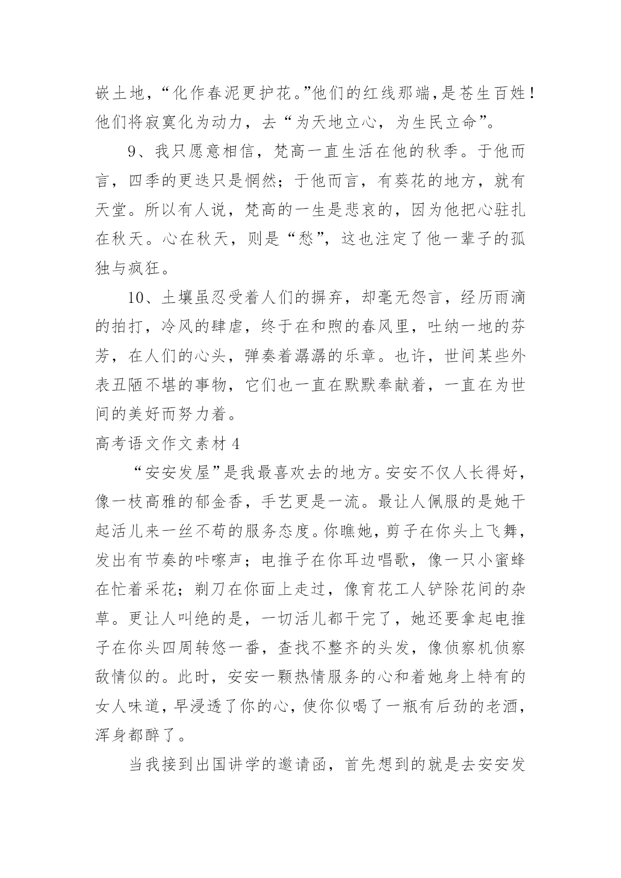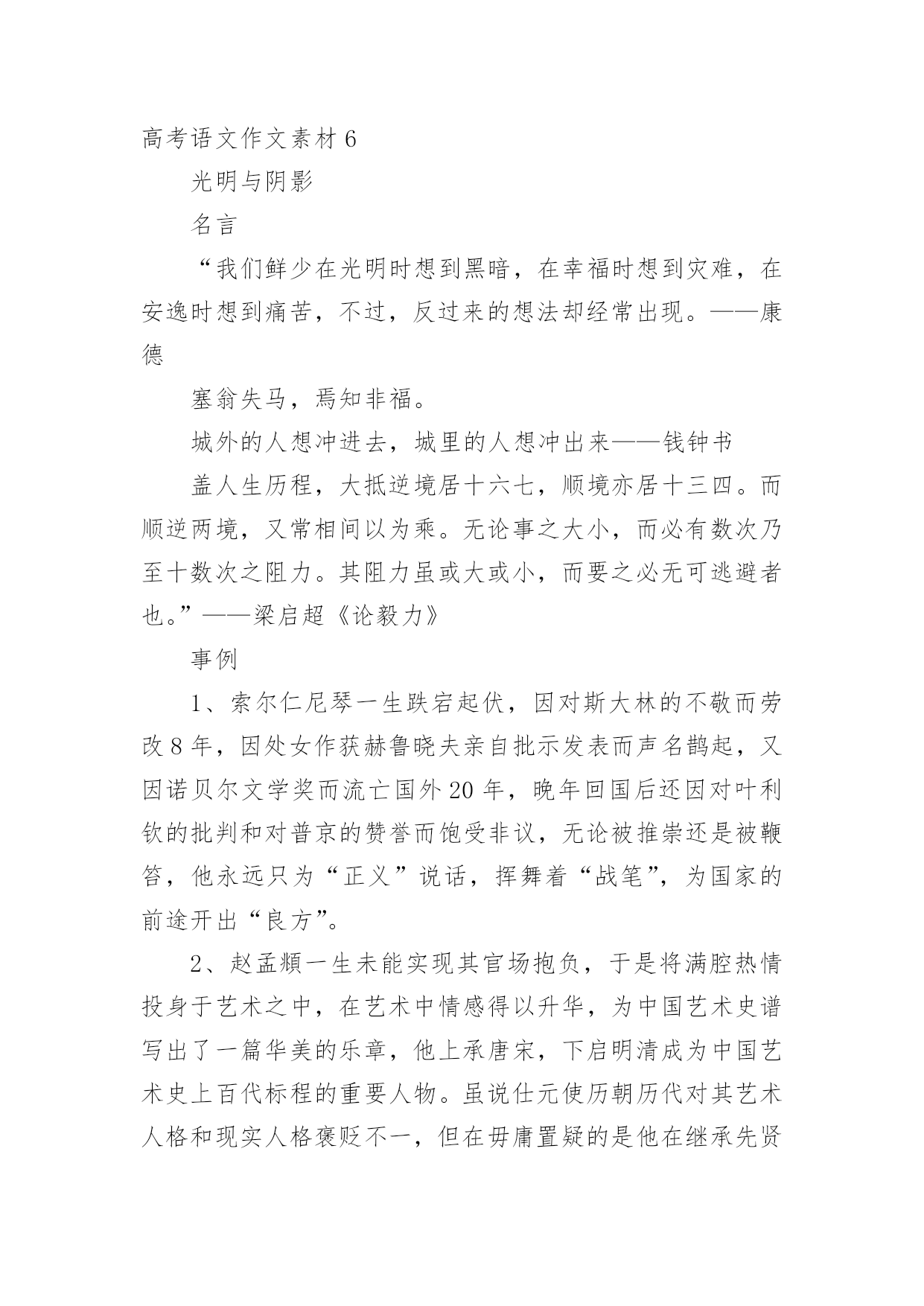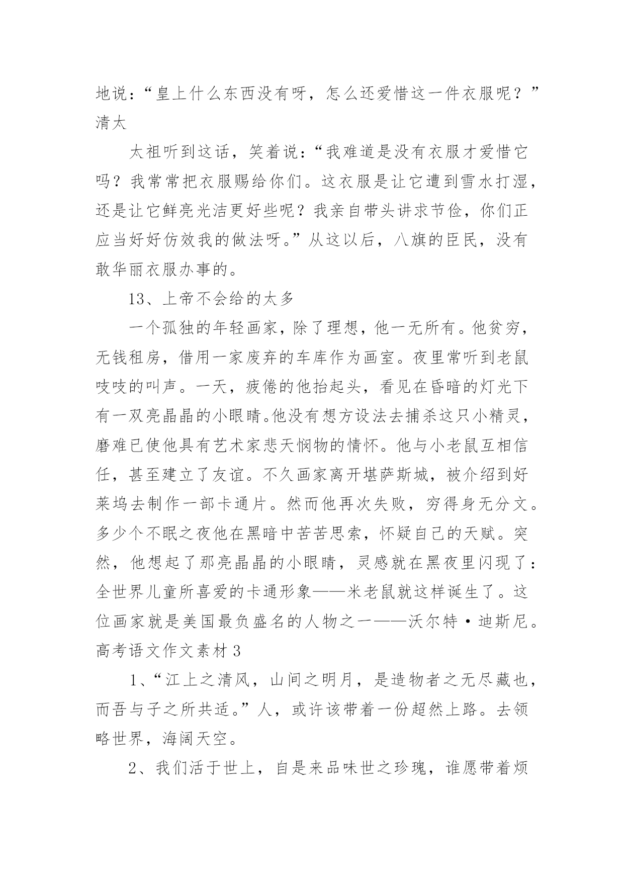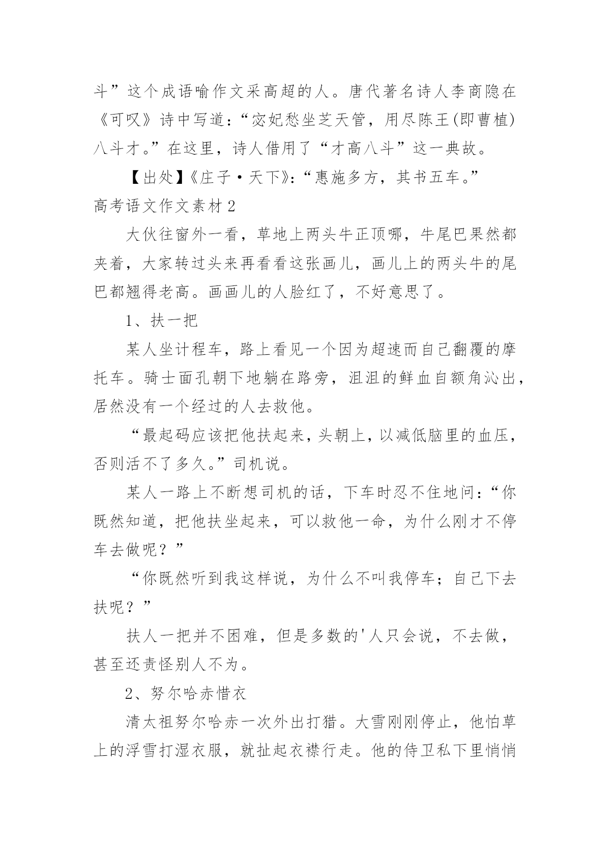 高考语文作文素材高考语文作文素材在学习、工作、生活中,大家对作文都再熟悉不过了吧,通过作文可以把我们那些零零散散的思想,聚集在一块。那么问题来了,到底应如何写一篇优秀的作文呢?下面是小编收集整理的高考语文作文素材,希望能够帮助到大家。高考语文作文素材1学富五车春秋战国之交,是中国奴隶社会向封建社会过渡的大变革时期。生产力的发展,经济基础的变革,政治的动荡,引起了学术文化的变化和进步,私人讲学也开始兴起。私人讲学,把知识传授给统治阶级的下层以至民间,打破了贵族和史官对于知识的垄断,这是我国文化史上的一大进步。随之而来的,是私人藏书的出现。最早致力于私人讲学的的孔子,他那里就有《诗》、《书》、《礼》、《乐》、《易》、《春秋》等书籍。战国时学术空气十分活跃,形成了“百家争鸣”的局面,出现了新的著作。相传苏秦有书数十箧,著名的哲学家惠施“其书五车”,形容学识丰富的成语“学富五车”就是由此而来而竹简始于公元前十一世纪的周代,流行至公元三世纪的东晋。是中国最早的真正意义上的图书。在春秋战国时代,出现了学术上百家争鸣的局面,竹简成为各家著书说的主要形式,得到了极大的发展。如:老子、庄子、孟子、孔子、孙子等。成语“学富五车”中的五车其实就指五车竹简书。学富五车”和“才高八斗”都是称誉学识渊博的。学识怎样用车载量呢?原来这里有两个典故。我国古人已开始用竹片或木片作为信息载体。用以书写的.竹片叫做“简”,又称“策”;用于书写的木片,叫做“方”,又称“犊”。“学富五车”语出《庄子·杂篇·天下》篇:“惠施有方,其书五车。”惠施是战国时哲学家,很有才学,是名家的代表人物。这里是说惠施是个有学问的人,道术很多,他读的书要用五辆车子拉。后来人们便以“五车”、“五车书”、“书五车”、“五车竹简”、“惠车”等来表示对饱学之士的称赞。王安石《赠外孙》:“年小从他爱梨栗,长成须读五车书。”用“学五车”来表示读书多或学问大。“学富五车”的典故,反映了在相当一个历史时期内所使用的传播手段。这么多的简册,运输、存放都很麻烦,人们常形容说:“汗马牛”、“充栋宇”。因而形成了“汗牛充栋”的成语。“八斗”是南朝谢灵运称颂三国魏国诗人曹植时用的比喻。他说:“天下才有一石,曹子建(曹植)独占八斗,我得一斗,天下共分一斗。”(见无名氏《释常谈》)看来,谢灵运对自己的才学也是相当自负的。以后,人们便把“才高八斗”这个成语喻作文采高超的人。唐代著名诗人李商隐在《可叹》诗中写道:“宓妃愁坐芝天管,用尽陈王(即曹植)八斗才。”在这里,诗人借用了“才高八斗”这一典故。【出处】《庄子·天下》:“惠施多方,其书五车。”高考语文作文素材2大伙往窗外一看,草地上两头牛正顶哪,牛尾巴果然都夹着,大家转过头来再看看这张画儿,画儿上的两头牛的尾巴都翘得老高。画画儿的人脸红了,不好意思了。1、扶一把某人坐计程车,路上看见一个因为超速而自己翻覆的摩托车。骑士面孔朝下地躺在路旁,沮沮的鲜血自额角沁出,居然没有一个经过的人去救他。“最起码应该把他扶起来,头朝上,以减低脑里的血压,否则活不了多久。”司机说。某人一路上不断想司机的话,下车时忍不住地问:“你既然知道,把他扶坐起来,可以救他一命,为什么刚才不停车去做呢?”“你既然听到我这样说,为什么不叫我停车;自己下去扶呢?”扶人一把并不困难,但是多数的'人只会说,不去做,甚至还责怪别人不为。2、努尔哈赤惜衣清太祖努尔哈赤一次外出打猎。大雪刚刚停止,他怕草上的浮雪打湿衣服,就扯起衣襟行走。他的侍卫私下里悄悄地说:“皇上什么东西没有呀,怎么还爱惜这一件衣服呢?”清太太祖听到这话,笑着说:“我难道是没有衣服才爱惜它吗?我常常把衣服赐给你们。这衣服是让它遭到雪水打湿,还是让它鲜亮光洁更好些呢?我亲自带头讲求节俭,你们正应当好好仿效我的做法呀。”从这以后,八旗的臣民,没有敢华丽衣服办事的。13、上帝不会给的太多一个孤独的年轻画家,除了理想,他一无所有。他贫穷,无钱租房,借用一家废弃的车库作为画室。夜里常听到老鼠吱吱的叫声。一天,疲倦的他抬起头,看见在昏暗的灯光下有一双亮晶晶的小眼睛。他没有想方设法去捕杀这只小精灵,磨难已使他具有艺术家悲天悯物的情怀。他与小老鼠互相信任,甚至建立了友谊。不久画家离开堪萨斯城,被介绍到好莱坞去制作一部卡通片。然而他再次失败,穷得身无分文。多少个不眠之夜他在黑暗中苦苦思索,怀疑自己的天赋。突然,他想起了那亮晶晶的小眼睛,灵感就在黑夜里闪现了:全世界儿童所喜爱的卡通形象——米老鼠就这样诞生了。这位画家就是美国最负盛名的人物之一——沃尔特·迪斯尼。高考语文作文素材31、“江上之清风,山间之明月,是造物者之无尽藏也,而吾与子之所共适。”人,或许该带着一份超然上路。去领略世界,海阔天空。2、我们活于世上,自是来品味世之珍瑰,谁愿带着烦恼上路,悲恨不知所终