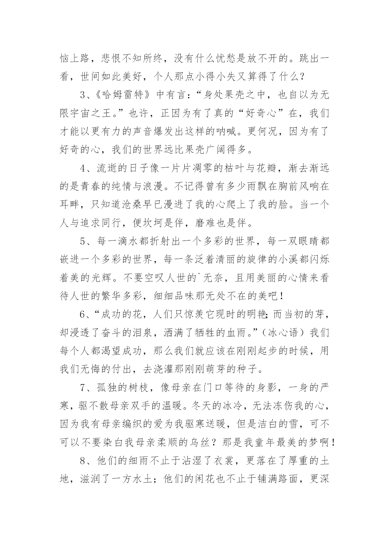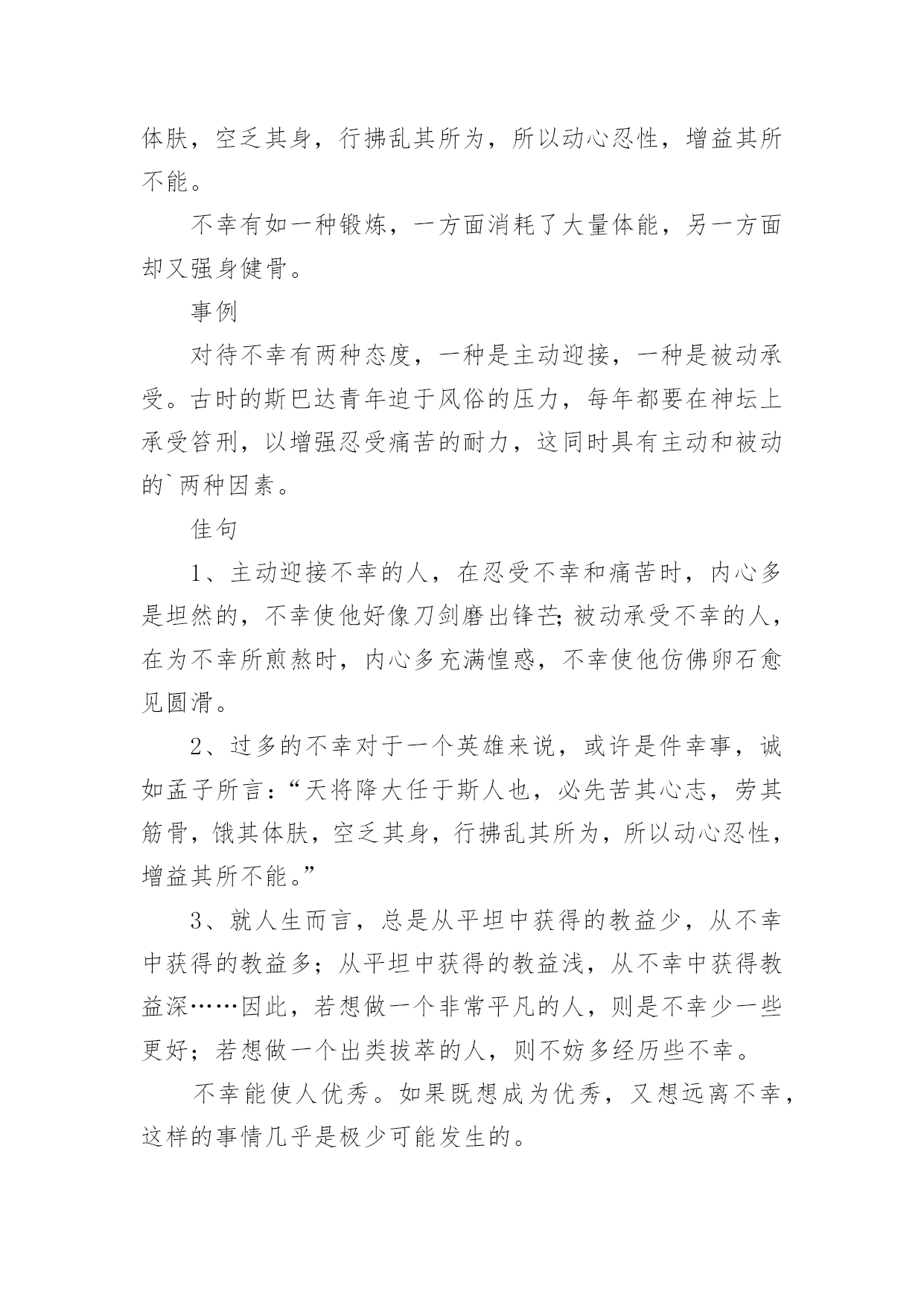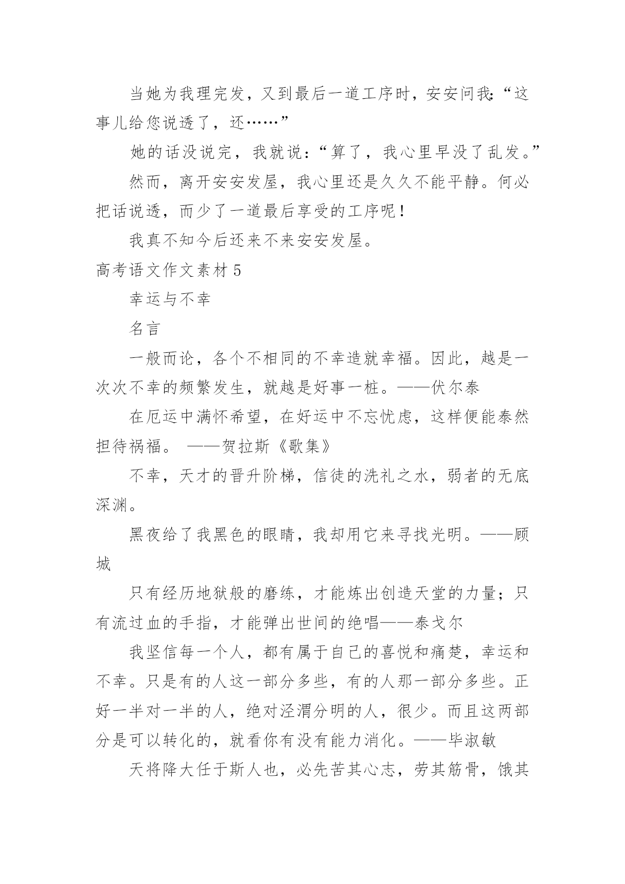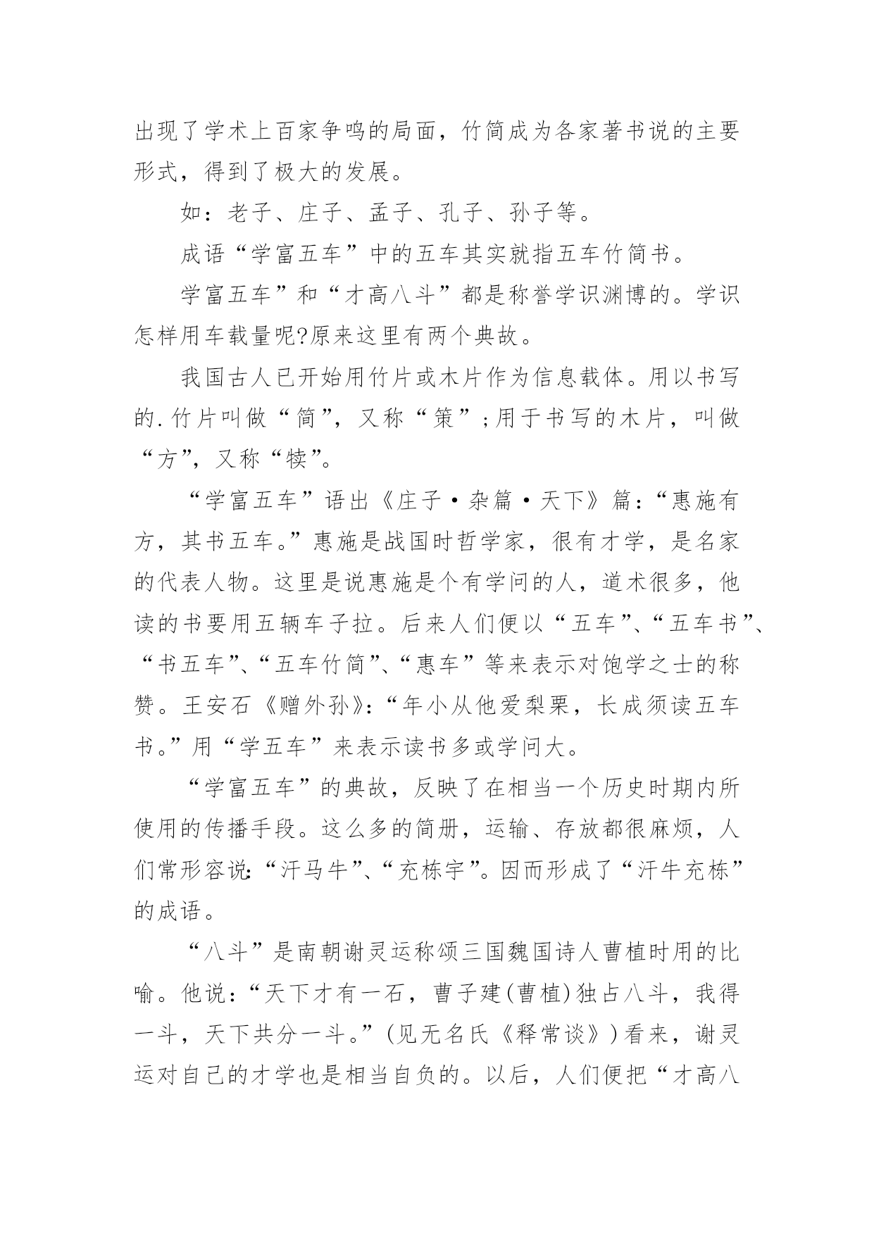 高考语文作文素材高考语文作文素材在学习、工作、生活中,大家对作文都再熟悉不过了吧,通过作文可以把我们那些零零散散的思想,聚集在一块。那么问题来了,到底应如何写一篇优秀的作文呢?下面是小编收集整理的高考语文作文素材,希望能够帮助到大家。高考语文作文素材1学富五车春秋战国之交,是中国奴隶社会向封建社会过渡的大变革时期。生产力的发展,经济基础的变革,政治的动荡,引起了学术文化的变化和进步,私人讲学也开始兴起。私人讲学,把知识传授给统治阶级的下层以至民间,打破了贵族和史官对于知识的垄断,这是我国文化史上的一大进步。随之而来的,是私人藏书的出现。最早致力于私人讲学的的孔子,他那里就有《诗》、《书》、《礼》、《乐》、《易》、《春秋》等书籍。战国时学术空气十分活跃,形成了“百家争鸣”的局面,出现了新的著作。相传苏秦有书数十箧,著名的哲学家惠施“其书五车”,形容学识丰富的成语“学富五车”就是由此而来而竹简始于公元前十一世纪的周代,流行至公元三世纪的东晋。是中国最早的真正意义上的图书。在春秋战国时代,出现了学术上百家争鸣的局面,竹简成为各家著书说的主要形式,得到了极大的发展。如:老子、庄子、孟子、孔子、孙子等。成语“学富五车”中的五车其实就指五车竹简书。学富五车”和“才高八斗”都是称誉学识渊博的。学识怎样用车载量呢?原来这里有两个典故。我国古人已开始用竹片或木片作为信息载体。用以书写的.竹片叫做“简”,又称“策”;用于书写的木片,叫做“方”,又称“犊”。“学富五车”语出《庄子·杂篇·天下》篇:“惠施有方,其书五车。”惠施是战国时哲学家,很有才学,是名家的代表人物。这里是说惠施是个有学问的人,道术很多,他读的书要用五辆车子拉。后来人们便以“五车”、“五车书”、“书五车”、“五车竹简”、“惠车”等来表示对饱学之士的称赞。王安石《赠外孙》:“年小从他爱梨栗,长成须读五车书。”用“学五车”来表示读书多或学问大。“学富五车”的典故,反映了在相当一个历史时期内所使用的传播手段。这么多的简册,运输、存放都很麻烦,人们常形容说:“汗马牛”、“充栋宇”。因而形成了“汗牛充栋”的成语。“八斗”是南朝谢灵运称颂三国魏国诗人曹植时用的比喻。他说:“天下才有一石,曹子建(曹植)独占八斗,我得一斗,天下共分一斗。”(见无名氏《释常谈》)看来,谢灵运对自己的才学也是相当自负的。以后,人们便把“才高八斗”这个成语喻作文采高超的人。唐代著名诗人李商隐在《可叹》诗中写道:“宓妃愁坐芝天管,用尽陈王(即曹植)八斗才。”在这里,诗人借用了“才高八斗”这一典故。【出处】《庄子·天下》:“惠施多方,其书五车。”高考语文作文素材2大伙往窗外一看,草地上两头牛正顶哪,牛尾巴果然都夹着,大家转过头来再看看这张画儿,画儿上的两头牛的尾巴都翘得老高。画画儿的人脸红了,不好意思了。1、扶一把某人坐计程车,路上看见一个因为超速而自己翻覆的摩托车。骑士面孔朝下地躺在路旁,沮沮的鲜血自额角沁出,居然没有一个经过的人去救他。“最起码应该把他扶起来,头朝上,以减低脑里的血压,否则活不了多久。”司机说。某人一路上不断想司机的话,下车时忍不住地问:“你既然知道,把他扶坐起来,可以救他一命,为什么刚才不停车去做呢?”“你既然听到我这样说,为什么不叫我停车;自己下去扶呢?”扶人一把并不困难,但是多数的'人只会说,不去做,甚至还责怪别人不为。2、努尔哈赤惜衣清太祖努尔哈赤一次外出打猎。大雪刚刚停止,他怕草上的浮雪打湿衣服,就扯起衣襟行走。他的侍卫私下里悄悄地说:“皇上什么东西没有呀,怎么还爱惜这一件衣服呢?”清太太祖听到这话,笑着说:“我难道是没有衣服才爱惜它吗?我常常把衣服赐给你们。这衣服是让它遭到雪水打湿,还是让它鲜亮光洁更好些呢?我亲自带头讲求节俭,你们正应当好好仿效我的做法呀。”从这以后,八旗的臣民,没有敢华丽衣服办事的。13、上帝不会给的太多一个孤独的年轻画家,除了理想,他一无所有。他贫穷,无钱租房,借用一家废弃的车库作为画室。夜里常听到老鼠吱吱的叫声。一天,疲倦的他抬起头,看见在昏暗的灯光下有一双亮晶晶的小眼睛。他没有想方设法去捕杀这只小精灵,磨难已使他具有艺术家悲天悯物的情怀。他与小老鼠互相信任,甚至建立了友谊。不久画家离开堪萨斯城,被介绍到好莱坞去制作一部卡通片。然而他再次失败,穷得身无分文。多少个不眠之夜他在黑暗中苦苦思索,怀疑自己的天赋。突然,他想起了那亮晶晶的小眼睛,灵感就在黑夜里闪现了:全世界儿童所喜爱的卡通形象——米老鼠就这样诞生了。这位画家就是美国最负盛名的人物之一——沃尔特·迪斯尼。高考语文作文素材31、“江上之清风,山间之明月,是造物者之无尽藏也,而吾与子之所共适。”人,或许该带着一份超然上路。去领略世界,海阔天空。2、我们活于世上,自是来品味世之珍瑰,谁愿带着烦恼上路,悲恨不知所终