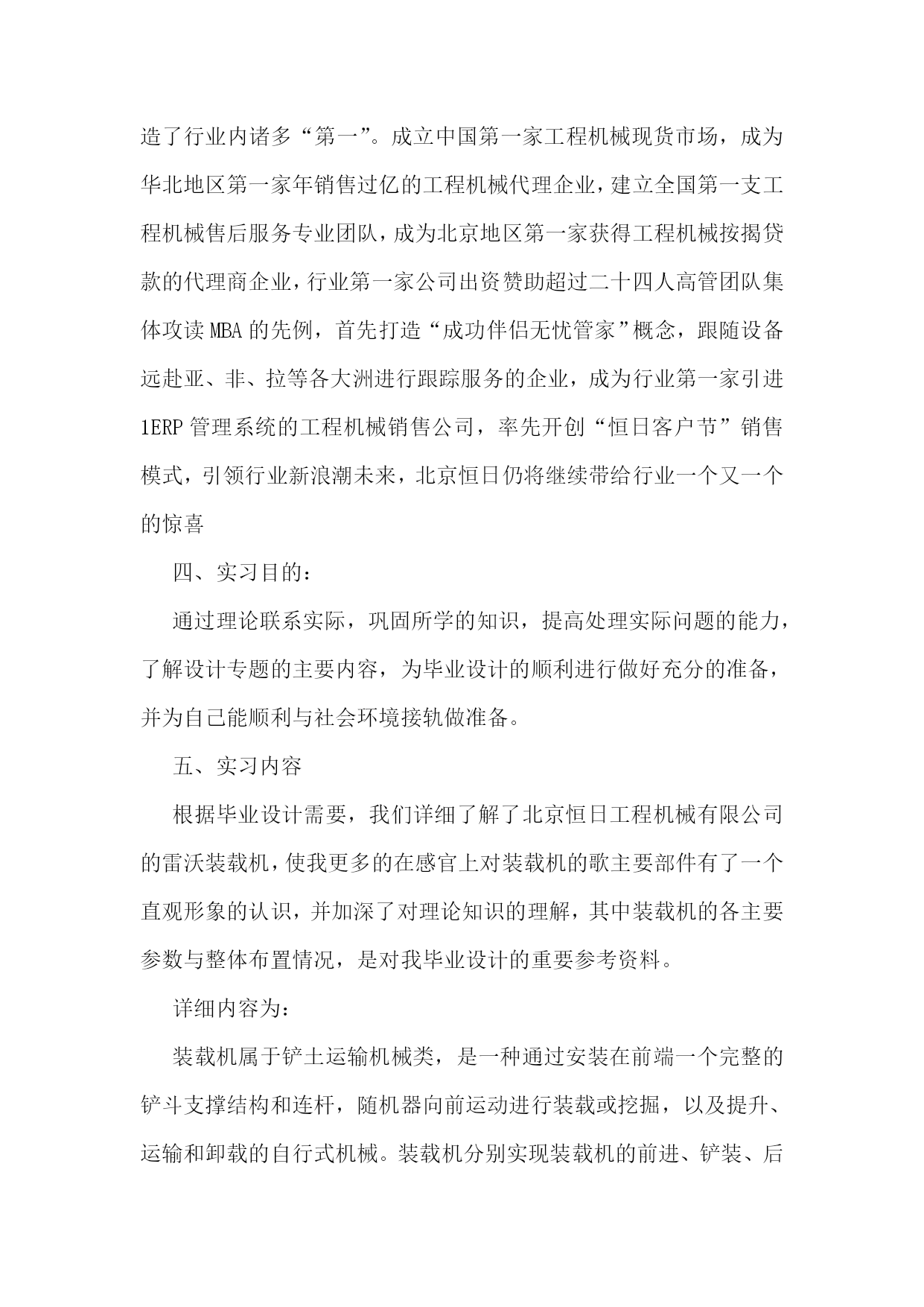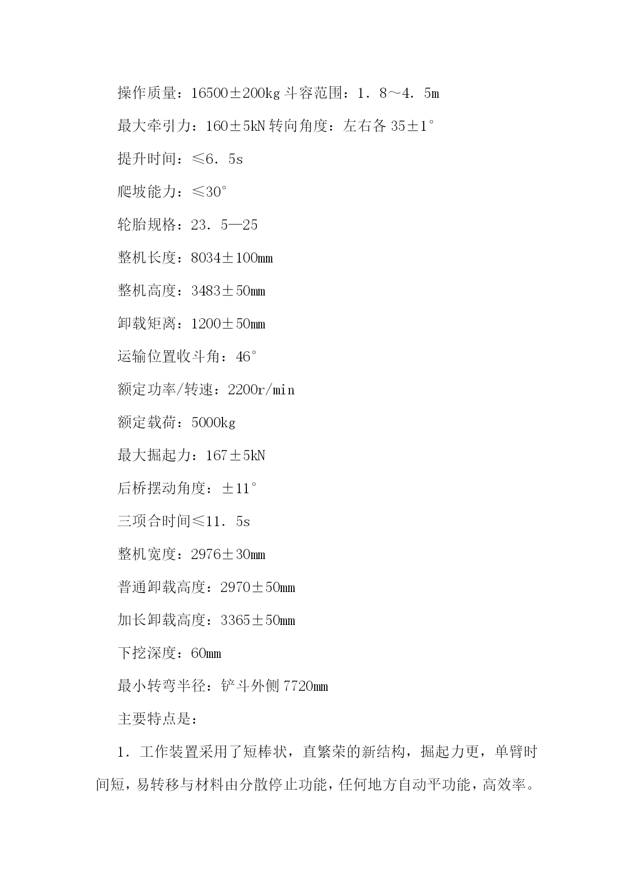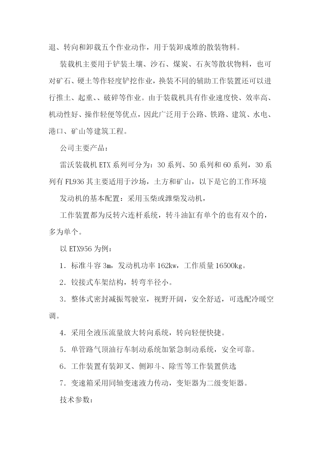 工程机械实习报告工程机械实习报告1一、实习时间:20xx.05二、实习单位:北京恒日工程机械有限公司三、实习单位基本情况简介北京雷沃工程机械有限公司北京恒日工程机械有限公司(简称北京恒日),成立于1997年,旗下包括北京恒日投资有限公司、北京小松工程机械有限公司、北京山推工程机械有限公司,是为国内矿山、桥梁、公路、水利、地产、铁路、物流企业以及诸多基础建设行业提供工程机械类最优产品和最佳服务的专业公司,是国内一大批央企挖掘机、装载机、推土机、叉车等工程机械设备使用单位的战略合作伙伴,是中国工程机械工业协会代理商委员会副理事长级单位,享有国家经贸委授予的进出口经营权。截止20xx年底,北京恒日总资产达到25000万元,年销售收入突破20xx00万元,纳税超过7000万元。在职员工近20xx人,专业技术人员500人,遍布全国14家子公司,超过100家服务站,各地服务车300余辆。拥有国内行业中最为完备的办公设施和现代化车间,是中华人民共和国劳动与社会保障部指定的工程机械维修工劳动技能鉴定单位,是国内最大的工程机械销售公司和行业最具声誉的标杆企业。北京恒日自创建伊始即立志成为行业进步的领导者和推动者,创造了行业内诸多“第一”。成立中国第一家工程机械现货市场,成为华北地区第一家年销售过亿的工程机械代理企业,建立全国第一支工程机械售后服务专业团队,成为北京地区第一家获得工程机械按揭贷款的代理商企业,行业第一家公司出资赞助超过二十四人高管团队集体攻读MBA的先例,首先打造“成功伴侣无忧管家”概念,跟随设备远赴亚、非、拉等各大洲进行跟踪服务的企业,成为行业第一家引进1ERP管理系统的工程机械销售公司,率先开创“恒日客户节”销售模式,引领行业新浪潮未来,北京恒日仍将继续带给行业一个又一个的惊喜四、实习目的:通过理论联系实际,巩固所学的知识,提高处理实际问题的能力,了解设计专题的主要内容,为毕业设计的顺利进行做好充分的准备,并为自己能顺利与社会环境接轨做准备。五、实习内容根据毕业设计需要,我们详细了解了北京恒日工程机械有限公司的雷沃装载机,使我更多的在感官上对装载机的歌主要部件有了一个直观形象的认识,并加深了对理论知识的理解,其中装载机的各主要参数与整体布置情况,是对我毕业设计的重要参考资料。详细内容为:装载机属于铲土运输机械类,是一种通过安装在前端一个完整的铲斗支撑结构和连杆,随机器向前运动进行装载或挖掘,以及提升、运输和卸载的自行式机械。装载机分别实现装载机的前进、铲装、后退、转向和卸载五个作业动作,用于装卸成堆的散装物料。装载机主要用于铲装土壤、沙石、煤炭、石灰等散状物料,也可对矿石、硬土等作轻度铲挖作业,换装不同的辅助工作装置还可以进行推土、起重、、破碎等作业。由于装载机具有作业速度快、效率高、机动性好、操作轻便等优点,因此广泛用于公路、铁路、建筑、水电、港口、矿山等建筑工程。公司主要产品:雷沃装载机ETX系列可分为:30系列、50系列和60系列,30系列有FL936其主要适用于沙场,土方和矿山,以下是它的工作环境发动机的基本配置:采用玉柴或潍柴发动机,工作装置都为反转六连杆系统,转斗油缸有单个的也有双个的,多为单个。以ETX956为例:1.标准斗容3m,发动机功率162kw,工作质量16500kg。2.铰接式车架结构,转弯半径小。3.整体式密封减振驾驶室,视野开阔,安全舒适,可选配冷暖空调。4.采用全液压流量放大转向系统,转向轻便快捷。5.单管路气顶油行车制动系统加紧急制动系统,安全可靠。6.工作装置有装卸叉、侧卸斗、除雪等工作装置供选7.变速箱采用同轴变速液力传动,变矩器为二级变矩器。技术参数:操作质量:16500±200kg斗容范围:1.8~4.5m最大牵引力:160±5kN转向角度:左右各35±1°提升时间:≤6.5s爬坡能力:≤30°轮胎规格:23.5—25整机长度:8034±100mm整机高度:3483±50mm卸载矩离:1200±50mm运输位置收斗角:46°额定功率/转速:2200r/min额定载荷:5000kg最大掘起力:167±5kN后桥摆动角度:±11°三项合时间≤11.5s整机宽度:2976±30mm普通卸载高度:2970±50mm加长卸载高度:3365±50mm下挖深度:60mm最小转弯半径:铲斗外侧7720mm主要特点是:1.工作装置采用了短棒状,直繁荣的新结构,掘起力更,单臂时间短,易转移与材料由分散停止功能,任何地方自动平功能,高效率。2.前后车架铰链中的轴距,这种结构类型中安排点,这台机器有一个较小的转弯半径,提高整体稳定性。没有前后桥之间,无动力循环消费,前方和后方的轨道速度的差异始终是相同的,降低转向