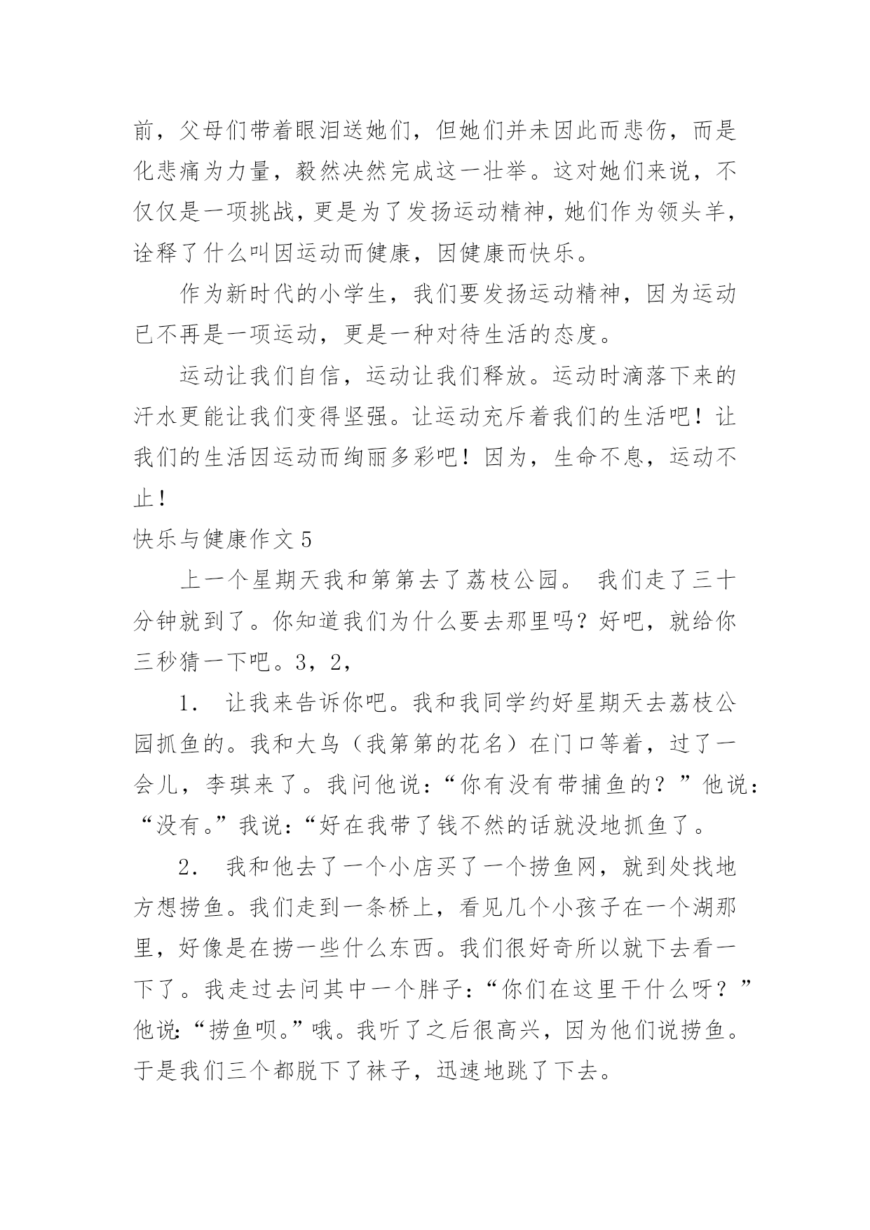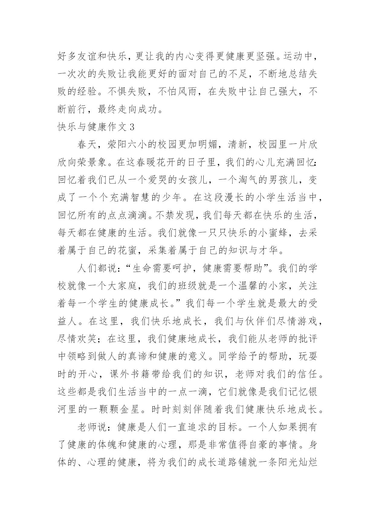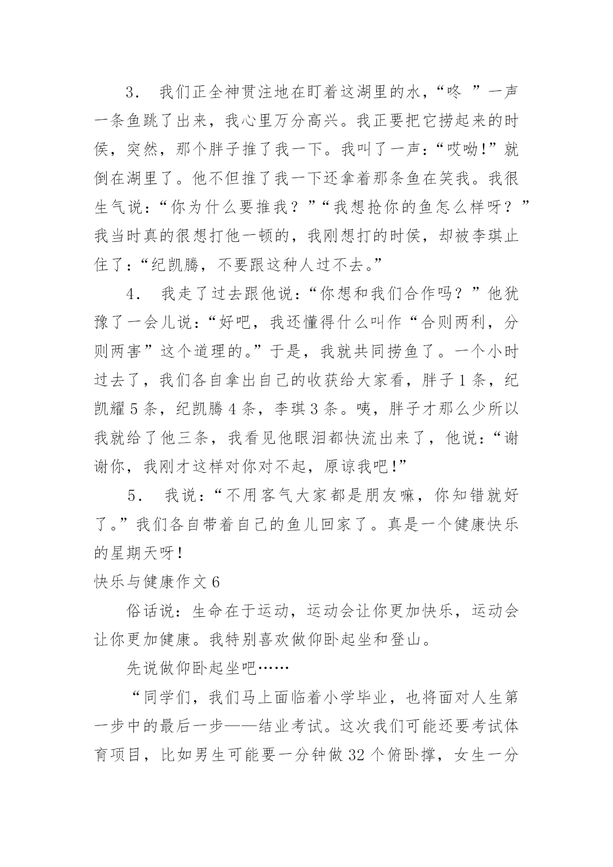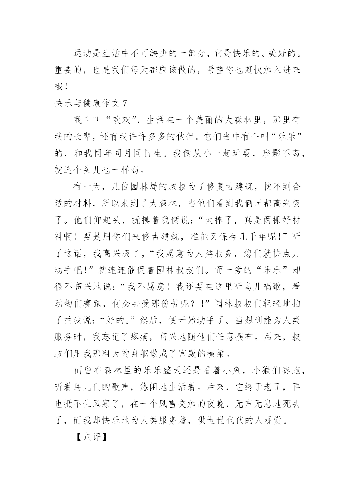 快乐与健康作文快乐与健康作文在平平淡淡的学习、工作、生活中,大家都接触过作文吧,借助作文人们可以实现文化交流的目的。你知道作文怎样写才规范吗?以下是小编收集整理的快乐与健康作文,希望能够帮助到大家。快乐与健康作文1自从我初进校园,我遍对着鲜红的国旗立下了目标勤奋学习,快乐生活,健康成长。现在,我长大了,升入曾经那遥不可及的五年级了,对曾经立下的目标,我也有了更深远的理解。常言道:“一份耕耘,一份收获”,在我们的生活中,只要努力,就可以获得成就。不劳而获的事情是不存在的,机会只属于那些勤奋好学的人。就拿学习来说吧,我们经常可以在校园内看到这样的现象:一些同学学习态度不好,马马虎虎,不认真,他们的成绩就差;一些同学学习努力,认真,勤奋好学,他们的成绩就优异。在作业方面,有些同学双休日只顾玩,星期日晚上写作业到位10点多才完成,星期一早上还要早起,这样连大人都吃不消,何况正处在生长期的我们呢?这样既没有做到勤奋学习,也没有做到健康成长,更谈何优异的成绩呢?健康可以说是我们最重要,最宝贵的财富,只有健康,才可以广交朋友,努力学习,拥有财富和地位。要想健康成长,就必须有良好的生活习惯,注意休息。只有保证了充足的睡眠,才可以有最好的学习状态,有最佳的学习成绩。每天按时早起早睡,并且坚持锻炼,劳逸结合,做一个身体健康,性趣爱好广泛,拥有良好的生活习惯和健康情趣的人。如果我们已经做到了上面两条勤奋学习,健康成长,那么我们就一定能感受到学习的快乐。我想,如果你能够认真做好每一件事,你一定会觉得很开心吧!如果我们没有做完老师布置的作业,心里一定很忐忑吧,为图一时痛快而让更多时候接受心灵的折磨,甚至受到自身良心的谴责,这样会快乐吗?快乐的生活来源于良好健康的兴趣爱好,乐观向上的心态,拥有一个健康壮实的好身体。让我们共同健康快乐地成长吧,使自己永远充满活力与激情,在快乐的生活中张开远航的风帆,驶向理想的彼岸!快乐与健康作文2“更快、更高、更强”这句奥运口号大家应该都不陌生吧?这不仅是奥运健儿们的追求,也表达了我们每一个普通人对运动的热爱与梦想。在运动中我们挥洒汗水,收获快乐、收获友谊、收获健康。记得三年级时我迷上了前抛实心球这项运动,特意让妈妈买了实心球,天天自己练。幸运的是,因为我比较有力气被老师选中,有机会参加校运动会,代表班级“出战”。这下我的干劲更大了,每天都利用午休时间,顶着毒辣辣的太阳在操场上苦练。伴随着一身一身的臭汗、越来越黑的小脸,成绩也一点点地提高。苦不苦,苦!累不累,累!可看到成绩,内心是快乐的。距离比赛的日子越来越近,我们由个人单独练习改为集体练习。训练中大家一起找缺点、一起总结经验。相互鼓励、共同进步,为同学们不断取得的好成绩感到开心。隔壁班有位男同学,看大家练得辛苦,经常表演一些滑稽的动作,逗得我们捧腹大笑,训练场上留下了我们一串串的笑声。日子在一天天的苦练中过去,比赛的时刻终于到来。站在赛场上,我们个个精神抖擞,斗志昂扬。虽然都是竞争对手,可平时的训练早已让彼此都成为朋友。大家互相打气,期待都能取得好成绩。终于轮到我了,每个人有三次机会。由于是第一次参加比赛,我的心里十分紧张。第一、二次成绩都不理想,低于平时的训练成绩。只剩下最后一次机会了,我紧张的腿都有些打颤。排在我后面的“对手”看到后,上来给我一个拥抱。瞬间,我释然了,比赛成绩固然重要,可享受比赛的过程更重要,运动的本质就是让人快乐,只要我尽力了,快乐的享受就好。我感觉赛场上的空气不再凝固,身体也放松下来。再次站在投掷点,我深吸了一口气,又在脑子里重温了一遍动作要领,将球高高地举过头顶,拼劲全力将球抛了出去。看,实心球划出了一道美丽的弧线落在了地面上,果然,比前两次成绩好得多。虽然最终我没有取得冠军,但也让我收获了很多。运动是一件神奇的事情,它不但让我的身体更健康,让我收获了好多友谊和快乐,更让我的内心变得更健康更坚强。运动中,一次次的失败让我能更好的面对自己的不足,不断地总结失败的经验。不惧失败,不怕风雨,在失败中让自己强大,不断前行,最终走向成功。快乐与健康作文3春天,荥阳六小的校园更加明媚,清新,校园里一片欣欣向荣景象。在这春暖花开的日子里,我们的心儿充满回忆:回忆着我们已从一个爱哭的女孩儿,一个淘气的男孩儿,变成了一个个充满智慧的少年。在这段漫长的小学生活当中,回忆所有的点点滴滴。不禁发现,我们每天都在快乐的生活,每天都在健康的生活。我们就像一只只快乐的小蜜蜂,去采着属于自己的花蜜,采集着属于自己的知识与才华。人们都说:“生命需要呵护,健康需要帮助”。我们的学校就像一个大家庭,我们的班级就是一个温馨的小家,关注着每一个学生的健康成长。”我们每一个学生就是最大的受益人。在这里,我们快乐地成长,我们与伙伴们尽情游戏,尽情欢笑;在这里,我们健康地成长,我们能从老