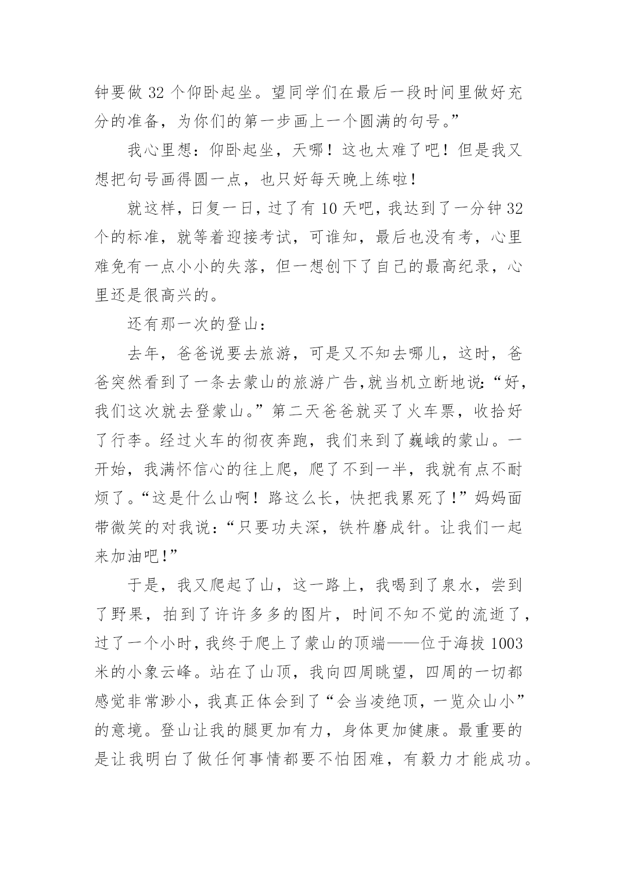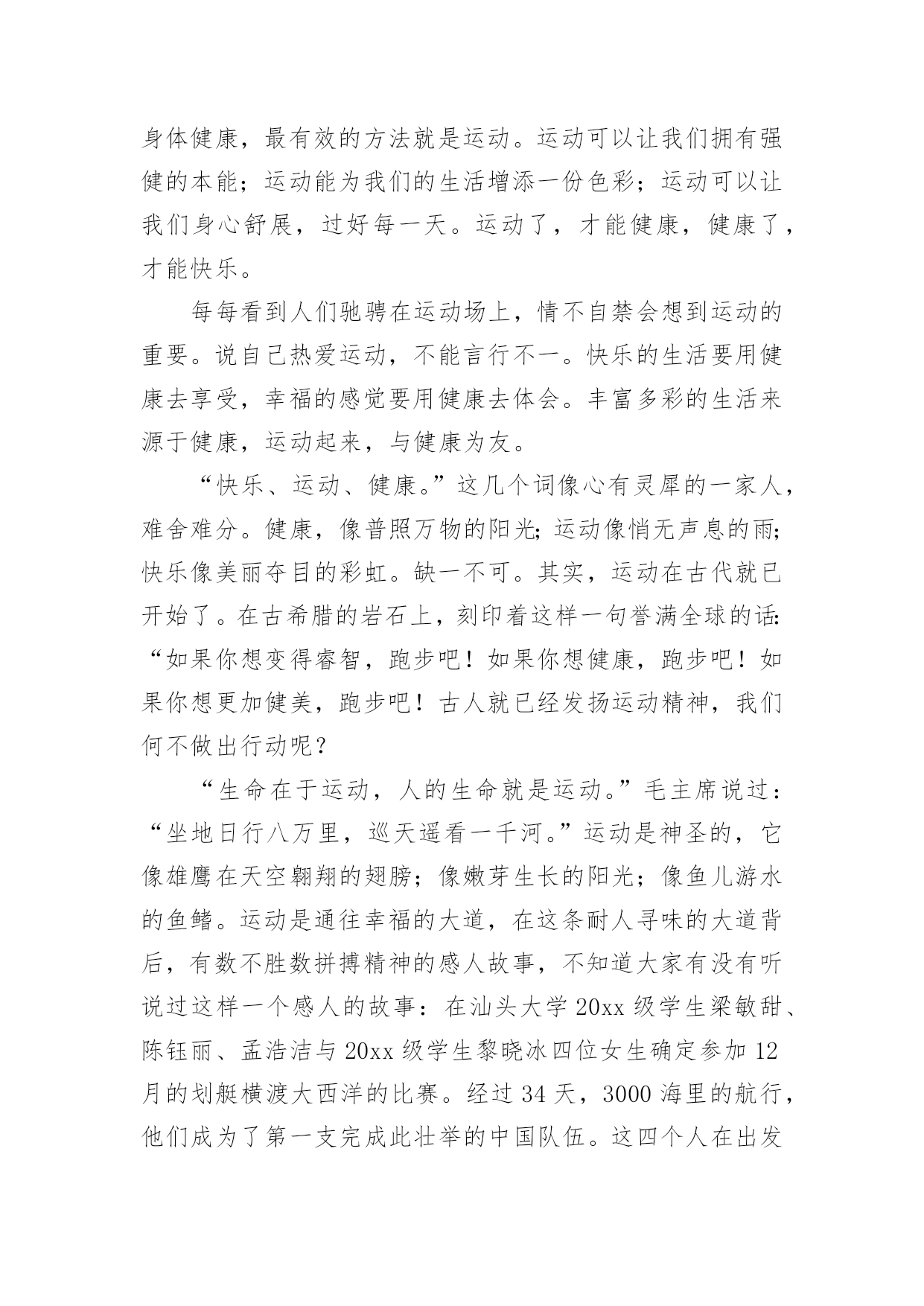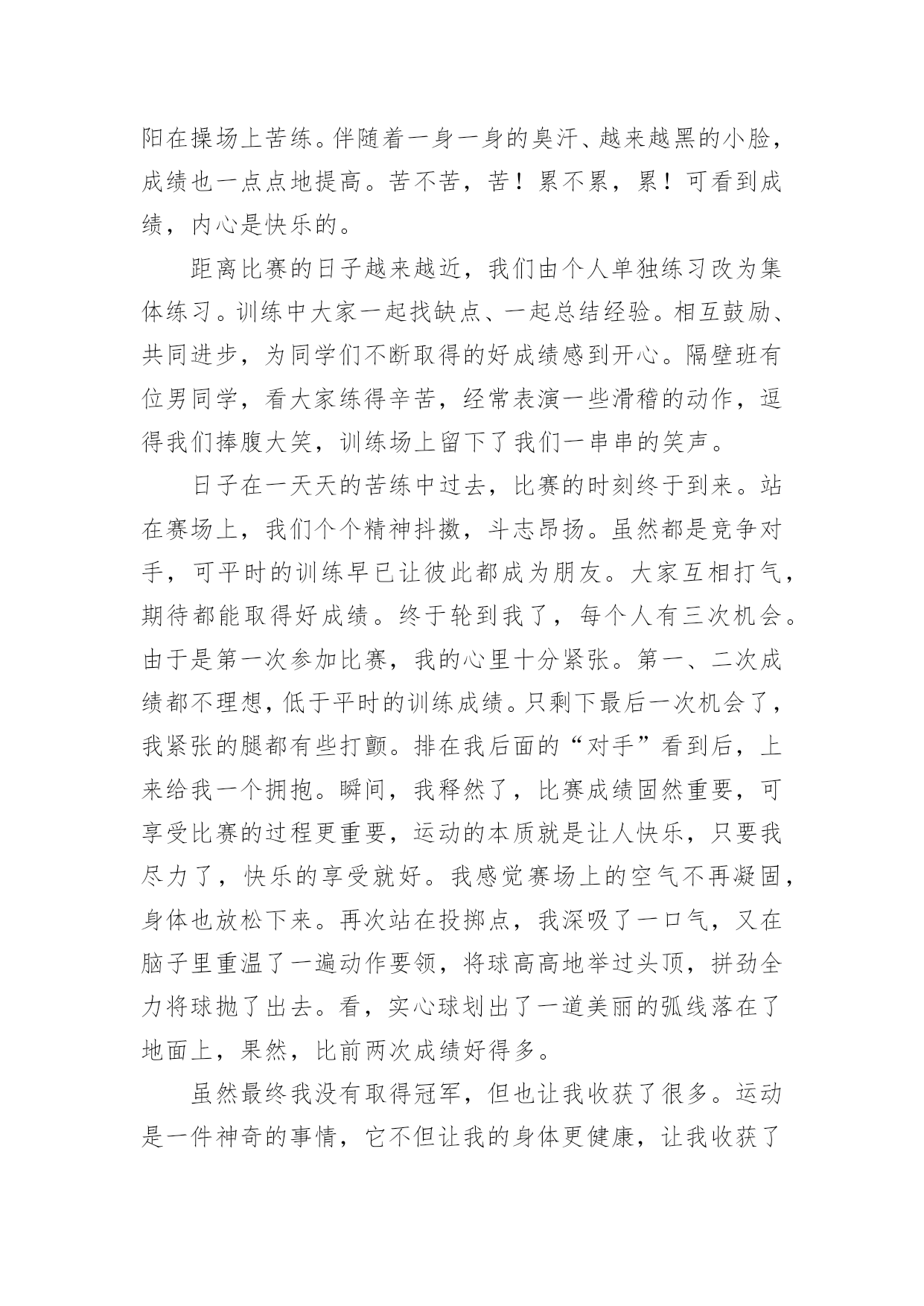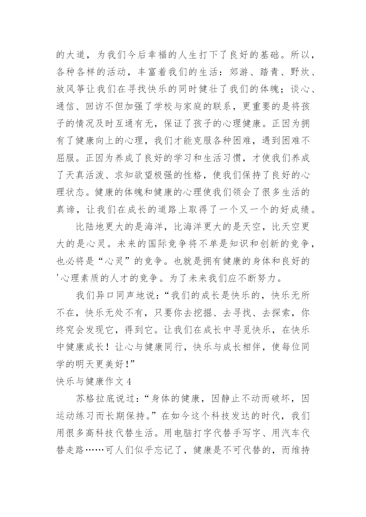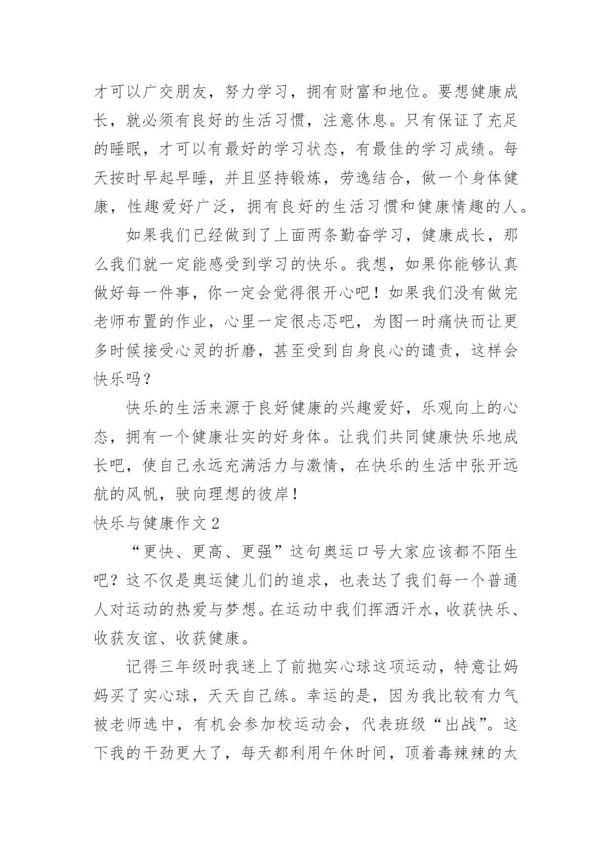 快乐与健康作文快乐与健康作文在平平淡淡的学习、工作、生活中,大家都接触过作文吧,借助作文人们可以实现文化交流的目的。你知道作文怎样写才规范吗?以下是小编收集整理的快乐与健康作文,希望能够帮助到大家。快乐与健康作文1自从我初进校园,我遍对着鲜红的国旗立下了目标勤奋学习,快乐生活,健康成长。现在,我长大了,升入曾经那遥不可及的五年级了,对曾经立下的目标,我也有了更深远的理解。常言道:“一份耕耘,一份收获”,在我们的生活中,只要努力,就可以获得成就。不劳而获的事情是不存在的,机会只属于那些勤奋好学的人。就拿学习来说吧,我们经常可以在校园内看到这样的现象:一些同学学习态度不好,马马虎虎,不认真,他们的成绩就差;一些同学学习努力,认真,勤奋好学,他们的成绩就优异。在作业方面,有些同学双休日只顾玩,星期日晚上写作业到位10点多才完成,星期一早上还要早起,这样连大人都吃不消,何况正处在生长期的我们呢?这样既没有做到勤奋学习,也没有做到健康成长,更谈何优异的成绩呢?健康可以说是我们最重要,最宝贵的财富,只有健康,才可以广交朋友,努力学习,拥有财富和地位。要想健康成长,就必须有良好的生活习惯,注意休息。只有保证了充足的睡眠,才可以有最好的学习状态,有最佳的学习成绩。每天按时早起早睡,并且坚持锻炼,劳逸结合,做一个身体健康,性趣爱好广泛,拥有良好的生活习惯和健康情趣的人。如果我们已经做到了上面两条勤奋学习,健康成长,那么我们就一定能感受到学习的快乐。我想,如果你能够认真做好每一件事,你一定会觉得很开心吧!如果我们没有做完老师布置的作业,心里一定很忐忑吧,为图一时痛快而让更多时候接受心灵的折磨,甚至受到自身良心的谴责,这样会快乐吗?快乐的生活来源于良好健康的兴趣爱好,乐观向上的心态,拥有一个健康壮实的好身体。让我们共同健康快乐地成长吧,使自己永远充满活力与激情,在快乐的生活中张开远航的风帆,驶向理想的彼岸!快乐与健康作文2“更快、更高、更强”这句奥运口号大家应该都不陌生吧?这不仅是奥运健儿们的追求,也表达了我们每一个普通人对运动的热爱与梦想。在运动中我们挥洒汗水,收获快乐、收获友谊、收获健康。记得三年级时我迷上了前抛实心球这项运动,特意让妈妈买了实心球,天天自己练。幸运的是,因为我比较有力气被老师选中,有机会参加校运动会,代表班级“出战”。这下我的干劲更大了,每天都利用午休时间,顶着毒辣辣的太阳在操场上苦练。伴随着一身一身的臭汗、越来越黑的小脸,成绩也一点点地提高。苦不苦,苦!累不累,累!可看到成绩,内心是快乐的。距离比赛的日子越来越近,我们由个人单独练习改为集体练习。训练中大家一起找缺点、一起总结经验。相互鼓励、共同进步,为同学们不断取得的好成绩感到开心。隔壁班有位男同学,看大家练得辛苦,经常表演一些滑稽的动作,逗得我们捧腹大笑,训练场上留下了我们一串串的笑声。日子在一天天的苦练中过去,比赛的时刻终于到来。站在赛场上,我们个个精神抖擞,斗志昂扬。虽然都是竞争对手,可平时的训练早已让彼此都成为朋友。大家互相打气,期待都能取得好成绩。终于轮到我了,每个人有三次机会。由于是第一次参加比赛,我的心里十分紧张。第一、二次成绩都不理想,低于平时的训练成绩。只剩下最后一次机会了,我紧张的腿都有些打颤。排在我后面的“对手”看到后,上来给我一个拥抱。瞬间,我释然了,比赛成绩固然重要,可享受比赛的过程更重要,运动的本质就是让人快乐,只要我尽力了,快乐的享受就好。我感觉赛场上的空气不再凝固,身体也放松下来。再次站在投掷点,我深吸了一口气,又在脑子里重温了一遍动作要领,将球高高地举过头顶,拼劲全力将球抛了出去。看,实心球划出了一道美丽的弧线落在了地面上,果然,比前两次成绩好得多。虽然最终我没有取得冠军,但也让我收获了很多。运动是一件神奇的事情,它不但让我的身体更健康,让我收获了好多友谊和快乐,更让我的内心变得更健康更坚强。运动中,一次次的失败让我能更好的面对自己的不足,不断地总结失败的经验。不惧失败,不怕风雨,在失败中让自己强大,不断前行,最终走向成功。快乐与健康作文3春天,荥阳六小的校园更加明媚,清新,校园里一片欣欣向荣景象。在这春暖花开的日子里,我们的心儿充满回忆:回忆着我们已从一个爱哭的女孩儿,一个淘气的男孩儿,变成了一个个充满智慧的少年。在这段漫长的小学生活当中,回忆所有的点点滴滴。不禁发现,我们每天都在快乐的生活,每天都在健康的生活。我们就像一只只快乐的小蜜蜂,去采着属于自己的花蜜,采集着属于自己的知识与才华。人们都说:“生命需要呵护,健康需要帮助”。我们的学校就像一个大家庭,我们的班级就是一个温馨的小家,关注着每一个学生的健康成长。”我们每一个学生就是最大的受益人。在这里,我们快乐地成长,我们与伙伴们尽情游戏,尽情欢笑;在这里,我们健康地成长,我们能从老