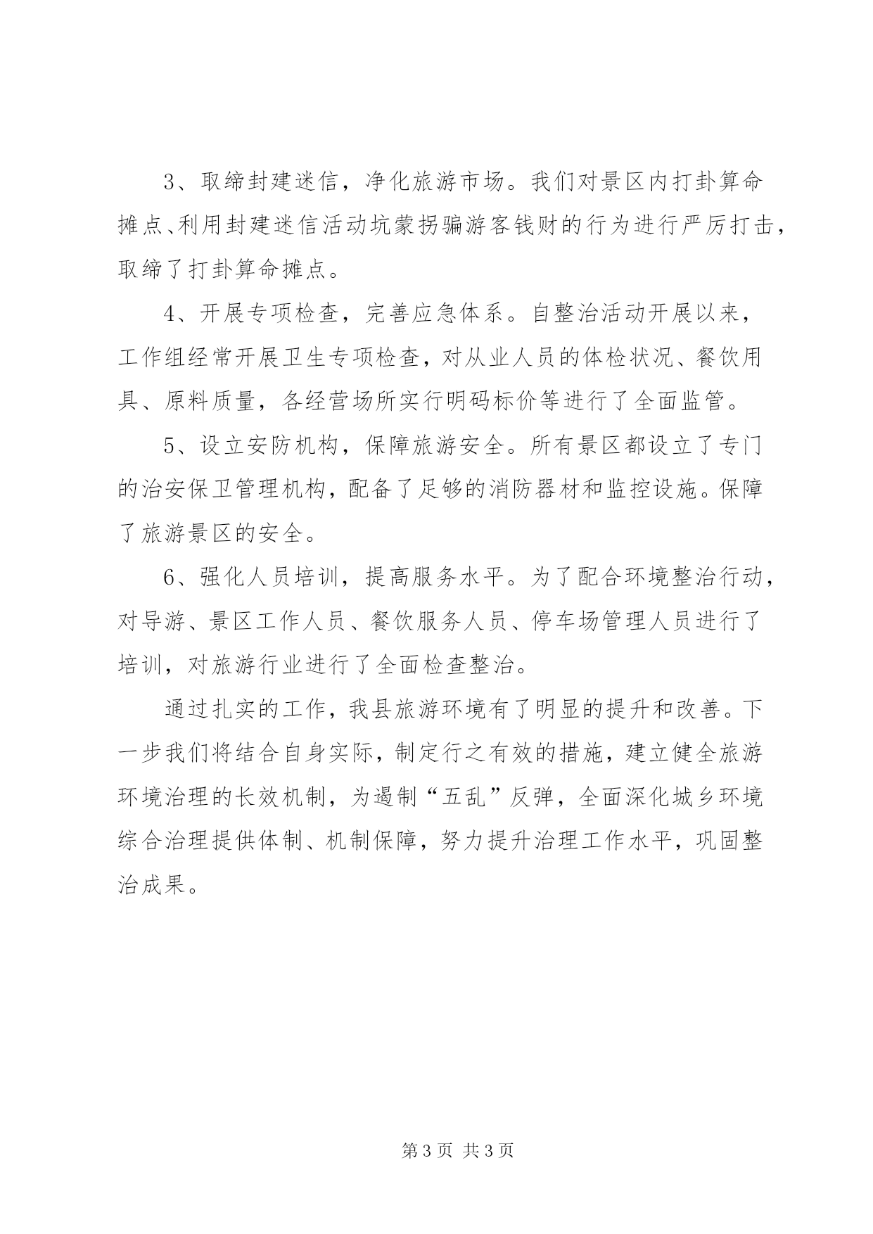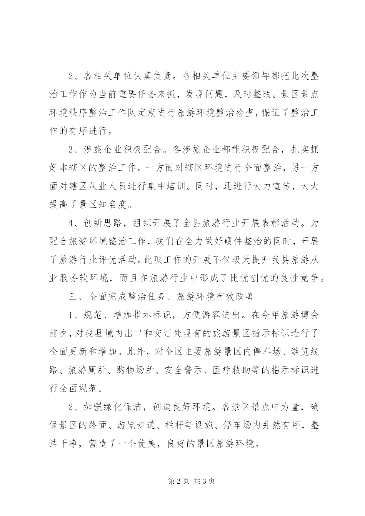 第PAGE\*Arabic\*MERGEFORMAT3页共NUMPAGES\*MERGEFORMAT3页县旅游局XX年旅游市场整治工作总结根据市旅体委的统一安排和布署,我局严格按照各级文件的通知精神,狠抓旅游消费环境“打非治乱”暨“不合理低价游”专项整治,全县旅游景区、宾馆饭店、乡村旅游点环境整治得到了进一步提升,现就将我局专项整治工作情况作以下汇报:一、建立健全工作机构,细化整治工作任务为圆满完成专项整治工作,我局制定和完善了工作方案。建立健全了组织机构,成立了全县旅游市场专项整治工作领导小组,局长王海燕任组长,副局长陈雯任副组长,相关股室负责人为成员,负责全县景区景点环境秩序整治工作。对整治工作任务进行了明确分工。按照工作方案,我们对旅游景区景点内部及周边环境整治确立了工作任务,根据各个相关单位的职能进行了明确的分工,确保了整治工作的顺利开展。二、扎实开展专项行动工作、努力创新工作思路自环境整治活动开展以来,我县旅游景区环境整治领导组以构建和谐社会为目标,坚持专项整治和日常监管相结合,加大执法力度,创新工作思路,切实解决群众反映强烈的旅游景区“五乱”。1、领导高度重视。我局领导非常重视景区环境整治工作,多次带领各相关单位负责人,深入现场办公,逐项查摆问题,提出整改措施,极大地提高了整治工作的成效。2、各相关单位认真负责。各相关单位主要领导都把此次整治工作作为当前重要任务来抓,发现问题,及时整改。景区景点环境秩序整治工作队定期进行旅游环境整治检查,保证了整治工作的有序进行。3、涉旅企业积极配合。各涉旅企业都能积极配合,扎实抓好本辖区的整治工作。一方面对辖区环境进行全面整治,另一方面对辖区从业人员进行集中培训。同时,还进行大力宣传,大大提高了景区知名度。4、创新思路,组织开展了全县旅游行业开展表彰活动。为配合旅游环境整治工作,我们在全力做好硬件整治的同时,开展了旅游行业评优活动。此项工作的开展不仅极大提升我县旅游从业服务软环境,而且在旅游行业中形成了比优创优的良性竞争。三、全面完成整治任务、旅游环境有效改善1、规范、增加指示标识,方便游客进出。在今年旅游博会前夕,对我县境内出口和交汇处现有的旅游景区指示标识进行了全面更新和增加。此外,对全区主要旅游景区内停车场、游览线路、旅游厕所、购物场所、安全警示、医疗救助等的指示标识进行全面规范。2、加强绿化保洁,创造良好环境。各景区景点中力量,确保景区的路面、游览步道、栏杆等设施、停车场内井然有序,整洁干净,营造了一个优美,良好的景区旅游环境。3、取缔封建迷信,净化旅游市场。我们对景区内打卦算命摊点、利用封建迷信活动坑蒙拐骗游客钱财的行为进行严厉打击,取缔了打卦算命摊点。4、开展专项检查,完善应急体系。自整治活动开展以来,工作组经常开展卫生专项检查,对从业人员的体检状况、餐饮用具、原料质量,各经营场所实行明码标价等进行了全面监管。5、设立安防机构,保障旅游安全。所有景区都设立了专门的治安保卫管理机构,配备了足够的消防器材和监控设施。保障了旅游景区的安全。6、强化人员培训,提高服务水平。为了配合环境整治行动,对导游、景区工作人员、餐饮服务人员、停车场管理人员进行了培训,对旅游行业进行了全面检查整治。通过扎实的工作,我县旅游环境有了明显的提升和改善。下一步我们将结合自身实际,制定行之有效的措施,建立健全旅游环境治理的长效机制,为遏制“五乱”反弹,全面深化城乡环境综合治理提供体制、机制保障,努力提升治理工作水平,巩固整治成果。
