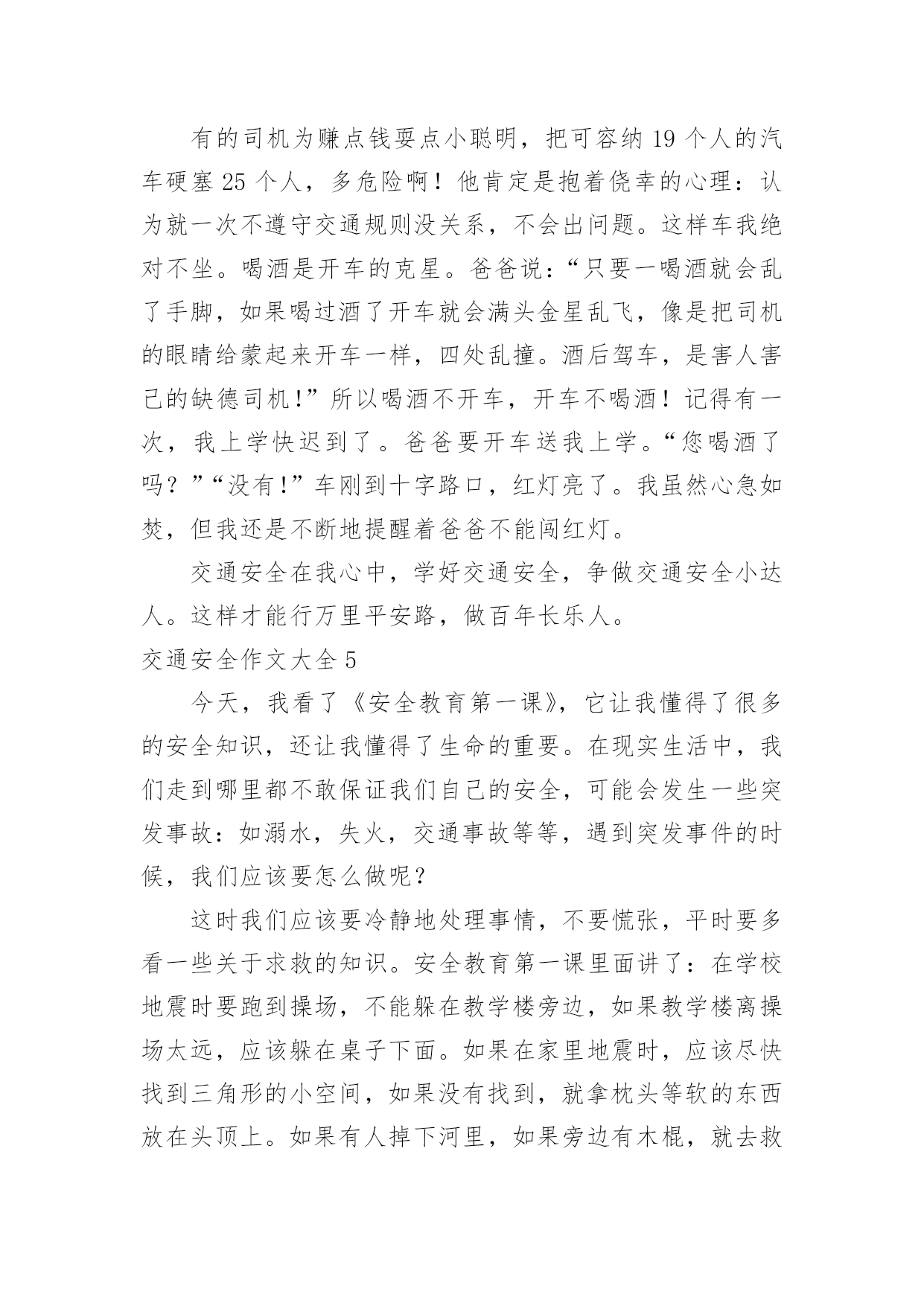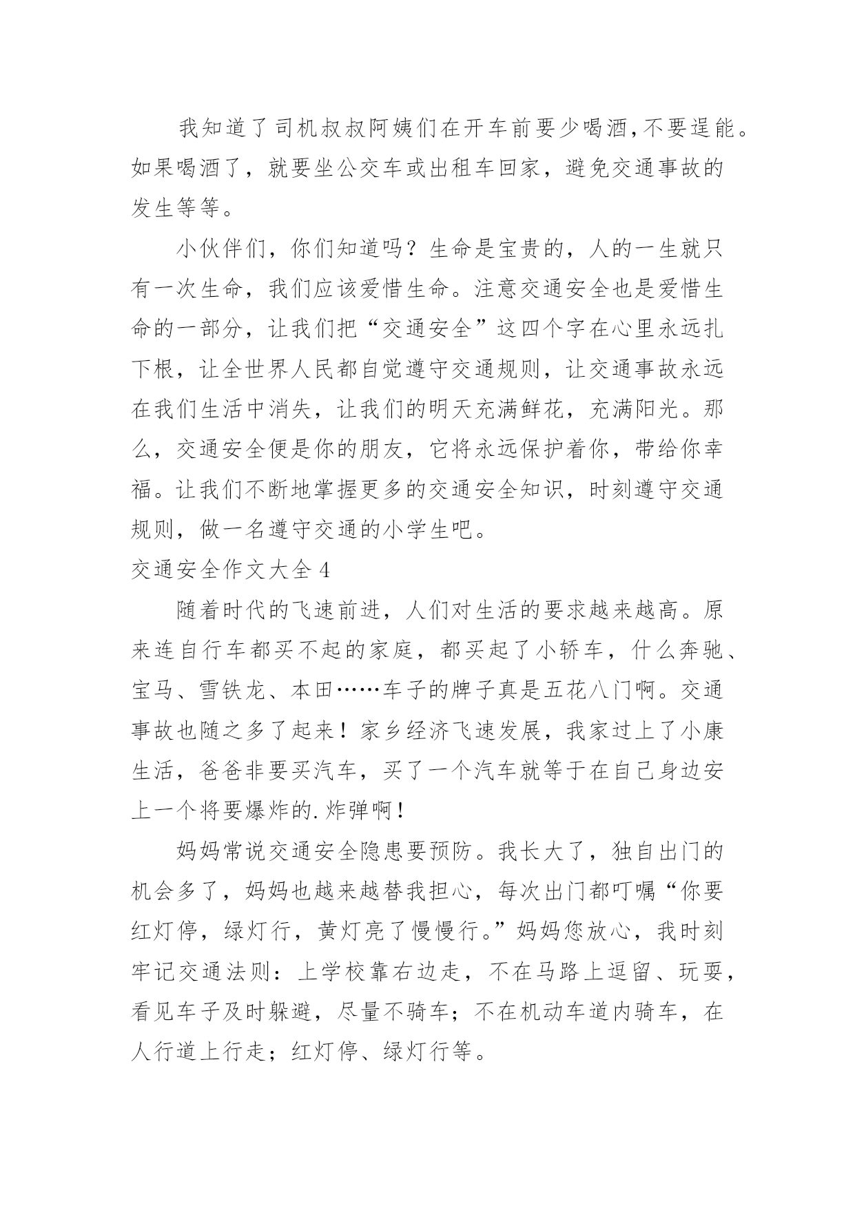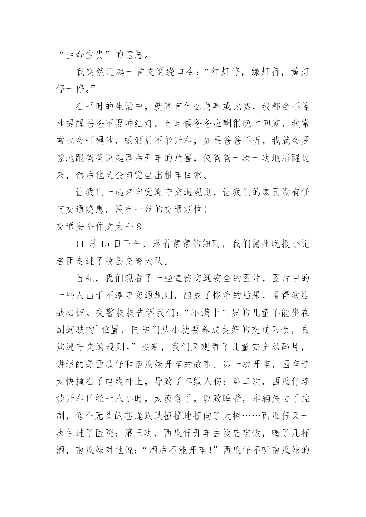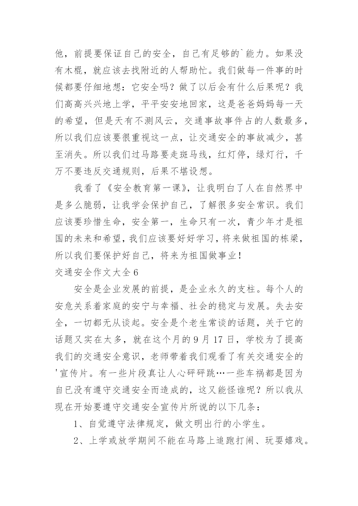 交通安全作文交通安全作文大全在日常的学习、工作、生活中,大家对作文都再熟悉不过了吧,借助作文人们可以反映客观事物、表达思想感情、传递知识信息。作文的注意事项有许多,你确定会写吗?下面是小编为大家收集的交通安全作文大全,欢迎大家分享。交通安全作文大全1说起交通,人人都会想到两个字:车祸。是呀,有许多人就是因为不遵守交通规则酿成车祸,轻者造成残疾,重者失去宝贵的生命。其实,车祸是可以避免的。前年,我们学校几个五年级学生在放学的马路上并排骑车。转弯时,有一个学生来个突然超车,同行的'伙伴还没反应过来,几辆车子已撞在了一起,他从车上重重地摔了下来。经医生检查左膀两处骨折,前后做了两次手术,共花了上万元的医药费,也落下了许多功课。假如他们遵守交通规则,不并排骑车,不超车,也就不会发生这一交通事故。有些人为了省钱,喜欢坐一些超载车、报废车,也酿成了惨祸。去年7月13日上午,在我们高邮境内淮江公路马棚段发生三车相撞特大交通事故,一共七人死亡八人受伤。这是由于一辆满载乘客的中巴车反向超车,与迎面开来的大客车相撞,大客车后面的一辆车躲闪不及,又与前面的车追尾相撞。据目击人说,当时的情景惨不忍睹:三辆车已严重变形,满地都是鲜血,哭喊声、呻吟声、求救声连成一片……这场车祸使几个家庭失去了亲人,给人们造成极大的伤害,真是车祸猛于虎呀!如果当时司机心中有交通规则,不开超载车,不强行超车,如果乘客心中有交通规则,不乘超载车,这场车祸也许就可以避免了。同学们,社会的进步离不开交通安全的发展,发展的交通企盼安全的环境,让我们自觉遵守交通规则,走文明路、骑文明车、做文明人。交通安全作文大全2安全,它时常在我们身边,可是没有人认真留意它,结果却酿成大祸。安全有时发生在校园里,有时发生在公路上,这次,我要谈谈交通安全。交通安全在所有安全事故中最为严重。在雾天和下雪天应该更加重视,因为浓雾会导致司机视线模糊,很可能出现两车相撞的事故,而下雪天路面有积雪,车轮很容易打滑,从而形成交通事故。一位中学生放学了不回家,一直在街上玩,到了很晚才回家,当他过马路时,一辆大货车向他驶来。由于刚下过雪,路面很滑,打车司机没有及时刹住车,——一场车祸夺走了这位先生的生命。一个年轻活泼的孩子就这样消失了!他的父母是多么的伤心呀!他们失去了最心爱的孩子,能不痛心吗?听到这件事,我好同情这位学生呀!该归家时不归,独自一人很晚才回家,这多不安全呀!所以我们每个学生都应该有安全意识。醉酒驾车就更为人们所担心。在聚会中,在应酬中,酒是必不可少的。在饭桌上,朋友坚决鼓动开车的'人喝,并说不喝不够朋友,本以为是一番好意,结果却害了他人。交通安全也有可能是拥堵而导致,或是在公路上超速驾驶。让我们以他人和自己的安全为己任,遵守交通规则,该慢行时慢行。礼让一步,前程似锦。赶急一时,后悔终生。平安出行,珍爱生命。让我们共同敲响安全的警钟吧!交通安全作文大全3我是四年级小学生,我在一本书上看到:“育人不仅要进行智力教育,还要进行道德、纪律教育。十年树木,百年树人,交通安全宣传教育工作从幼儿学生抓起,使学生从小就接受交通安全知识教育,达到自己教育自己,自己管理自己,养成自觉遵守交通法规的良好习惯,是能达到一代人和一个社会的良好秩序的百年大计。”从那时我知道了学习交通安全知识对我们来说非常重要。现在,我知道了过马路要看清信号灯,红灯停、绿灯行,要走人行横道,不得翻越交通护栏;未满12岁的`儿童不得在马路上骑自行车;不能在马路上三五成群地玩耍和嬉戏……我知道了在过没有红绿灯的路口时,需要看一看周围是否有车。如果没有车,我们可以立刻走过去;如果有车,我们要等车走过去后再走。我知道了司机叔叔阿姨们在开车前要少喝酒,不要逞能。如果喝酒了,就要坐公交车或出租车回家,避免交通事故的发生等等。小伙伴们,你们知道吗?生命是宝贵的,人的一生就只有一次生命,我们应该爱惜生命。注意交通安全也是爱惜生命的一部分,让我们把“交通安全”这四个字在心里永远扎下根,让全世界人民都自觉遵守交通规则,让交通事故永远在我们生活中消失,让我们的明天充满鲜花,充满阳光。那么,交通安全便是你的朋友,它将永远保护着你,带给你幸福。让我们不断地掌握更多的交通安全知识,时刻遵守交通规则,做一名遵守交通的小学生吧。交通安全作文大全4随着时代的飞速前进,人们对生活的要求越来越高。原来连自行车都买不起的家庭,都买起了小轿车,什么奔驰、宝马、雪铁龙、本田……车子的牌子真是五花八门啊。交通事故也随之多了起来!家乡经济飞速发展,我家过上了小康生活,爸爸非要买汽车,买了一个汽车就等于在自己身边安上一个将要爆炸的.炸弹啊!妈妈常说交通安全隐患要预防。我长大了,独自出门的机会多了,妈妈也越来越替我担心,每次出门都叮嘱“你要红灯停,绿灯行,黄灯亮了慢慢行。”妈妈您放心,我时刻牢