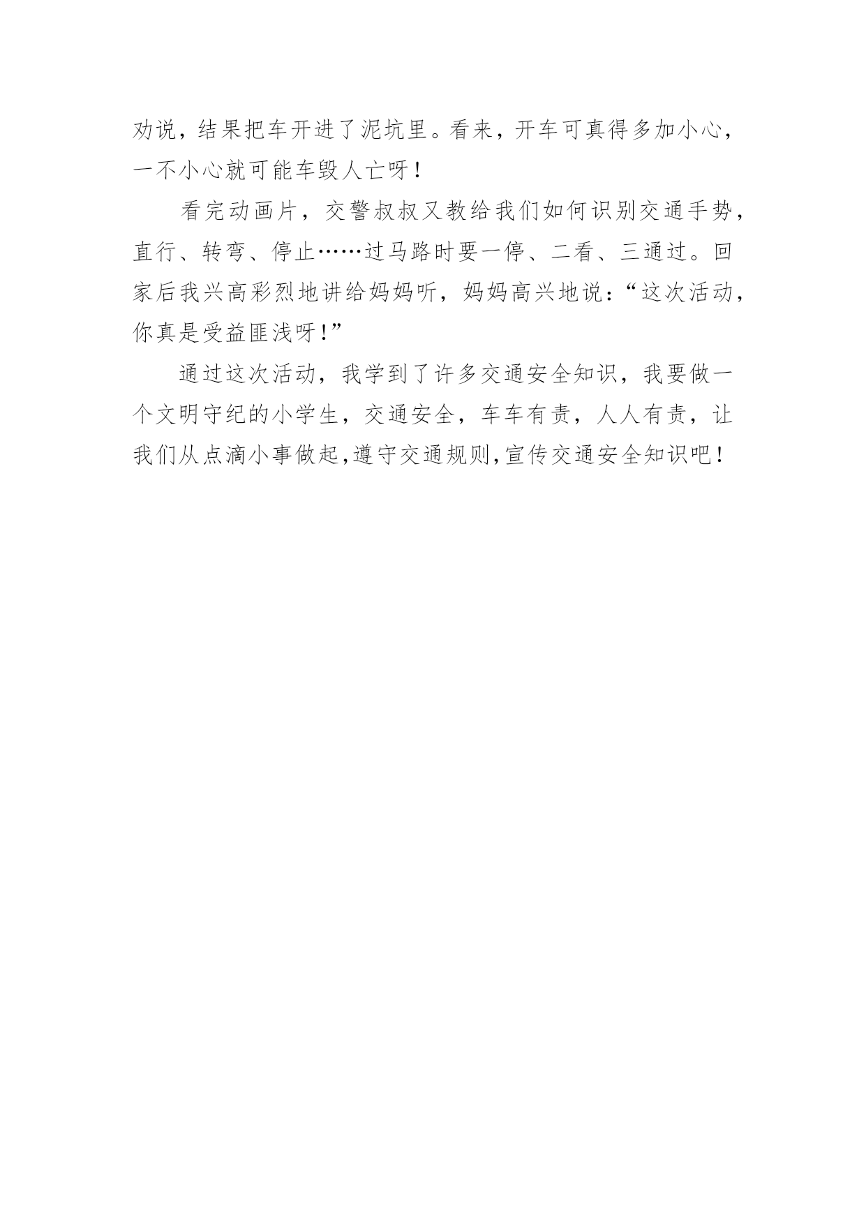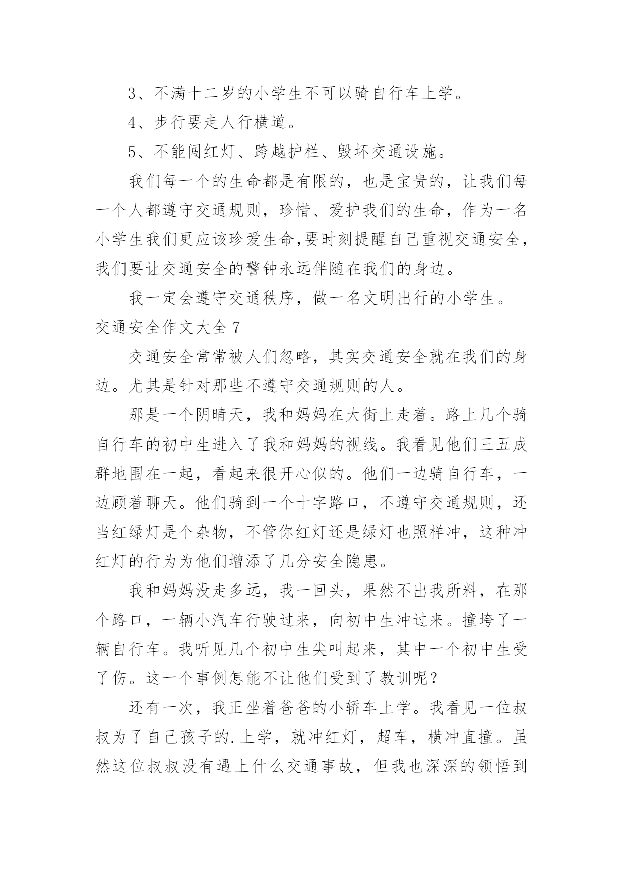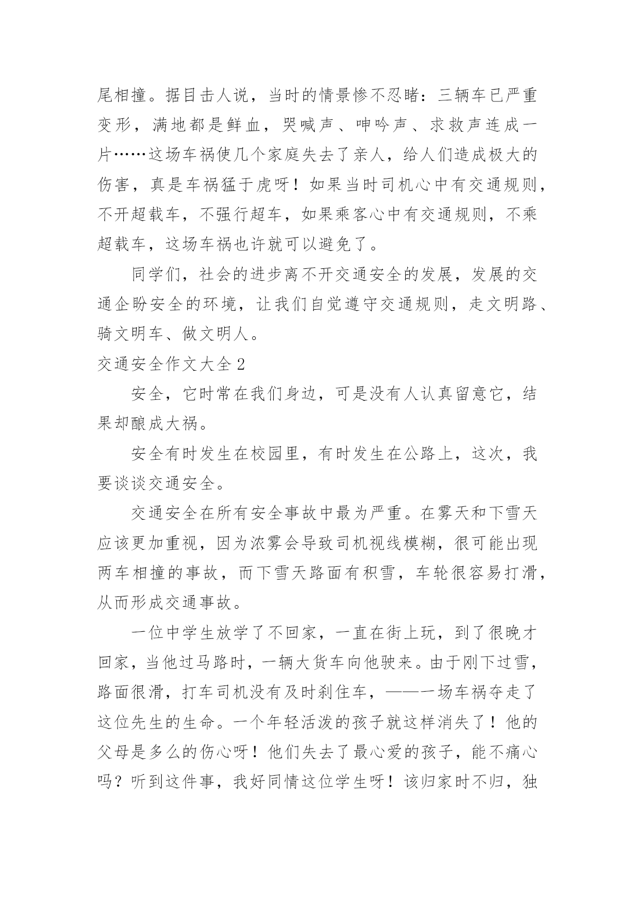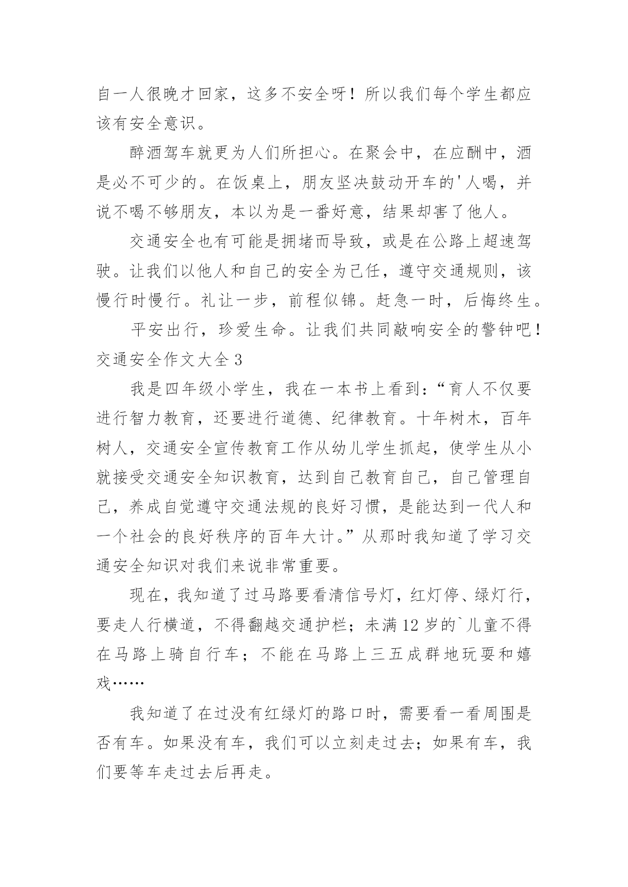 交通安全作文交通安全作文大全在日常的学习、工作、生活中,大家对作文都再熟悉不过了吧,借助作文人们可以反映客观事物、表达思想感情、传递知识信息。作文的注意事项有许多,你确定会写吗?下面是小编为大家收集的交通安全作文大全,欢迎大家分享。交通安全作文大全1说起交通,人人都会想到两个字:车祸。是呀,有许多人就是因为不遵守交通规则酿成车祸,轻者造成残疾,重者失去宝贵的生命。其实,车祸是可以避免的。前年,我们学校几个五年级学生在放学的马路上并排骑车。转弯时,有一个学生来个突然超车,同行的'伙伴还没反应过来,几辆车子已撞在了一起,他从车上重重地摔了下来。经医生检查左膀两处骨折,前后做了两次手术,共花了上万元的医药费,也落下了许多功课。假如他们遵守交通规则,不并排骑车,不超车,也就不会发生这一交通事故。有些人为了省钱,喜欢坐一些超载车、报废车,也酿成了惨祸。去年7月13日上午,在我们高邮境内淮江公路马棚段发生三车相撞特大交通事故,一共七人死亡八人受伤。这是由于一辆满载乘客的中巴车反向超车,与迎面开来的大客车相撞,大客车后面的一辆车躲闪不及,又与前面的车追尾相撞。据目击人说,当时的情景惨不忍睹:三辆车已严重变形,满地都是鲜血,哭喊声、呻吟声、求救声连成一片……这场车祸使几个家庭失去了亲人,给人们造成极大的伤害,真是车祸猛于虎呀!如果当时司机心中有交通规则,不开超载车,不强行超车,如果乘客心中有交通规则,不乘超载车,这场车祸也许就可以避免了。同学们,社会的进步离不开交通安全的发展,发展的交通企盼安全的环境,让我们自觉遵守交通规则,走文明路、骑文明车、做文明人。交通安全作文大全2安全,它时常在我们身边,可是没有人认真留意它,结果却酿成大祸。安全有时发生在校园里,有时发生在公路上,这次,我要谈谈交通安全。交通安全在所有安全事故中最为严重。在雾天和下雪天应该更加重视,因为浓雾会导致司机视线模糊,很可能出现两车相撞的事故,而下雪天路面有积雪,车轮很容易打滑,从而形成交通事故。一位中学生放学了不回家,一直在街上玩,到了很晚才回家,当他过马路时,一辆大货车向他驶来。由于刚下过雪,路面很滑,打车司机没有及时刹住车,——一场车祸夺走了这位先生的生命。一个年轻活泼的孩子就这样消失了!他的父母是多么的伤心呀!他们失去了最心爱的孩子,能不痛心吗?听到这件事,我好同情这位学生呀!该归家时不归,独自一人很晚才回家,这多不安全呀!所以我们每个学生都应该有安全意识。醉酒驾车就更为人们所担心。在聚会中,在应酬中,酒是必不可少的。在饭桌上,朋友坚决鼓动开车的'人喝,并说不喝不够朋友,本以为是一番好意,结果却害了他人。交通安全也有可能是拥堵而导致,或是在公路上超速驾驶。让我们以他人和自己的安全为己任,遵守交通规则,该慢行时慢行。礼让一步,前程似锦。赶急一时,后悔终生。平安出行,珍爱生命。让我们共同敲响安全的警钟吧!交通安全作文大全3我是四年级小学生,我在一本书上看到:“育人不仅要进行智力教育,还要进行道德、纪律教育。十年树木,百年树人,交通安全宣传教育工作从幼儿学生抓起,使学生从小就接受交通安全知识教育,达到自己教育自己,自己管理自己,养成自觉遵守交通法规的良好习惯,是能达到一代人和一个社会的良好秩序的百年大计。”从那时我知道了学习交通安全知识对我们来说非常重要。现在,我知道了过马路要看清信号灯,红灯停、绿灯行,要走人行横道,不得翻越交通护栏;未满12岁的`儿童不得在马路上骑自行车;不能在马路上三五成群地玩耍和嬉戏……我知道了在过没有红绿灯的路口时,需要看一看周围是否有车。如果没有车,我们可以立刻走过去;如果有车,我们要等车走过去后再走。我知道了司机叔叔阿姨们在开车前要少喝酒,不要逞能。如果喝酒了,就要坐公交车或出租车回家,避免交通事故的发生等等。小伙伴们,你们知道吗?生命是宝贵的,人的一生就只有一次生命,我们应该爱惜生命。注意交通安全也是爱惜生命的一部分,让我们把“交通安全”这四个字在心里永远扎下根,让全世界人民都自觉遵守交通规则,让交通事故永远在我们生活中消失,让我们的明天充满鲜花,充满阳光。那么,交通安全便是你的朋友,它将永远保护着你,带给你幸福。让我们不断地掌握更多的交通安全知识,时刻遵守交通规则,做一名遵守交通的小学生吧。交通安全作文大全4随着时代的飞速前进,人们对生活的要求越来越高。原来连自行车都买不起的家庭,都买起了小轿车,什么奔驰、宝马、雪铁龙、本田……车子的牌子真是五花八门啊。交通事故也随之多了起来!家乡经济飞速发展,我家过上了小康生活,爸爸非要买汽车,买了一个汽车就等于在自己身边安上一个将要爆炸的.炸弹啊!妈妈常说交通安全隐患要预防。我长大了,独自出门的机会多了,妈妈也越来越替我担心,每次出门都叮嘱“你要红灯停,绿灯行,黄灯亮了慢慢行。”妈妈您放心,我时刻牢