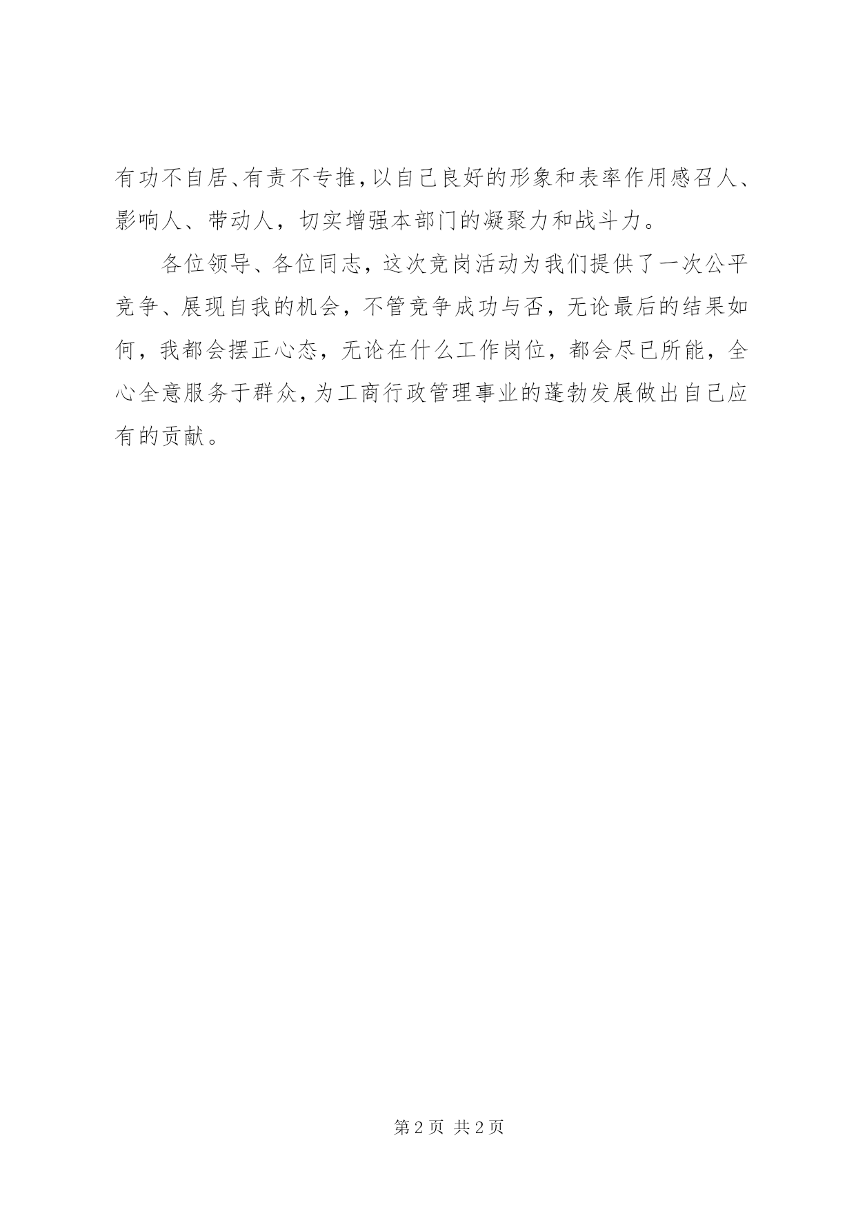 第PAGE\*Arabic\*MERGEFORMAT2页共NUMPAGES\*MERGEFORMAT2页工商干部竞争上岗演讲稿集整-理X,我倍加珍惜组织给我提供的这个工作舞台,倍加坚定服务业户、奉献业户的信心和决心。如果说我这几年来工作所付出的努力,为工商市场监管工作做了一点事情,这主要得益于市局党委及区委、区政府的坚强领导,得益于分管科室所队的艰苦努力。借此机会,我向所有关心、支持和帮助我的各位领导和同志们表示衷心地感谢。成绩属于过去,雄关漫道真如铁,而今迈步从头越。如果有幸能得到各位领导和同志们的信任和支持,我将恪守“做人要以德为帅,做事以实为重,做官以正为先”的人生准则,迅速找准自己的位置,尽快进入角色,认真履行职责。严格按照市局党委的统一部署,紧紧围绕建设“两个平安”的总体要求,以更加饱满的热情投入到市场监管服务与发展工作中去。1、树立学习第一的理念,努力提高依法行政的能力和水平,做到科学执政、依法执政、民主执政。全面提高自己的综合素质,努力做到政治上成熟、思想上坚定、业务上过硬、纪律上严明、作风上优良、为人上正派、工作上创新、政绩上突出。2、围绕发展是第一要务,牢固树立科学发展观,求真务实,克难奋进,努力改进工作作风和工作方法,不断提高履行职责的能力和水平,干好每一项工作,多做贡献。3、廉洁从政,树立形象,做到有权不滥用、有名不独争、有功不自居、有责不专推,以自己良好的形象和表率作用感召人、影响人、带动人,切实增强本部门的凝聚力和战斗力。各位领导、各位同志,这次竞岗活动为我们提供了一次公平竞争、展现自我的机会,不管竞争成功与否,无论最后的结果如何,我都会摆正心态,无论在什么工作岗位,都会尽已所能,全心全意服务于群众,为工商行政管理事业的蓬勃发展做出自己应有的贡献。