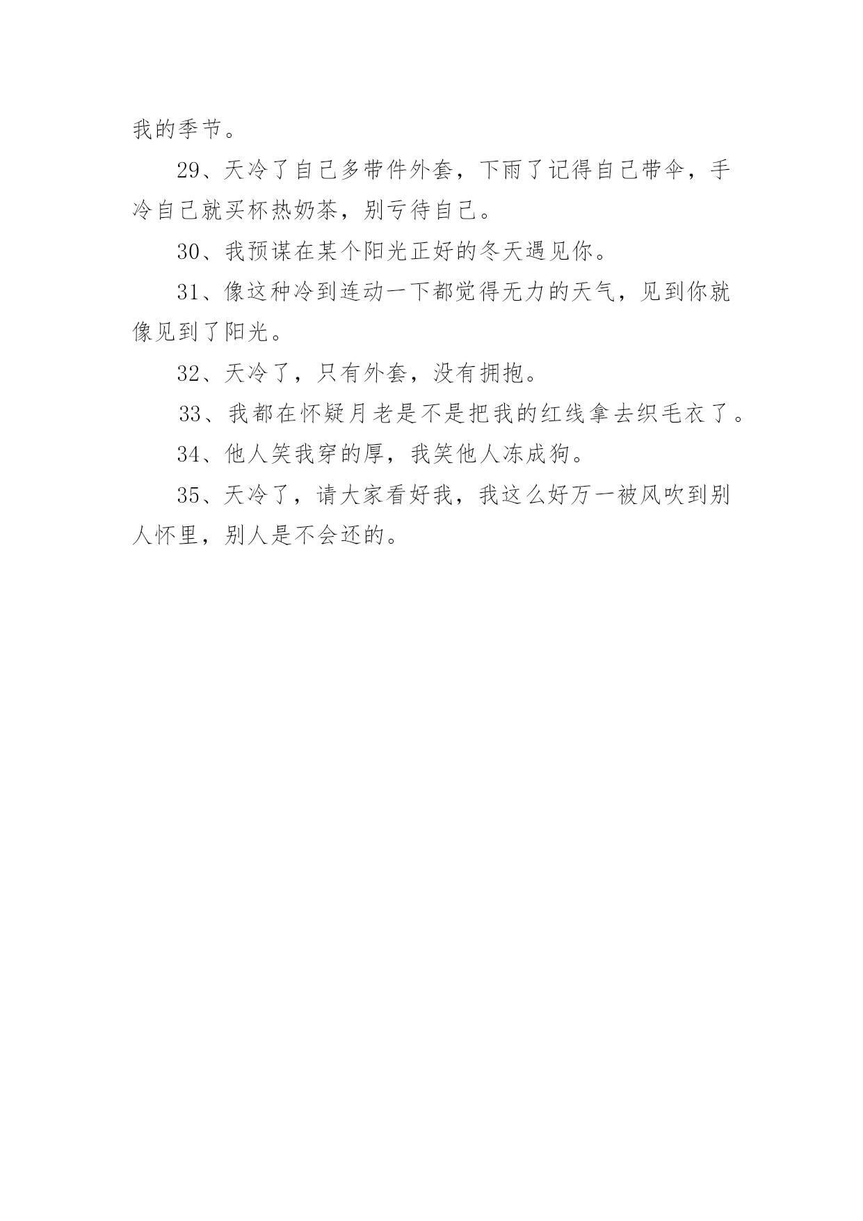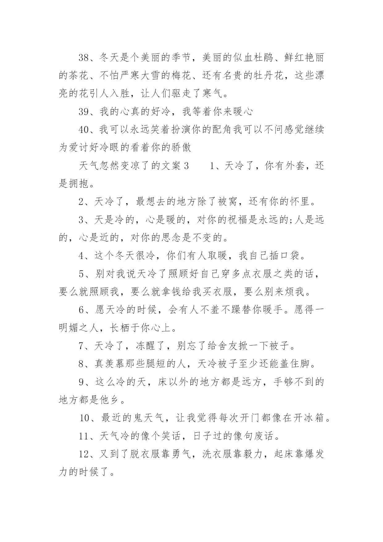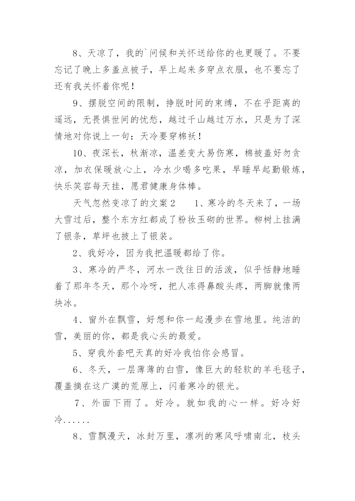 天气忽然变凉了的文案天气忽然变凉了的文案在日常的学习、工作、生活中,大家都接触过很多优秀的文案吧,文案用以分享自己生活中值得纪念的小确幸。你知道什么样的文案才是特别的吗?以下是小编收集整理的天气忽然变凉了的文案(精选85句),希望能够帮助到大家。天气忽然变凉了的文案11、天气渐凉,寒气渐重,温度渐低,雨雪渐多,寒流繁多,短信速传,问候关怀,多添衣物,被褥,预防感冒,不可疏乎。2、又是一年落叶黄,一层秋雨一层凉,整日奔波挺辛苦,天凉别忘添衣裳,爱惜身体加餐饭,珍视有友情长想想,短信情长言未尽,唯愿朋友多安康!3、天气转凉,送你一条神奇的短信,它具有“防寒保暖”之功效,凡是收到之人,寒风吹不到,感冒够不着,如果转发效果更加,快快行动吧。4、不管我们的距离有多遥远,关怀你的心是永远不变的。5、天气降温了,愿寒风为你扫去忧愁苦闷;寒冷为你冻住感冒疾病;愿朋友的友情和提醒,为你加温保暖,护好健康快乐顺利随行;祝你美好不停,温暖永存!6、有一种思念叫望穿秋水,有一种寒冷叫忘穿秋裤。7、有一种冷不是你觉得冷,而是觉得你冷。8、天凉了,我的`问候和关怀送给你的也更暖了。不要忘记了晚上多盖点被子,早上起来多穿点衣服,也不要忘了还有我关怀着你呢!9、摆脱空间的限制,挣脱时间的束缚,不在乎距离的遥远,无畏惧世间的忧愁,越过千山越过万水,只是为了深情地对你说上一句:天冷要穿棉袄!10、夜深长,秋渐凉,温差变大易伤寒,棉被盖好勿贪凉,加衣保暖放心上,冷水少喝多吃果,早睡早起勤锻炼,快乐笑容每天挂,愿君健康身体棒。天气忽然变凉了的文案21、寒冷的冬天来了,一场大雪过后,整个东方红都成了粉妆玉砌的世界。柳树上挂满了银条,草坪也披上了银装。2、我好冷,因为我把温暖都给了你。3、寒冷的严冬,河水一改往日的活泼,似乎恬静地睡着了那年冬天,那个冷呀,把人冻得鼻酸头疼,两脚就像两块冰。4、窗外在飘雪,好想和你一起漫步在雪地里。纯洁的雪,美丽的你,都是我心头的最爱。5、穿我外套吧天真的好冷我怕你会感冒。6、冬天,一层薄薄的白雪,像巨大的轻软的羊毛毯子,覆盖摘在这广漠的荒原上,闪着寒冷的银光。7、外面下雨了。好冷。就如我的心一样。好冷好冷......8、雪飘漫天,冰封万里,凛冽的寒风呼啸南北,枝头一只乌鸦蜷缩着脑袋,瑟瑟发抖。9、刺骨的寒风呼呼地吹着,不时地向我袭来。并且,偶尔会有顽皮的小雪花纷纷扬扬地落下来,就像跳舞一样。10、武汉下雪了虽然不大但是好冷希望有情人的都好好的我呢就一个人看雪吧。11、这个冬季,是寒冷的,雪,一向飘,看着,让人不寒而栗。人们都不愿出门,不愿被那寒冷的气息包围,就连小星星,也不愿待在天上了,让这深夜显得更苍茫寂寞了。12、夜,好黑;心,好冷;人,好孤独!曾经的记忆如洪水般泛滥,冲刷着孤寂的自己!13、好冷淡,感觉什么都不在乎了,14、在雪后的早上,我带着爬犁来到北山公园,我看到那洁白的雪花,真的不忍心去踩它,我走在北山的石路时,我听到了咯吱咯吱的响声。15、只见天地之间白茫茫的一片,雪花纷纷扬扬的从天上飘落下来,四周像拉起白色的帐篷,大地立刻变得银装素裹。16、冷冷的天开心的你,特别的日子要注意身体;凛凛的风不平凡的你,不要让无情的寒风吹着你;柔和的阳光柔情的你,在这寒冷的天气里要照顾好自己!17、大雪随着寒冬来了,街道宛如是银子铸成的,那么亮,那么有残暴,长长的冰柱像水晶的短剑挂在檐前,行人的呼吸也化作了一股股白烟。18、下雪了,如果你们那里也下雪了给花花,让我看看有多少人那里下雪了,好冷啊。19、秋天尚未离去,那寒冷动冬天却迫不及待地来了。它还带来了寒冷的雨丝,把人们都冷冻在寒冷之中,感觉不道德一丝的温暖,使人们的心都麻醉了。20、冬天的早晨,是寒冷的。寒风呼呼的吹着,吹到脸上如同刀割一样疼,出行的人们都戴上厚厚的帽子,穿上了暖和的棉衣。21、肆虐的雪花纷纷扬扬地飘落下来,凛冽的寒风一阵一阵地吹过。路上都是缩着脖子,拉紧了衣服的领口急匆匆地的行人,空气中到处膨胀着寒冷和干燥。这样的天气几乎统治了这个冬天。22、总觉得,孤男寡女的时候,女生说好冷是一种耍流氓的行为。23、冬天,非常寒冷。说实话,我不希望它来临,可是它来临时,我却有异样的`感觉。24、外面到处是冰条儿,地上也结冰,连车子也戴上防滑链。山上的松树堆满蓬松松的雪球,路上的小树也挂满毛茸茸、亮晶晶的银条儿。道真成名副其实的粉妆玉砌的世界。25、眼前的雪花像蝴蝶一样调皮,一会儿落在屋檐下,一会落在树枝上,还不时飘在行人的脸上。26、外面下雨了,雨下的好大,好冷27、冬天的早晨,每天很早起床,月色还在朦胧,整座城市还在酝酿之中,我便起来晨练。时而,一场雾漫于空中,跑在马路上,就像置身于仙境中。28、当黎明的曙色尚未到来的时刻,我感到透骨奇寒,便匆匆跑回宿舍,取件衣服披上。29、早