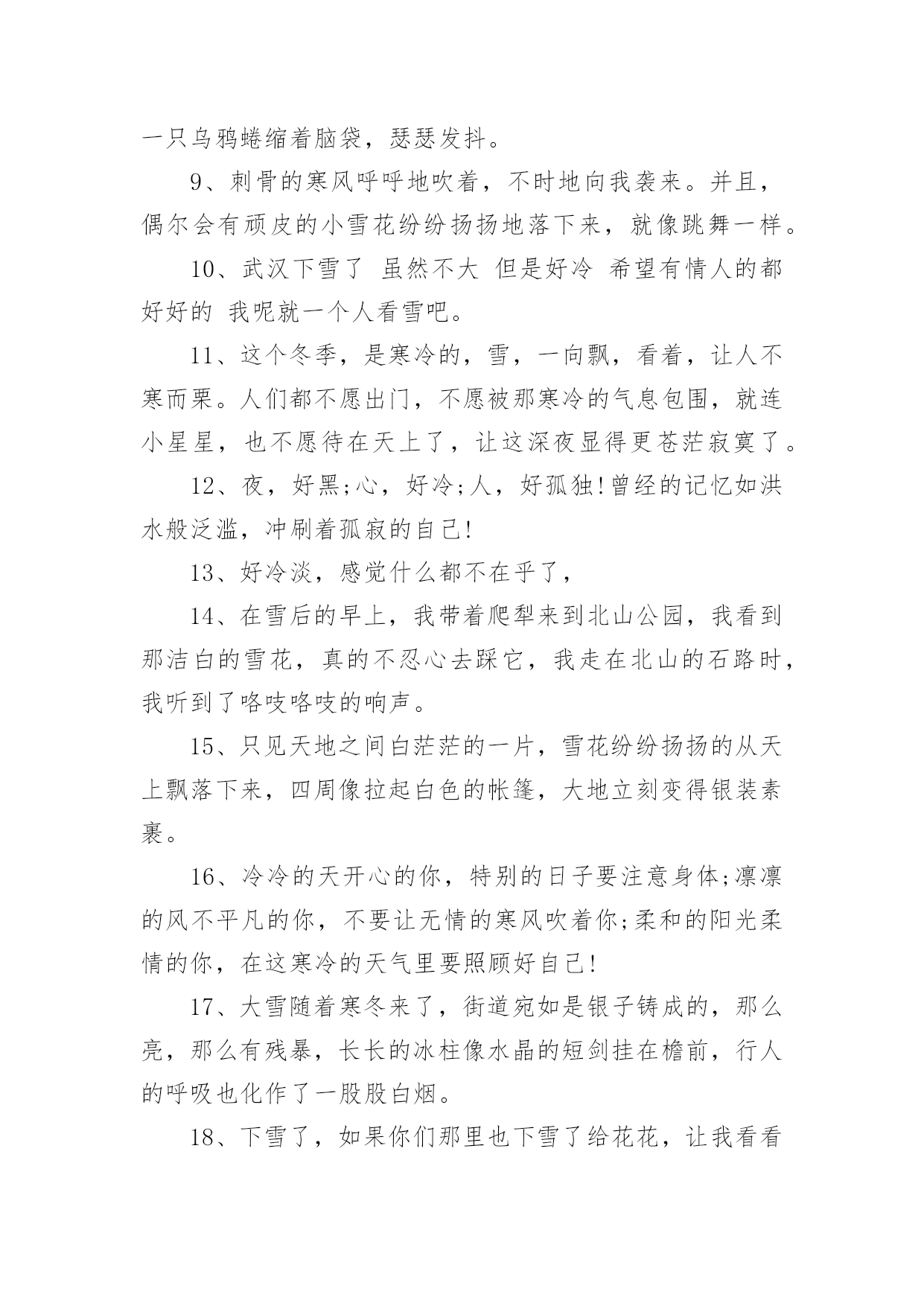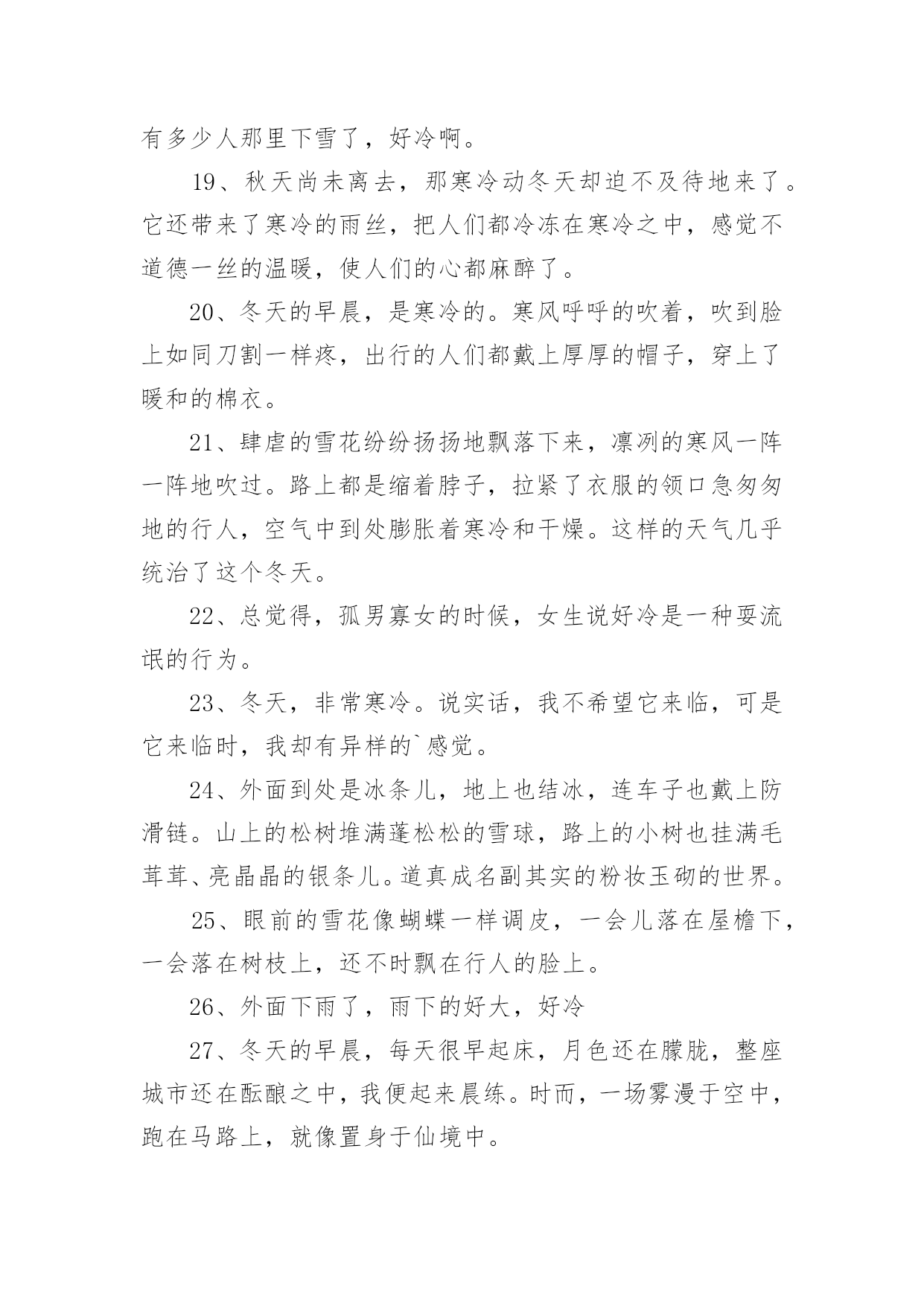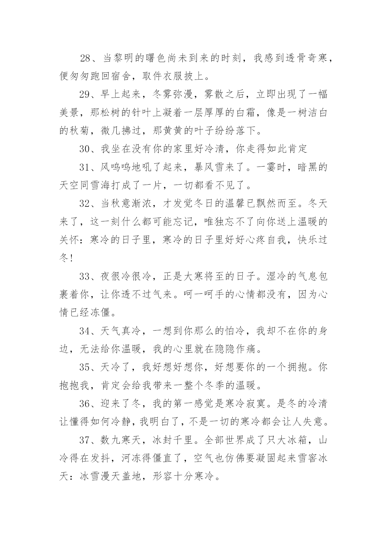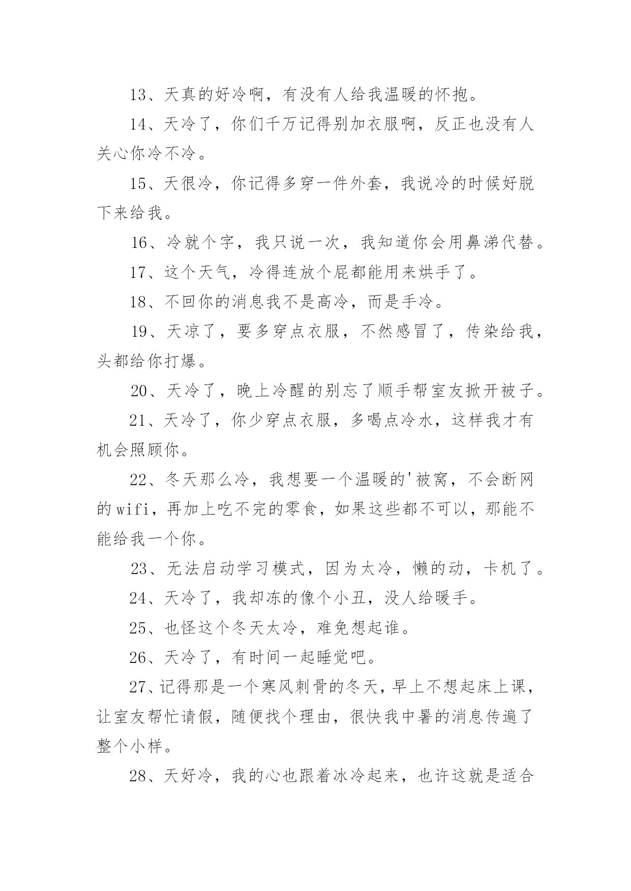 天气忽然变凉了的文案天气忽然变凉了的文案在日常的学习、工作、生活中,大家都接触过很多优秀的文案吧,文案用以分享自己生活中值得纪念的小确幸。你知道什么样的文案才是特别的吗?以下是小编收集整理的天气忽然变凉了的文案(精选85句),希望能够帮助到大家。天气忽然变凉了的文案11、天气渐凉,寒气渐重,温度渐低,雨雪渐多,寒流繁多,短信速传,问候关怀,多添衣物,被褥,预防感冒,不可疏乎。2、又是一年落叶黄,一层秋雨一层凉,整日奔波挺辛苦,天凉别忘添衣裳,爱惜身体加餐饭,珍视有友情长想想,短信情长言未尽,唯愿朋友多安康!3、天气转凉,送你一条神奇的短信,它具有“防寒保暖”之功效,凡是收到之人,寒风吹不到,感冒够不着,如果转发效果更加,快快行动吧。4、不管我们的距离有多遥远,关怀你的心是永远不变的。5、天气降温了,愿寒风为你扫去忧愁苦闷;寒冷为你冻住感冒疾病;愿朋友的友情和提醒,为你加温保暖,护好健康快乐顺利随行;祝你美好不停,温暖永存!6、有一种思念叫望穿秋水,有一种寒冷叫忘穿秋裤。7、有一种冷不是你觉得冷,而是觉得你冷。8、天凉了,我的`问候和关怀送给你的也更暖了。不要忘记了晚上多盖点被子,早上起来多穿点衣服,也不要忘了还有我关怀着你呢!9、摆脱空间的限制,挣脱时间的束缚,不在乎距离的遥远,无畏惧世间的忧愁,越过千山越过万水,只是为了深情地对你说上一句:天冷要穿棉袄!10、夜深长,秋渐凉,温差变大易伤寒,棉被盖好勿贪凉,加衣保暖放心上,冷水少喝多吃果,早睡早起勤锻炼,快乐笑容每天挂,愿君健康身体棒。天气忽然变凉了的文案21、寒冷的冬天来了,一场大雪过后,整个东方红都成了粉妆玉砌的世界。柳树上挂满了银条,草坪也披上了银装。2、我好冷,因为我把温暖都给了你。3、寒冷的严冬,河水一改往日的活泼,似乎恬静地睡着了那年冬天,那个冷呀,把人冻得鼻酸头疼,两脚就像两块冰。4、窗外在飘雪,好想和你一起漫步在雪地里。纯洁的雪,美丽的你,都是我心头的最爱。5、穿我外套吧天真的好冷我怕你会感冒。6、冬天,一层薄薄的白雪,像巨大的轻软的羊毛毯子,覆盖摘在这广漠的荒原上,闪着寒冷的银光。7、外面下雨了。好冷。就如我的心一样。好冷好冷......8、雪飘漫天,冰封万里,凛冽的寒风呼啸南北,枝头一只乌鸦蜷缩着脑袋,瑟瑟发抖。9、刺骨的寒风呼呼地吹着,不时地向我袭来。并且,偶尔会有顽皮的小雪花纷纷扬扬地落下来,就像跳舞一样。10、武汉下雪了虽然不大但是好冷希望有情人的都好好的我呢就一个人看雪吧。11、这个冬季,是寒冷的,雪,一向飘,看着,让人不寒而栗。人们都不愿出门,不愿被那寒冷的气息包围,就连小星星,也不愿待在天上了,让这深夜显得更苍茫寂寞了。12、夜,好黑;心,好冷;人,好孤独!曾经的记忆如洪水般泛滥,冲刷着孤寂的自己!13、好冷淡,感觉什么都不在乎了,14、在雪后的早上,我带着爬犁来到北山公园,我看到那洁白的雪花,真的不忍心去踩它,我走在北山的石路时,我听到了咯吱咯吱的响声。15、只见天地之间白茫茫的一片,雪花纷纷扬扬的从天上飘落下来,四周像拉起白色的帐篷,大地立刻变得银装素裹。16、冷冷的天开心的你,特别的日子要注意身体;凛凛的风不平凡的你,不要让无情的寒风吹着你;柔和的阳光柔情的你,在这寒冷的天气里要照顾好自己!17、大雪随着寒冬来了,街道宛如是银子铸成的,那么亮,那么有残暴,长长的冰柱像水晶的短剑挂在檐前,行人的呼吸也化作了一股股白烟。18、下雪了,如果你们那里也下雪了给花花,让我看看有多少人那里下雪了,好冷啊。19、秋天尚未离去,那寒冷动冬天却迫不及待地来了。它还带来了寒冷的雨丝,把人们都冷冻在寒冷之中,感觉不道德一丝的温暖,使人们的心都麻醉了。20、冬天的早晨,是寒冷的。寒风呼呼的吹着,吹到脸上如同刀割一样疼,出行的人们都戴上厚厚的帽子,穿上了暖和的棉衣。21、肆虐的雪花纷纷扬扬地飘落下来,凛冽的寒风一阵一阵地吹过。路上都是缩着脖子,拉紧了衣服的领口急匆匆地的行人,空气中到处膨胀着寒冷和干燥。这样的天气几乎统治了这个冬天。22、总觉得,孤男寡女的时候,女生说好冷是一种耍流氓的行为。23、冬天,非常寒冷。说实话,我不希望它来临,可是它来临时,我却有异样的`感觉。24、外面到处是冰条儿,地上也结冰,连车子也戴上防滑链。山上的松树堆满蓬松松的雪球,路上的小树也挂满毛茸茸、亮晶晶的银条儿。道真成名副其实的粉妆玉砌的世界。25、眼前的雪花像蝴蝶一样调皮,一会儿落在屋檐下,一会落在树枝上,还不时飘在行人的脸上。26、外面下雨了,雨下的好大,好冷27、冬天的早晨,每天很早起床,月色还在朦胧,整座城市还在酝酿之中,我便起来晨练。时而,一场雾漫于空中,跑在马路上,就像置身于仙境中。28、当黎明的曙色尚未到来的时刻,我感到透骨奇寒,便匆匆跑回宿舍,取件衣服披上。29、早
