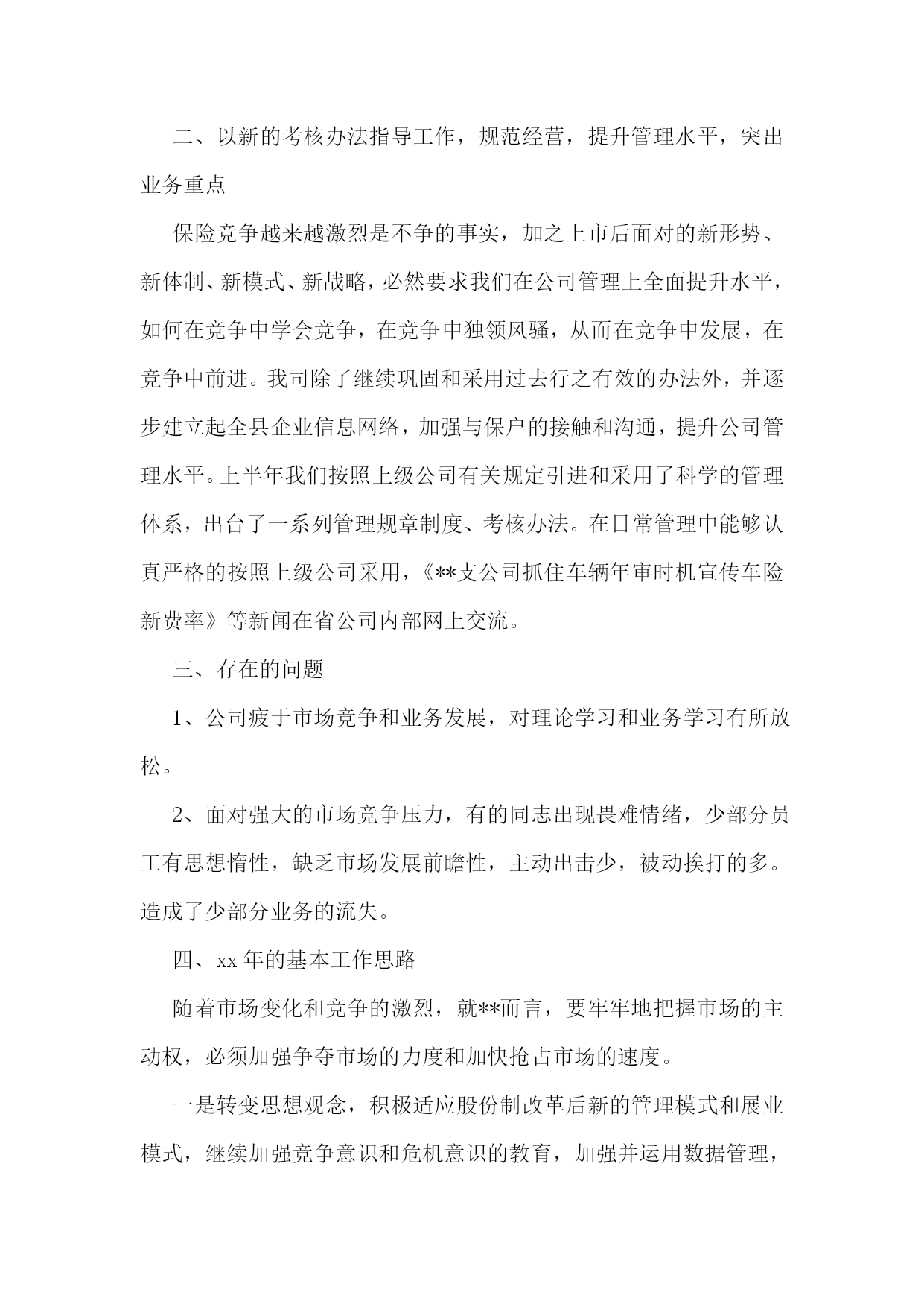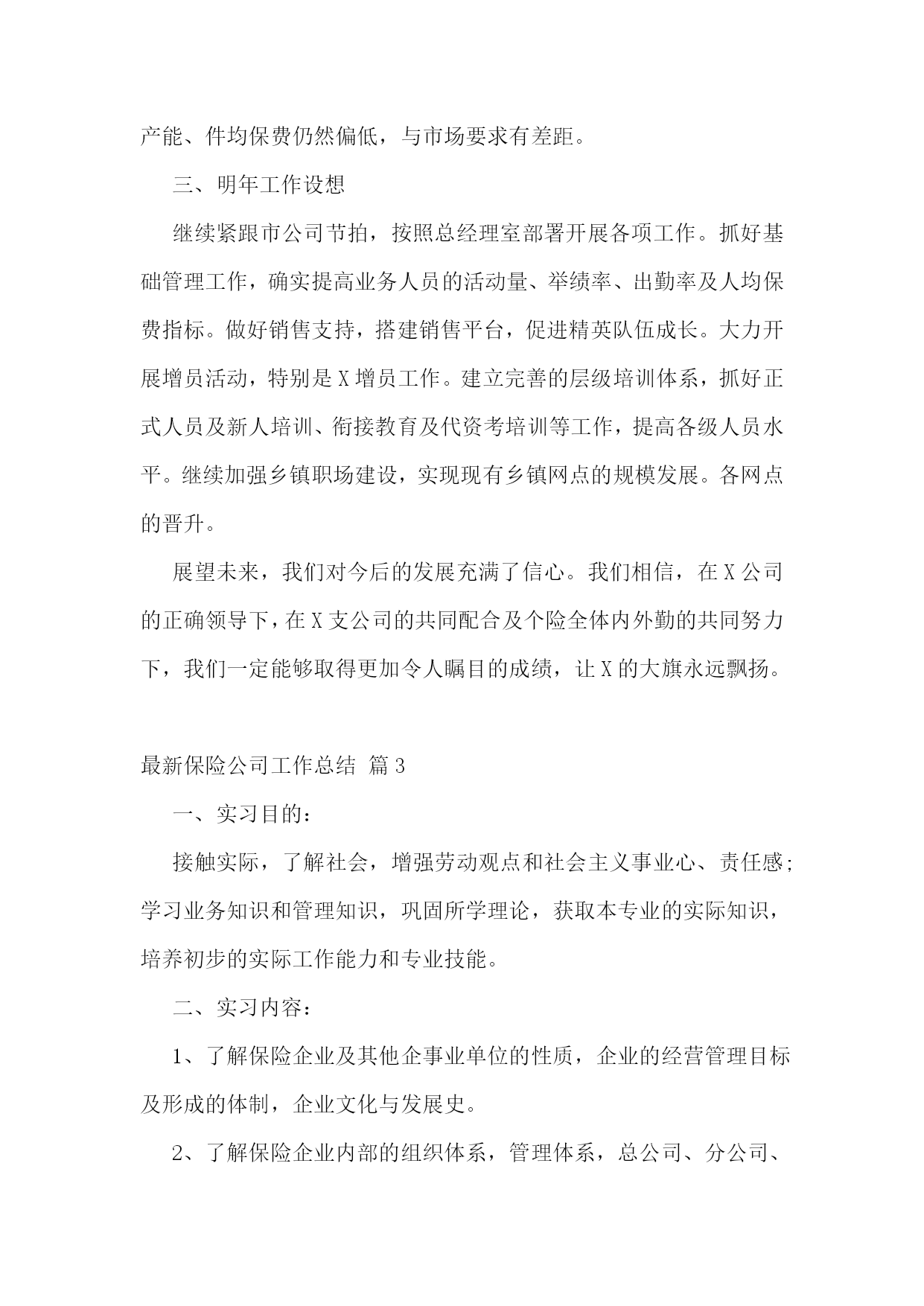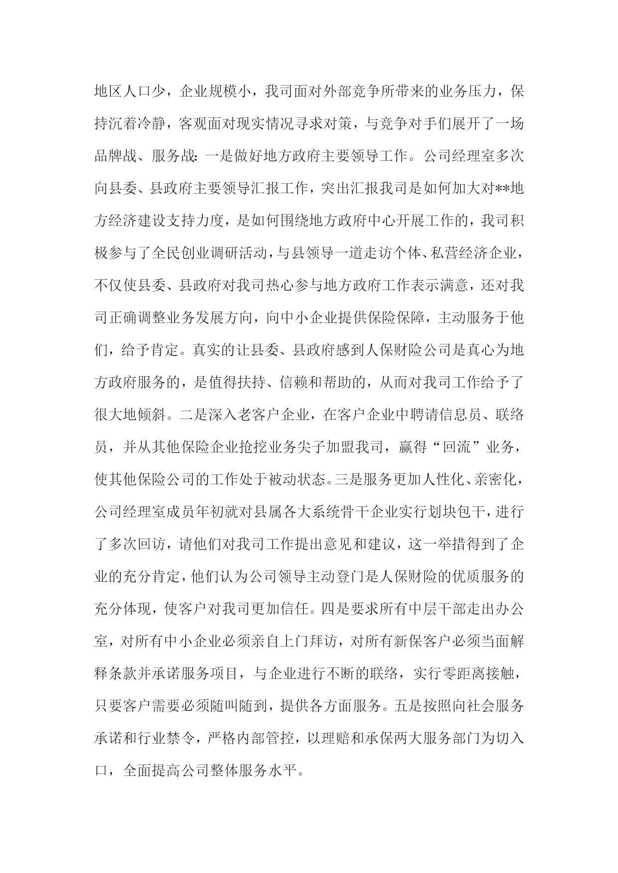 最新保险公司工作总结最新保险公司工作总结篇1xx年是人保财险股份制改革上市后的第一个年度。这一年,是我司面临压力攻艰克难的一年,是面对新变化、落实新机制、执行新规定的第一年。我司在市分公司党委、总经理室的正确领导下,在全体员工的奋力拼搏下,取得了一定的经营业绩。xx年,我司实收毛保费****万元,同比增长*%,已赚净保费***万元,净利润***万元,赔付率为**%。较好地完成了上级公司下达的任务指标。一、围绕目标,落实计划,紧抓业务工作1、计划落实早、措施实xx年初,我司经理室就针对**地区保险市场变化及xx年全年保费收入情况进行综合分析,将上级公司下达我司的各项指标进行层层分解,把计划分解成月计划,月月盘点、月月落实,有效的保证了对计划落实情况及时的进行监控和调整。在制定全年任务时充分考虑险种结构优化和业务承保质量,进一步明确了考核办法,把综合赔付率作为年终测评的重要数据。2、抢占车险市场,加大新工程、新项目的拓展力度,坚决的丢弃“垃圾保费”今年来,我们把稳固车险和企业财产保险,拓展新车市场和新工程新项目作为业务工作的重中之重,在抓业务数量的基础上,坚决的丢弃屡保屡亏的“垃圾”业务一是确保续保业务及时回笼,我们要求各业务部门按月上报续保业务台帐,由经理室督促考核,并要求提前介入公关。一旦出现脱报,马上在全司公布,其他人员可以参与竞争,从而巩固了原有业务,大大减少了业务的流失,保证了主要险种的市场份额占有率。二是与地方政府有关部门建立联系网络,提前获悉新上项目、新上工程名录,并和交警部门、汽车销售商建立友好合作关系,请他们帮助我们收集、提供新车信息,对潜在的新业务、新市场做到心中有数,充分把握市场主动,填补了因竞争等客观原因带来的业务不稳定因素。三是已失业务不放弃。我们不仅对xx年业务台账做到笔笔清晰,并要求业务内勤把xx年展业过程中流失的业务列出明细,并分解到相关部门,要求加大公关力度,找出脱保原因,确属停产企业、转卖报废车辆的,由经办人提供确切证明;属竞争流失的,我们决不消极退出,而是主动进攻,上门听取意见和建议,改善服务手段,逐个突破,全面争取回流。四是大小齐抓,能保则保。因为企业改制、转产、资金等因素对企业财产保险形成了较大的冲击,加之竞争等因素,使的展业难度和展业成本大大增加。针对这些情况,我们充分动员,统一思想,上下形成合力,迎难而上。做到责任到人,对保费在xxxx元以上的实行分管经理介入,共同公关。3、在竞争中求生存,在竞争中促发展。**地区现有1xxxx(中国财保、中国人寿、太平洋产险、太平洋寿险、中华产险、平安产险、平安寿险、天安产险、华邦代理、汇丰代理)经营财产保险业务和短期健康险业务的.保险公司、营销部、代理公司,另已发现xxxx公司(大地产险)在我县争夺业务,而**地区人口少,企业规模小,我司面对外部竞争所带来的业务压力,保持沉着冷静,客观面对现实情况寻求对策,与竞争对手们展开了一场品牌战、服务战:一是做好地方政府主要领导工作。公司经理室多次向县委、县政府主要领导汇报工作,突出汇报我司是如何加大对**地方经济建设支持力度,是如何围绕地方政府中心开展工作的,我司积极参与了全民创业调研活动,与县领导一道走访个体、私营经济企业,不仅使县委、县政府对我司热心参与地方政府工作表示满意,还对我司正确调整业务发展方向,向中小企业提供保险保障,主动服务于他们,给予肯定。真实的让县委、县政府感到人保财险公司是真心为地方政府服务的,是值得扶持、信赖和帮助的,从而对我司工作给予了很大地倾斜。二是深入老客户企业,在客户企业中聘请信息员、联络员,并从其他保险企业抢挖业务尖子加盟我司,赢得“回流”业务,使其他保险公司的工作处于被动状态。三是服务更加人性化、亲密化,公司经理室成员年初就对县属各大系统骨干企业实行划块包干,进行了多次回访,请他们对我司工作提出意见和建议,这一举措得到了企业的充分肯定,他们认为公司领导主动登门是人保财险的优质服务的充分体现,使客户对我司更加信任。四是要求所有中层干部走出办公室,对所有中小企业必须亲自上门拜访,对所有新保客户必须当面解释条款并承诺服务项目,与企业进行不断的联络,实行零距离接触,只要客户需要必须随叫随到,提供各方面服务。五是按照向社会服务承诺和行业禁令,严格内部管控,以理赔和承保两大服务部门为切入口,全面提高公司整体服务水平。二、以新的考核办法指导工作,规范经营,提升管理水平,突出业务重点保险竞争越来越激烈是不争的事实,加之上市后面对的新形势、新体制、新模式、新战略,必然要求我们在公司管理上全面提升水平,如何在竞争中学会竞争,在竞争中独领风骚,从而在竞争中发展,在竞争中前进。我司除了继续巩固和采用过去行之有效的办法外,并逐步建立起全县企业信息网络,加强与保户的接触和沟