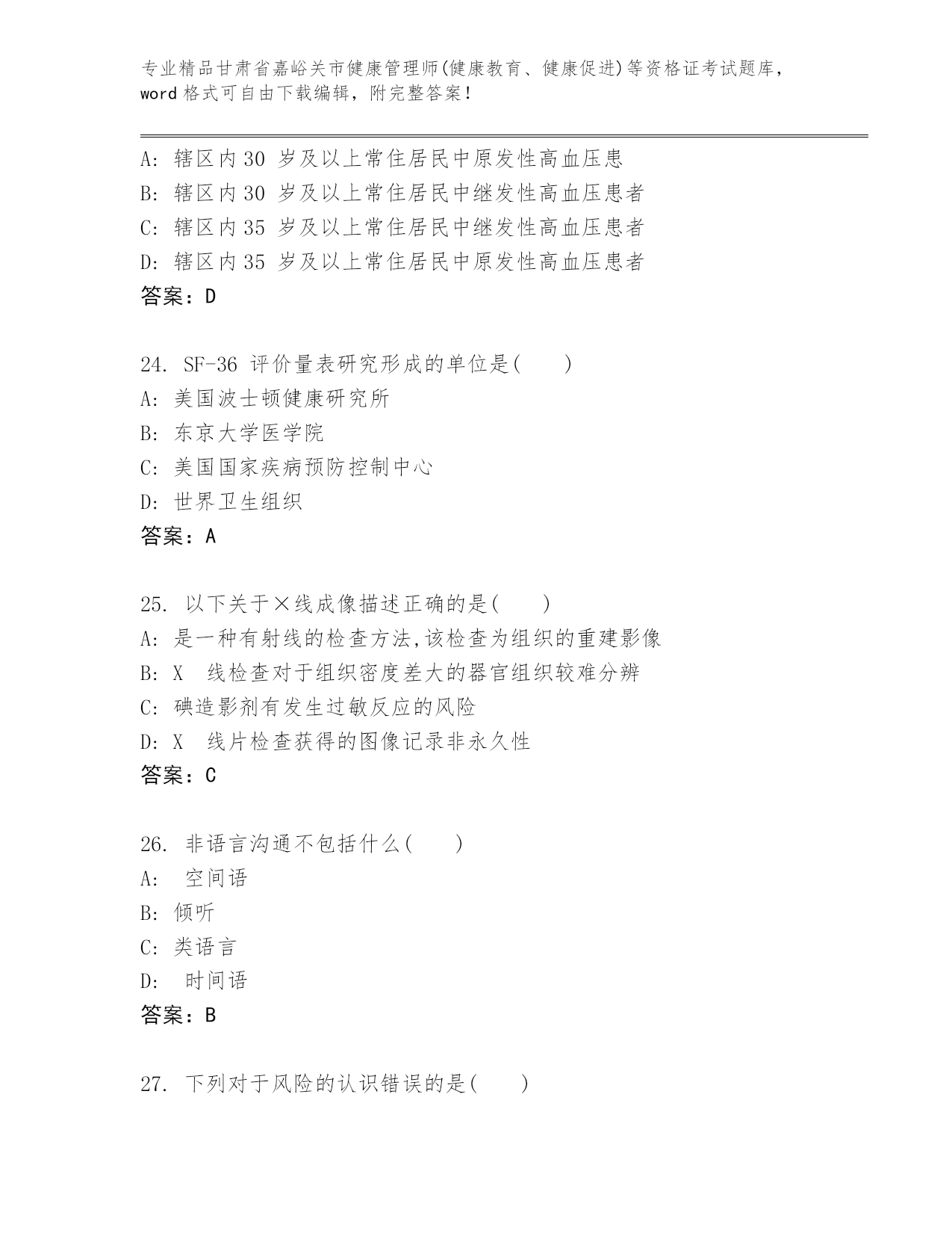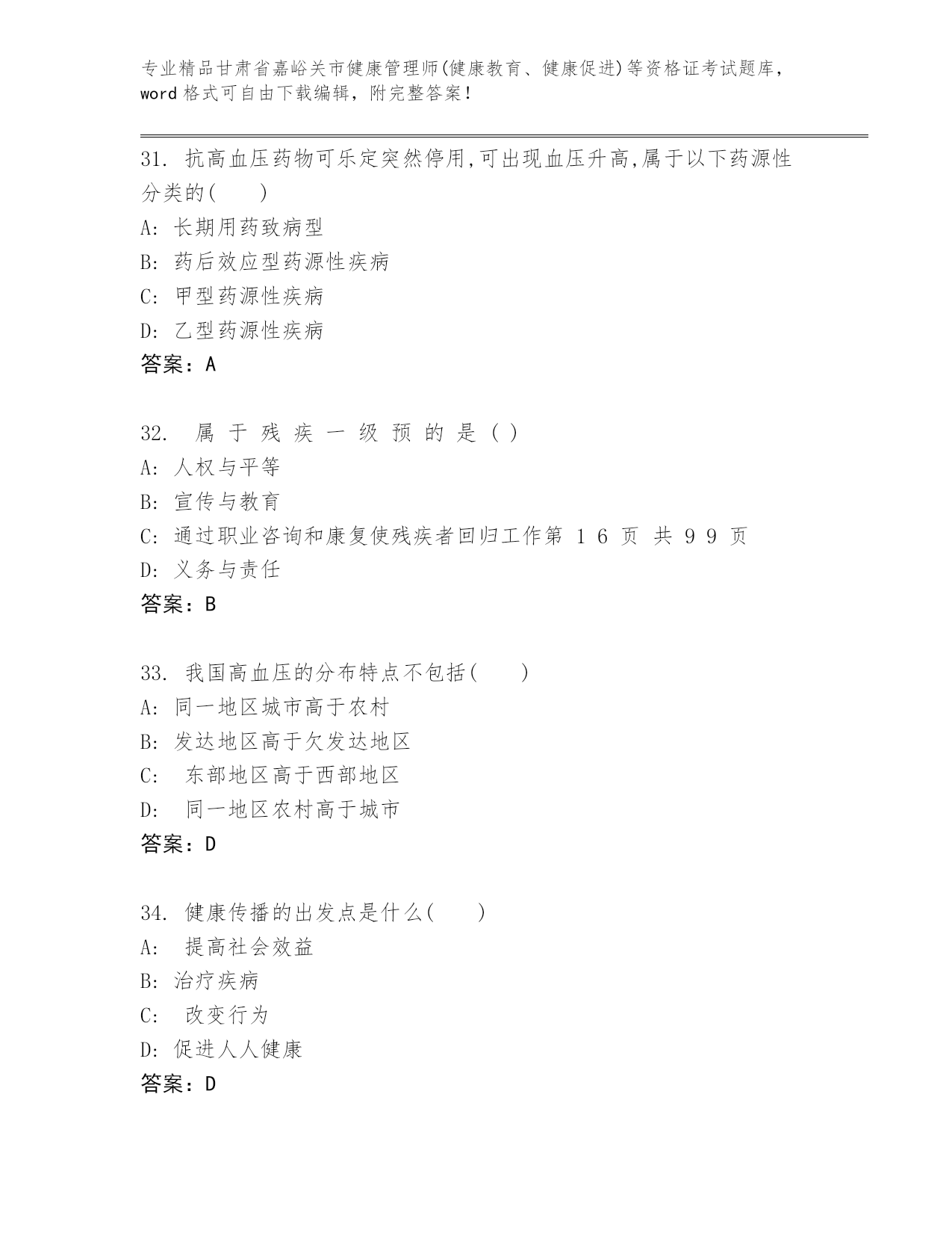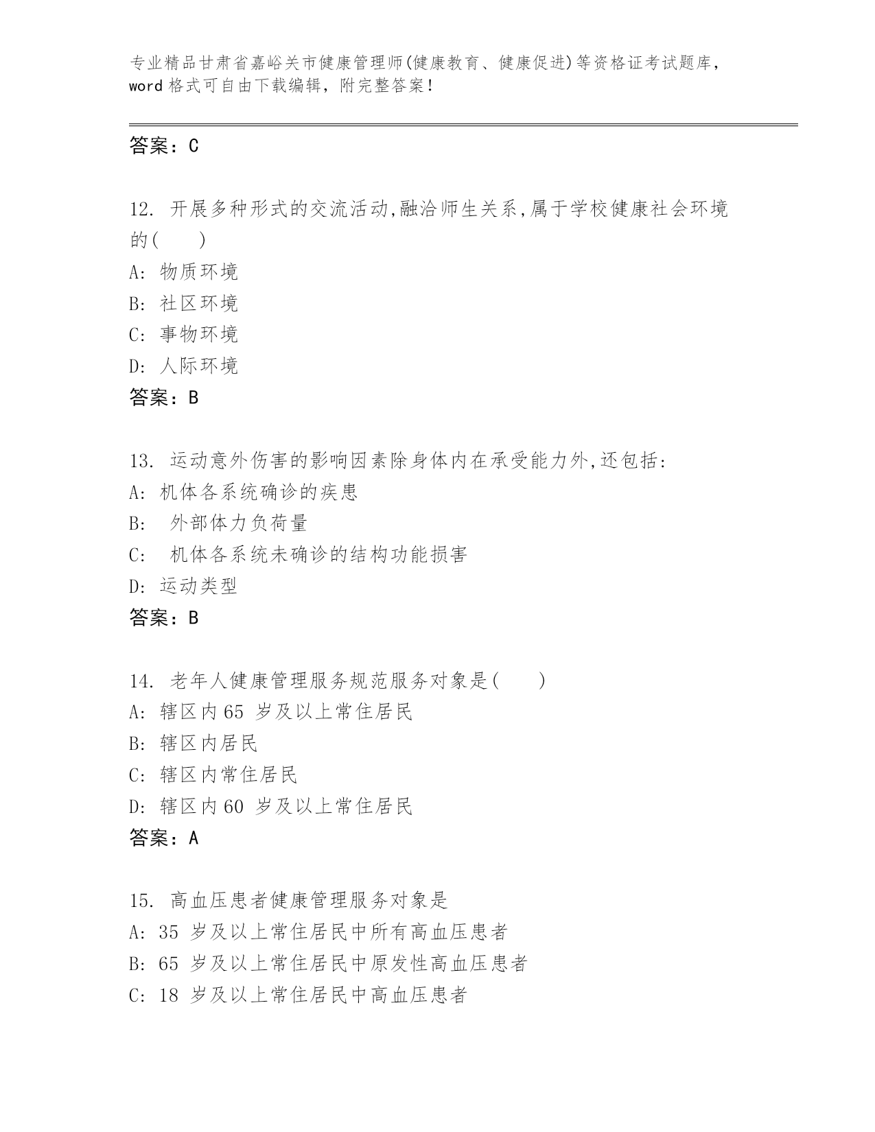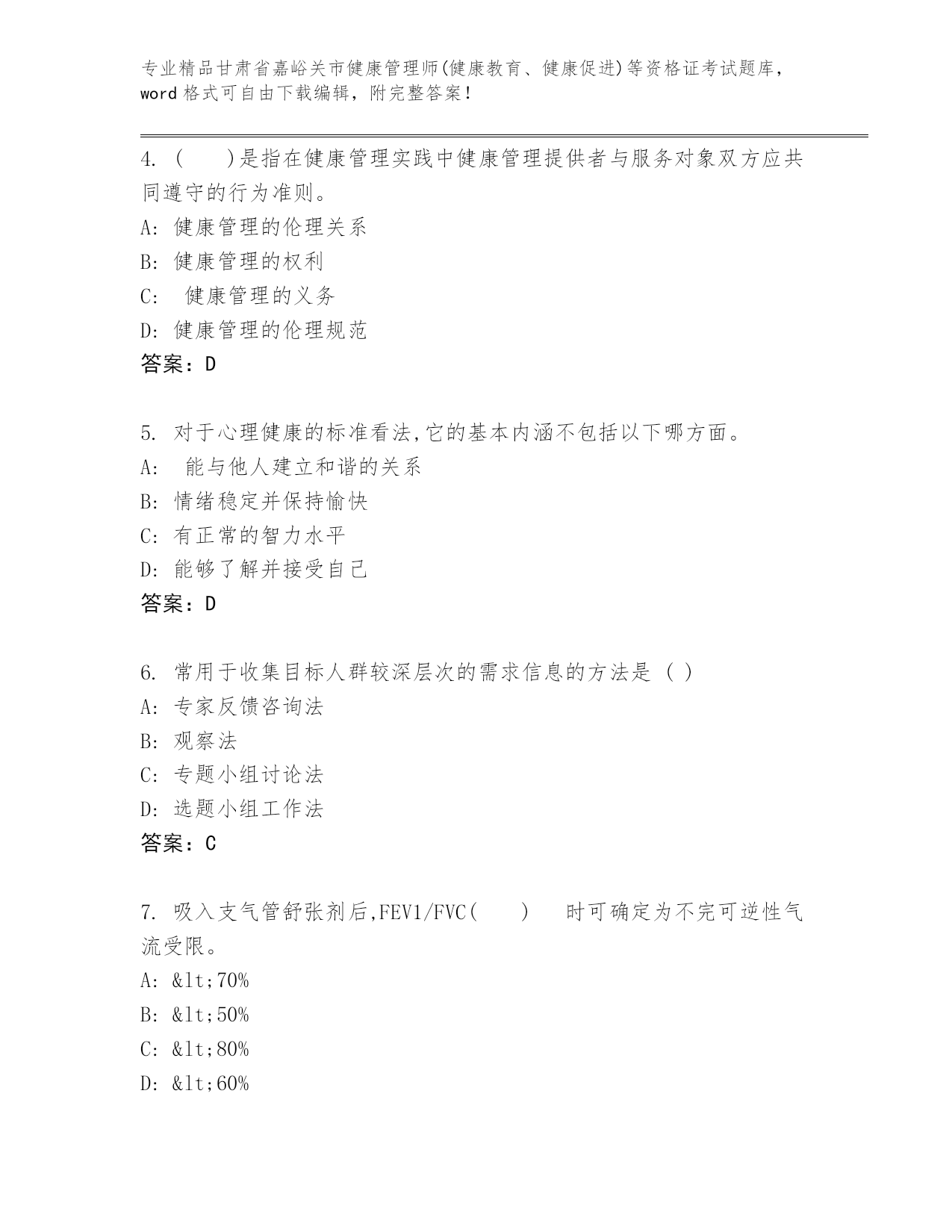 精心整理甘肃省嘉峪关市健康管理师(健康教育、健康促进)等资格证考试王牌题库精品(A卷).docx