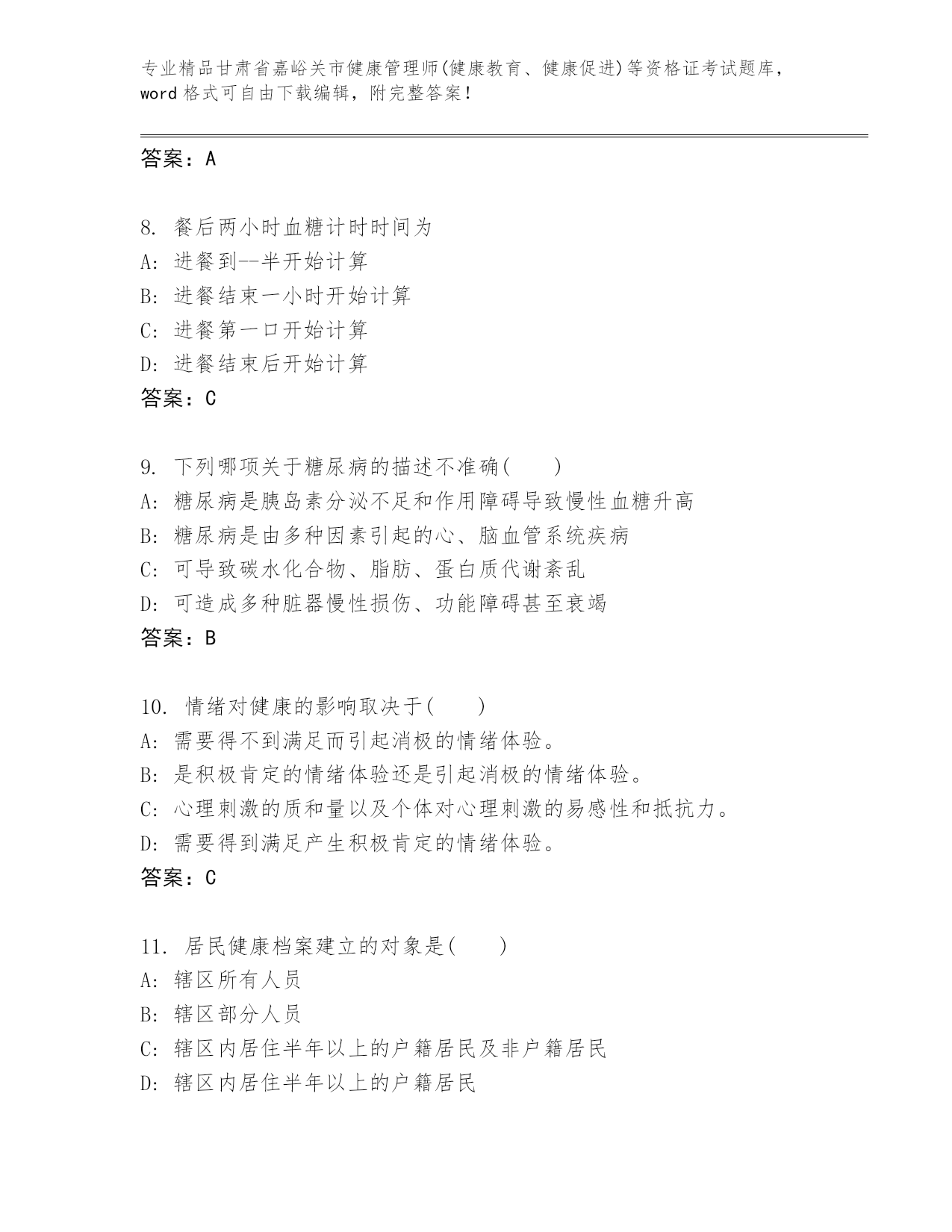 精心整理甘肃省嘉峪关市健康管理师(健康教育、健康促进)等资格证考试王牌题库精品(A卷)