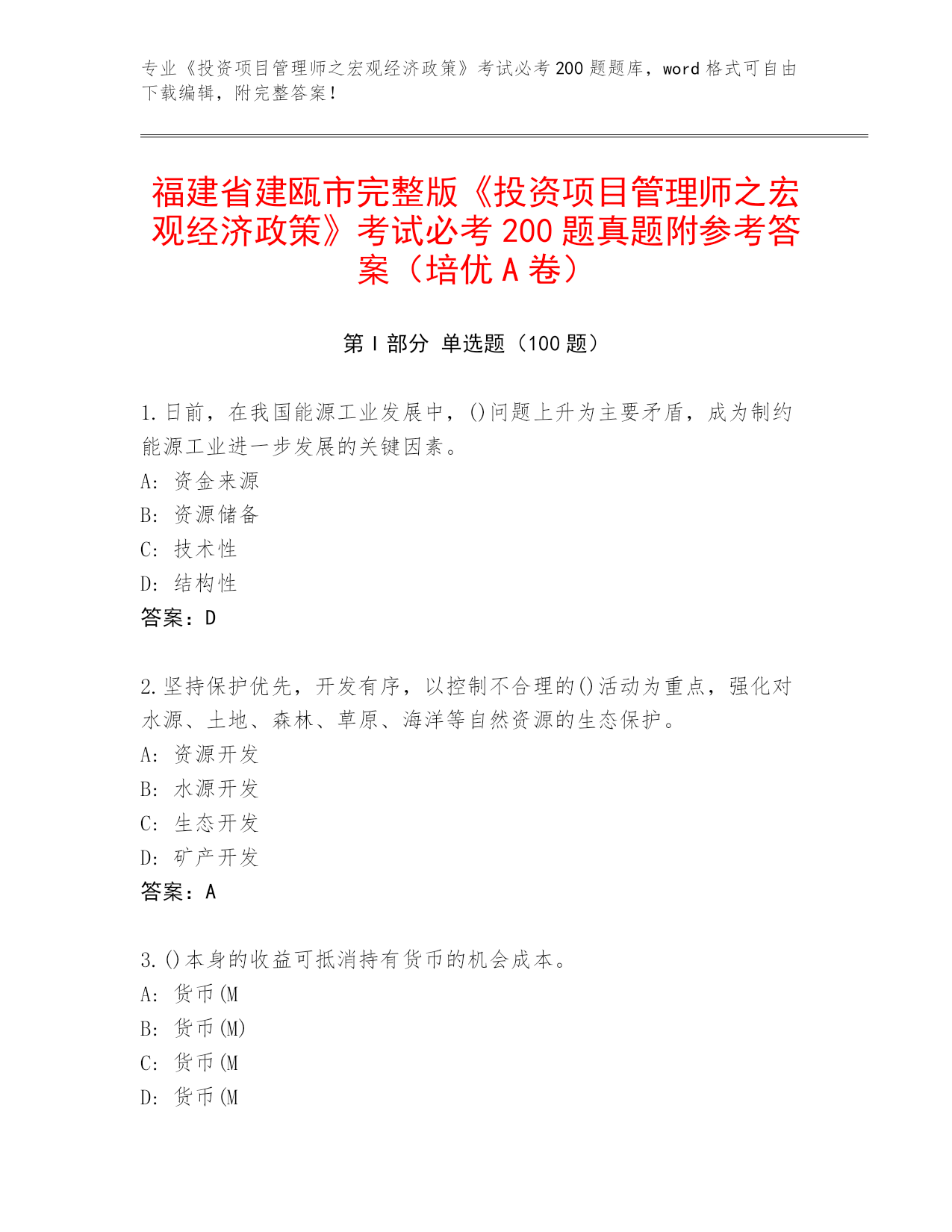 福建省建瓯市完整版《投资项目管理师之宏观经济政策》考试必考200题真题附参考答案(培优A卷)