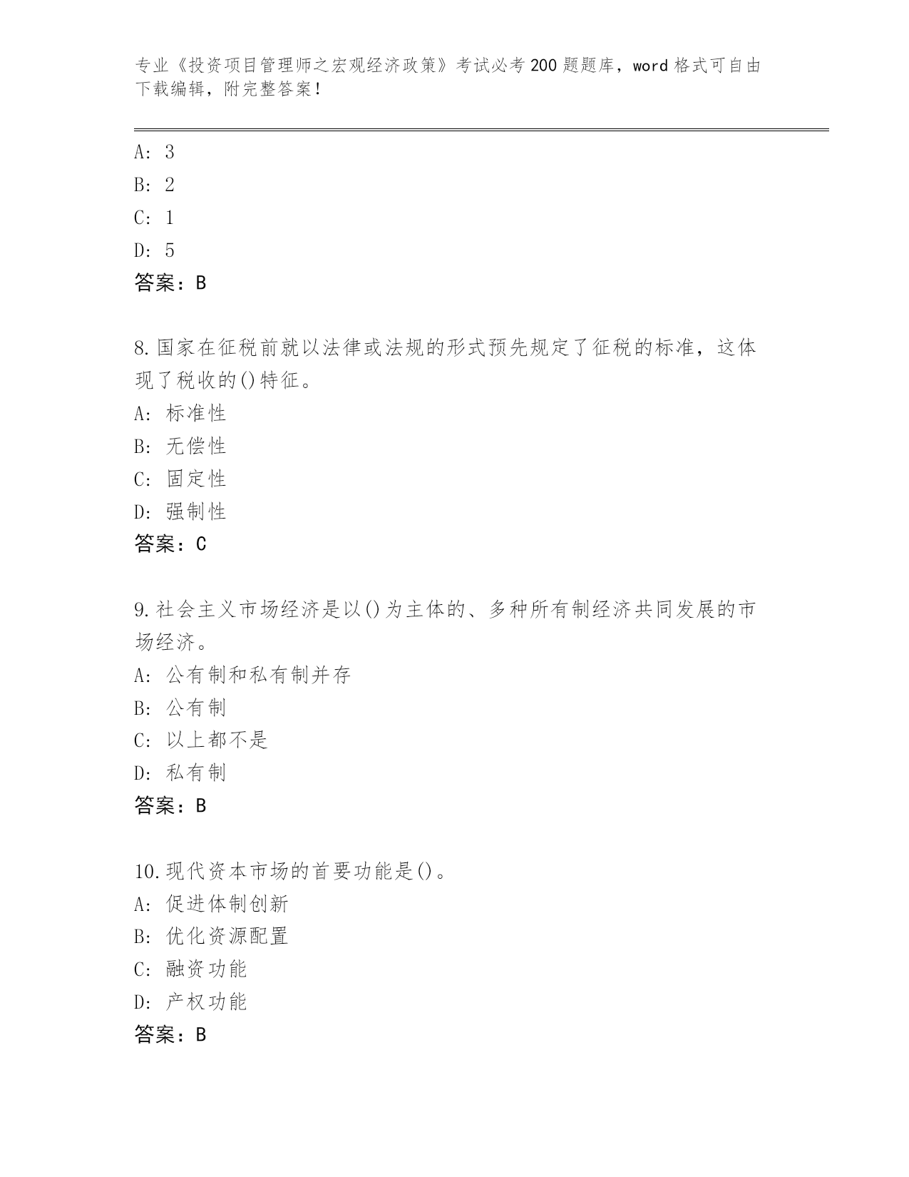 福建省2024《投资项目管理师之宏观经济政策》考试必考200题大全(培优B卷)