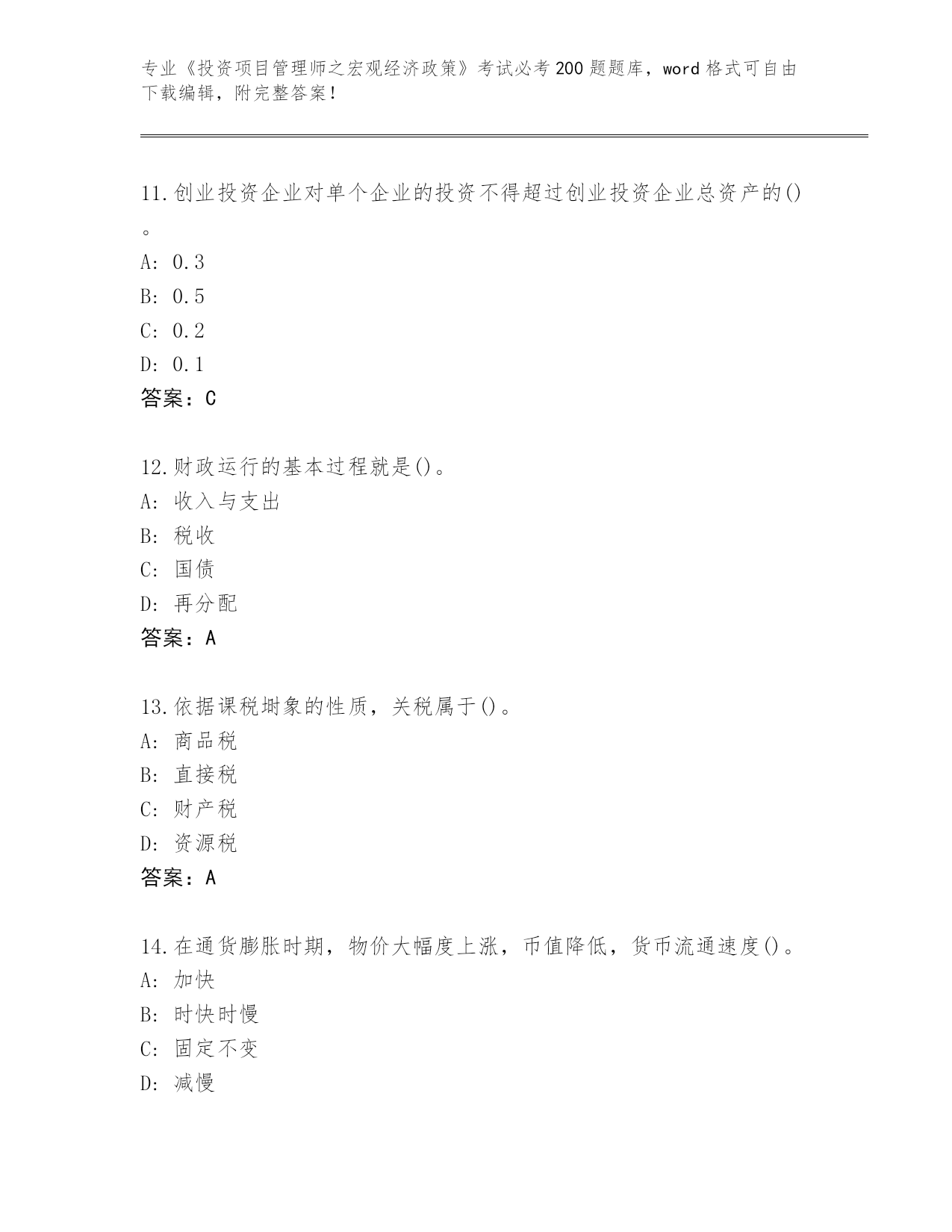 完整版福建省闽侯县《投资项目管理师之宏观经济政策》考试必考200题真题【综合卷】