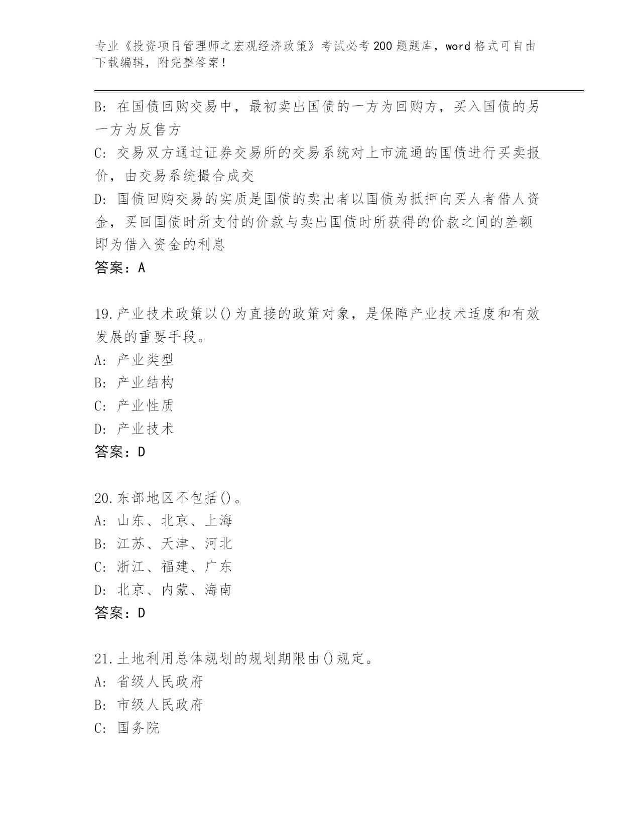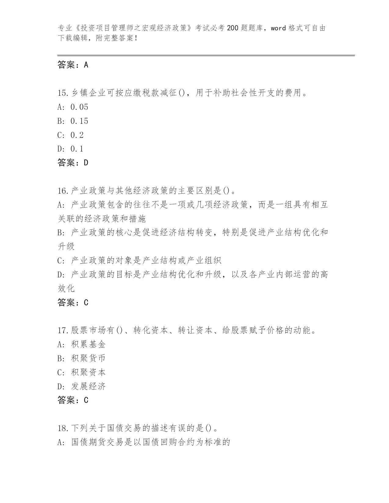 完整版福建省秀屿区《投资项目管理师之宏观经济政策》考试必考200题真题附参考答案AB卷