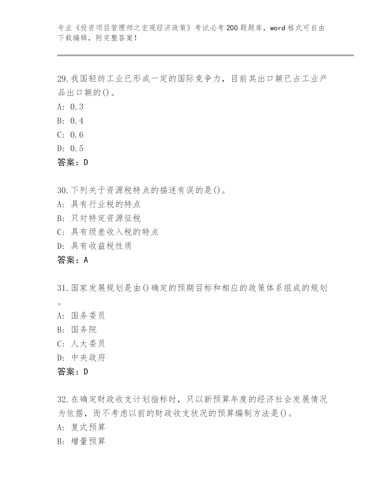 湖南省岳阳县2024《投资项目管理师之宏观经济政策》考试必考200题真题附参考答案(培优B卷)