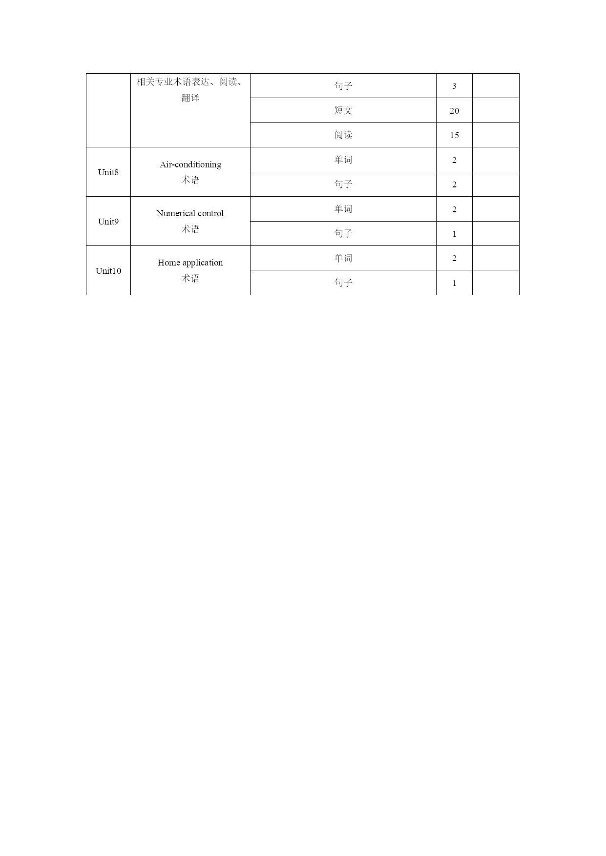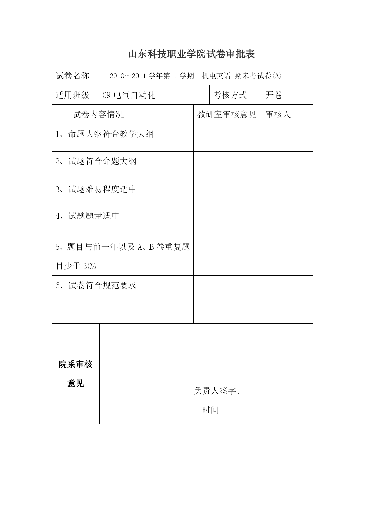 2010~2011学年第1学期课程命题大纲命题原则:根据本课程教学大纲的要求命题,主要考查机电专业的学生在机电领域的涉外业务英语交际能力,包括专业阅读、翻译、写作和口头交际的能力,以及独立查阅与专业相关的英语资料、简单的会话和涉外应用。考核的知识点及考题类型重点考核第1、2、5、6、7、8章的内容,题型包括术语翻译20分,句子20分,短文30分,阅读30分。每一章节考核的知识点及其考核方式和所占分值(以表格方式)(未考核的章节要在备注一栏简要注明原因)章节考核知识点题目形式分值备注Unit1Moderndesignandmanufacturing的相关专业术语表达、业务交流单词4句子2Unit2Telecommunications专业阅读、翻译单词4句子2Unit3Buildingservice相关专业术语表达、阅读、翻译单词2句子2Unit4Motorvehicles相关专业术语表达、阅读、翻译单词1句子3短文5Unit5Printingequipment相关专业术语表达、阅读、翻译单词1句子4短文10阅读15Unit6Electricengineering相关专业术语表达、业务交流单词1句子2Unit7Automation相关专业术语表达、阅读、翻译单词1句子3短文20阅读15Unit8Air-conditioning术语单词2句子2Unit9Numericalcontrol术语单词2句子1Unit10Homeapplication术语单词2句子1山东科技职业学院试卷审批表试卷名称2010~2011学年第1学期机电英语期未考试卷(A)适用班级09电气自动化考核方式开卷试卷内容情况教研室审核意见审核人1、命题大纲符合教学大纲2、试题符合命题大纲3、试题难易程度适中4、试题题量适中5、题目与前一年以及A、B卷重复题目少于30%6、试卷符合规范要求院系审核意见负责人签字:时间: