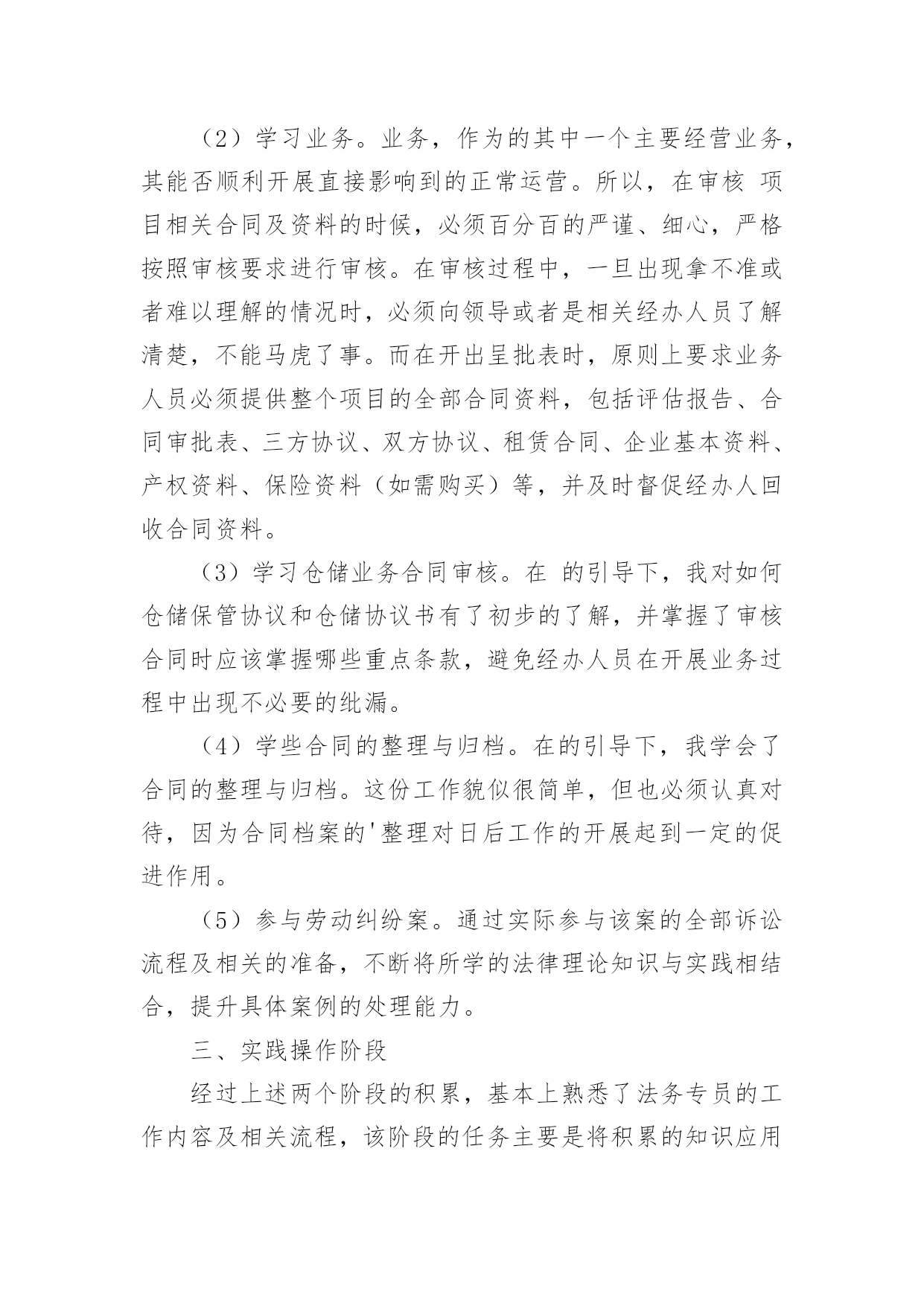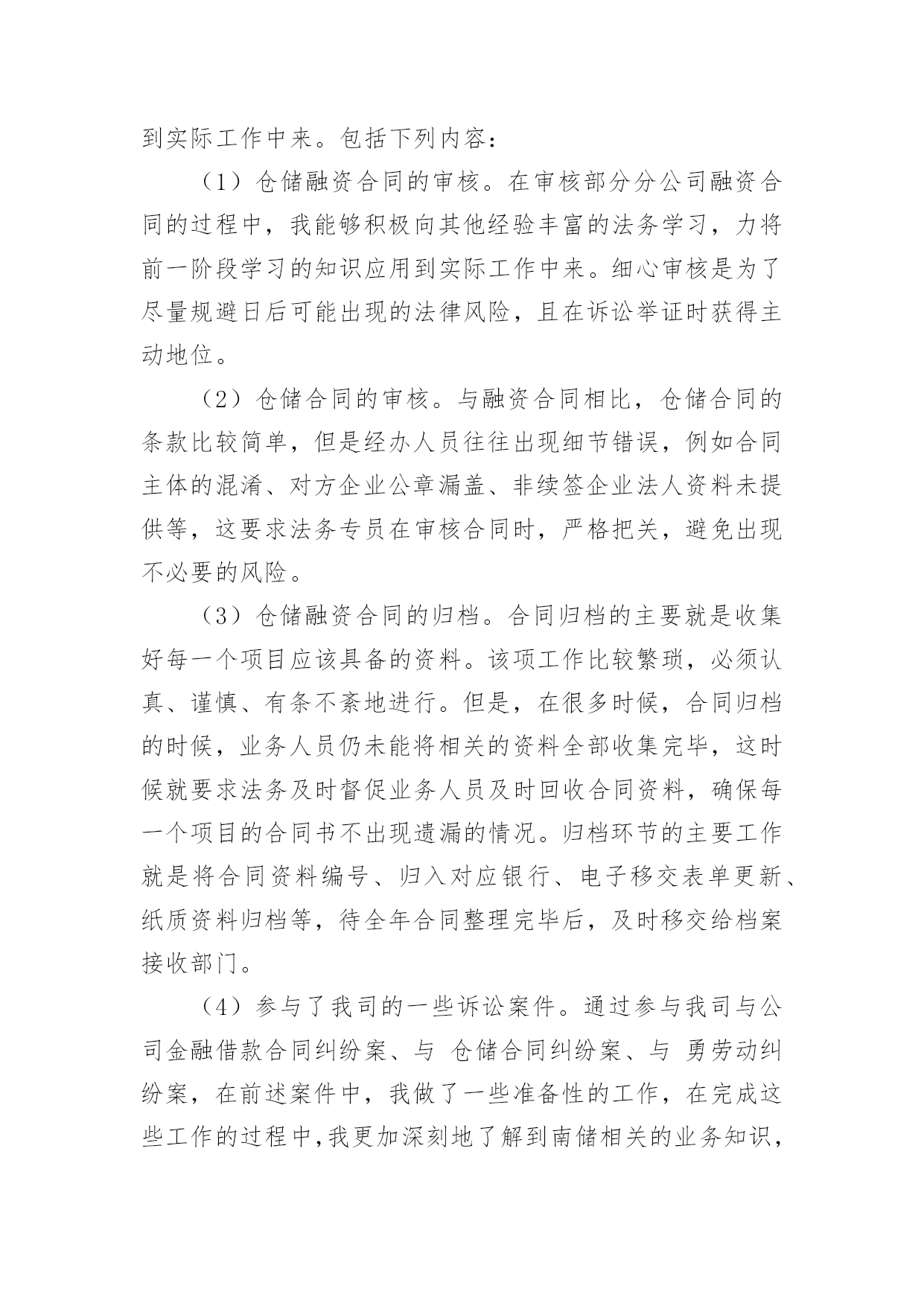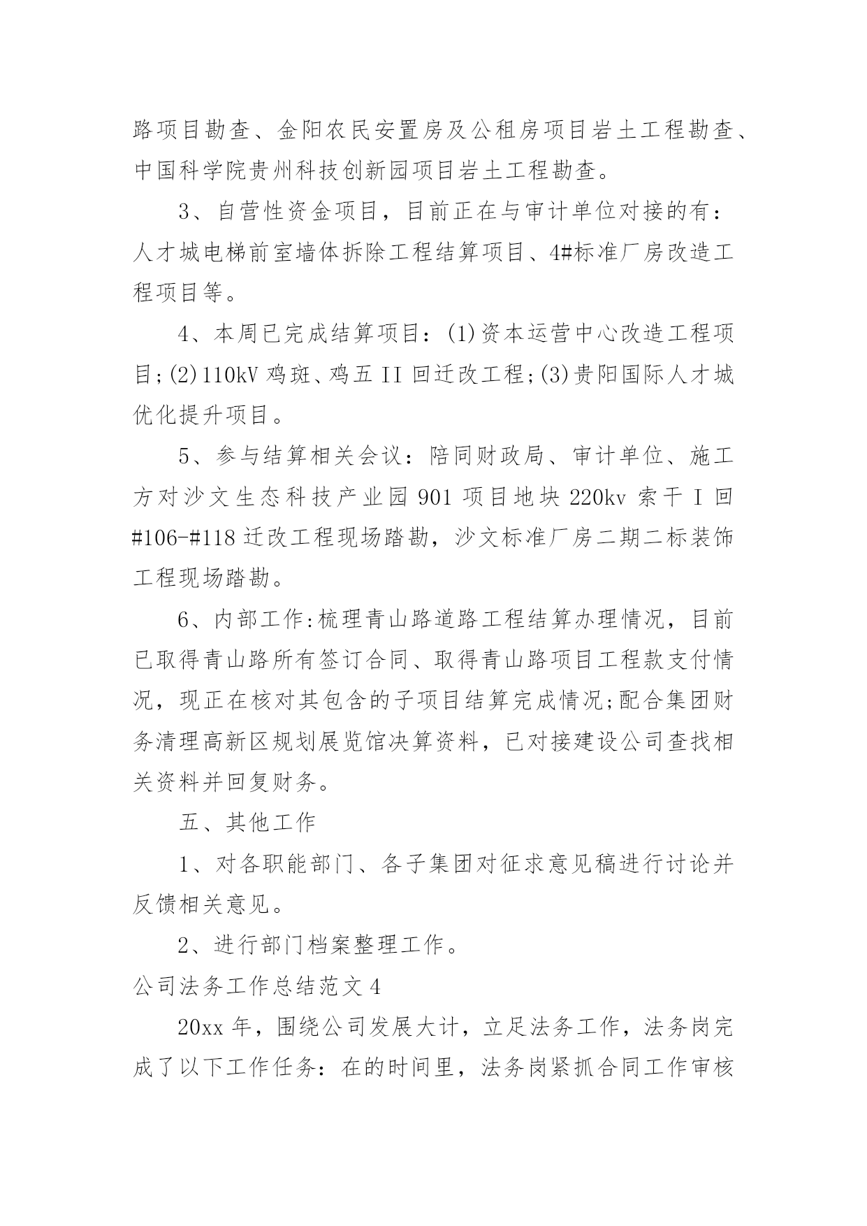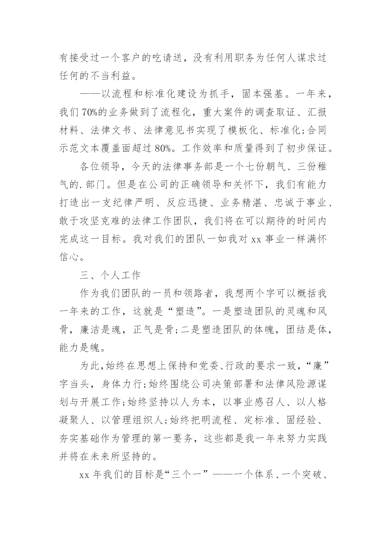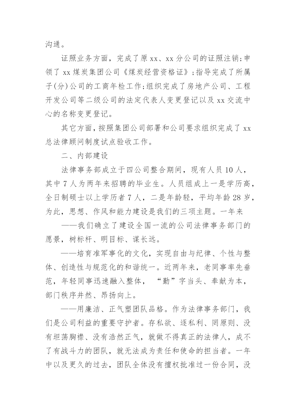 公司法务工作总结公司法务工作总结范文总结是指对某一阶段的工作、学习或思想中的经验或情况进行分析研究,做出带有规律性结论的书面材料,它能够给人努力工作的动力,不如我们来制定一份总结吧。但是却发现不知道该写些什么,下面是小编收集整理的公司法务工作总结范文,欢迎大家分享。公司法务工作总结范文1一、本部门年度工作完成情况法律事务部主要职责包括:法律咨询、合同审核、企业维权、关联交易和工商执照管理。一年来,本部门共审核合同3920份,总金额2346237.069万元,新制订合同标准文本7件,提交合同审查意见书、工作联系单38件;在控制违反采购程序、违反关联交易管制、权利义务责任配置失衡、履约保障机制缺失、解约机制缺失、供应商私自篡改合同等缔约风险方面已经发挥了主体作用。完成维权案15起,其中诉讼案10起,包括合同纠纷2起,劳动争议7起,人身伤害纠纷1起,诉讼成功率90%,败诉率10%;非诉讼案5起,包括解约纠纷1起,内部承包纠纷4起;总计为公司避免直接经济损失500余万元。完成诉讼准备的案件3起,涉案标的近2亿元,完成的准备工作包括法律法理分析研究、证据固集、和司法机关的沟通。证照业务方面,完成了原xx、xx分公司的证照注销;申领了xx煤炭集团公司《煤炭经营资格证》;指导完成了所属子(分)公司的工商年检工作;组织完成了房地产公司、工程开发公司等二级公司的法定代表人变更登记以及xx交流中心的名称变更登记。其它方面,按照集团公司部署和公司要求组织完成了xx总法律顾问制度试点验收工作。二、内部建设法律事务部成立于四公司整合期间,现有人员10人,其中7人为两年来招聘的毕业生。人员组成上一是学历高,全日制硕士以上学历者7人,二是年龄轻,平均年龄28岁,为此,思想、作风和能力建设是我们的三项主题。一年来——我们确立了建设全国一流的公司法律事务部门的愿景,树标杆、明目标、谋长远。——培育准军事化的文化,实现自由与纪律、个性与整体、创造性与规范化的和谐统一。近两年来,老同事率先垂范,年轻同事迅速融入整体,“勤”字当头、奉献为本,部门秩序井然、昂扬向上。——用廉洁、正气塑团队品格。作为法律事务部门,我们是公司利益的重要守护者。存私欲、逐私利、罔原则、没有坦荡胸襟、没有浩然正气,就做不得真正的法律人,成不了有战斗力的团队,就无法成为责任和使命的担当者。一年中以及更久的过去,团队全体没有擅权批准过一份合同,没有接受过一个客户的吃请送,没有利用职务为任何人谋求过任何的不当利益。——以流程和标准化建设为抓手,固本强基。一年来,我们70%的业务做到了流程化,重大案件的调查取证、汇报材料、法律文书、法律意见书实现了模板化、标准化;合同示范文本覆盖面超过80%。工作效率和质量得到了初步保证。各位领导,今天的法律事务部是一个七份朝气、三份稚气的.部门。但是在公司的正确领导和关怀下,我们有能力打造出一支纪律严明、反应迅捷、业务精湛、忠诚于事业、敢于攻坚克难的法律工作团队,我们将在可以期待的时间内完成这一目标。我对我们的团队一如我对xx事业一样满怀信心。三、个人工作作为我们团队的一员和领路者,我想两个字可以概括我一年来的工作,这就是“塑造”。一是塑造团队的灵魂和风骨,廉洁是魂,正气是骨;二是塑造团队的体魄,团结是体,能力是魄。为此,始终在思想上保持和党委、行政的要求一致,“廉”字当头,身体力行;始终围绕公司决策部署和法律风险源谋划与开展工作;始终坚持以人为本,以事业感召人、以人格凝聚人、以管理组织人;始终把明流程、定标准、固经验、夯实基础作为管理的第一要务,这些都是我一年来努力实践并将在未来所坚持的。xx年我们的目标是“三个一”——一个体系、一个突破、一个提高,即用全面风险管理的思想和方法完善部门工作体系,重点维权领域实现从机理认识到案件办理的突破,团队工作能力有实质性提高,全部人员基本具备所在领域的独立的研究和服务能力。公司法务工作总结范文2本人于x年x月x日入职,担任一职。实习期间,通过不断的学习,对岗位的工作内容和流程有了一定程度的认识。现将试用期的工作总结如下:一、初步学习阶段(1)入职当天,在总部的带领下,认识了部、部以及信息科技部的领导及同事。之后,实习引导人总监将相关实习资料交予我学习。通过对这些资料学习,我对岗位的工作内容有了初步的了解。(2)参加为期五天的新员工培训,加深了对公司规章制度、主营业务和各部门职能分工的了解。(3)在引导人的的指引下,全面了解负责的各项工作内容。通过此阶段的学习,强化了我对本职工作的认识,为以后更好地开展工作打下了基础。二、深入学习阶段(1)坚守原则不放松。俗话说:“在其位,谋其职。”在学习审核合同的过程中,我深刻地认识到在日常工作中,我们必须最大限度地维护我司的合法权益,最大限度地减低我司的经营风险,这不仅仅是对每一位员工