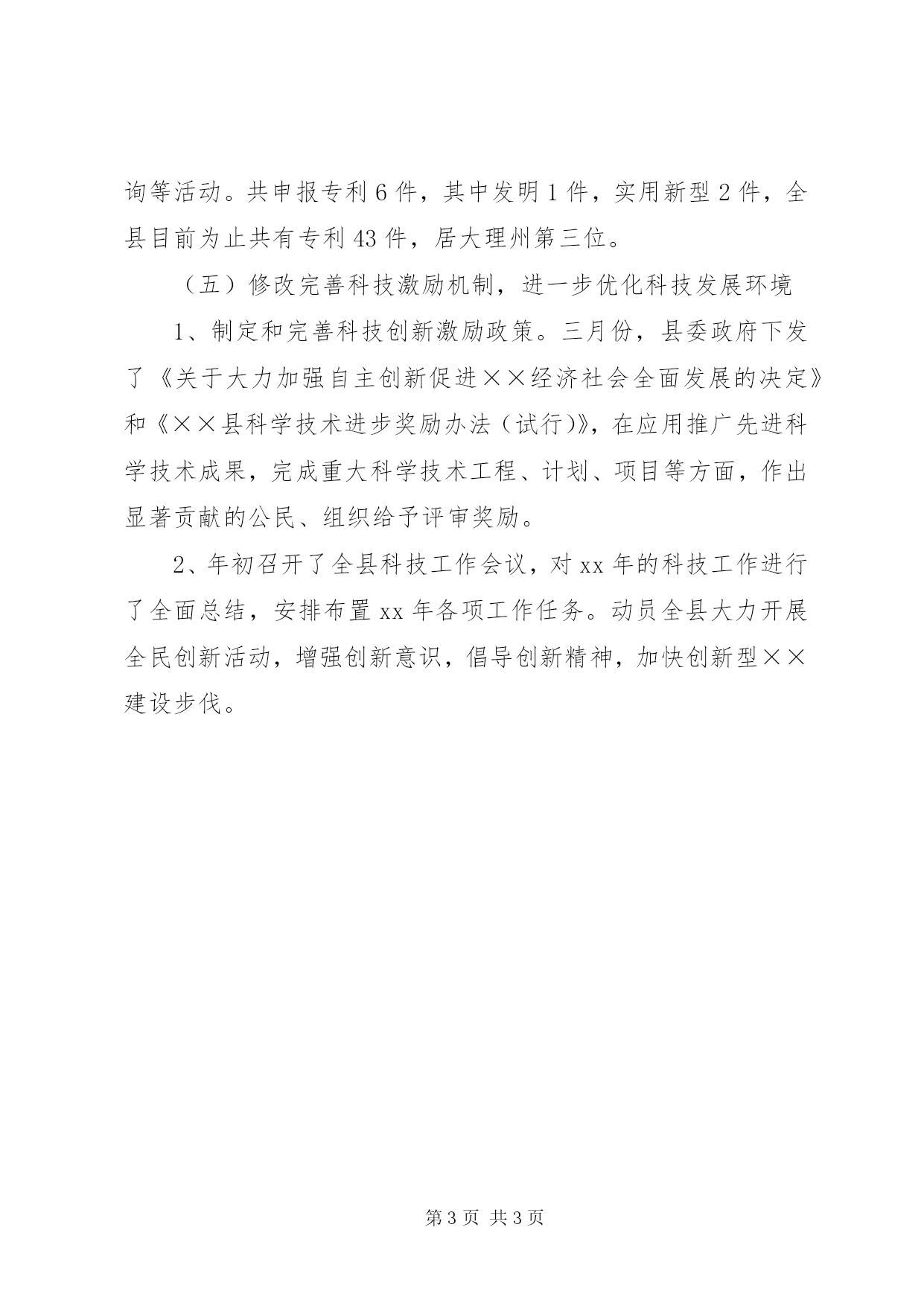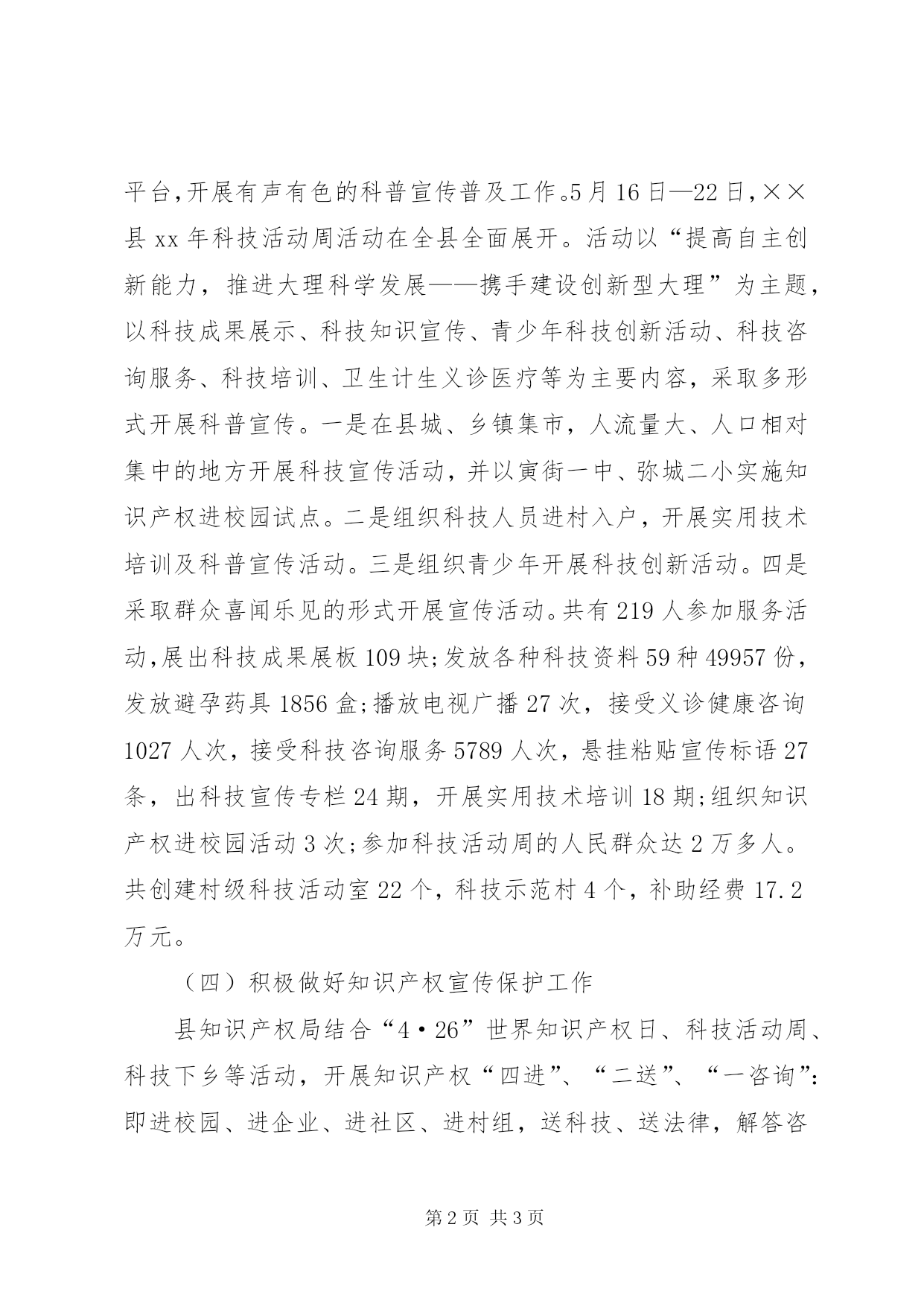 第PAGE\*Arabic\*MERGEFORMAT3页共NUMPAGES\*MERGEFORMAT3页科学技术局XX年工作总结及XX年工作要点一、xx年主要工作(一)科技项目申报及实施工作根据国家省州项目申报指南要求,认真整合科技项目资源,慎重优选科技项目。xx年,共向省科技厅申报项目7项,列项支持3项,补助经费80万元。特别是经过多方努力,经相关部门调研、评审,我县被省科技厅、省药监局授予首批“云药之乡”称号。向州科技局申报项目6项,列项支持4项。全力组织科技项目的实施,加强项目跟踪服务,管好用好科技专项资金,不断提高资金的使用效益。(二)切实抓好水稻高产创建工作根据省委、省政府“百亿斤粮食增产计划”的总体部署,xx年我县被省科技厅列入水稻高产创建示范区建设,项目经费40万元,并由县科技局组织实施。从2月份起,通过广泛宣传发动、层层技术培训、及时就位配套农资、集中防治病虫、入户下田指导,2.16万亩水稻高产创建工作进展顺利。9月10日经省州专家实地验收,百亩方亩产达988.77公斤,创楚粳28号世界记录。(三)积极搞好科普宣传工作围绕新农村建设,认真做好“解五难三项建设”。以“知识产权宣传日”、“科技活动周”、“科技下乡”、科普长廊为有效平台,开展有声有色的科普宣传普及工作。5月16日—22日,××县xx年科技活动周活动在全县全面展开。活动以“提高自主创新能力,推进大理科学发展——携手建设创新型大理”为主题,以科技成果展示、科技知识宣传、青少年科技创新活动、科技咨询服务、科技培训、卫生计生义诊医疗等为主要内容,采取多形式开展科普宣传。一是在县城、乡镇集市,人流量大、人口相对集中的地方开展科技宣传活动,并以寅街一中、弥城二小实施知识产权进校园试点。二是组织科技人员进村入户,开展实用技术培训及科普宣传活动。三是组织青少年开展科技创新活动。四是采取群众喜闻乐见的形式开展宣传活动。共有219人参加服务活动,展出科技成果展板109块;发放各种科技资料59种49957份,发放避孕药具1856盒;播放电视广播27次,接受义诊健康咨询1027人次,接受科技咨询服务5789人次,悬挂粘贴宣传标语27条,出科技宣传专栏24期,开展实用技术培训18期;组织知识产权进校园活动3次;参加科技活动周的人民群众达2万多人。共创建村级科技活动室22个,科技示范村4个,补助经费17.2万元。(四)积极做好知识产权宣传保护工作县知识产权局结合“4·26”世界知识产权日、科技活动周、科技下乡等活动,开展知识产权“四进”、“二送”、“一咨询”:即进校园、进企业、进社区、进村组,送科技、送法律,解答咨询等活动。共申报专利6件,其中发明1件,实用新型2件,全县目前为止共有专利43件,居大理州第三位。(五)修改完善科技激励机制,进一步优化科技发展环境1、制定和完善科技创新激励政策。三月份,县委政府下发了《关于大力加强自主创新促进××经济社会全面发展的决定》和《××县科学技术进步奖励办法(试行)》,在应用推广先进科学技术成果,完成重大科学技术工程、计划、项目等方面,作出显著贡献的公民、组织给予评审奖励。2、年初召开了全县科技工作会议,对xx年的科技工作进行了全面总结,安排布置xx年各项工作任务。动员全县大力开展全民创新活动,增强创新意识,倡导创新精神,加快创新型××建设步伐。