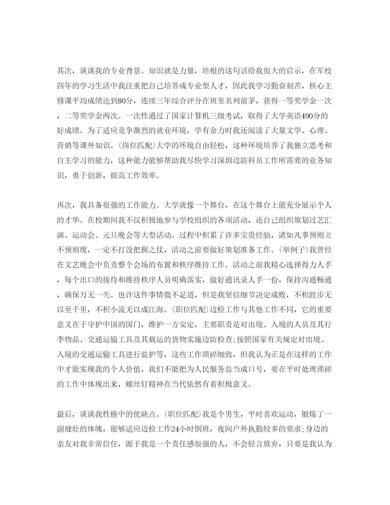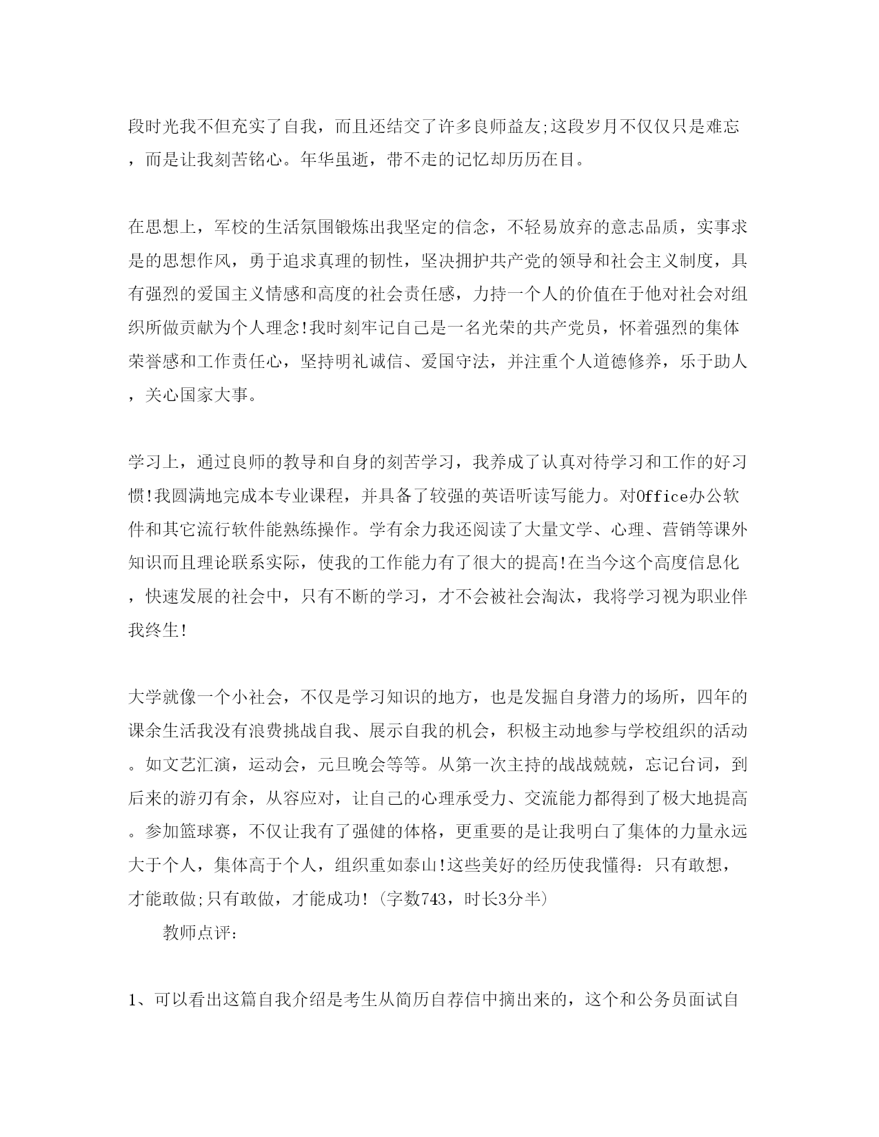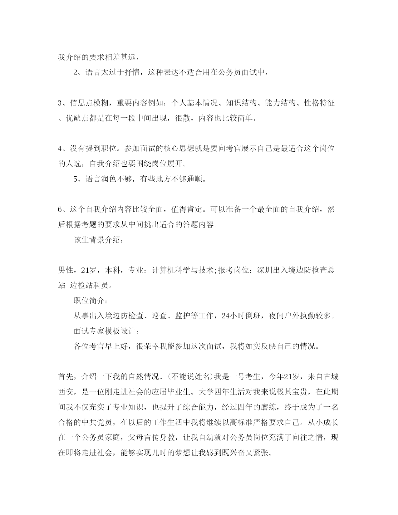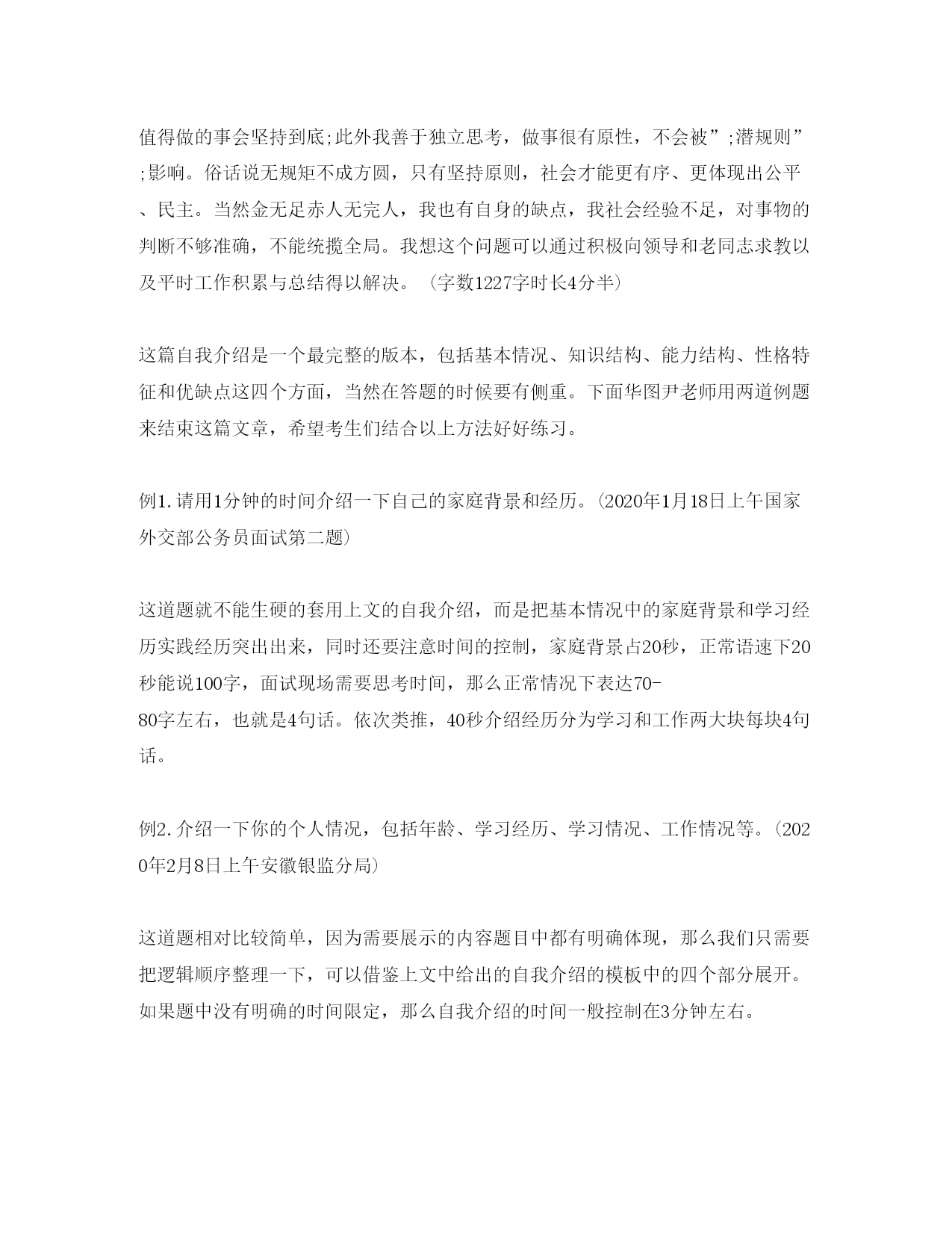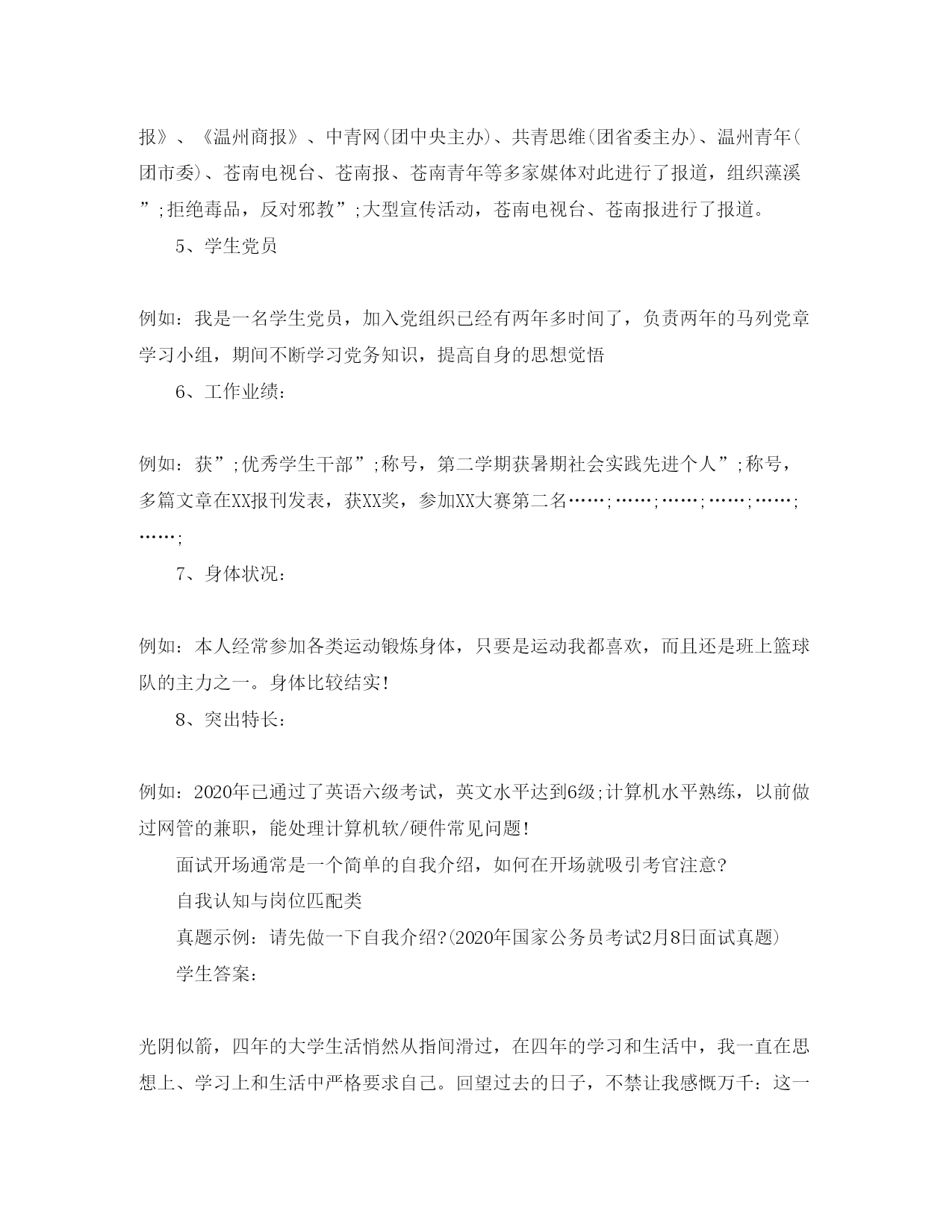 此资料由网络收集而来,如有侵权请告知上传者立即删除。资料共分享,我们负责传递知识。2020公务员面试自我介绍攻略公务员面试,是在精心设计的特定场景下,通过测试者和被测试者面对面的交谈对被测试对象进行观察,并对其综合素质进行评价的一种方式。时间一般会控制在10-20分钟之间,考生如何在这么短的时间内向考官展示自己卓尔不群的素质?面试之前做好精心设计是制胜法宝。在面试中也许同样的内容用不同的措辞,适当调节语言顺序,就会产生大相径庭的效果。首先是从哪些方面自我介绍呢?1、笔试成绩:例如:总分******,总排名第二2、学习背景:例如:毕业于XX大学,连续7个学期获得一二等奖学金和三好学生,或院优秀学生干部、校社会实践先进个人称号……;……;3、学生干部:例如:曾担任05教育技术(3)班班长,物理与电子信息学院《镭射》美编,温州师范学院院报记者、编辑,校”;超越网”;特约通讯员、物理与电子信息学院通讯员,”;教育技术学专业实践队”;教务组长、新闻组长等4、社会实践:例如:负责组织”;教育技术学专业实践队”;赴苍难藻溪开展支教活动,主要负责”;教育技术学专业实践队”;的队员管理、学生管理,担任教学组组长、通讯组组长、初二段作文教学的任务,组织苍南”;崇尚科学,反对邪教”;下乡活动,和苍南县正法委与苍南团县委以及苍南其他五大乡镇进行了深入的宣传活动,《温州日报》、《温州商报》、中青网(团中央主办)、共青思维(团省委主办)、温州青年(团市委)、苍南电视台、苍南报、苍南青年等多家媒体对此进行了报道,组织藻溪”;拒绝毒品,反对邪教”;大型宣传活动,苍南电视台、苍南报进行了报道。5、学生党员例如:我是一名学生党员,加入党组织已经有两年多时间了,负责两年的马列党章学习小组,期间不断学习党务知识,提高自身的思想觉悟6、工作业绩:例如:获”;优秀学生干部”;称号,第二学期获暑期社会实践先进个人”;称号,多篇文章在XX报刊发表,获XX奖,参加XX大赛第二名……;……;……;……;……;……;7、身体状况:例如:本人经常参加各类运动锻炼身体,只要是运动我都喜欢,而且还是班上篮球队的主力之一。身体比较结实!8、突出特长:例如:2020年已通过了英语六级考试,英文水平达到6级;计算机水平熟练,以前做过网管的兼职,能处理计算机软/硬件常见问题!面试开场通常是一个简单的自我介绍,如何在开场就吸引考官注意?自我认知与岗位匹配类真题示例:请先做一下自我介绍?(2020年国家公务员考试2月8日面试真题)学生答案:光阴似箭,四年的大学生活悄然从指间滑过,在四年的学习和生活中,我一直在思想上、学习上和生活中严格要求自己。回望过去的日子,不禁让我感慨万千:这一段时光我不但充实了自我,而且还结交了许多良师益友;这段岁月不仅仅只是难忘,而是让我刻苦铭心。年华虽逝,带不走的记忆却历历在目。在思想上,军校的生活氛围锻炼出我坚定的信念,不轻易放弃的意志品质,实事求是的思想作风,勇于追求真理的韧性,坚决拥护共产党的领导和社会主义制度,具有强烈的爱国主义情感和高度的社会责任感,力持一个人的价值在于他对社会对组织所做贡献为个人理念!我时刻牢记自己是一名光荣的共产党员,怀着强烈的集体荣誉感和工作责任心,坚持明礼诚信、爱国守法,并注重个人道德修养,乐于助人,关心国家大事。学习上,通过良师的教导和自身的刻苦学习,我养成了认真对待学习和工作的好习惯!我圆满地完成本专业课程,并具备了较强的英语听读写能力。对Office办公软件和其它流行软件能熟练操作。学有余力我还阅读了大量文学、心理、营销等课外知识而且理论联系实际,使我的工作能力有了很大的提高!在当今这个高度信息化,快速发展的社会中,只有不断的学习,才不会被社会淘汰,我将学习视为职业伴我终生!大学就像一个小社会,不仅是学习知识的地方,也是发掘自身潜力的场所,四年的课余生活我没有浪费挑战自我、展示自我的机会,积极主动地参与学校组织的活动。如文艺汇演,运动会,元旦晚会等等。从第一次主持的战战兢兢,忘记台词,到后来的游刃有余,从容应对,让自己的心理承受力、交流能力都得到了极大地提高。参加篮球赛,不仅让我有了强健的体格,更重要的是让我明白了集体的力量永远大于个人,集体高于个人,组织重如泰山!这些美好的经历使我懂得:只有敢想,才能敢做;只有敢做,才能成功!(字数743,时长3分半)教师点评:1、可以看出这篇自我介绍是考生从简历自荐信中摘出来的,这个和公务员面试自我介绍的要求相差甚远。2、语言太过于抒情,这种表达不适合用在公务员面试中。3、信息点模糊,重要内容例如:个人基本情况、知识结构、能力结构、性格特征、优缺点都是在每一段中间出现,很散,内容也比较简单。4、没有提到职位。参加面试的核心思想就是要