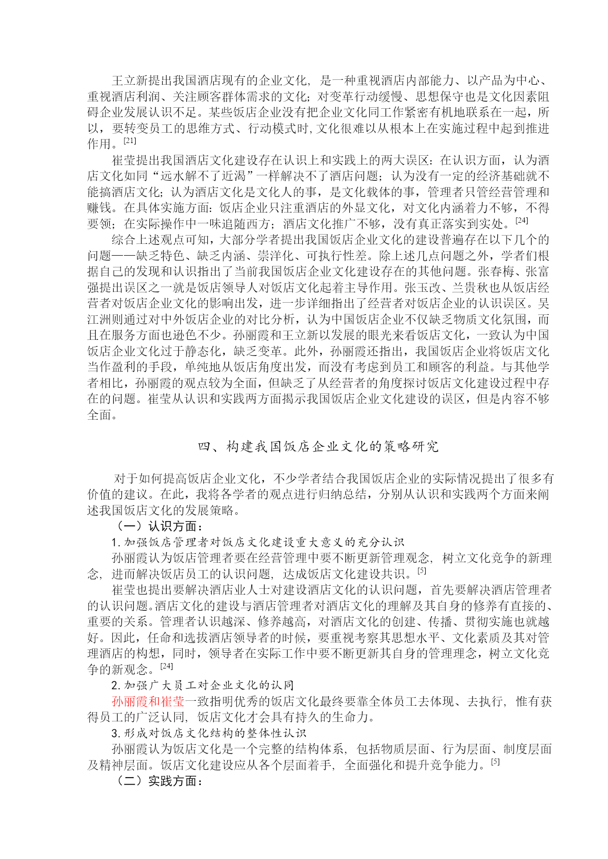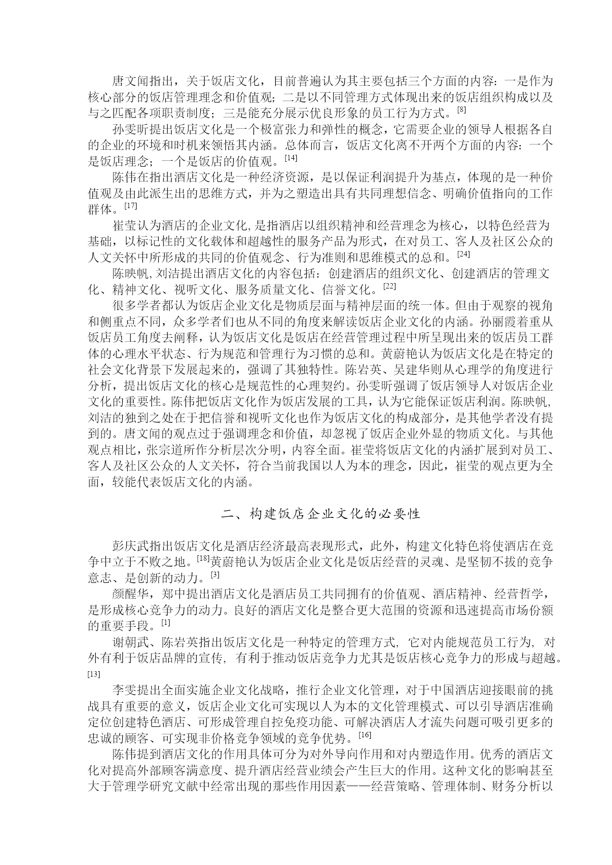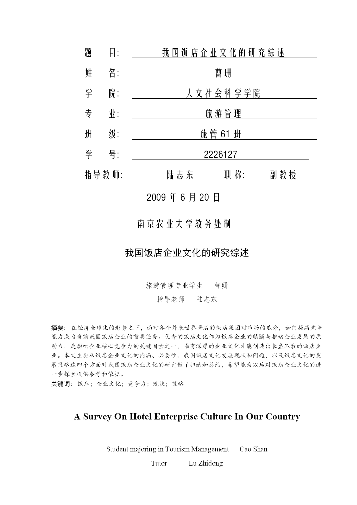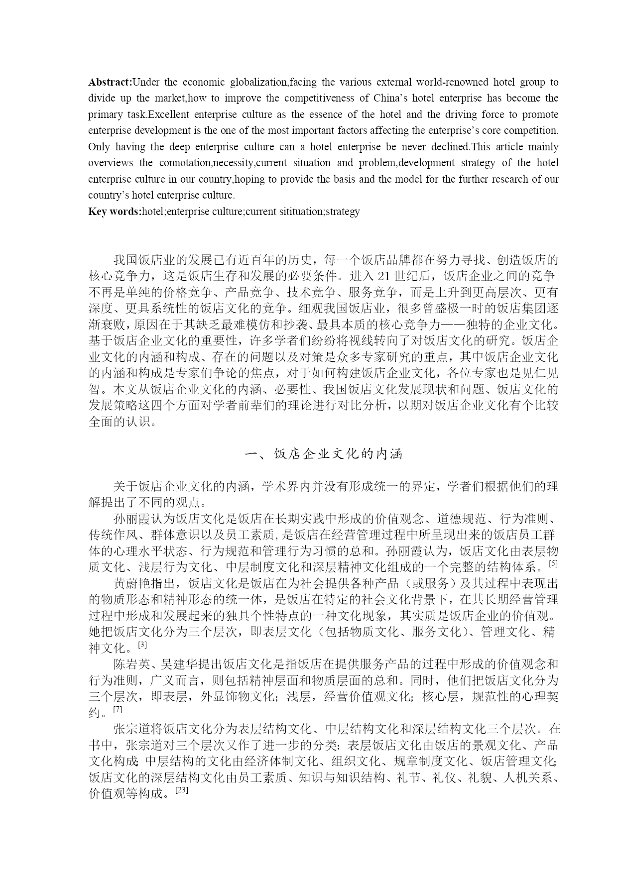 我国饭店企业文化的研究综述(常用版)(可以直接使用,可编辑完整版资料,欢迎下载)本科生专业文献综述题目:我国饭店企业文化的研究综述姓名:曹珊学院:人文社会科学学院专业:旅游管理班级:旅管61班学号:2226127指导教师:陆志东职称:副教授2009年6月20日南京农业大学教务处制我国饭店企业文化的研究综述旅游管理专业学生曹珊指导老师陆志东摘要:在经济全球化的形势之下,面对各个外来世界著名的饭店集团对市场的瓜分,如何提高竞争能力成为当前我国饭店企业的首要任务。优秀的饭店文化作为饭店企业的精髓与推动企业发展的原动力,是影响企业核心竞争力的关键因素之一。唯有深厚的企业文化才能创造出长盛不衰的饭店企业。本文主要从饭店企业文化的内涵、必要性、我国饭店文化发展现状和问题,以及饭店文化的发展策略这四个方面对我国饭店企业文化的研究做了归纳和总结,希望能为以后对饭店企业文化的进一步探索提供参考和依据。关键词:饭店;企业文化;竞争力;现状;策略ASurveyOnHotelEnterpriseCultureInOurCountryStudentmajoringinTourismManagementCaoShanTutorLuZhidongAbstract:Undertheeconomicglobalization,facingthevariousexternalworld-renownedhotelgrouptodivideupthemarket,howtoimprovethecompetitivenessofChina’shotelenterprisehasbecometheprimarytask.Excellententerprisecultureastheessenceofthehotelandthedrivingforcetopromoteenterprisedevelopmentistheoneofthemostimportantfactorsaffectingtheenterprise’scorecompetition.Onlyhavingthedeepenterpriseculturecanahotelenterprisebeneverdeclined.Thisarticlemainlyoverviewstheconnotation,necessity,currentsituationandproblem,developmentstrategyofthehotelenterprisecultureinourcountry,hopingtoprovidethebasisandthemodelforthefurtherresearchofourcountry’shotelenterpriseculture.Keywords:hotel;enterpriseculture;currentsitituation;strategy我国饭店业的发展已有近百年的历史,每一个饭店品牌都在努力寻找、创造饭店的核心竞争力,这是饭店生存和发展的必要条件。进入21世纪后,饭店企业之间的竞争不再是单纯的价格竞争、产品竞争、技术竞争、服务竞争,而是上升到更高层次、更有深度、更具系统性的饭店文化的竞争。细观我国饭店业,很多曾盛极一时的饭店集团逐渐衰败,原因在于其缺乏最难模仿和抄袭、最具本质的核心竞争力——独特的企业文化。基于饭店企业文化的重要性,许多学者们纷纷将视线转向了对饭店文化的研究。饭店企业文化的内涵和构成、存在的问题以及对策是众多专家研究的重点,其中饭店企业文化的内涵和构成是专家们争论的焦点,对于如何构建饭店企业文化,各位专家也是见仁见智。本文从饭店企业文化的内涵、必要性、我国饭店文化发展现状和问题、饭店文化的发展策略这四个方面对学者前辈们的理论进行对比分析,以期对饭店企业文化有个比较全面的认识。一、饭店企业文化的内涵关于饭店企业文化的内涵,学术界内并没有形成统一的界定,学者们根据他们的理解提出了不同的观点。孙丽霞认为饭店文化是饭店在长期实践中形成的价值观念、道德规范、行为准则、传统作风、群体意识以及员工素质,是饭店在经营管理过程中所呈现出来的饭店员工群体的心理水平状态、行为规范和管理行为习惯的总和。孙丽霞认为,饭店文化由表层物质文化、浅层行为文化、中层制度文化和深层精神文化组成的一个完整的结构体系。[5]黄蔚艳指出,饭店文化是饭店在为社会提供各种产品(或服务)及其过程中表现出的物质形态和精神形态的统一体,是饭店在特定的社会文化背景下,在其长期经营管理过程中形成和发展起来的独具个性特点的一种文化现象,其实质是饭店企业的价值观。她把饭店文化分为三个层次,即表层文化(包括物质文化、服务文化)、管理文化、精神文