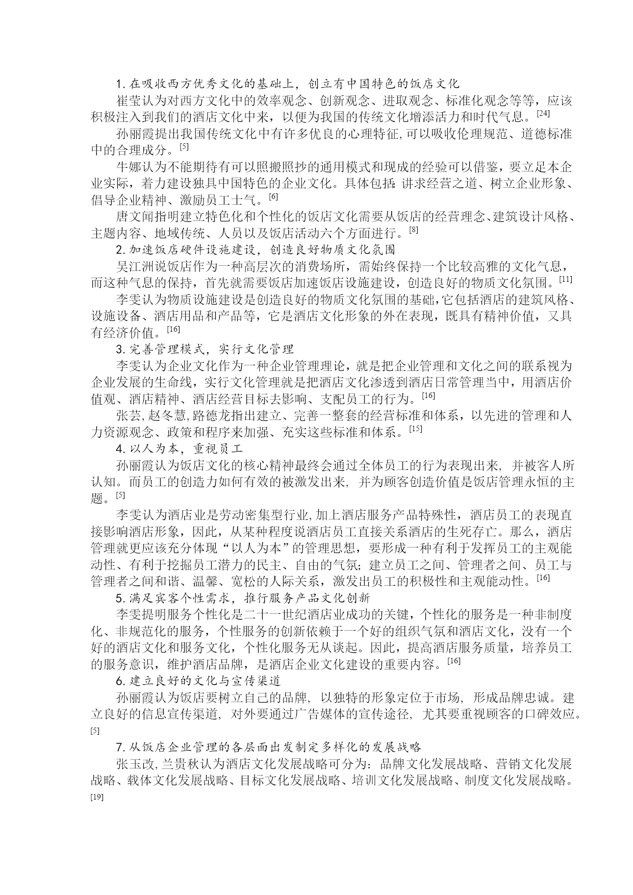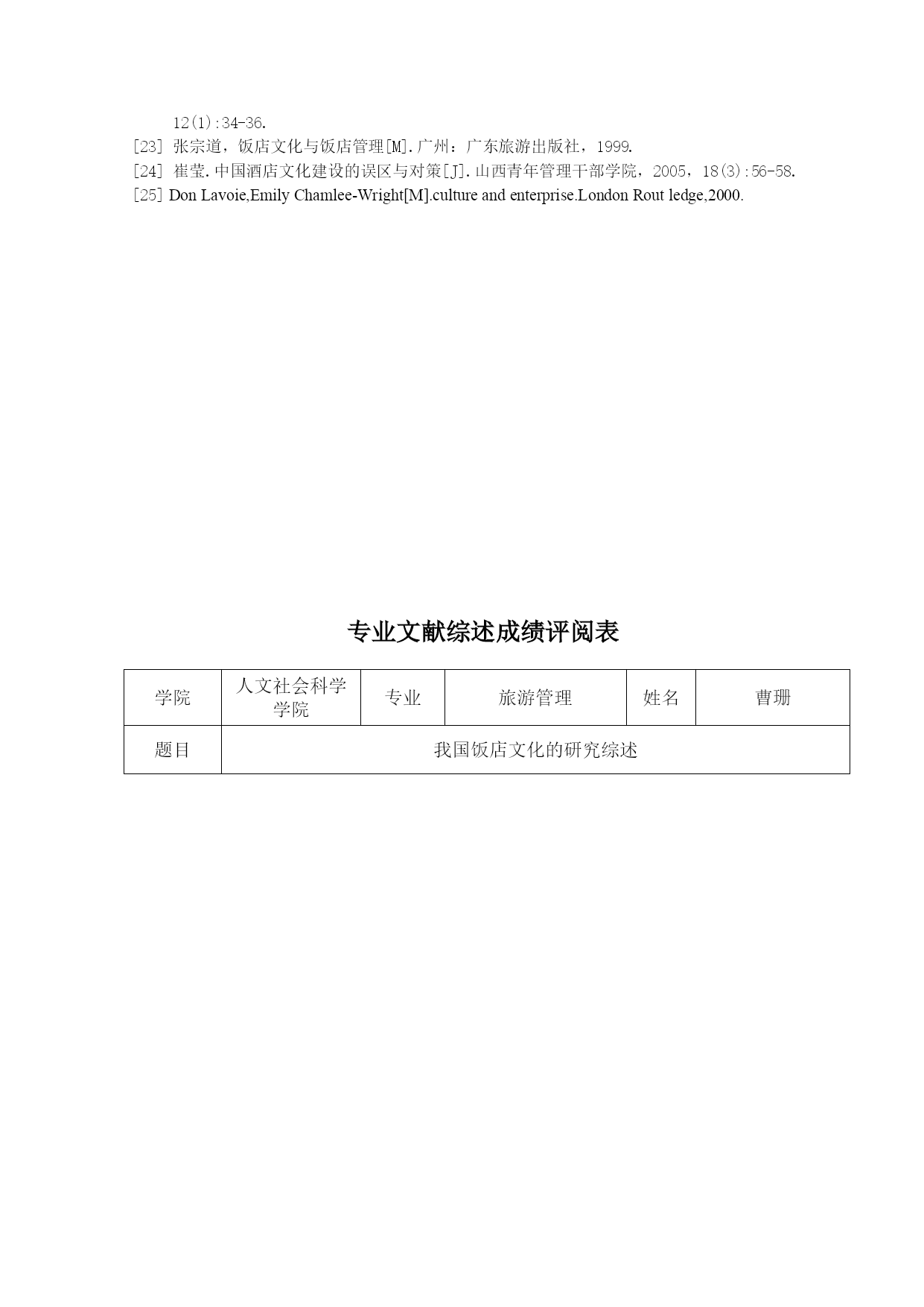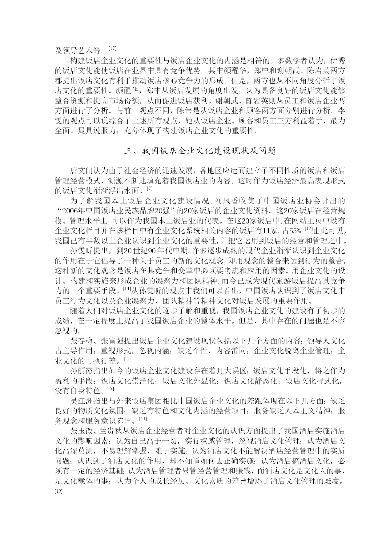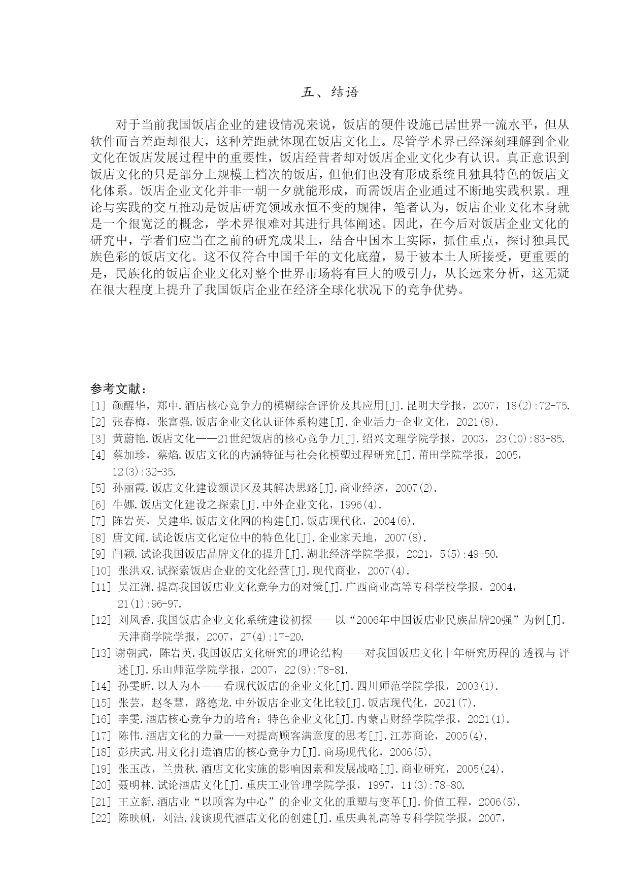 我国饭店企业文化的研究综述(常用版)(可以直接使用,可编辑完整版资料,欢迎下载)本科生专业文献综述题目:我国饭店企业文化的研究综述姓名:曹珊学院:人文社会科学学院专业:旅游管理班级:旅管61班学号:2226127指导教师:陆志东职称:副教授2009年6月20日南京农业大学教务处制我国饭店企业文化的研究综述旅游管理专业学生曹珊指导老师陆志东摘要:在经济全球化的形势之下,面对各个外来世界著名的饭店集团对市场的瓜分,如何提高竞争能力成为当前我国饭店企业的首要任务。优秀的饭店文化作为饭店企业的精髓与推动企业发展的原动力,是影响企业核心竞争力的关键因素之一。唯有深厚的企业文化才能创造出长盛不衰的饭店企业。本文主要从饭店企业文化的内涵、必要性、我国饭店文化发展现状和问题,以及饭店文化的发展策略这四个方面对我国饭店企业文化的研究做了归纳和总结,希望能为以后对饭店企业文化的进一步探索提供参考和依据。关键词:饭店;企业文化;竞争力;现状;策略ASurveyOnHotelEnterpriseCultureInOurCountryStudentmajoringinTourismManagementCaoShanTutorLuZhidongAbstract:Undertheeconomicglobalization,facingthevariousexternalworld-renownedhotelgrouptodivideupthemarket,howtoimprovethecompetitivenessofChina’shotelenterprisehasbecometheprimarytask.Excellententerprisecultureastheessenceofthehotelandthedrivingforcetopromoteenterprisedevelopmentistheoneofthemostimportantfactorsaffectingtheenterprise’scorecompetition.Onlyhavingthedeepenterpriseculturecanahotelenterprisebeneverdeclined.Thisarticlemainlyoverviewstheconnotation,necessity,currentsituationandproblem,developmentstrategyofthehotelenterprisecultureinourcountry,hopingtoprovidethebasisandthemodelforthefurtherresearchofourcountry’shotelenterpriseculture.Keywords:hotel;enterpriseculture;currentsitituation;strategy我国饭店业的发展已有近百年的历史,每一个饭店品牌都在努力寻找、创造饭店的核心竞争力,这是饭店生存和发展的必要条件。进入21世纪后,饭店企业之间的竞争不再是单纯的价格竞争、产品竞争、技术竞争、服务竞争,而是上升到更高层次、更有深度、更具系统性的饭店文化的竞争。细观我国饭店业,很多曾盛极一时的饭店集团逐渐衰败,原因在于其缺乏最难模仿和抄袭、最具本质的核心竞争力——独特的企业文化。基于饭店企业文化的重要性,许多学者们纷纷将视线转向了对饭店文化的研究。饭店企业文化的内涵和构成、存在的问题以及对策是众多专家研究的重点,其中饭店企业文化的内涵和构成是专家们争论的焦点,对于如何构建饭店企业文化,各位专家也是见仁见智。本文从饭店企业文化的内涵、必要性、我国饭店文化发展现状和问题、饭店文化的发展策略这四个方面对学者前辈们的理论进行对比分析,以期对饭店企业文化有个比较全面的认识。一、饭店企业文化的内涵关于饭店企业文化的内涵,学术界内并没有形成统一的界定,学者们根据他们的理解提出了不同的观点。孙丽霞认为饭店文化是饭店在长期实践中形成的价值观念、道德规范、行为准则、传统作风、群体意识以及员工素质,是饭店在经营管理过程中所呈现出来的饭店员工群体的心理水平状态、行为规范和管理行为习惯的总和。孙丽霞认为,饭店文化由表层物质文化、浅层行为文化、中层制度文化和深层精神文化组成的一个完整的结构体系。[5]黄蔚艳指出,饭店文化是饭店在为社会提供各种产品(或服务)及其过程中表现出的物质形态和精神形态的统一体,是饭店在特定的社会文化背景下,在其长期经营管理过程中形成和发展起来的独具个性特点的一种文化现象,其实质是饭店企业的价值观。她把饭店文化分为三个层次,即表层文化(包括物质文化、服务文化)、管理文化、精神文