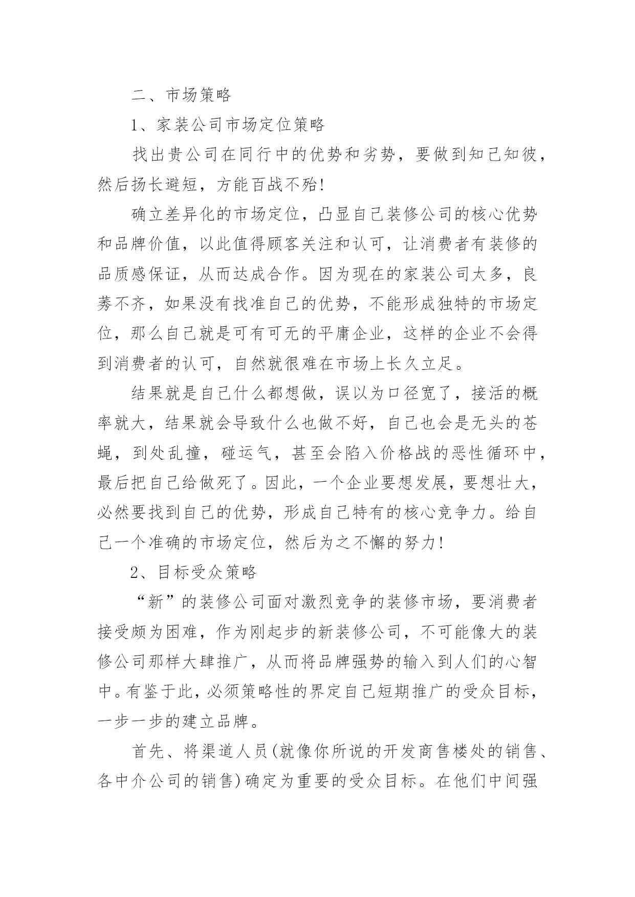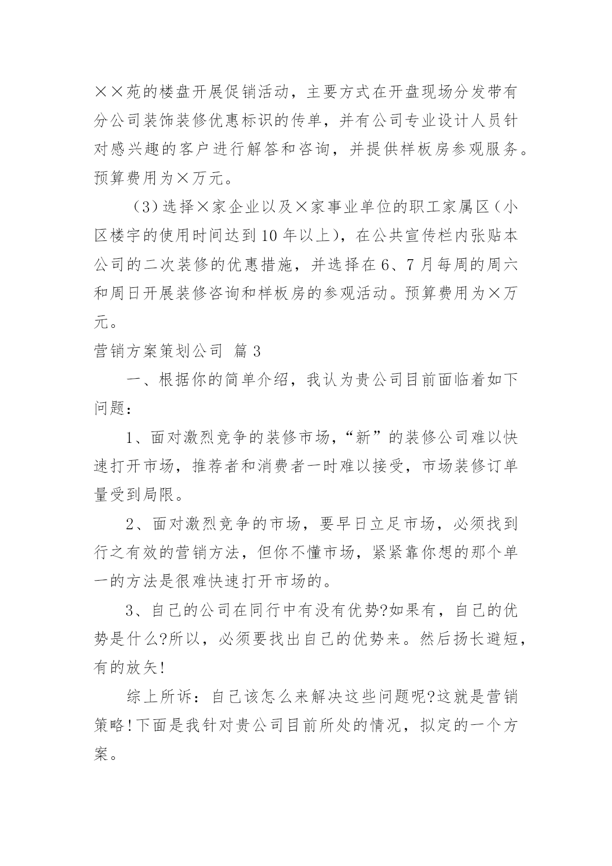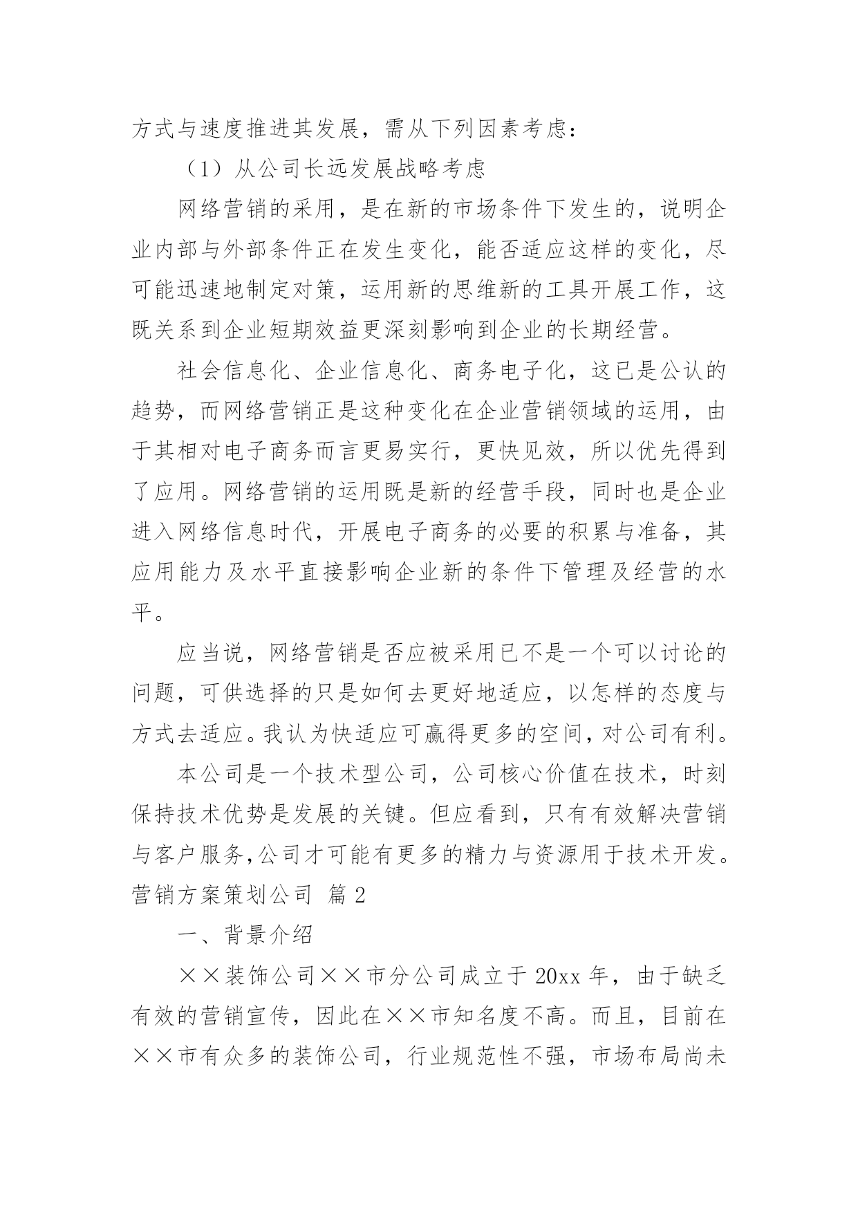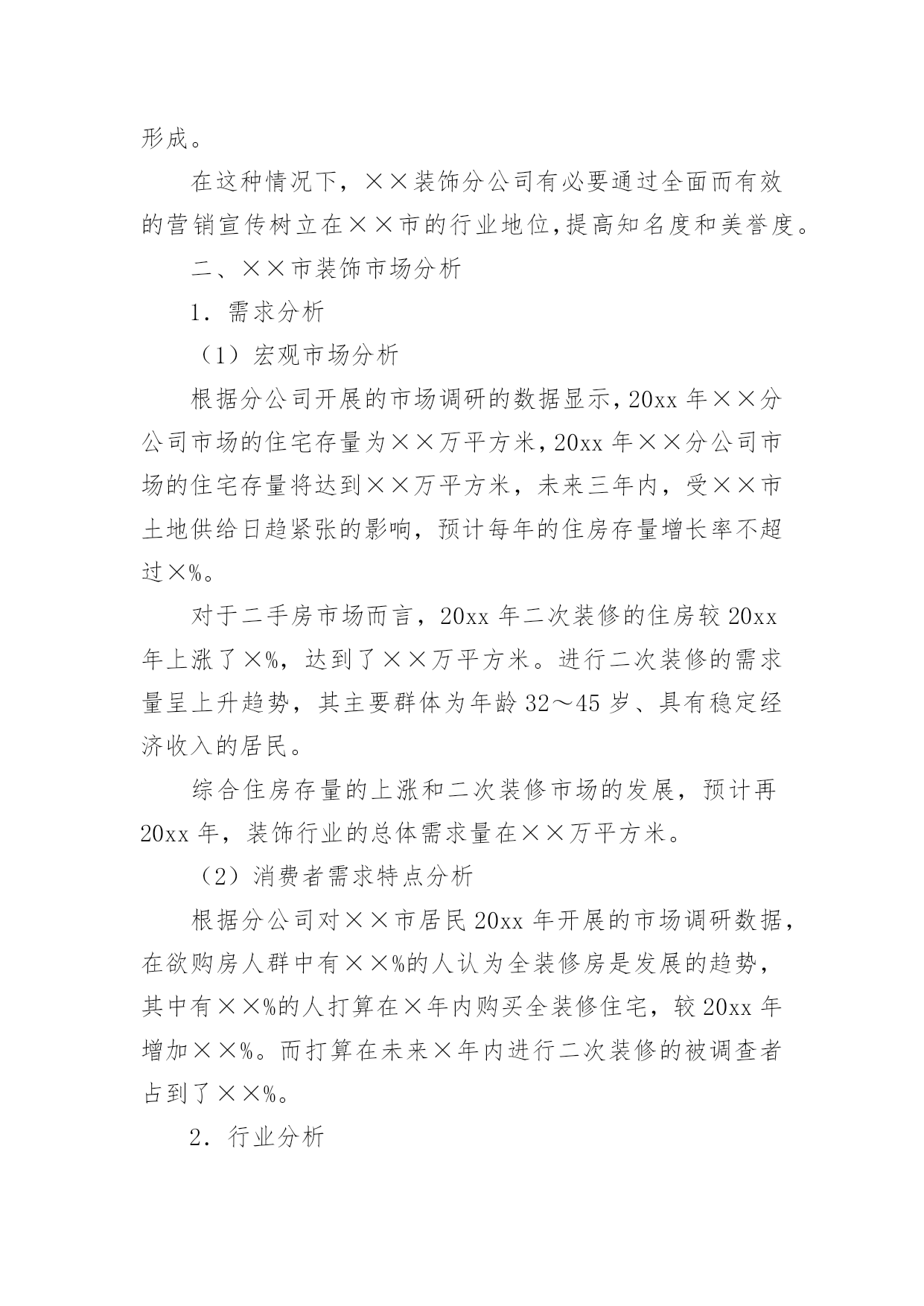 营销方案策划公司营销方案策划公司范文集合7篇为了确保事情或工作扎实开展,时常需要预先制定一份周密的方案,方案属于计划类文书的一种。制定方案需要注意哪些问题呢?以下是小编精心整理的营销方案策划公司7篇,希望对大家有所帮助。营销方案策划公司篇1以下是我对公司开展网络营销工作的一点设想:一、网络营销实施环境初步评估我们在讨论是否实行及如何实行网络营销之前,必须对目前基本现状有一个清醒的认识,这是我们工作的前提。1、公司实行网上营销有一定优势,主要体现在:(1)公司产品为高技术产品。(2)潜在用户主要为技术人员,其网络应用程度较高。(3)产品销售范围广,国内市场乃至国际市常(4)同行业网络营销运用仍处初期,较强的网上竞争对手还未出现。(5)本公司员工计算机及网络应用已具备良好水平。另外,开展网络客户服务也有相当优势,理由:(1)客户服务对公司至关重要,但服务地域广,任务重,成本高。(2)客户服务属技术指导性质,如充分沟通可远距离完成。2、目前可能存在的不足:(1)对网络营销认识程度还较低。未进行深入系统的研究,其应用对本公司及所在行业发展可能带来的影响还缺乏评估。(2)尚未形成明确的网络营销工作思路,没有专业部门或专职经理负责整体实施。(3)虽已建立起企业网站但由于其在表现形式、内容及信息含量、网站功能、网站推广等方面有所不足,尚未发挥其应有的作用。(4)现有的网站管理模式尚不完善,难以适应开展网络营销的要求。如:网站维护、更新方式,isp提供的服务等等。(5)现行的网上反馈信息管理是否高效应重新评估3、结论:1、初步认为网络营销在公司具备可行性,有着良好的发展前景,运用得当可能为公司带来重大贡献,存在由此引发公司经营方式重大变革的可能。2、本公司网络运用水平虽强于一般企业或同行,但领先程度有限,网络营销还处于准备阶段,还未正式起步。保持清醒认识将有利于我们明确目标,改进不足,制定措施,快速推进。二、公司网络营销战略拟定1、制定网络营销战略需考虑的因素:我们应该确立怎样的发展战略,以什么态度,以怎样的方式与速度推进其发展,需从下列因素考虑:(1)从公司长远发展战略考虑网络营销的采用,是在新的市场条件下发生的,说明企业内部与外部条件正在发生变化,能否适应这样的变化,尽可能迅速地制定对策,运用新的思维新的工具开展工作,这既关系到企业短期效益更深刻影响到企业的长期经营。社会信息化、企业信息化、商务电子化,这已是公认的趋势,而网络营销正是这种变化在企业营销领域的运用,由于其相对电子商务而言更易实行,更快见效,所以优先得到了应用。网络营销的运用既是新的经营手段,同时也是企业进入网络信息时代,开展电子商务的必要的积累与准备,其应用能力及水平直接影响企业新的条件下管理及经营的水平。应当说,网络营销是否应被采用已不是一个可以讨论的问题,可供选择的只是如何去更好地适应,以怎样的态度与方式去适应。我认为快适应可赢得更多的空间,对公司有利。本公司是一个技术型公司,公司核心价值在技术,时刻保持技术优势是发展的关键。但应看到,只有有效解决营销与客户服务,公司才可能有更多的精力与资源用于技术开发。营销方案策划公司篇2一、背景介绍××装饰公司××市分公司成立于20xx年,由于缺乏有效的营销宣传,因此在××市知名度不高。而且,目前在××市有众多的装饰公司,行业规范性不强,市场布局尚未形成。在这种情况下,××装饰分公司有必要通过全面而有效的营销宣传树立在××市的行业地位,提高知名度和美誉度。二、××市装饰市场分析1.需求分析(1)宏观市场分析根据分公司开展的市场调研的数据显示,20xx年××分公司市场的住宅存量为××万平方米,20xx年××分公司市场的住宅存量将达到××万平方米,未来三年内,受××市土地供给日趋紧张的影响,预计每年的住房存量增长率不超过×%。对于二手房市场而言,20xx年二次装修的住房较20xx年上涨了×%,达到了××万平方米。进行二次装修的需求量呈上升趋势,其主要群体为年龄32~45岁、具有稳定经济收入的居民。综合住房存量的上涨和二次装修市场的发展,预计再20xx年,装饰行业的总体需求量在××万平方米。(2)消费者需求特点分析根据分公司对××市居民20xx年开展的市场调研数据,在欲购房人群中有××%的人认为全装修房是发展的趋势,其中有××%的人打算在×年内购买全装修住宅,较20xx年增加××%。而打算在未来×年内进行二次装修的被调查者占到了××%。2.行业分析20xx年,××市装饰行业的产值达到×××万元,较20xx年增加××%,其中公装市场产值达到×××万元,家装市场产值达到××万元,设计市场产值达到××万元。3.竞争对手分析从分公司成立的20xx年到20xx年,××市装饰行业的竞争格局没有发生大的变化,××分公司20xx~20xx年的主要竞争