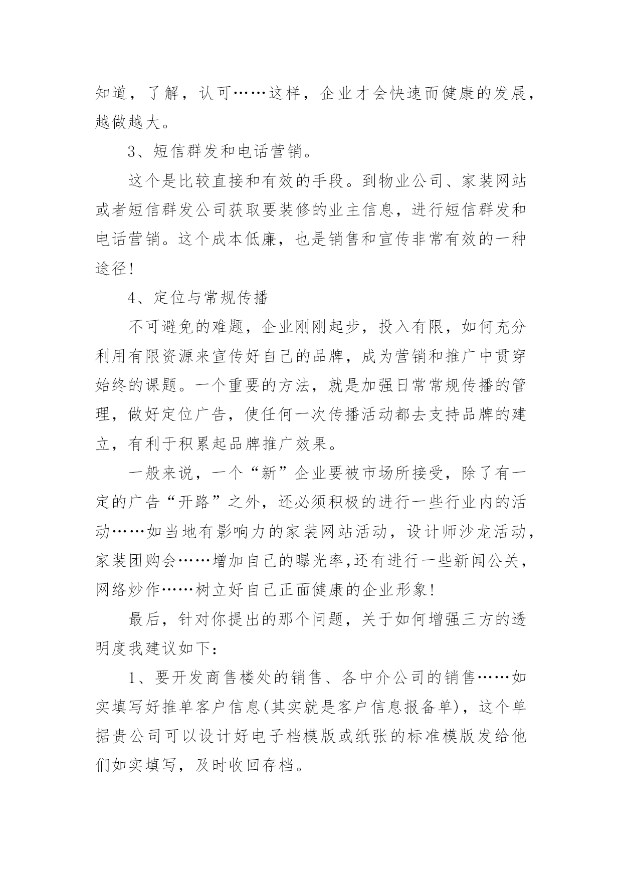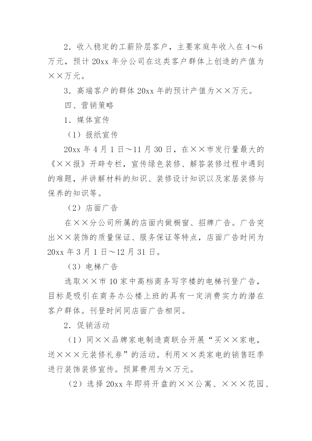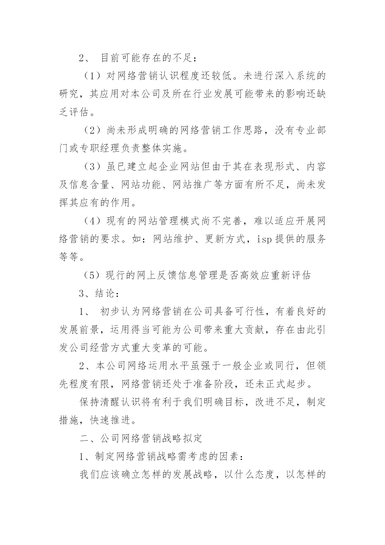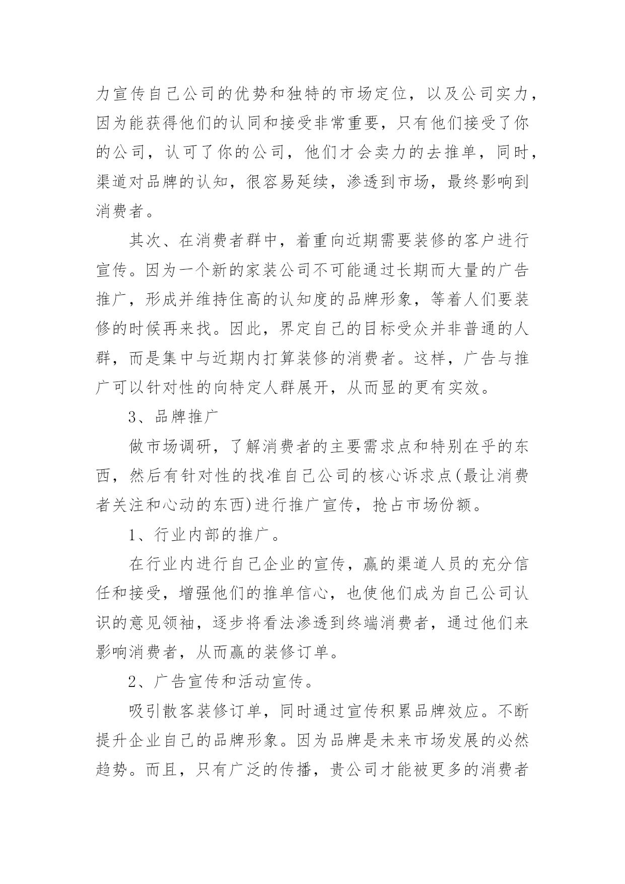 营销方案策划公司营销方案策划公司范文集合7篇为了确保事情或工作扎实开展,时常需要预先制定一份周密的方案,方案属于计划类文书的一种。制定方案需要注意哪些问题呢?以下是小编精心整理的营销方案策划公司7篇,希望对大家有所帮助。营销方案策划公司篇1以下是我对公司开展网络营销工作的一点设想:一、网络营销实施环境初步评估我们在讨论是否实行及如何实行网络营销之前,必须对目前基本现状有一个清醒的认识,这是我们工作的前提。1、公司实行网上营销有一定优势,主要体现在:(1)公司产品为高技术产品。(2)潜在用户主要为技术人员,其网络应用程度较高。(3)产品销售范围广,国内市场乃至国际市常(4)同行业网络营销运用仍处初期,较强的网上竞争对手还未出现。(5)本公司员工计算机及网络应用已具备良好水平。另外,开展网络客户服务也有相当优势,理由:(1)客户服务对公司至关重要,但服务地域广,任务重,成本高。(2)客户服务属技术指导性质,如充分沟通可远距离完成。2、目前可能存在的不足:(1)对网络营销认识程度还较低。未进行深入系统的研究,其应用对本公司及所在行业发展可能带来的影响还缺乏评估。(2)尚未形成明确的网络营销工作思路,没有专业部门或专职经理负责整体实施。(3)虽已建立起企业网站但由于其在表现形式、内容及信息含量、网站功能、网站推广等方面有所不足,尚未发挥其应有的作用。(4)现有的网站管理模式尚不完善,难以适应开展网络营销的要求。如:网站维护、更新方式,isp提供的服务等等。(5)现行的网上反馈信息管理是否高效应重新评估3、结论:1、初步认为网络营销在公司具备可行性,有着良好的发展前景,运用得当可能为公司带来重大贡献,存在由此引发公司经营方式重大变革的可能。2、本公司网络运用水平虽强于一般企业或同行,但领先程度有限,网络营销还处于准备阶段,还未正式起步。保持清醒认识将有利于我们明确目标,改进不足,制定措施,快速推进。二、公司网络营销战略拟定1、制定网络营销战略需考虑的因素:我们应该确立怎样的发展战略,以什么态度,以怎样的方式与速度推进其发展,需从下列因素考虑:(1)从公司长远发展战略考虑网络营销的采用,是在新的市场条件下发生的,说明企业内部与外部条件正在发生变化,能否适应这样的变化,尽可能迅速地制定对策,运用新的思维新的工具开展工作,这既关系到企业短期效益更深刻影响到企业的长期经营。社会信息化、企业信息化、商务电子化,这已是公认的趋势,而网络营销正是这种变化在企业营销领域的运用,由于其相对电子商务而言更易实行,更快见效,所以优先得到了应用。网络营销的运用既是新的经营手段,同时也是企业进入网络信息时代,开展电子商务的必要的积累与准备,其应用能力及水平直接影响企业新的条件下管理及经营的水平。应当说,网络营销是否应被采用已不是一个可以讨论的问题,可供选择的只是如何去更好地适应,以怎样的态度与方式去适应。我认为快适应可赢得更多的空间,对公司有利。本公司是一个技术型公司,公司核心价值在技术,时刻保持技术优势是发展的关键。但应看到,只有有效解决营销与客户服务,公司才可能有更多的精力与资源用于技术开发。营销方案策划公司篇2一、背景介绍××装饰公司××市分公司成立于20xx年,由于缺乏有效的营销宣传,因此在××市知名度不高。而且,目前在××市有众多的装饰公司,行业规范性不强,市场布局尚未形成。在这种情况下,××装饰分公司有必要通过全面而有效的营销宣传树立在××市的行业地位,提高知名度和美誉度。二、××市装饰市场分析1.需求分析(1)宏观市场分析根据分公司开展的市场调研的数据显示,20xx年××分公司市场的住宅存量为××万平方米,20xx年××分公司市场的住宅存量将达到××万平方米,未来三年内,受××市土地供给日趋紧张的影响,预计每年的住房存量增长率不超过×%。对于二手房市场而言,20xx年二次装修的住房较20xx年上涨了×%,达到了××万平方米。进行二次装修的需求量呈上升趋势,其主要群体为年龄32~45岁、具有稳定经济收入的居民。综合住房存量的上涨和二次装修市场的发展,预计再20xx年,装饰行业的总体需求量在××万平方米。(2)消费者需求特点分析根据分公司对××市居民20xx年开展的市场调研数据,在欲购房人群中有××%的人认为全装修房是发展的趋势,其中有××%的人打算在×年内购买全装修住宅,较20xx年增加××%。而打算在未来×年内进行二次装修的被调查者占到了××%。2.行业分析20xx年,××市装饰行业的产值达到×××万元,较20xx年增加××%,其中公装市场产值达到×××万元,家装市场产值达到××万元,设计市场产值达到××万元。3.竞争对手分析从分公司成立的20xx年到20xx年,××市装饰行业的竞争格局没有发生大的变化,××分公司20xx~20xx年的主要竞争