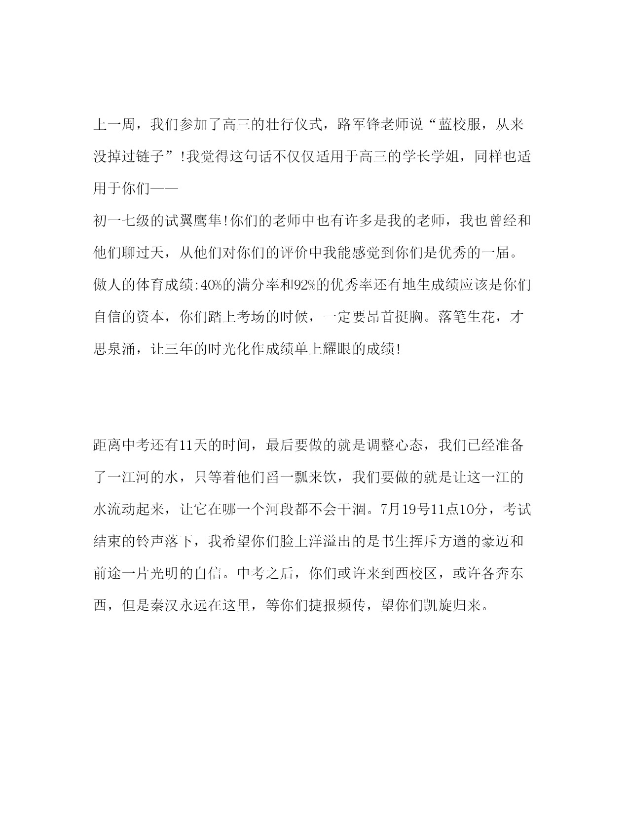 PAGE此资料由网络收集而来,如有侵权请告知上传者立即删除。资料共分享,我们负责传递知识。演讲稿:中考祝福亲爱的xx的同学们,我是xx班的xxx,同时也是xxx班的xx。记得去年的六月底,我们就站在你们现在的位置,全校的师生给我们壮行,当时说“十五年饮冰,难凉热血”。时光荏苒,春秋一度,今天,我站在这里,给站在操场中间的你们致以最诚挚的祝福,希望秦汉学子在一次又一次的战役中大捷而归,所向披靡!三年的时间很快,我们见过你们还没摘下红领巾时的懵懂,也看过你们在运动场上挥洒汗水的青春飞扬,在考场奋笔疾书的书生意气,今天,你们在这里要面对的是人生的第一场大考,老师应该已经无数次的告诉你们要“沉着冷静,放平心态”,你们要坚信,秦汉三年的教导足够让你们有应对中考的知识储备和信心。作为一个“过来人”,我想说的是,不要被牌子上倒数的数字吓倒,不要为考场门口乌压压的人震慑。要知道,秦汉中学给我们的绝不仅仅是知识,更有“泰山崩于前而色不变”的魄力。“视野深度审美情怀”绝不仅仅是写进作文里凑字数的工具,“怀一份平常心,做一份非凡事”才应该是秦汉学子的状态。上一周,我们参加了高三的壮行仪式,路军锋老师说“蓝校服,从来没掉过链子”!我觉得这句话不仅仅适用于高三的学长学姐,同样也适用于你们——初一七级的试翼鹰隼!你们的老师中也有许多是我的老师,我也曾经和他们聊过天,从他们对你们的评价中我能感觉到你们是优秀的一届。傲人的体育成绩:40%的满分率和92%的优秀率还有地生成绩应该是你们自信的资本,你们踏上考场的时候,一定要昂首挺胸。落笔生花,才思泉涌,让三年的时光化作成绩单上耀眼的成绩!距离中考还有11天的时间,最后要做的就是调整心态,我们已经准备了一江河的水,只等着他们舀一瓢来饮,我们要做的就是让这一江的水流动起来,让它在哪一个河段都不会干涸。7月19号11点10分,考试结束的铃声落下,我希望你们脸上洋溢出的是书生挥斥方遒的豪迈和前途一片光明的自信。中考之后,你们或许来到西校区,或许各奔东西,但是秦汉永远在这里,等你们捷报频传,望你们凯旋归来。