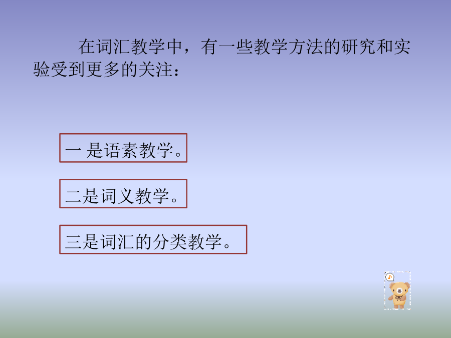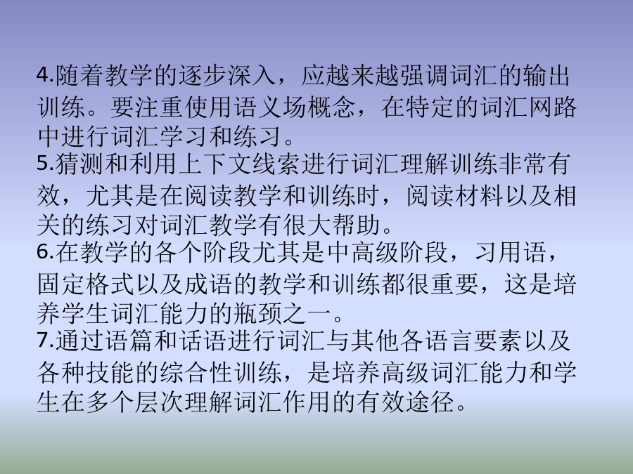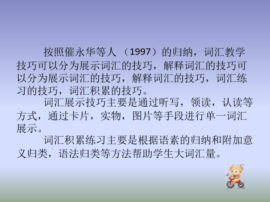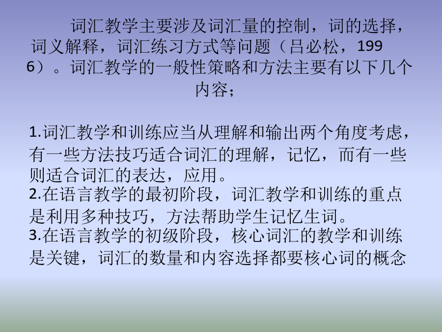 词汇是语言表达的前提,词汇知识是语言使用者语言能力的一个重要组成部分。同样,词汇教学也是语言教学的一个重要的基础,大部分的课堂教学都是建立在词汇教学基础之上的。词汇教学主要涉及词汇量的控制,词的选择,词义解释,词汇练习方式等问题(吕必松,1996)。词汇教学的一般性策略和方法主要有以下几个内容;4.随着教学的逐步深入,应越来越强调词汇的输出训练。要注重使用语义场概念,在特定的词汇网路中进行词汇学习和练习。5.猜测和利用上下文线索进行词汇理解训练非常有效,尤其是在阅读教学和训练时,阅读材料以及相关的练习对词汇教学有很大帮助。6.在教学的各个阶段尤其是中高级阶段,习用语,固定格式以及成语的教学和训练都很重要,这是培养学生词汇能力的瓶颈之一。7.通过语篇和话语进行词汇与其他各语言要素以及各种技能的综合性训练,是培养高级词汇能力和学生在多个层次理解词汇作用的有效途径。在词汇教学中,有一些教学方法的研究和实验受到更多的关注:按照催永华等人(1997)的归纳,词汇教学技巧可以分为展示词汇的技巧,解释词汇的技巧可以分为展示词汇的技巧,解释词汇的技巧,词汇练习的技巧,词汇积累的技巧。词汇展示技巧主要是通过听写,领读,认读等方式,通过卡片,实物,图片等手段进行单一词汇展示。词汇积累练习主要是根据语素的归纳和附加意义归类,语法归类等方法帮助学生大词汇量。