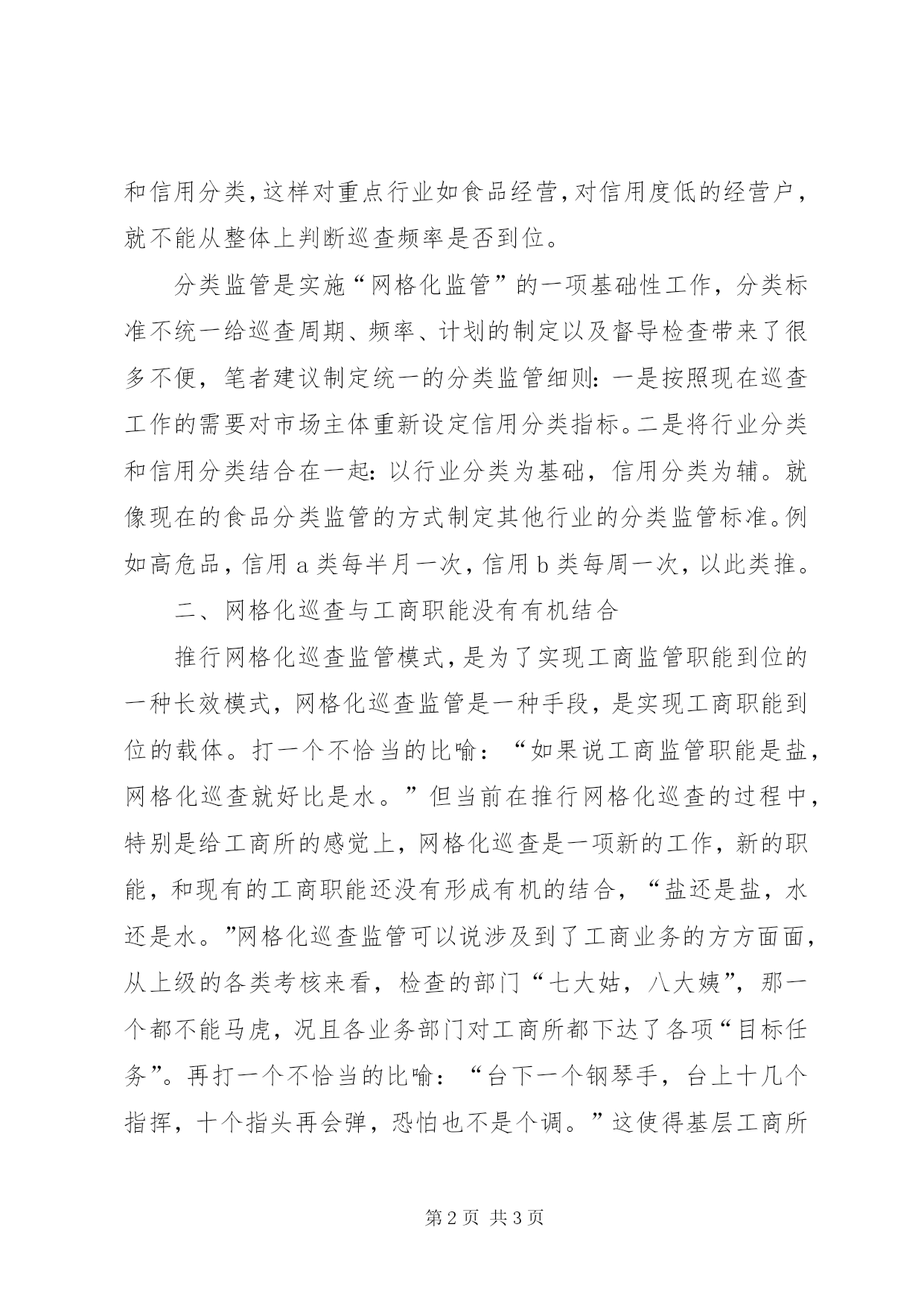 第PAGE\*Arabic\*MERGEFORMAT3页共NUMPAGES\*MERGEFORMAT3页工商所网格化巡查调研报告随着“两费”停收和职能的深化,工商部门面临着新的发展机遇。网格化巡查管理是进一步适应深化职能,强化责任机制,实施有效管理的重要举措。工商所作为执行单位,在当前落实“网格化”巡查模式的过程中还存在着一些亟需解决的问题,比较突出的有以下两个方面:一、分类监管的制定标准不统一根据《××市工商局市场巡查工作规范》(以下简称《规范》)规定,对市场实行行业分类,对市场主体实行信用分类。实际工作中,一般的市场主体在网上综合业务系统中通过_项信用指标自动分类(守信、警告、失信、严重失性),自动升降级;商品市场和食品经营主体实行信用指标人工采集、网上标注、自动升降级(a、b、c、d)。分类方式混乱不一:一是《规范》仅仅只对市场进行分类,而对市场主体没有行业分类。并且在综合业务系统中除了食品经营类外,其他高危商品类、生活资料类、生产要素类没有这样的分类识别方式。二是一般的市场主体的_项信用指标远远不能适应现在分类监管的需要。如第_项“验照不合格”,自动降级为“失信”。“验照不合格”有多种原因,如果仅仅是由于登记事项的不相符,定为“失信”显然不适宜。三是对巡查工作的督导检查,除了实地抽查外,主要的还是通过网上检查。而综合业务系统的“巡查查询”中同样也没有行业分类和信用分类,这样对重点行业如食品经营,对信用度低的经营户,就不能从整体上判断巡查频率是否到位。分类监管是实施“网格化监管”的一项基础性工作,分类标准不统一给巡查周期、频率、计划的制定以及督导检查带来了很多不便,笔者建议制定统一的分类监管细则:一是按照现在巡查工作的需要对市场主体重新设定信用分类指标。二是将行业分类和信用分类结合在一起:以行业分类为基础,信用分类为辅。就像现在的食品分类监管的方式制定其他行业的分类监管标准。例如高危品,信用a类每半月一次,信用b类每周一次,以此类推。二、网格化巡查与工商职能没有有机结合推行网格化巡查监管模式,是为了实现工商监管职能到位的一种长效模式,网格化巡查监管是一种手段,是实现工商职能到位的载体。打一个不恰当的比喻:“如果说工商监管职能是盐,网格化巡查就好比是水。”但当前在推行网格化巡查的过程中,特别是给工商所的感觉上,网格化巡查是一项新的工作,新的职能,和现有的工商职能还没有形成有机的结合,“盐还是盐,水还是水。”网格化巡查监管可以说涉及到了工商业务的方方面面,从上级的各类考核来看,检查的部门“七大姑,八大姨”,那一个都不能马虎,况且各业务部门对工商所都下达了各项“目标任务”。再打一个不恰当的比喻:“台下一个钢琴手,台上十几个指挥,十个指头再会弹,恐怕也不是个调。”这使得基层工商所忙于应付、疲于奔命,也是影响监管职能到位的一个重要原因。同一监管工作往往因不同业务部门下达任务的角度、时间以及侧重点的差异,造成基层工商所的重复劳动,反复上报,增加了基层工作的负担。笔者有一个大胆的想法。能否将现有的内部职能机构划分为登记、监管、公平交易、消保(_____)四大块。登记部门负责行政审批,监管部门负责综合监管,公平交易部门负责办案,消保部门负责维权。另外设置一个监管中心,内按照市场、商标、广告、合同、登记及专项整治、创建等涉及监管等一系列监管职能设置岗位,由专人负责。这样的机构和岗位设置,既保证了统一指挥、协调一致,又能做到了明确分工、责任到人。制定一个计划、拿出一套方案、发出一个声音,不至于使基层所就同一项工作因涉及到不同部门,上午收到这个部门的电子邮件,下午又要跑到那个部门开会,应接不暇,不知所措。