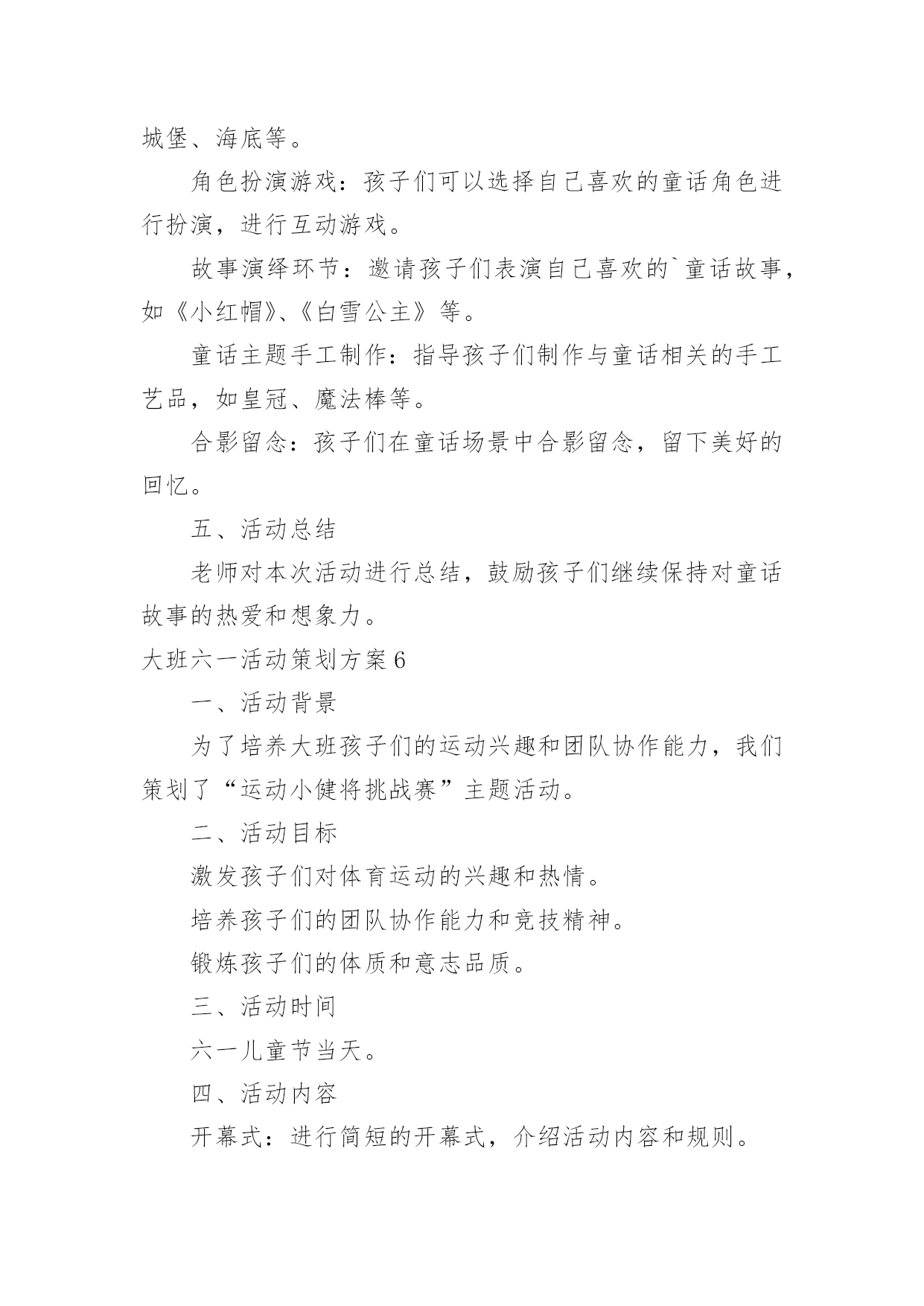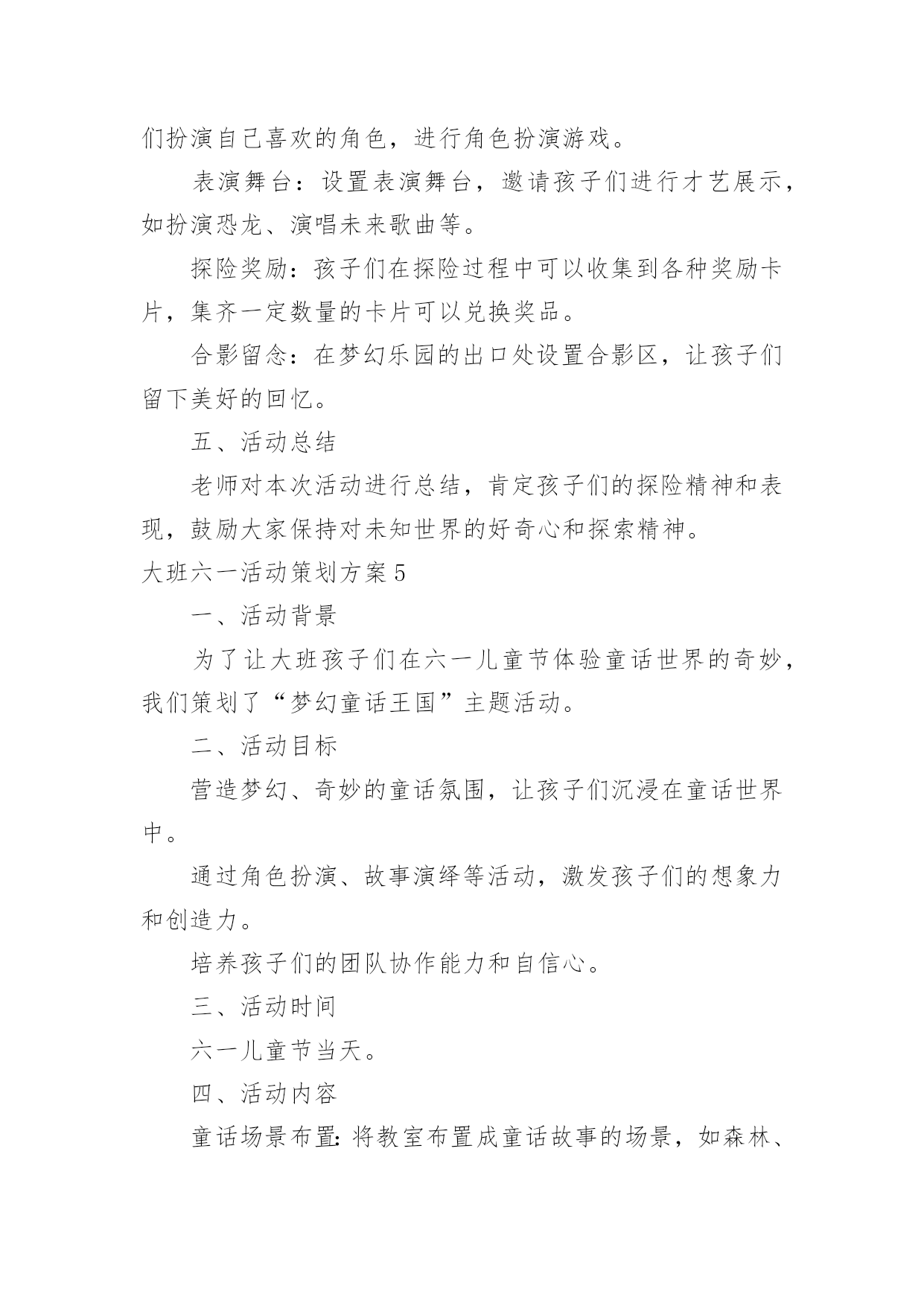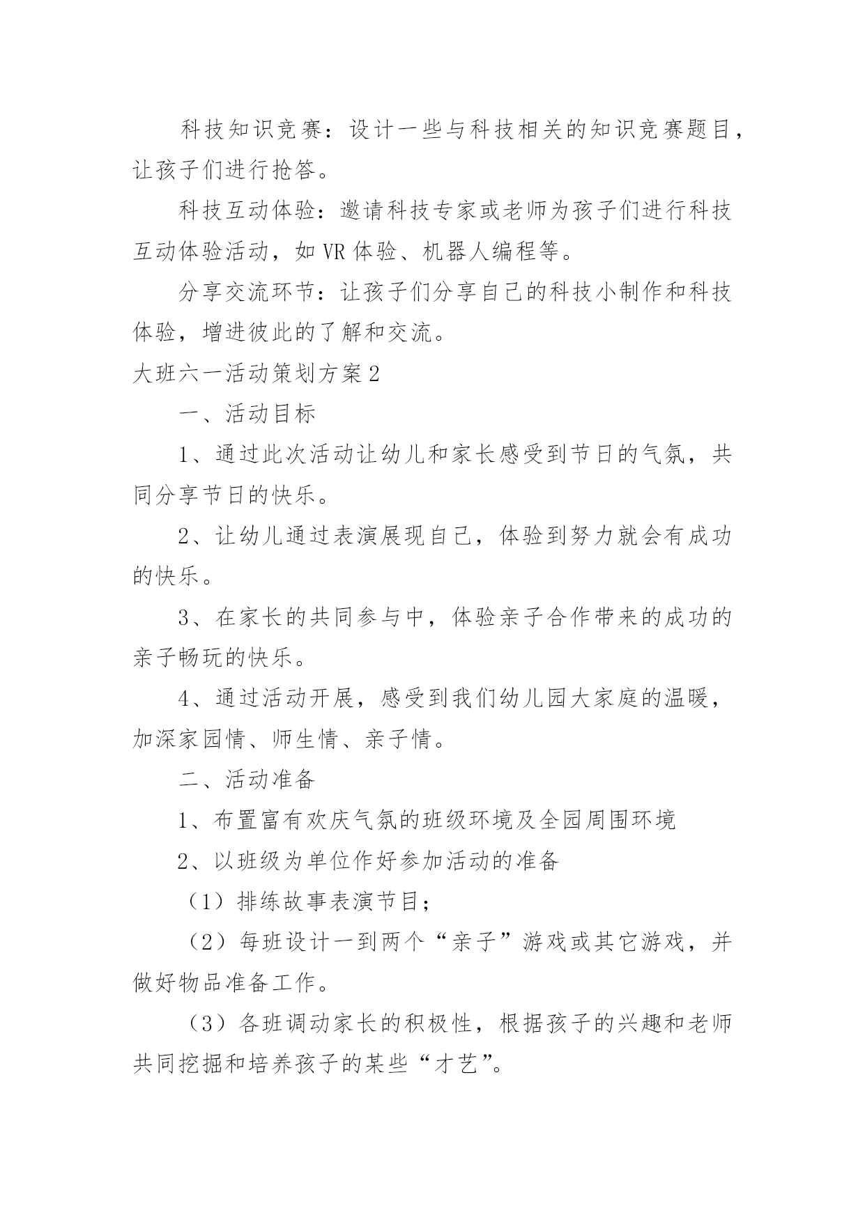 大班六一活动策划方案大班六一活动策划方案为保证事情或工作高起点、高质量、高水平开展,就需要我们事先制定方案,方案是阐明行动的时间,地点,目的,预期效果,预算及方法等的书面计划。我们应该怎么制定方案呢?以下是小编收集整理的大班六一活动策划方案,供大家参考借鉴,希望可以帮助到有需要的朋友。大班六一活动策划方案1一、活动背景随着科技的不断发展,为了让大班孩子们接触和了解科技知识,我们策划了“科技小达人探索营”主题活动。二、活动目标培养孩子们对科技的兴趣和好奇心。让孩子们了解基本的科技知识和应用。培养孩子们的动手能力和创新思维。三、活动时间六一儿童节当天。四、活动内容科技展览:展示一些简单的科技作品和实验,让孩子们了解科技的应用和原理。科技小制作:指导孩子们制作一些简单的`科技小制作,如纸飞机、简易电话等。科技知识竞赛:设计一些与科技相关的知识竞赛题目,让孩子们进行抢答。科技互动体验:邀请科技专家或老师为孩子们进行科技互动体验活动,如VR体验、机器人编程等。分享交流环节:让孩子们分享自己的科技小制作和科技体验,增进彼此的了解和交流。大班六一活动策划方案2一、活动目标1、通过此次活动让幼儿和家长感受到节日的气氛,共同分享节日的快乐。2、让幼儿通过表演展现自己,体验到努力就会有成功的快乐。3、在家长的共同参与中,体验亲子合作带来的成功的亲子畅玩的快乐。4、通过活动开展,感受到我们幼儿园大家庭的温暖,加深家园情、师生情、亲子情。二、活动准备1、布置富有欢庆气氛的班级环境及全园周围环境2、以班级为单位作好参加活动的准备(1)排练故事表演节目;(2)每班设计一到两个“亲子”游戏或其它游戏,并做好物品准备工作。(3)各班调动家长的积极性,根据孩子的兴趣和老师共同挖掘和培养孩子的某些“才艺”。3、准备活动奖品和礼品。4、做好主持工作准备。5、利用板报向教师、家长发出倡议和向每个幼儿的家长发出倡议书,引起家长的重视,争取全体教师和家长对此次庆祝活动的配合与支持。三、活动时间及场地安排xx月xx日:14:20――15:50亲子游园活动。地点:各班教室及户外活动场地。xx月xx日:7:50—8:30亲子活动签名9:00――10:30幼儿六一文艺汇演15:00—15:30教师童话剧表演地点:一楼多功能厅四、活动内容与要求活动一:亲子畅玩活动目的`:1、丰富孩子的生活,融洽师生关系,增进家园互动。2、培养孩子们的竞争意识、合作意识,参与意识,让孩子们的各种技能技巧得到锻炼。3、让孩子们过了一个愉快又有意义的儿童节。要求:1、幼儿及家长在活动场合中遵守活动规则。2、在游戏过程中家长要关注幼儿的安全。3、注意保持活动场所的卫生清洁。4、所有教职员工做好会场的卫生工作。活动二:六一文艺汇演1、7:50—8:30亲子走红毯,签名墙签名。2、观看六一文艺会演,地点:一楼多功能厅。根据各班上报的节目安排出场顺序。以幼儿舞蹈和童话剧等形式呈现。具体的节目单另行下发。大三班《胖嘟嘟和坐火车的小老鼠》舞蹈小一班《红色娘子军》舞蹈中一班《迷路的小蚂蚁》童话剧小二班《小鸡小鸡》舞蹈中二班《迷彩酷娃》舞蹈小三班《环保服装秀》走秀大一班《跳跳跳》舞蹈宝宝班《生日最快乐》舞蹈小一班《低碳贝贝》舞蹈中一班《可爱娃娃》舞蹈小二班《老酒谣》舞蹈大二班《三字经》舞蹈小三班《我爱洗澡》舞蹈中二班《小蝌蚪找妈妈》情景剧小一班《芭蕾组合》舞蹈舞蹈队《稻草人》舞蹈活动三:教师童话剧表演6月1号下午15:00—15:30,幼儿观看教师童话剧表演小班年段《没有牙齿的大老虎》xxx、xxx、xxx、xxx、xxx、xxx、xxx、xxx、xxx中班年段《白雪公主和七个小矮人》xxx、xxx、xxx、xxx、xxx、xxx、xxx、xxx、xxx大班年段《小熊请客》xxx、xxx、xxx、xxx、xxx、xxx、xxx、xxx、xxx大班六一活动策划方案3一、活动背景为了让大班的孩子们度过一个充满乐趣和创意的六一儿童节,我们策划了“童话王国探险日”活动。通过模拟童话世界的场景和任务,激发孩子们的想象力和创造力,让他们在快乐中学习和成长。二、活动目标增进孩子们对童话故事的了解和喜爱。培养孩子们的.团队合作和解决问题的能力。激发孩子们的创造力和想象力。三、活动内容童话场景搭建:在活动现场搭建多个童话场景,如小红帽的森林、灰姑娘的城堡等,让孩子们身临其境地感受童话世界。角色扮演:孩子们可以选择自己喜欢的童话角色进行扮演,如白雪公主、彼得兔等,增加活动的趣味性和互动性。探险任务:设置一系列与童话相关的探险任务,如寻找魔法棒、解救被困的公主等,需要孩子们合作完成,锻炼他们的团队协作和解决问题的能力。创意手工:设置手工区,提供材料让孩子们制作与童话相关的手工作品,如制作小红帽的篮子、灰姑娘的水晶鞋等,激发他们的创造力