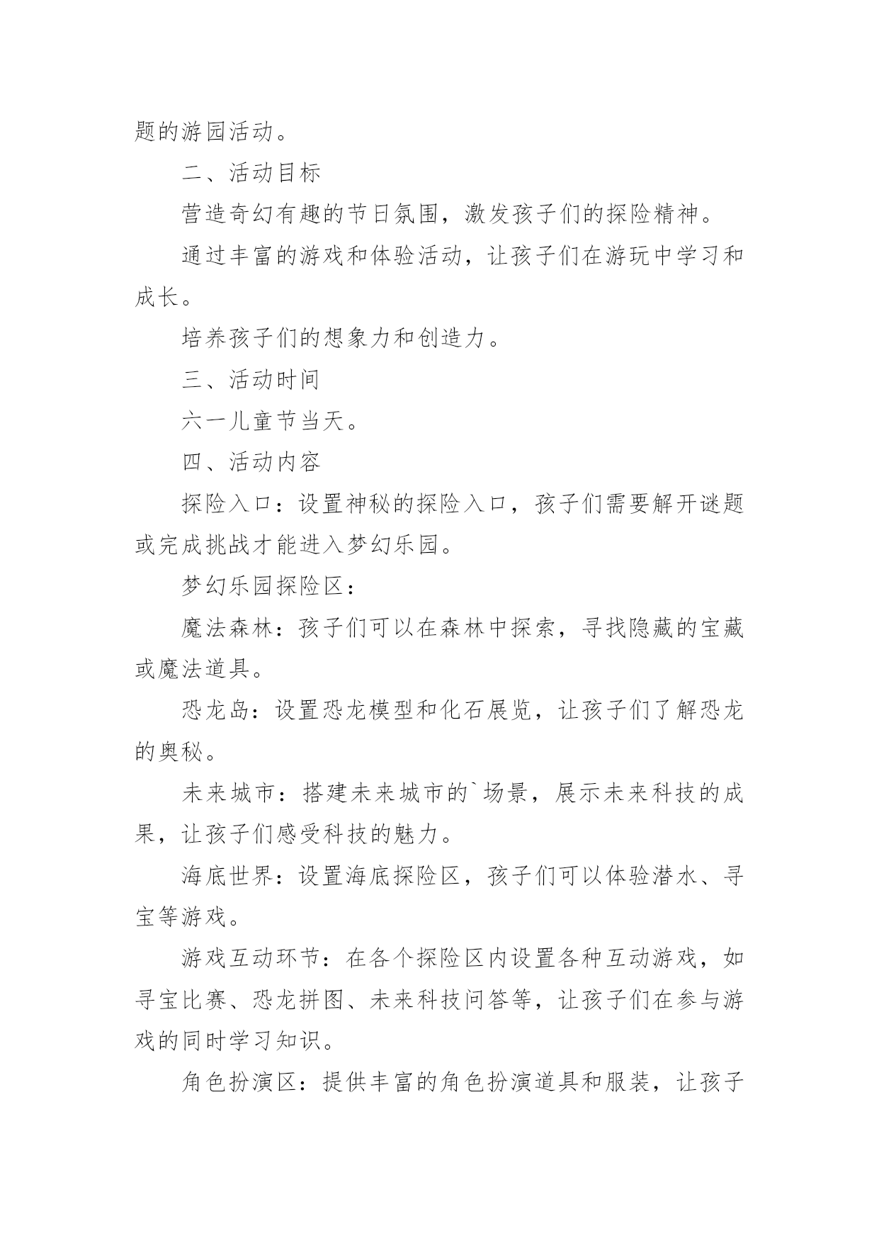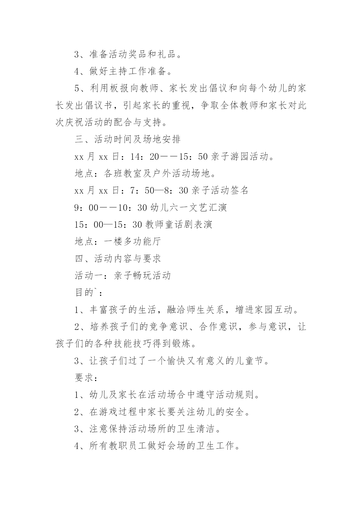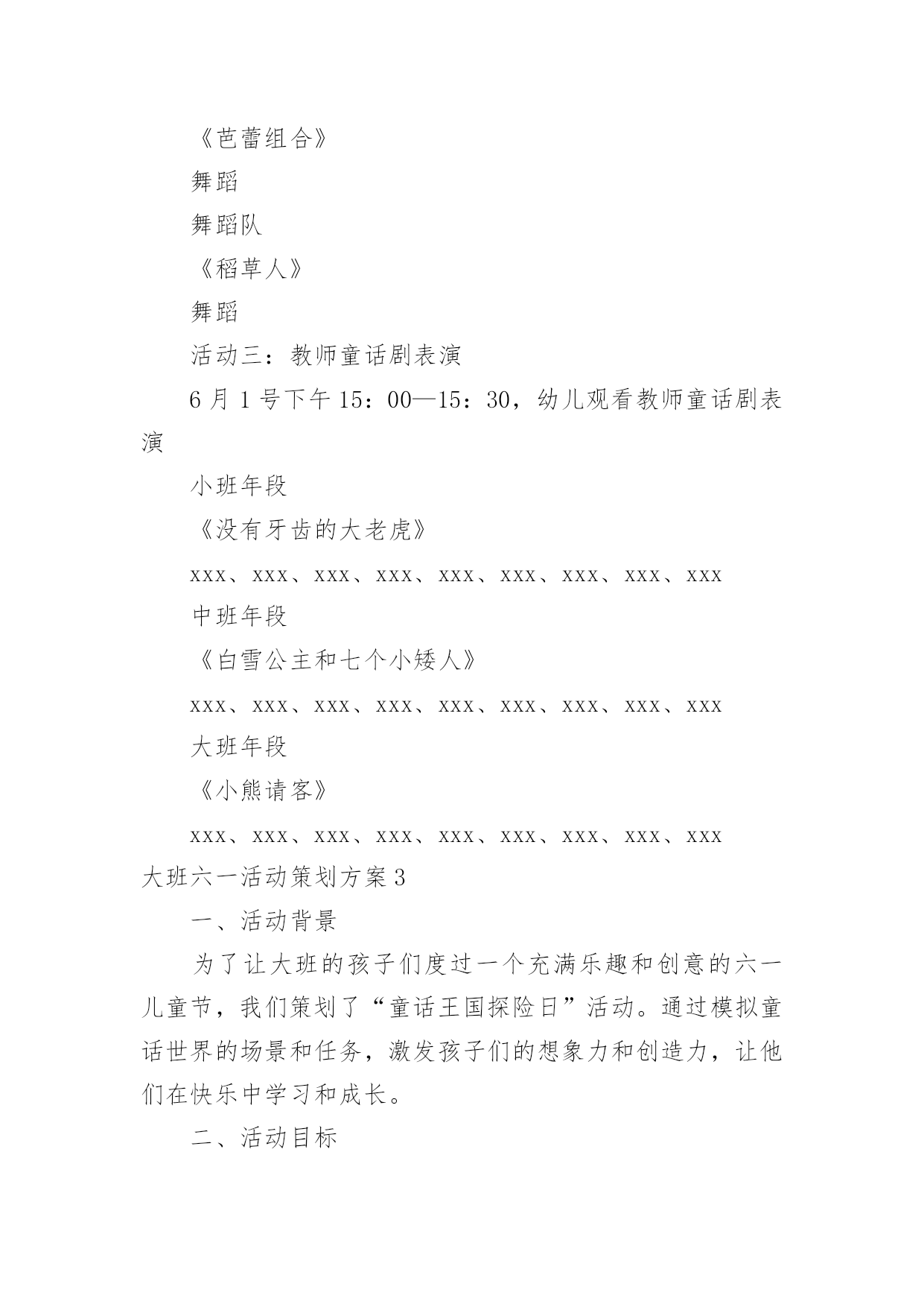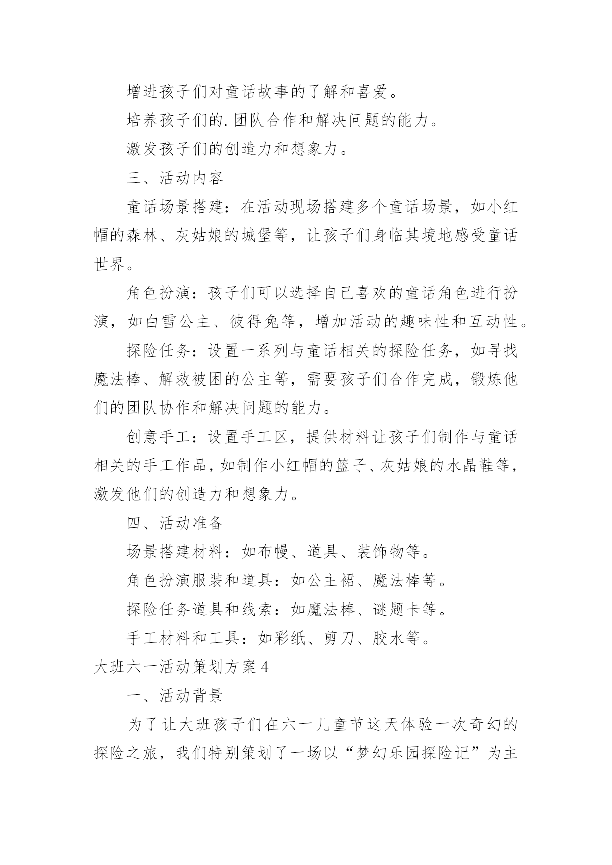 大班六一活动策划方案大班六一活动策划方案为保证事情或工作高起点、高质量、高水平开展,就需要我们事先制定方案,方案是阐明行动的时间,地点,目的,预期效果,预算及方法等的书面计划。我们应该怎么制定方案呢?以下是小编收集整理的大班六一活动策划方案,供大家参考借鉴,希望可以帮助到有需要的朋友。大班六一活动策划方案1一、活动背景随着科技的不断发展,为了让大班孩子们接触和了解科技知识,我们策划了“科技小达人探索营”主题活动。二、活动目标培养孩子们对科技的兴趣和好奇心。让孩子们了解基本的科技知识和应用。培养孩子们的动手能力和创新思维。三、活动时间六一儿童节当天。四、活动内容科技展览:展示一些简单的科技作品和实验,让孩子们了解科技的应用和原理。科技小制作:指导孩子们制作一些简单的`科技小制作,如纸飞机、简易电话等。科技知识竞赛:设计一些与科技相关的知识竞赛题目,让孩子们进行抢答。科技互动体验:邀请科技专家或老师为孩子们进行科技互动体验活动,如VR体验、机器人编程等。分享交流环节:让孩子们分享自己的科技小制作和科技体验,增进彼此的了解和交流。大班六一活动策划方案2一、活动目标1、通过此次活动让幼儿和家长感受到节日的气氛,共同分享节日的快乐。2、让幼儿通过表演展现自己,体验到努力就会有成功的快乐。3、在家长的共同参与中,体验亲子合作带来的成功的亲子畅玩的快乐。4、通过活动开展,感受到我们幼儿园大家庭的温暖,加深家园情、师生情、亲子情。二、活动准备1、布置富有欢庆气氛的班级环境及全园周围环境2、以班级为单位作好参加活动的准备(1)排练故事表演节目;(2)每班设计一到两个“亲子”游戏或其它游戏,并做好物品准备工作。(3)各班调动家长的积极性,根据孩子的兴趣和老师共同挖掘和培养孩子的某些“才艺”。3、准备活动奖品和礼品。4、做好主持工作准备。5、利用板报向教师、家长发出倡议和向每个幼儿的家长发出倡议书,引起家长的重视,争取全体教师和家长对此次庆祝活动的配合与支持。三、活动时间及场地安排xx月xx日:14:20――15:50亲子游园活动。地点:各班教室及户外活动场地。xx月xx日:7:50—8:30亲子活动签名9:00――10:30幼儿六一文艺汇演15:00—15:30教师童话剧表演地点:一楼多功能厅四、活动内容与要求活动一:亲子畅玩活动目的`:1、丰富孩子的生活,融洽师生关系,增进家园互动。2、培养孩子们的竞争意识、合作意识,参与意识,让孩子们的各种技能技巧得到锻炼。3、让孩子们过了一个愉快又有意义的儿童节。要求:1、幼儿及家长在活动场合中遵守活动规则。2、在游戏过程中家长要关注幼儿的安全。3、注意保持活动场所的卫生清洁。4、所有教职员工做好会场的卫生工作。活动二:六一文艺汇演1、7:50—8:30亲子走红毯,签名墙签名。2、观看六一文艺会演,地点:一楼多功能厅。根据各班上报的节目安排出场顺序。以幼儿舞蹈和童话剧等形式呈现。具体的节目单另行下发。大三班《胖嘟嘟和坐火车的小老鼠》舞蹈小一班《红色娘子军》舞蹈中一班《迷路的小蚂蚁》童话剧小二班《小鸡小鸡》舞蹈中二班《迷彩酷娃》舞蹈小三班《环保服装秀》走秀大一班《跳跳跳》舞蹈宝宝班《生日最快乐》舞蹈小一班《低碳贝贝》舞蹈中一班《可爱娃娃》舞蹈小二班《老酒谣》舞蹈大二班《三字经》舞蹈小三班《我爱洗澡》舞蹈中二班《小蝌蚪找妈妈》情景剧小一班《芭蕾组合》舞蹈舞蹈队《稻草人》舞蹈活动三:教师童话剧表演6月1号下午15:00—15:30,幼儿观看教师童话剧表演小班年段《没有牙齿的大老虎》xxx、xxx、xxx、xxx、xxx、xxx、xxx、xxx、xxx中班年段《白雪公主和七个小矮人》xxx、xxx、xxx、xxx、xxx、xxx、xxx、xxx、xxx大班年段《小熊请客》xxx、xxx、xxx、xxx、xxx、xxx、xxx、xxx、xxx大班六一活动策划方案3一、活动背景为了让大班的孩子们度过一个充满乐趣和创意的六一儿童节,我们策划了“童话王国探险日”活动。通过模拟童话世界的场景和任务,激发孩子们的想象力和创造力,让他们在快乐中学习和成长。二、活动目标增进孩子们对童话故事的了解和喜爱。培养孩子们的.团队合作和解决问题的能力。激发孩子们的创造力和想象力。三、活动内容童话场景搭建:在活动现场搭建多个童话场景,如小红帽的森林、灰姑娘的城堡等,让孩子们身临其境地感受童话世界。角色扮演:孩子们可以选择自己喜欢的童话角色进行扮演,如白雪公主、彼得兔等,增加活动的趣味性和互动性。探险任务:设置一系列与童话相关的探险任务,如寻找魔法棒、解救被困的公主等,需要孩子们合作完成,锻炼他们的团队协作和解决问题的能力。创意手工:设置手工区,提供材料让孩子们制作与童话相关的手工作品,如制作小红帽的篮子、灰姑娘的水晶鞋等,激发他们的创造力