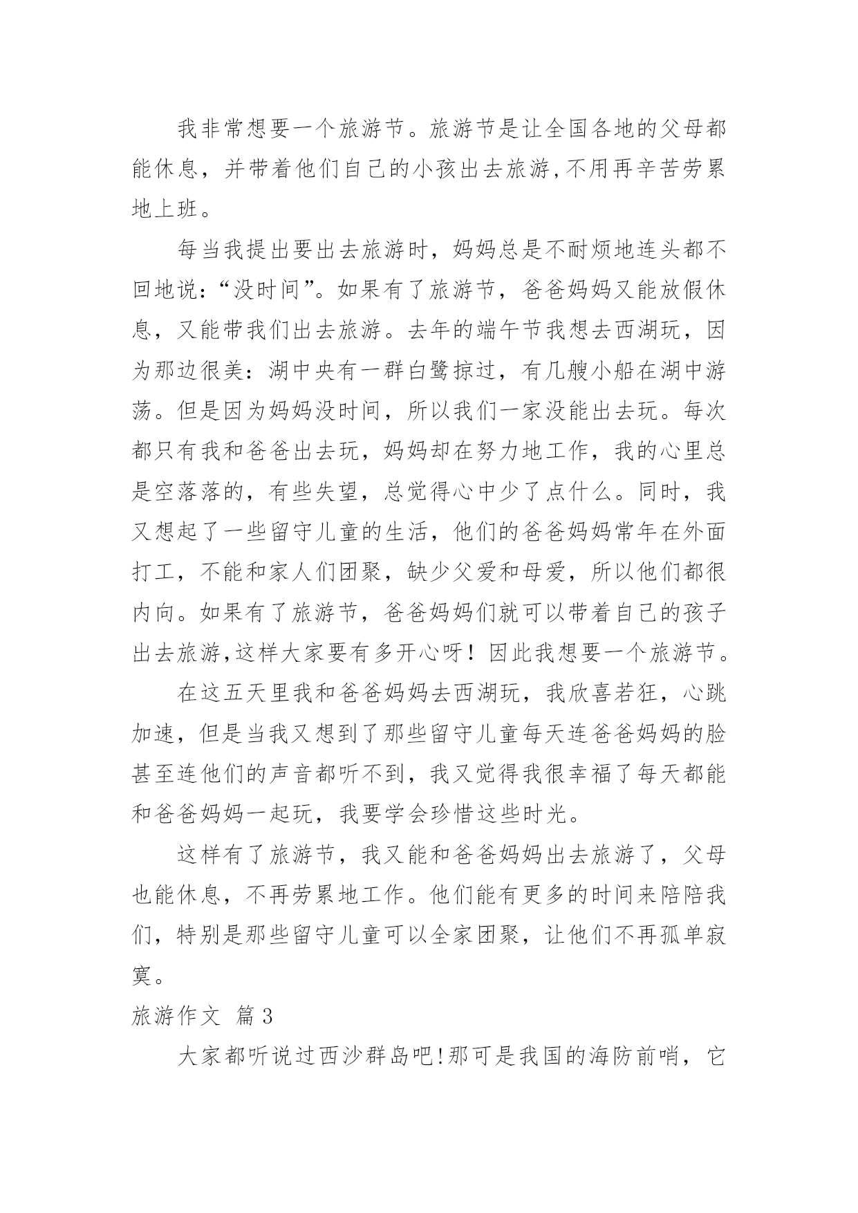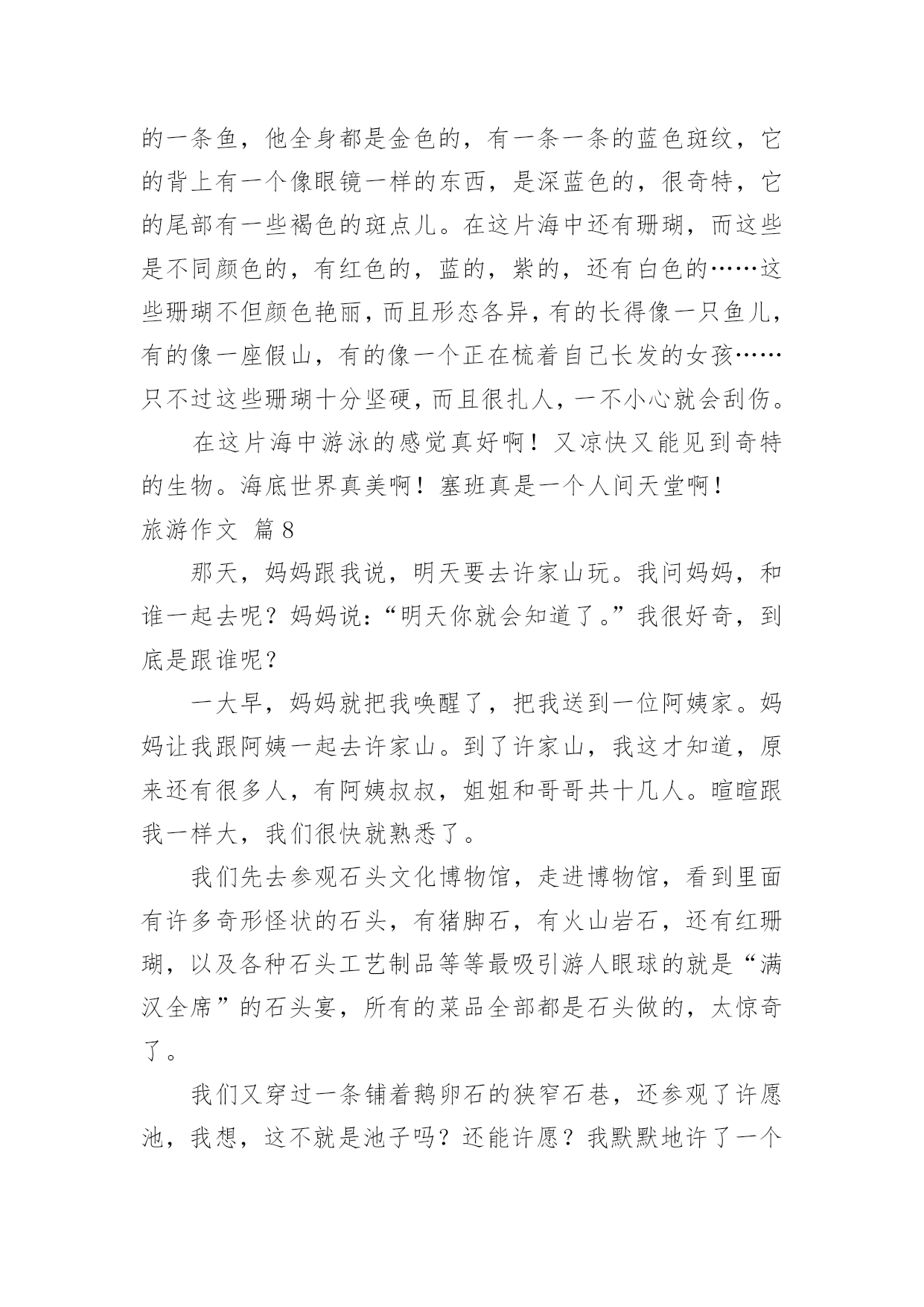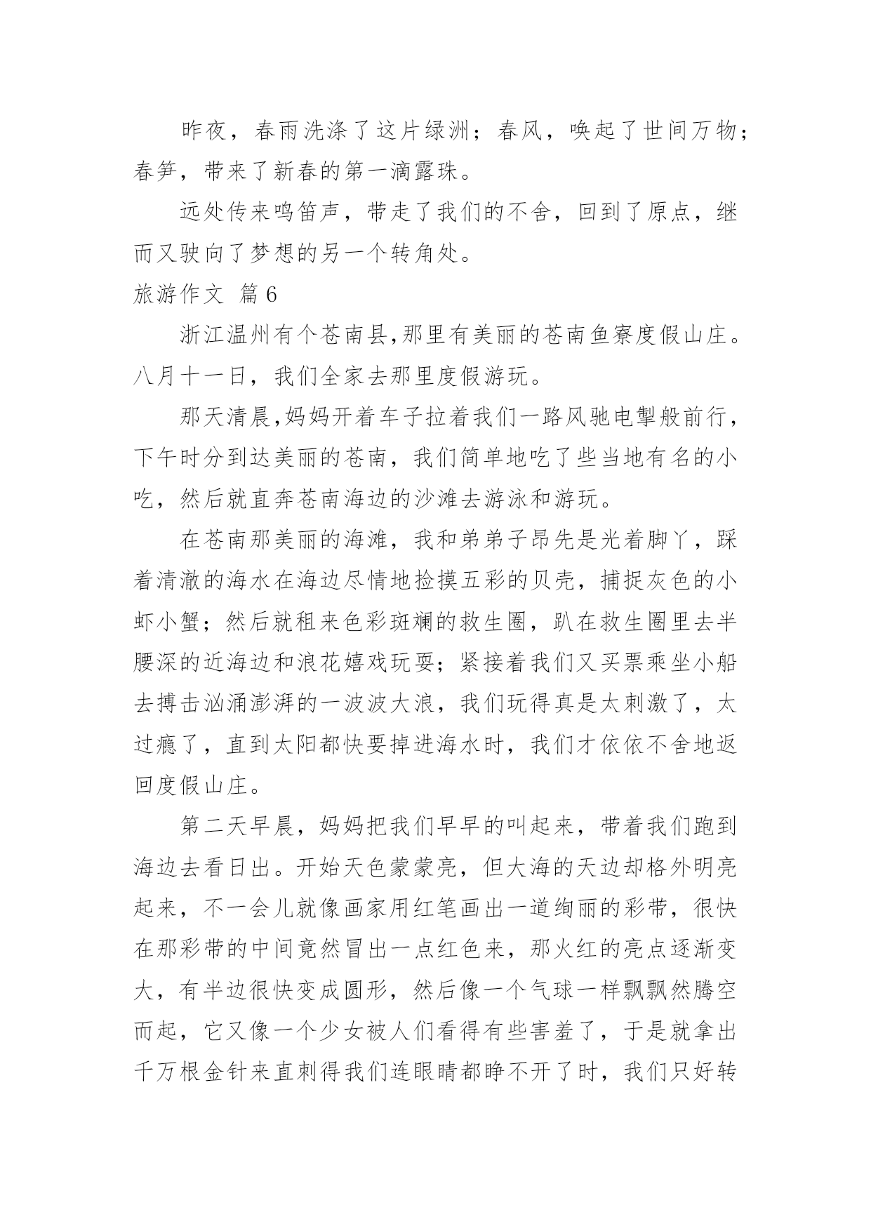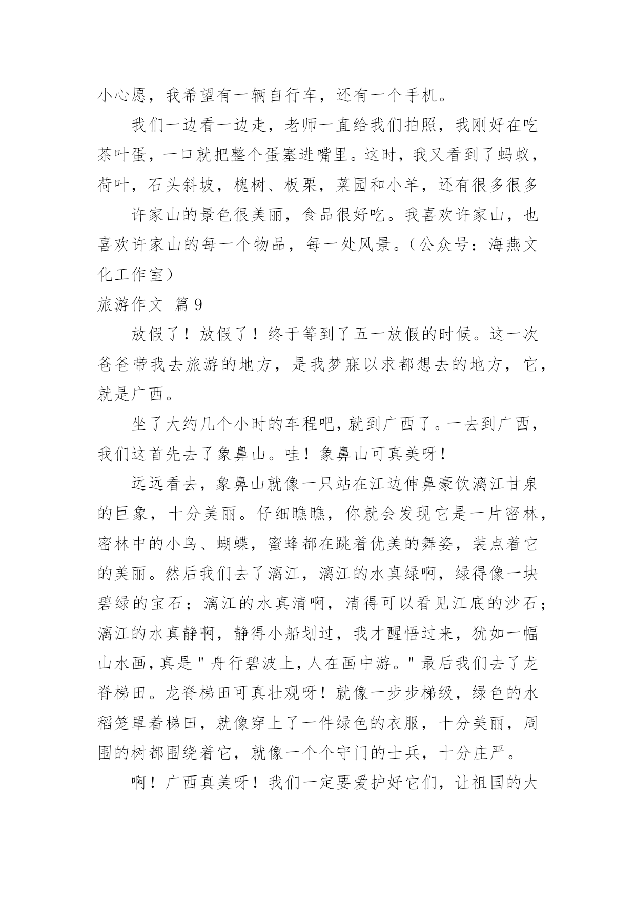旅游作文【精华】旅游作文合集9篇在日常学习、工作和生活中,许多人都写过作文吧,作文根据写作时限的不同可以分为限时作文和非限时作文。作文的注意事项有许多,你确定会写吗?以下是小编为大家整理的旅游作文9篇,希望能够帮助到大家。旅游作文篇1这个美丽的瀑布你认识吗?这就是九寨沟,著名的珍珠滩瀑布。这个瀑布你觉得眼熟吗?只要你看过西游记你一定会知道的,这就是每集电视剧播放完以后,出现的瀑布,就是珍珠滩瀑布了。那里青山绿水,瀑布气势磅礴,水流疾驰而下就像滑滑梯一样从上面滑下来,有一首诗就是描写瀑布的,就是“飞流直下三千尺,疑是银河落九天。”我刚靠近岸边就感觉冰凉凉的很凉快。那是因为水流太急,所以水花从水里溅过来了,所里感觉很凉快。而且水也很冰,我用水洗了洗脸,感觉清爽多了,我还想有时间我和妈妈爸爸,要是在这里游泳。那该多好呀,可是风景区不让游泳。我只能做我的白日梦了。那里可美了有瀑布、有树木、有花草。而且花绽放出了浓浓了的香气,我和妈妈在那里也拍了很多美丽的照片。我真喜欢珍珠滩瀑布。希望没有去过的人,也去观看观看四川的美景。旅游作文篇2我非常想要一个旅游节。旅游节是让全国各地的父母都能休息,并带着他们自己的小孩出去旅游,不用再辛苦劳累地上班。每当我提出要出去旅游时,妈妈总是不耐烦地连头都不回地说:“没时间”。如果有了旅游节,爸爸妈妈又能放假休息,又能带我们出去旅游。去年的端午节我想去西湖玩,因为那边很美:湖中央有一群白鹭掠过,有几艘小船在湖中游荡。但是因为妈妈没时间,所以我们一家没能出去玩。每次都只有我和爸爸出去玩,妈妈却在努力地工作,我的心里总是空落落的,有些失望,总觉得心中少了点什么。同时,我又想起了一些留守儿童的生活,他们的爸爸妈妈常年在外面打工,不能和家人们团聚,缺少父爱和母爱,所以他们都很内向。如果有了旅游节,爸爸妈妈们就可以带着自己的孩子出去旅游,这样大家要有多开心呀!因此我想要一个旅游节。在这五天里我和爸爸妈妈去西湖玩,我欣喜若狂,心跳加速,但是当我又想到了那些留守儿童每天连爸爸妈妈的脸甚至连他们的声音都听不到,我又觉得我很幸福了每天都能和爸爸妈妈一起玩,我要学会珍惜这些时光。这样有了旅游节,我又能和爸爸妈妈出去旅游了,父母也能休息,不再劳累地工作。他们能有更多的时间来陪陪我们,特别是那些留守儿童可以全家团聚,让他们不再孤单寂寞。旅游作文篇3大家都听说过西沙群岛吧!那可是我国的海防前哨,它不但风景优美,而且物产丰富,是个可爱的地方。今天我们的郭导游——郭老师,就带领着大家去游玩了西沙群岛。郭导游先带着游客们去参观了海水。哇!好漂亮的海水呀!郭导游,海水怎么怎么会有不同的颜色的?游客们兴奋地喊着,叫着。郭导游笑眯眯地解释道:因为海底高低不平,有山崖,有峡谷,海水就有深有浅了,所以从海面看,色彩也就不同了。听了郭导游的话,游客们一下子全明白了。接着郭导游向大家介绍了西沙群岛里的鱼儿。那些在珊瑚从中穿来穿去的鱼儿,真是好看极了!有的全身布满彩色的花纹;有的头上长着一簇红缨;有的周身像插着好些扇子,游动的时候飘飘摇摇最后,大家在金色的海滩上捡起那些奇形怪状的贝壳。大家拿着自己拣来的贝壳,比着谁的最漂亮。这些大的、小的贝壳有的像扇子,有的像小碗,有的像五角星,还有的像刺刀。更吸引人的是那五彩缤纷的颜色了!有橘黄的,有淡红的,有浅绿的,有雪白的西沙群岛真是太美了!我们爱你,西沙群岛。大家不禁大声地喊了起来。旅游作文篇4暑假习作浪花朵朵,海风柔柔,细沙绵绵,海水蓝蓝,我来到了美丽的威海。迎着轻柔的海风,踩着细软的黄沙,带着灿烂的笑容,爸爸拉着我的手带我到海水里去玩。海浪越过我们的脚面,不时卷起脚边的细沙,我们仿佛在船上晃动,好玩极了。一个大浪把我们送上了海岸,与我们一同冲上来的还有五颜六色的贝壳,我尽情地挑选着自己喜欢的颜色和形状。突然一个大浪打来,我没来得及躲开,变成了一只名副其实的“落汤鸡”,还有幸品尝了海水的味道,好咸呀。我抱着一大堆贝壳正准备离开,又一个大浪迎面打来,如一面墙向我倒塌下来,打得我眼冒金星,躺在海水中,手脚扑腾着,幸好爸爸及时把我拉了起来,真是有惊无险。拖着疲惫的身体我们来到了海边的礁石滩,礁石中有许多小螃蟹、小鱼、小虾和小海螺等。我找了一个塑料瓶子灌上海水,挖开细沙、挪开石头,我看到了一只只小螃蟹、小鱼和小虾,我迅速地用手一抓,把这些小家伙装进瓶子里。不知不觉已是夕阳西下,我带着一天的收获、欢乐和汗水,心满意足地回到了宾馆。威海旅游结束了,这里树绿天蓝、空气清新、风景优美、山清水秀,是休闲度假的好地方。有机会我还要再来,感受这梦幻般的人间仙境。旅游作文篇5春回大地,万物复苏。当早春第一缕阳光跳出地平线,照耀大地的时候,封冻的山川上、覆盖在枝头上的冰雪开始缓慢融化,凝结在枝头上的坚冰也开始化成水顺着枝干悄悄地退出