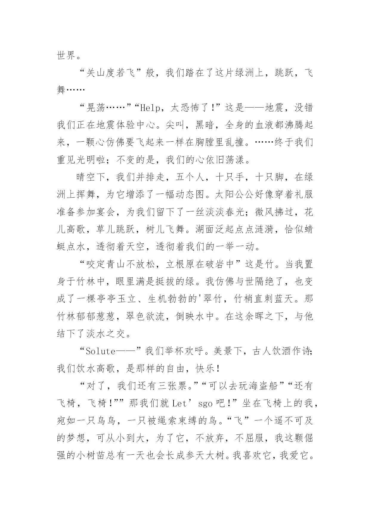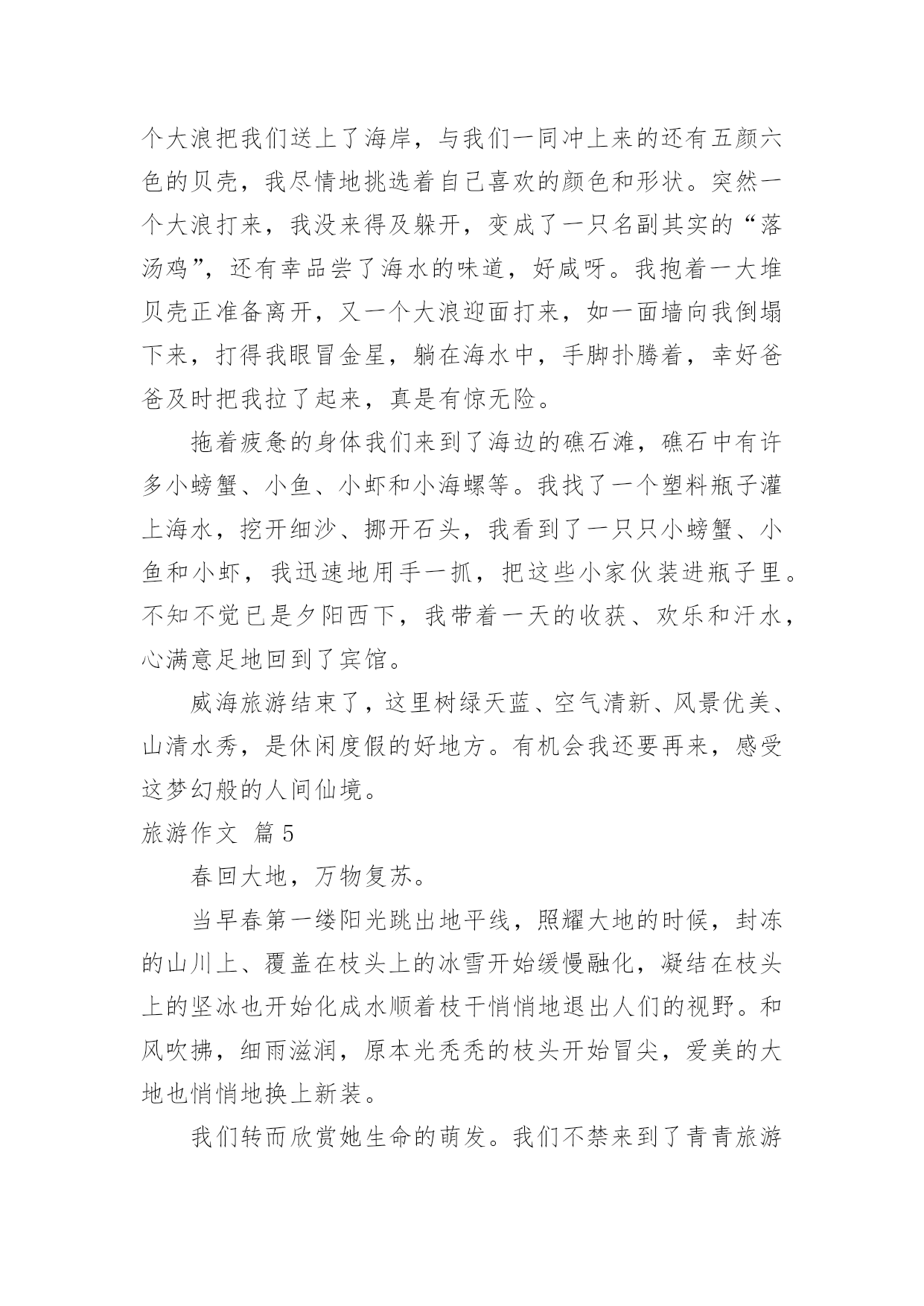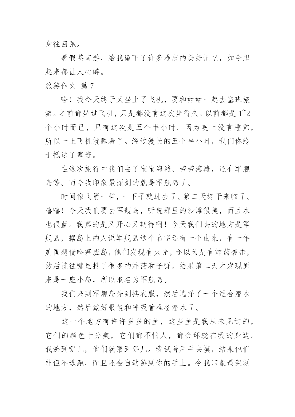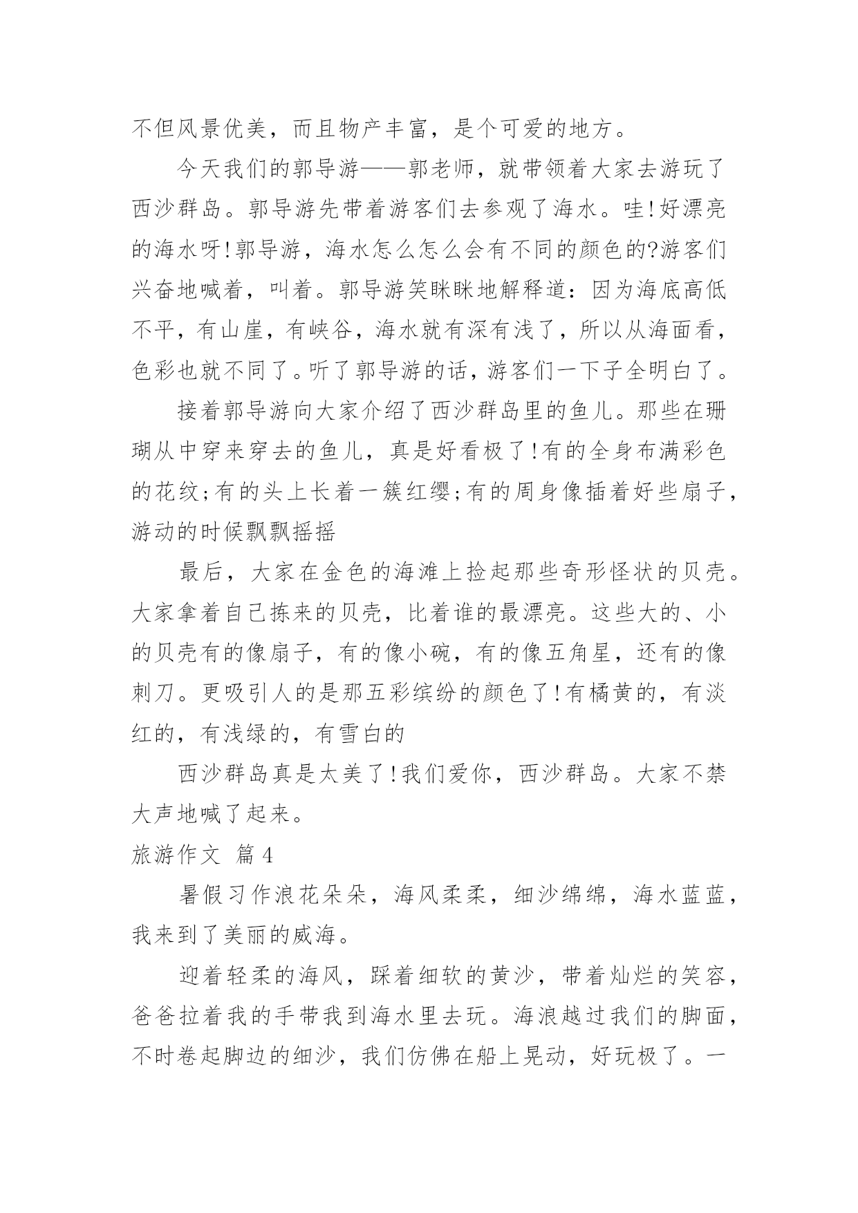 旅游作文【精华】旅游作文合集9篇在日常学习、工作和生活中,许多人都写过作文吧,作文根据写作时限的不同可以分为限时作文和非限时作文。作文的注意事项有许多,你确定会写吗?以下是小编为大家整理的旅游作文9篇,希望能够帮助到大家。旅游作文篇1这个美丽的瀑布你认识吗?这就是九寨沟,著名的珍珠滩瀑布。这个瀑布你觉得眼熟吗?只要你看过西游记你一定会知道的,这就是每集电视剧播放完以后,出现的瀑布,就是珍珠滩瀑布了。那里青山绿水,瀑布气势磅礴,水流疾驰而下就像滑滑梯一样从上面滑下来,有一首诗就是描写瀑布的,就是“飞流直下三千尺,疑是银河落九天。”我刚靠近岸边就感觉冰凉凉的很凉快。那是因为水流太急,所以水花从水里溅过来了,所里感觉很凉快。而且水也很冰,我用水洗了洗脸,感觉清爽多了,我还想有时间我和妈妈爸爸,要是在这里游泳。那该多好呀,可是风景区不让游泳。我只能做我的白日梦了。那里可美了有瀑布、有树木、有花草。而且花绽放出了浓浓了的香气,我和妈妈在那里也拍了很多美丽的照片。我真喜欢珍珠滩瀑布。希望没有去过的人,也去观看观看四川的美景。旅游作文篇2我非常想要一个旅游节。旅游节是让全国各地的父母都能休息,并带着他们自己的小孩出去旅游,不用再辛苦劳累地上班。每当我提出要出去旅游时,妈妈总是不耐烦地连头都不回地说:“没时间”。如果有了旅游节,爸爸妈妈又能放假休息,又能带我们出去旅游。去年的端午节我想去西湖玩,因为那边很美:湖中央有一群白鹭掠过,有几艘小船在湖中游荡。但是因为妈妈没时间,所以我们一家没能出去玩。每次都只有我和爸爸出去玩,妈妈却在努力地工作,我的心里总是空落落的,有些失望,总觉得心中少了点什么。同时,我又想起了一些留守儿童的生活,他们的爸爸妈妈常年在外面打工,不能和家人们团聚,缺少父爱和母爱,所以他们都很内向。如果有了旅游节,爸爸妈妈们就可以带着自己的孩子出去旅游,这样大家要有多开心呀!因此我想要一个旅游节。在这五天里我和爸爸妈妈去西湖玩,我欣喜若狂,心跳加速,但是当我又想到了那些留守儿童每天连爸爸妈妈的脸甚至连他们的声音都听不到,我又觉得我很幸福了每天都能和爸爸妈妈一起玩,我要学会珍惜这些时光。这样有了旅游节,我又能和爸爸妈妈出去旅游了,父母也能休息,不再劳累地工作。他们能有更多的时间来陪陪我们,特别是那些留守儿童可以全家团聚,让他们不再孤单寂寞。旅游作文篇3大家都听说过西沙群岛吧!那可是我国的海防前哨,它不但风景优美,而且物产丰富,是个可爱的地方。今天我们的郭导游——郭老师,就带领着大家去游玩了西沙群岛。郭导游先带着游客们去参观了海水。哇!好漂亮的海水呀!郭导游,海水怎么怎么会有不同的颜色的?游客们兴奋地喊着,叫着。郭导游笑眯眯地解释道:因为海底高低不平,有山崖,有峡谷,海水就有深有浅了,所以从海面看,色彩也就不同了。听了郭导游的话,游客们一下子全明白了。接着郭导游向大家介绍了西沙群岛里的鱼儿。那些在珊瑚从中穿来穿去的鱼儿,真是好看极了!有的全身布满彩色的花纹;有的头上长着一簇红缨;有的周身像插着好些扇子,游动的时候飘飘摇摇最后,大家在金色的海滩上捡起那些奇形怪状的贝壳。大家拿着自己拣来的贝壳,比着谁的最漂亮。这些大的、小的贝壳有的像扇子,有的像小碗,有的像五角星,还有的像刺刀。更吸引人的是那五彩缤纷的颜色了!有橘黄的,有淡红的,有浅绿的,有雪白的西沙群岛真是太美了!我们爱你,西沙群岛。大家不禁大声地喊了起来。旅游作文篇4暑假习作浪花朵朵,海风柔柔,细沙绵绵,海水蓝蓝,我来到了美丽的威海。迎着轻柔的海风,踩着细软的黄沙,带着灿烂的笑容,爸爸拉着我的手带我到海水里去玩。海浪越过我们的脚面,不时卷起脚边的细沙,我们仿佛在船上晃动,好玩极了。一个大浪把我们送上了海岸,与我们一同冲上来的还有五颜六色的贝壳,我尽情地挑选着自己喜欢的颜色和形状。突然一个大浪打来,我没来得及躲开,变成了一只名副其实的“落汤鸡”,还有幸品尝了海水的味道,好咸呀。我抱着一大堆贝壳正准备离开,又一个大浪迎面打来,如一面墙向我倒塌下来,打得我眼冒金星,躺在海水中,手脚扑腾着,幸好爸爸及时把我拉了起来,真是有惊无险。拖着疲惫的身体我们来到了海边的礁石滩,礁石中有许多小螃蟹、小鱼、小虾和小海螺等。我找了一个塑料瓶子灌上海水,挖开细沙、挪开石头,我看到了一只只小螃蟹、小鱼和小虾,我迅速地用手一抓,把这些小家伙装进瓶子里。不知不觉已是夕阳西下,我带着一天的收获、欢乐和汗水,心满意足地回到了宾馆。威海旅游结束了,这里树绿天蓝、空气清新、风景优美、山清水秀,是休闲度假的好地方。有机会我还要再来,感受这梦幻般的人间仙境。旅游作文篇5春回大地,万物复苏。当早春第一缕阳光跳出地平线,照耀大地的时候,封冻的山川上、覆盖在枝头上的冰雪开始缓慢融化,凝结在枝头上的坚冰也开始化成水顺着枝干悄悄地退出