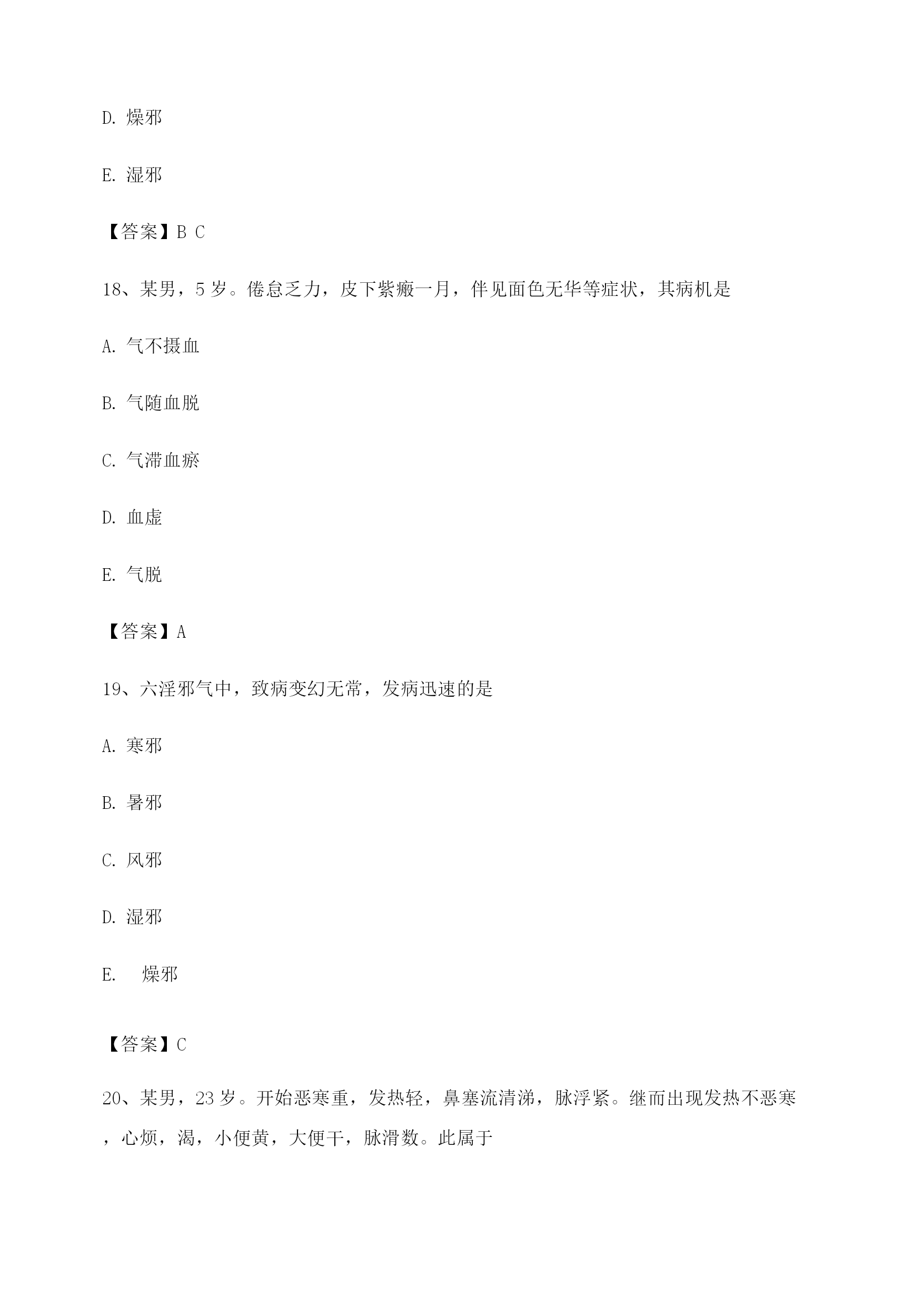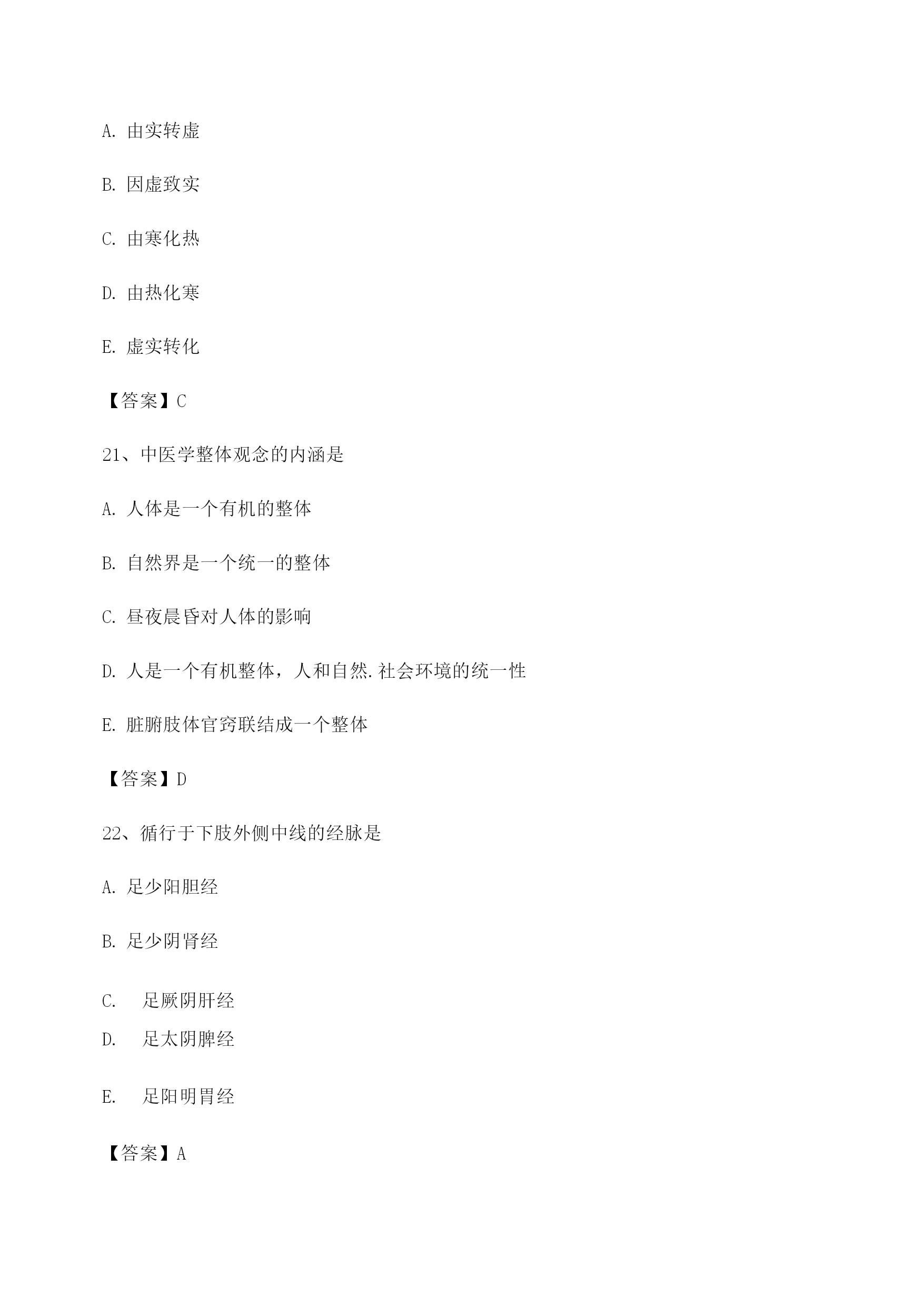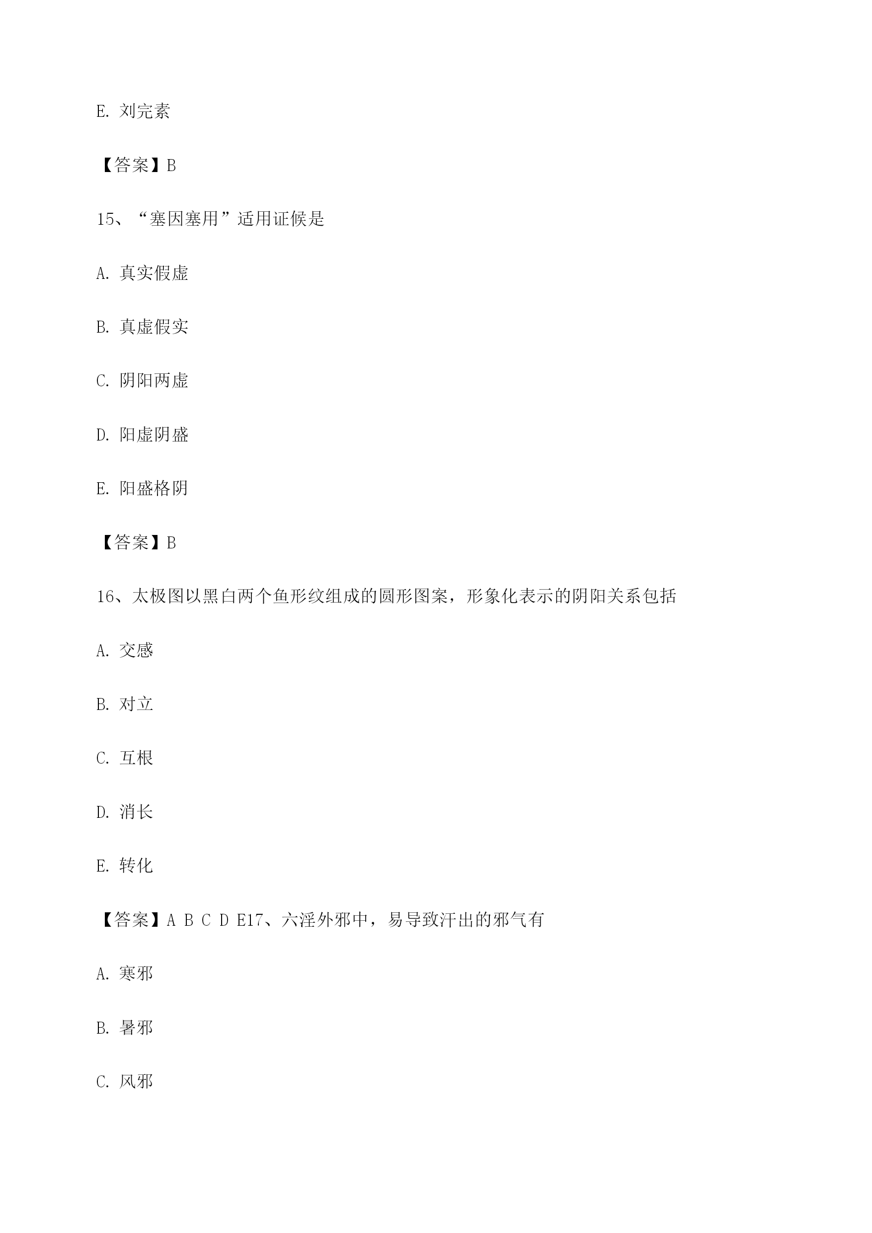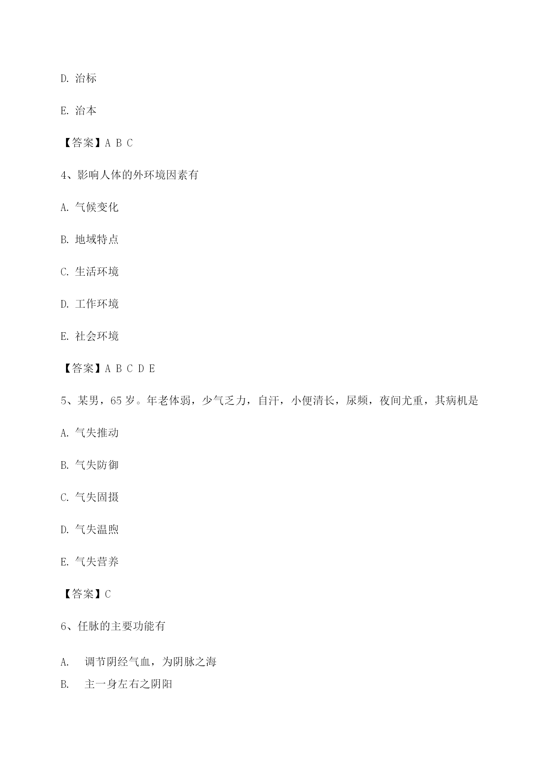 中医基础理论考试模拟题库1、肝火炽盛证,使用清泻肝火药物的同时,还可用清泻心火的药物,其原理是虚则补母实则泻子阳中求阴阴中求阳抑强扶弱【答案】B2、火热邪气的性质和致病特点有阳邪干涩。.扰心神易生风动血升散【答案】ACD3、属于治法的有益气养血滋阴治标治本【答案】ABC4、影响人体的外环境因素有气候变化地域特点生活环境工作环境社会环境【答案】ABCDE5、某男,65岁。年老体弱,少气乏力,自汗,小便清长,尿频,夜间尤重,其病机是气失推动气失防御气失固摄气失温煦气失营养【答案】C6、任脉的主要功能有调节阴经气血,为阴脉之海主一身左右之阴阳约束诸脉主胞胎濡养眼目,司眼睑之开合【答案】AD7、不属于水湿痰饮致病特点的是致病广泛变化多端扰乱神明局部刺痛多滑腻苔【答案】D8、失眠健忘.多梦惊悸,由于血的功能失常的是濡养作用化神作用温煦作用推动作用固摄作用【答案】B9、中医学描述肺“虚如蜂巢”所体现的思维方式是形象思维意象思维应象思维抽象思维逻辑思维【答案】A10、防止体内液态物质无故丢失,主要体现气的功能是推动作用温煦作用防御作用固摄作用中介作用【答案】D11、属于内风病机及病证的是伤风破伤风热极生风风疹风痹【答案】C12、“金水相生”说明的两脏关系是/心与肾肝与肾脾与肾肺与肾肝与肺【答案】D13、“夺汗者无血,夺血者无汗”说明两者之间有着密切关系的是气与津液气与血液精与血液血与津液精与津液【答案】D14、被后人称为“补土派”的医家代表是李中梓李东垣陈无择叶天士刘完素【答案】B15、“塞因塞用”适用证候是真实假虚真虚假实阴阳两虚阳虚阴盛阳盛格阴【答案】B16、太极图以黑白两个鱼形纹组成的圆形图案,形象化表示的阴阳关系包括交感对立互根消长转化【答案】ABCDE17、六淫外邪中,易导致汗出的邪气有寒邪暑邪风邪燥邪湿邪【答案】BC18、某男,5岁。倦怠乏力,皮下紫瘢一月,伴见面色无华等症状,其病机是气不摄血气随血脱气滞血瘀血虚气脱【答案】A19、六淫邪气中,致病变幻无常,发病迅速的是寒邪暑邪风邪湿邪燥邪【答案】C20、某男,23岁。开始恶寒重,发热轻,鼻塞流清涕,脉浮紧。继而出现发热不恶寒,心烦,渴,小便黄,大便干,脉滑数。此属于由实转虚因虚致实由寒化热由热化寒虚实转化【答案】C21、中医学整体观念的内涵是人体是一个有机的整体自然界是一个统一的整体昼夜晨昏对人体的影响人是一个有机整体,人和自然.社会环境的统一性脏腑肢体官窍联结成一个整体【答案】D22、循行于下肢外侧中线的经脉是足少阳胆经足少阴肾经足厥阴肝经足太阴脾经足阳明胃经【答案】A23、《素问•痹论》所谓“水谷之悍气”是谷气清气宗气营气卫气【答案】E24、健康之人的体质类型是平和质偏阳质偏阴质特禀质气郁质【答案】A25、起于胞中的经脉有冲脉带脉任脉督脉阴维脉【答案】ACD26、老年人体质的特点是脏腑气虚稚阴稚阳气郁阴虚【答案】A27、335:构成和维持人体生命活动的精微物质和生命繁衍的根源是人体之精津液血气.血.津液等气【答案】A28、与津液不足形成有关的因素包括外感暑邪外感燥邪大汗脏腑气虚五志化火【答案】ABCDE29、与膀胱通过经脉相互络属的脏是TOC\o"1-5"\h\z/心肝5肾肺【答案】D30、素体津亏血虚,感邪之后易于从化的特点是寒化热化。.燥化D.实化E.虚化【答案】C31、疠气指六淫邪气异常气候情志变化气机失调乖戾之气【答案】E32、人体之精生成的物质来源有先天之精吸入清气水谷精微脏腑之精生殖之精【答案】ABC33、关于阴阳亡失,以下说法错误的是亡阳即机体的阳气发生突然大量脱失亡阴即机体阴气发生突然大量消耗或丢失汗出过多可导致亡阳汗出过多可导致亡阴亡阴不会导致亡阳【答案】E34、后天之精是吸人清气与五脏六腑之精吸人清气与水谷精微水谷精微与五脏六腑之精水谷精微与生殖之精生殖之精与五脏六腑之精【答案】B35、与女子胞关系最密切的经脉有冲脉任脉督脉带脉跷脉【答案】AB36、导致子宫脱垂.脱肛的基本病机为气滞气逆气陷气闭气脱【答案】C37、六淫外邪中,致病易导致出血的为风邪寒邪燥邪湿邪火邪【答案】E38、属于疾病的术语有积聚胸痹恶寒消渴脾虚【答案】ABD3