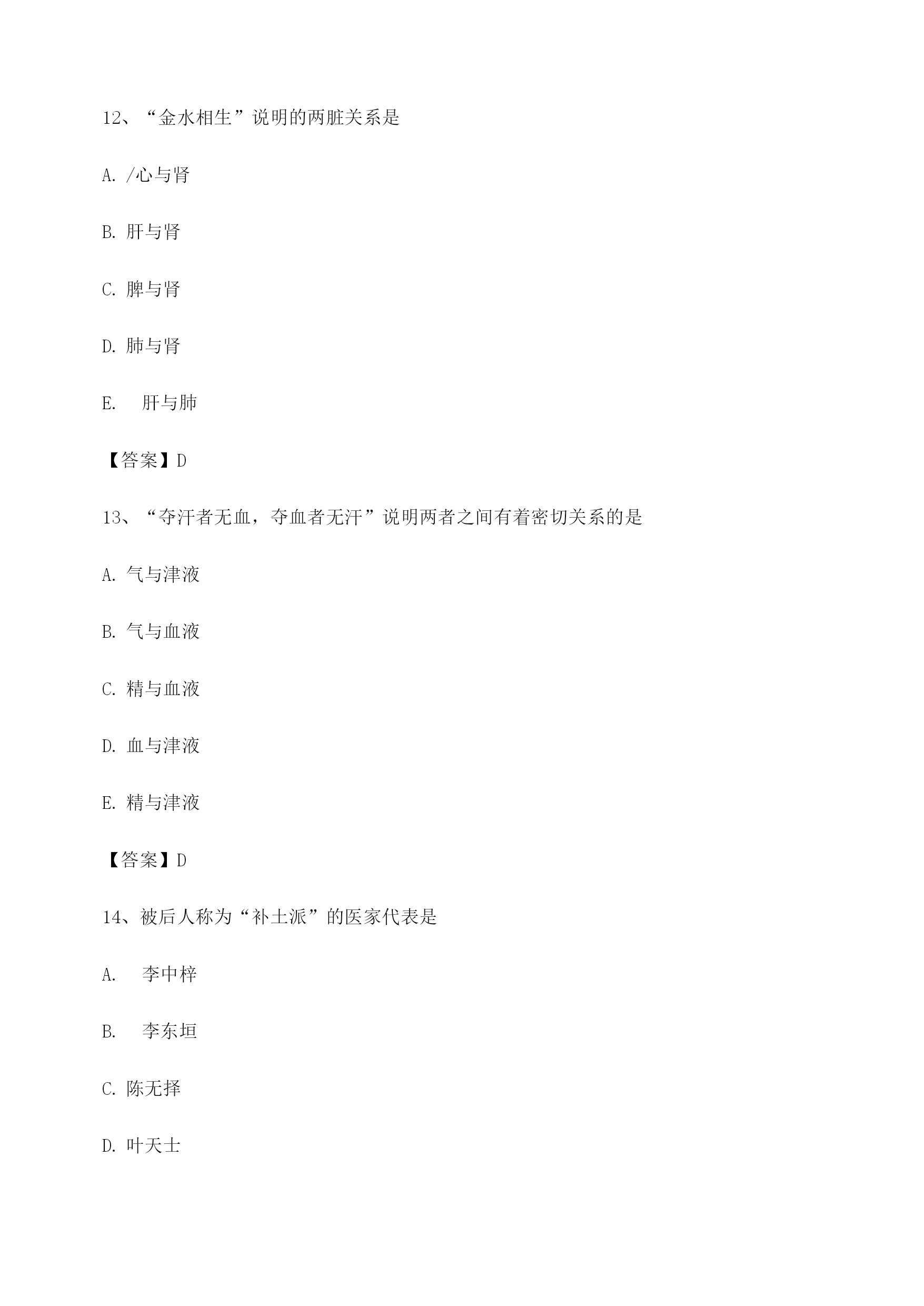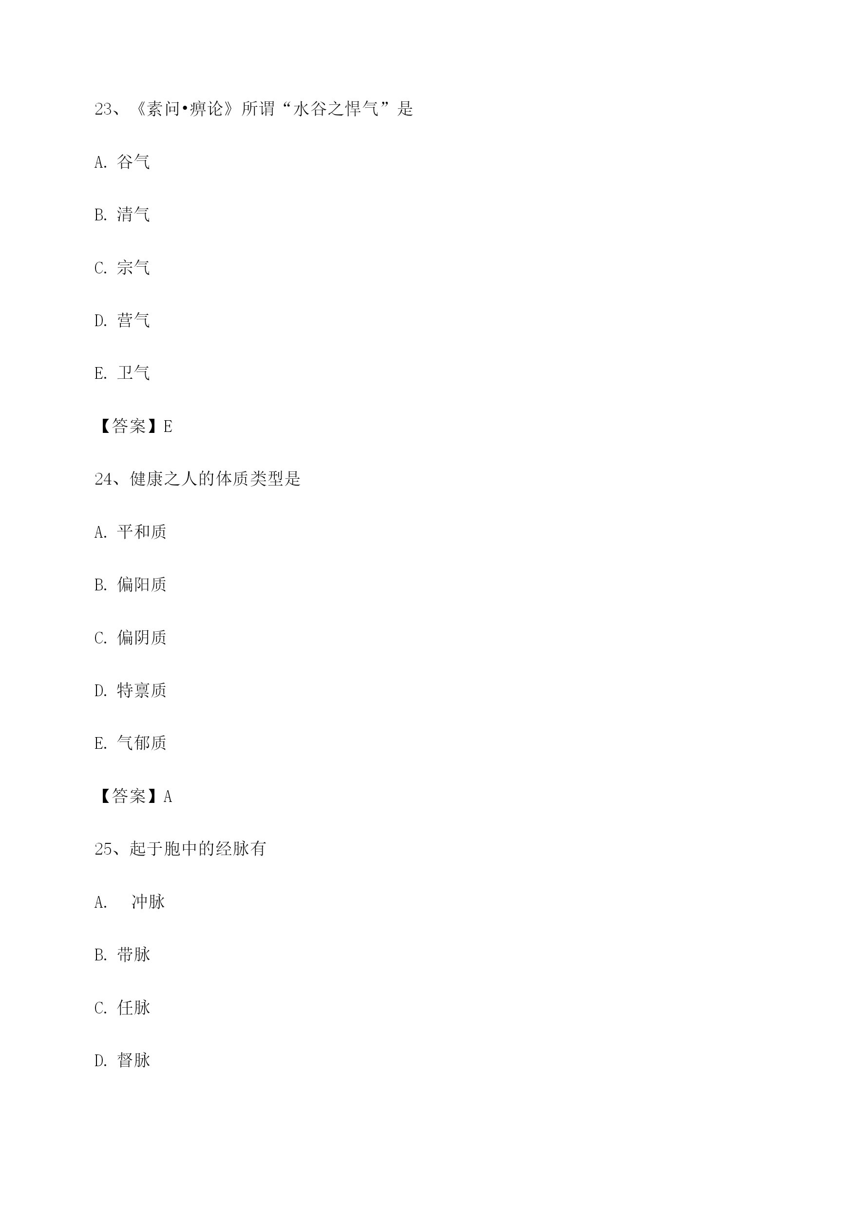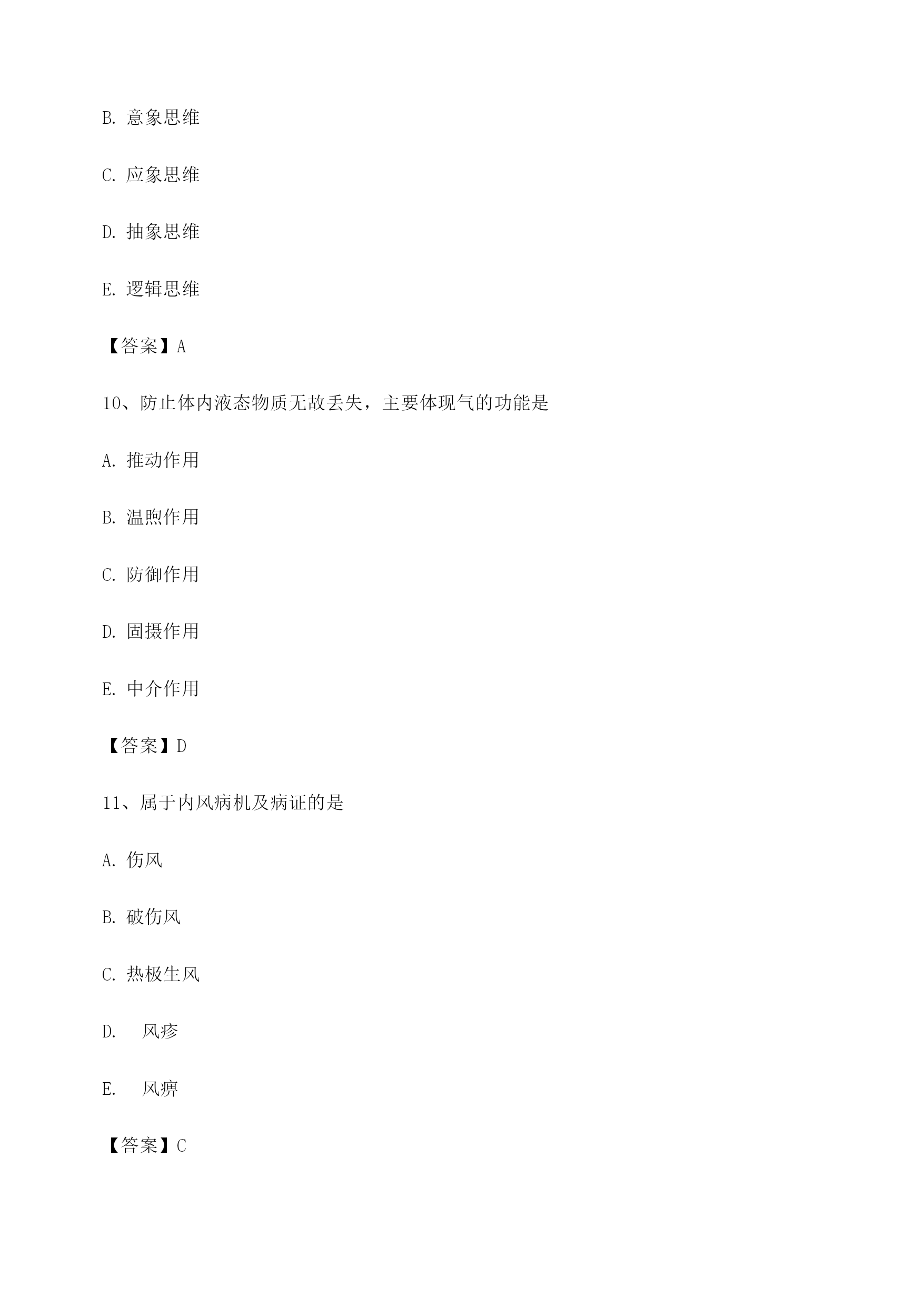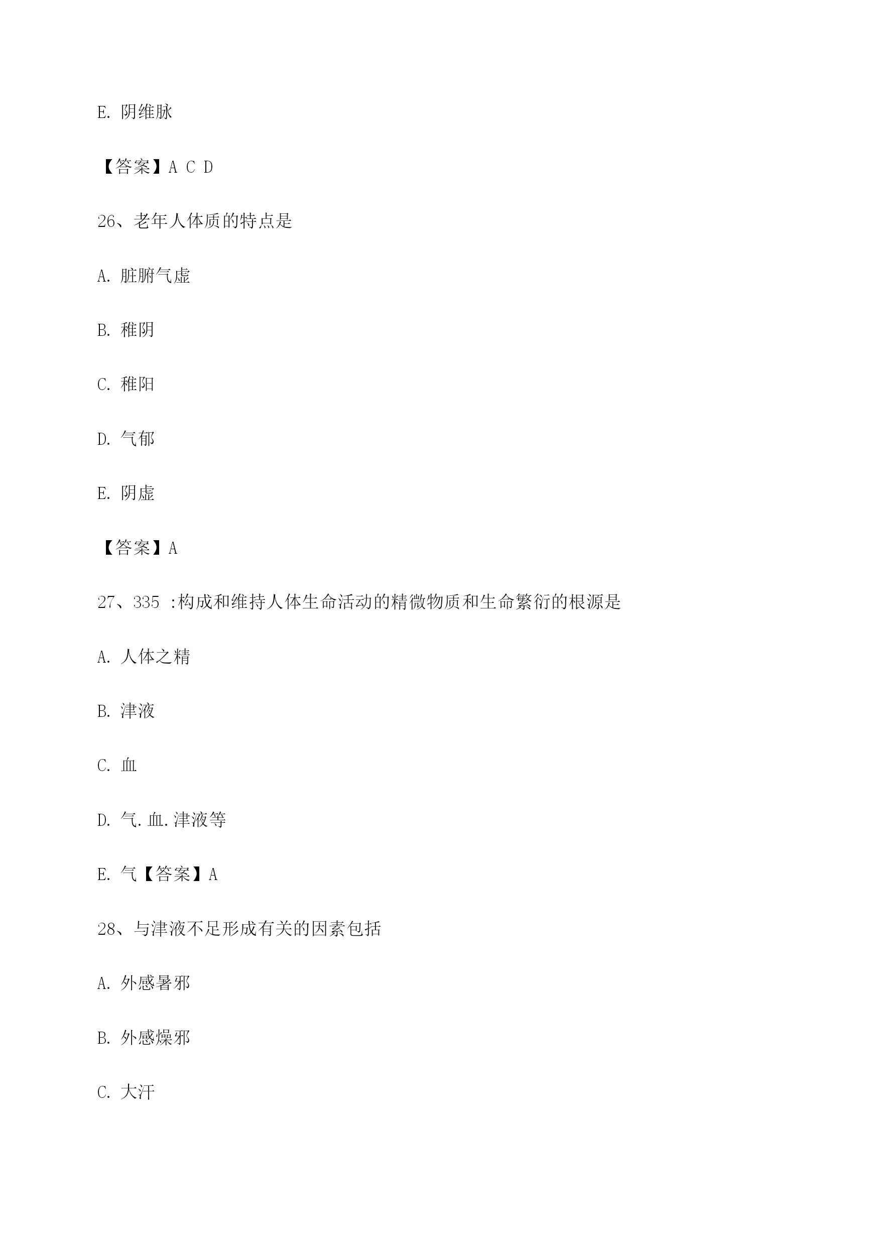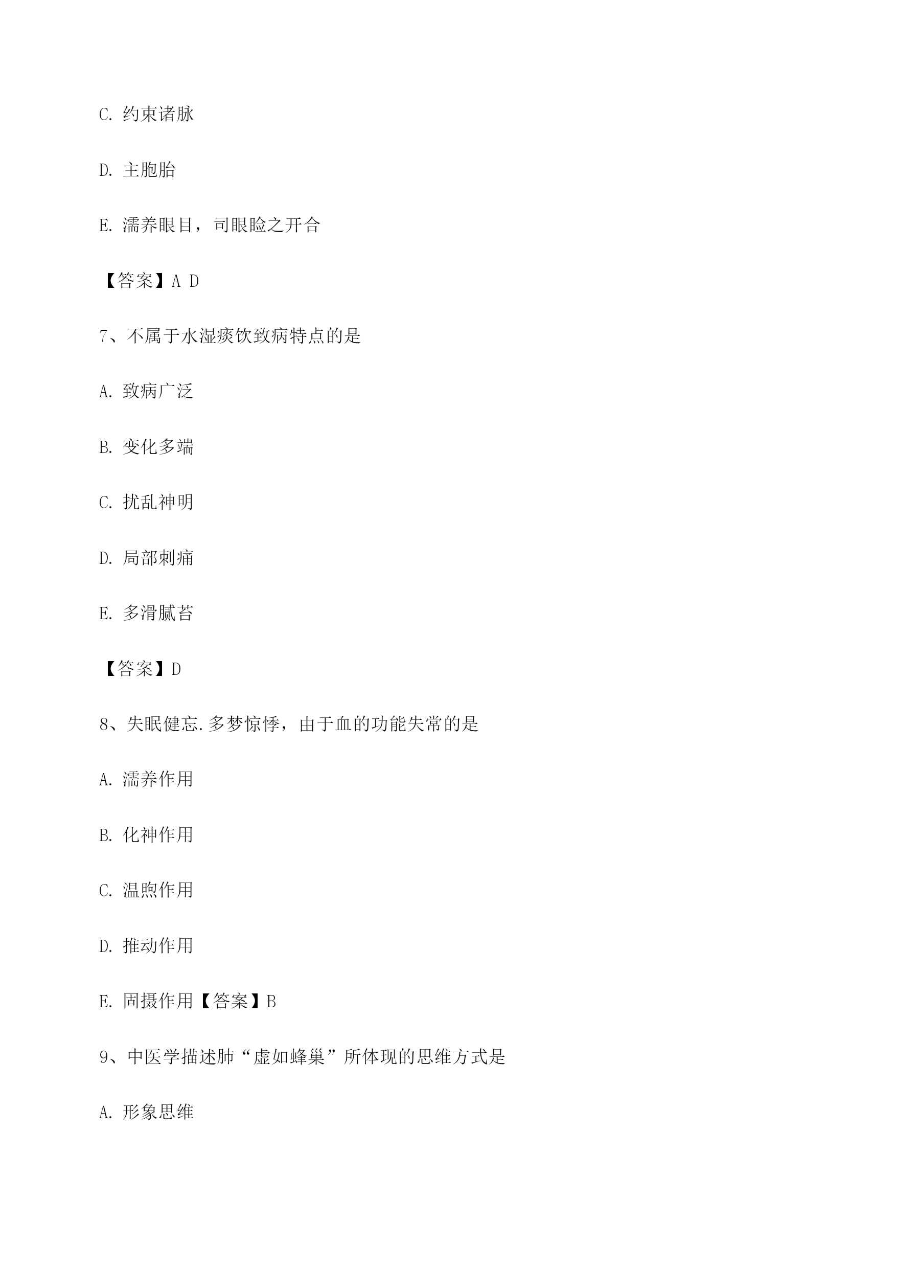 中医基础理论考试模拟题库1、肝火炽盛证,使用清泻肝火药物的同时,还可用清泻心火的药物,其原理是虚则补母实则泻子阳中求阴阴中求阳抑强扶弱【答案】B2、火热邪气的性质和致病特点有阳邪干涩。.扰心神易生风动血升散【答案】ACD3、属于治法的有益气养血滋阴治标治本【答案】ABC4、影响人体的外环境因素有气候变化地域特点生活环境工作环境社会环境【答案】ABCDE5、某男,65岁。年老体弱,少气乏力,自汗,小便清长,尿频,夜间尤重,其病机是气失推动气失防御气失固摄气失温煦气失营养【答案】C6、任脉的主要功能有调节阴经气血,为阴脉之海主一身左右之阴阳约束诸脉主胞胎濡养眼目,司眼睑之开合【答案】AD7、不属于水湿痰饮致病特点的是致病广泛变化多端扰乱神明局部刺痛多滑腻苔【答案】D8、失眠健忘.多梦惊悸,由于血的功能失常的是濡养作用化神作用温煦作用推动作用固摄作用【答案】B9、中医学描述肺“虚如蜂巢”所体现的思维方式是形象思维意象思维应象思维抽象思维逻辑思维【答案】A10、防止体内液态物质无故丢失,主要体现气的功能是推动作用温煦作用防御作用固摄作用中介作用【答案】D11、属于内风病机及病证的是伤风破伤风热极生风风疹风痹【答案】C12、“金水相生”说明的两脏关系是/心与肾肝与肾脾与肾肺与肾肝与肺【答案】D13、“夺汗者无血,夺血者无汗”说明两者之间有着密切关系的是气与津液气与血液精与血液血与津液精与津液【答案】D14、被后人称为“补土派”的医家代表是李中梓李东垣陈无择叶天士刘完素【答案】B15、“塞因塞用”适用证候是真实假虚真虚假实阴阳两虚阳虚阴盛阳盛格阴【答案】B16、太极图以黑白两个鱼形纹组成的圆形图案,形象化表示的阴阳关系包括交感对立互根消长转化【答案】ABCDE17、六淫外邪中,易导致汗出的邪气有寒邪暑邪风邪燥邪湿邪【答案】BC18、某男,5岁。倦怠乏力,皮下紫瘢一月,伴见面色无华等症状,其病机是气不摄血气随血脱气滞血瘀血虚气脱【答案】A19、六淫邪气中,致病变幻无常,发病迅速的是寒邪暑邪风邪湿邪燥邪【答案】C20、某男,23岁。开始恶寒重,发热轻,鼻塞流清涕,脉浮紧。继而出现发热不恶寒,心烦,渴,小便黄,大便干,脉滑数。此属于由实转虚因虚致实由寒化热由热化寒虚实转化【答案】C21、中医学整体观念的内涵是人体是一个有机的整体自然界是一个统一的整体昼夜晨昏对人体的影响人是一个有机整体,人和自然.社会环境的统一性脏腑肢体官窍联结成一个整体【答案】D22、循行于下肢外侧中线的经脉是足少阳胆经足少阴肾经足厥阴肝经足太阴脾经足阳明胃经【答案】A23、《素问•痹论》所谓“水谷之悍气”是谷气清气宗气营气卫气【答案】E24、健康之人的体质类型是平和质偏阳质偏阴质特禀质气郁质【答案】A25、起于胞中的经脉有冲脉带脉任脉督脉阴维脉【答案】ACD26、老年人体质的特点是脏腑气虚稚阴稚阳气郁阴虚【答案】A27、335:构成和维持人体生命活动的精微物质和生命繁衍的根源是人体之精津液血气.血.津液等气【答案】A28、与津液不足形成有关的因素包括外感暑邪外感燥邪大汗脏腑气虚五志化火【答案】ABCDE29、与膀胱通过经脉相互络属的脏是TOC\o"1-5"\h\z/心肝5肾肺【答案】D30、素体津亏血虚,感邪之后易于从化的特点是寒化热化。.燥化D.实化E.虚化【答案】C31、疠气指六淫邪气异常气候情志变化气机失调乖戾之气【答案】E32、人体之精生成的物质来源有先天之精吸入清气水谷精微脏腑之精生殖之精【答案】ABC33、关于阴阳亡失,以下说法错误的是亡阳即机体的阳气发生突然大量脱失亡阴即机体阴气发生突然大量消耗或丢失汗出过多可导致亡阳汗出过多可导致亡阴亡阴不会导致亡阳【答案】E34、后天之精是吸人清气与五脏六腑之精吸人清气与水谷精微水谷精微与五脏六腑之精水谷精微与生殖之精生殖之精与五脏六腑之精【答案】B35、与女子胞关系最密切的经脉有冲脉任脉督脉带脉跷脉【答案】AB36、导致子宫脱垂.脱肛的基本病机为气滞气逆气陷气闭气脱【答案】C37、六淫外邪中,致病易导致出血的为风邪寒邪燥邪湿邪火邪【答案】E38、属于疾病的术语有积聚胸痹恶寒消渴脾虚【答案】ABD3