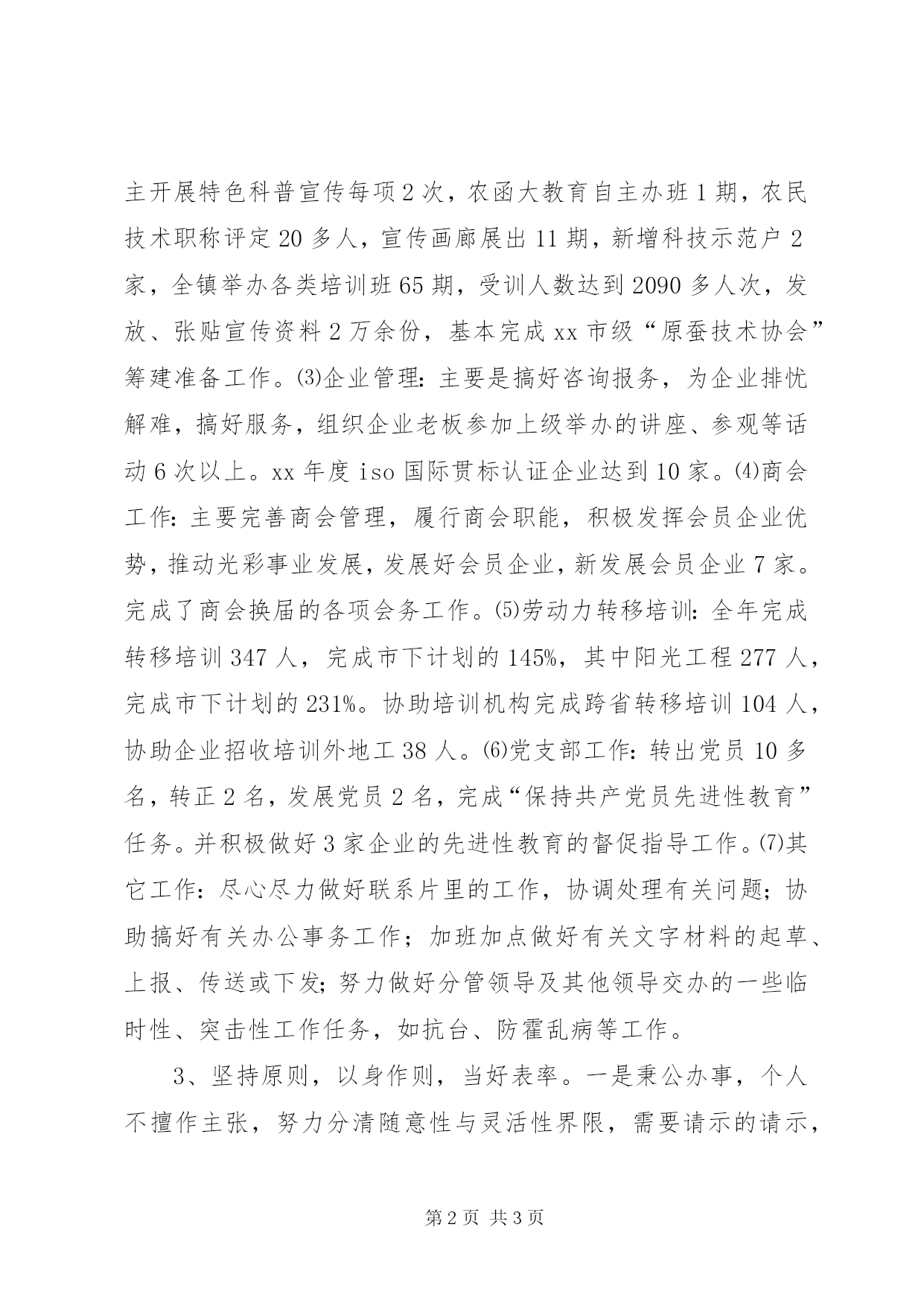 第PAGE\*Arabic\*MERGEFORMAT3页共NUMPAGES\*MERGEFORMAT3页工商联个人工作总结一年来,本人在组织和领导的关心、支持下,在同事的配合、帮助下,以及在有关部门指导下,通过自己的勤奋与努力,取得了一定的成绩与进步,主要在以下3个方面:1、坚持学习,不断提高自己的理论功底和业务素质。主要通过学习政治理论,尤其是通过“保持党员先进性教育”的学习,进一步使提高了政治觉悟、思想认识和辨别是非能力;通过学习经济、科技和电脑知识等,提高了政策水平、业务素质和工作效率。政治上与组织和领导保持一致,遵章守纪、服从全局;思想上自觉保持先进性,勤政廉洁,一心一意搞好服务;工作上认真负责,一丝不苛,积极完成组织和领导交给的各项任务。,2、统筹兼顾,有条不紊地推进各项工作。主要包括:⑴科技工作:申报市级以上各类科技计划项目27项,已批准立项21项,项目验收与成果鉴定7项;申报专利53项,已授权39项;申报并批准xx市级民营科技企业5家,申“文秘港”还有更多精彩文章等着您。报并批准省级科技型中小企业1家,申报省级高新技术企业1家;申报批准xx市级区域科技创新服务中心1家;推荐申报xx市科学技术进步奖4项;全镇累计争取到市级以上财政支助的科技经费近50万元。上述各项均刷新我镇历史记录。⑵科协工作:建立了我镇第一支科普志愿者队伍,协助上级科协开展了一次科技素养调查,实施并完成金桥工程3项,自主开展特色科普宣传每项2次,农函大教育自主办班1期,农民技术职称评定20多人,宣传画廊展出11期,新增科技示范户2家,全镇举办各类培训班65期,受训人数达到2090多人次,发放、张贴宣传资料2万余份,基本完成xx市级“原蚕技术协会”筹建准备工作。⑶企业管理:主要是搞好咨询报务,为企业排忧解难,搞好服务,组织企业老板参加上级举办的讲座、参观等话动6次以上。xx年度iso国际贯标认证企业达到10家。⑷商会工作:主要完善商会管理,履行商会职能,积极发挥会员企业优势,推动光彩事业发展,发展好会员企业,新发展会员企业7家。完成了商会换届的各项会务工作。⑸劳动力转移培训:全年完成转移培训347人,完成市下计划的145%,其中阳光工程277人,完成市下计划的231%。协助培训机构完成跨省转移培训104人,协助企业招收培训外地工38人。⑹党支部工作:转出党员10多名,转正2名,发展党员2名,完成“保持共产党员先进性教育”任务。并积极做好3家企业的先进性教育的督促指导工作。⑺其它工作:尽心尽力做好联系片里的工作,协调处理有关问题;协助搞好有关办公事务工作;加班加点做好有关文字材料的起草、上报、传送或下发;努力做好分管领导及其他领导交办的一些临时性、突击性工作任务,如抗台、防霍乱病等工作。3、坚持原则,以身作则,当好表率。一是秉公办事,个人不擅作主张,努力分清随意性与灵活性界限,需要请示的请示,该拒绝的拒绝,应解释的解释清楚。二是自觉以党员标准严格要求自己,要求别人做到的自己首先做到。三是不怕多做事,不怕做小事,不怕做难事,在点滴实践中不断完善提高自己,践行“三个代表”要求。在过去的一年里,虽然尽心尽职做出了成绩,但我清楚自身还有很多不足,比如工作能力和创新意识不足、工作方法有时不够注意,等等。今后我决心扬长避短,使各方面做得更好。希望领导和同志们对我多多监督指导。