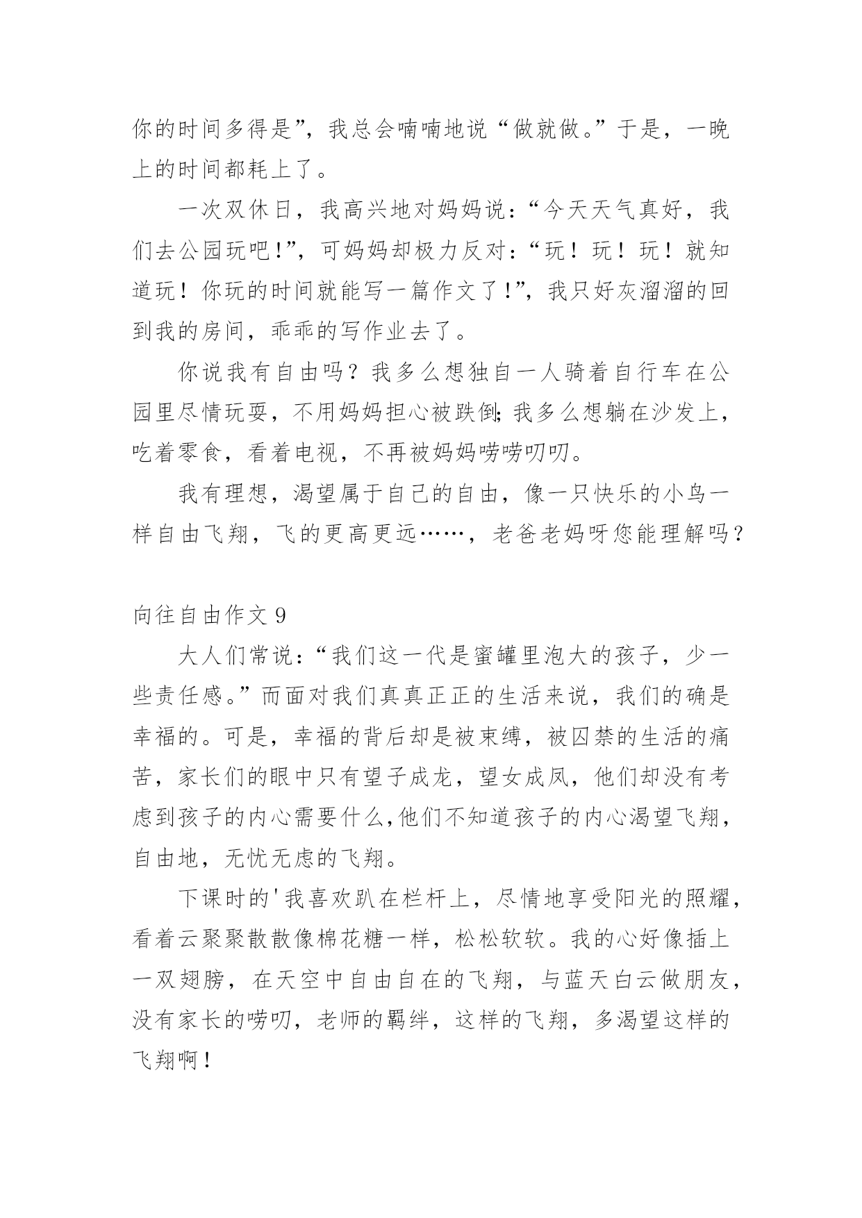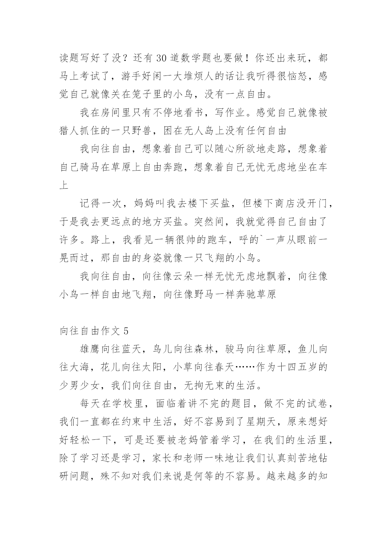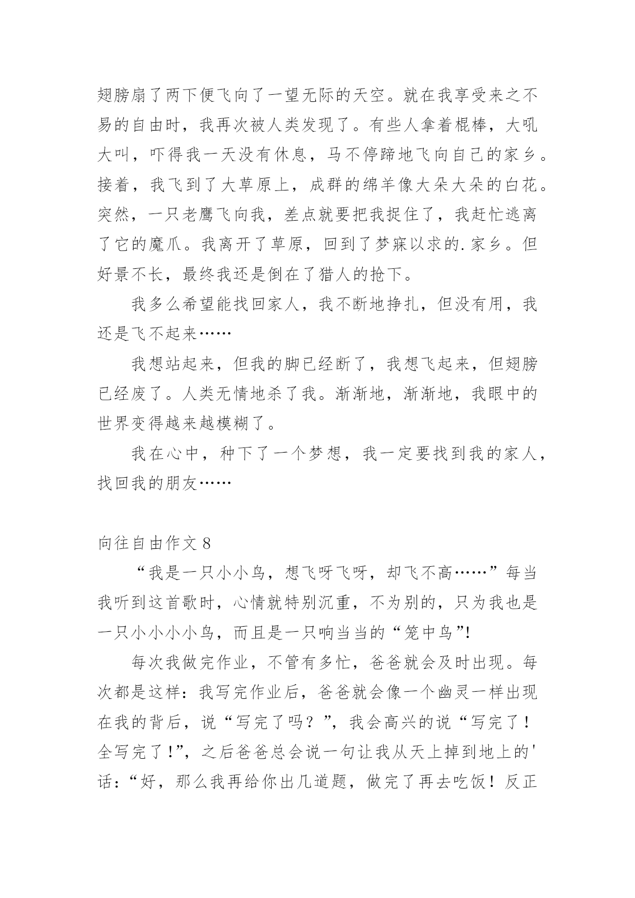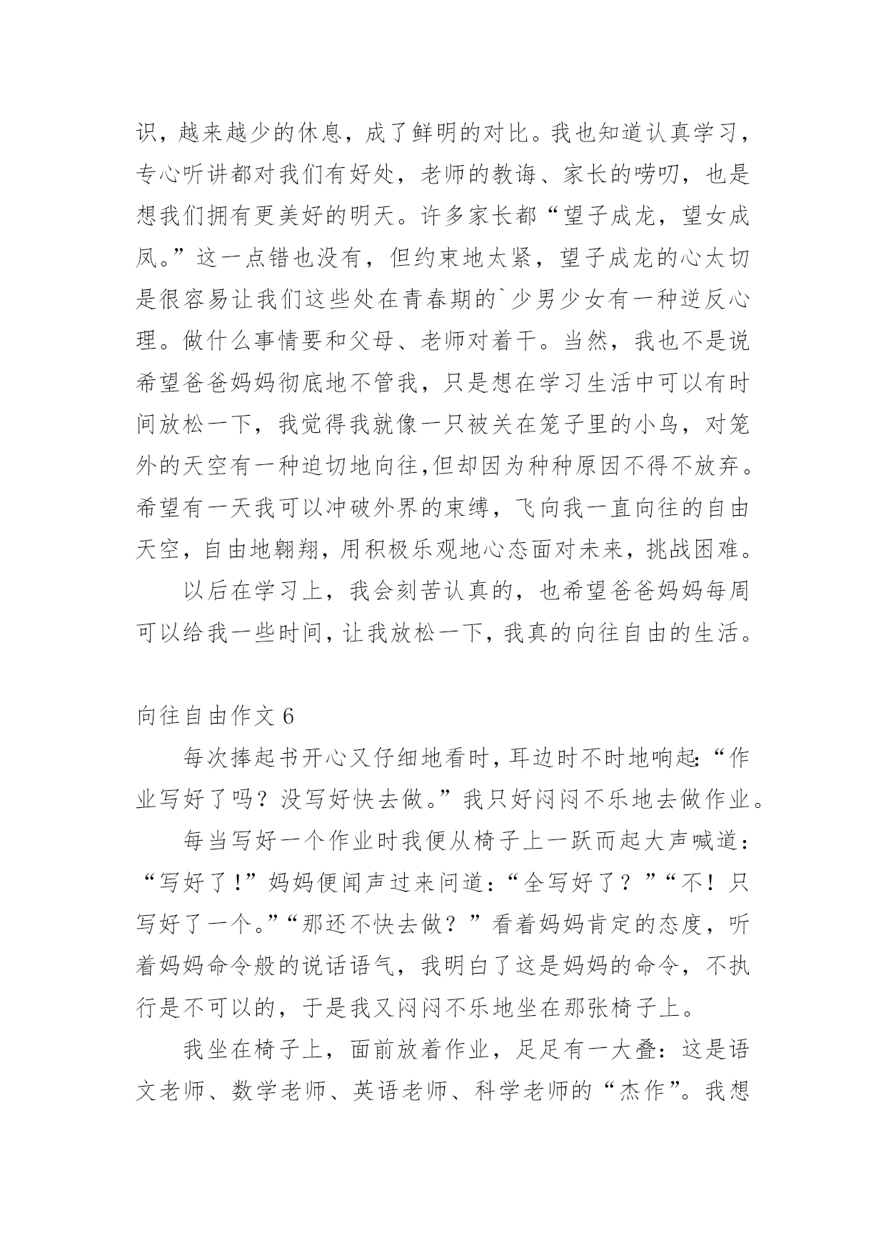 向往自由作文(推荐)向往自由作文15篇在日常学习、工作抑或是生活中,大家都写过作文,肯定对各类作文都很熟悉吧,借助作文人们可以实现文化交流的目的。相信很多朋友都对写作文感到非常苦恼吧,以下是小编帮大家整理的向往自由作文,欢迎阅读与收藏。向往自由作文1每个人都向往自由,我也不例外。每天我都在幻想着自由,我幻想着我正在一望无垠的草地上奔跑不会有人打扰我,只有动物们是我的好伙伴。无聊时,我仰身躺在草地上,看着一望无际的湛蓝天空,心情无比舒畅。但这一切都只是幻想。每当我津津有味的看电视时,妈妈总会突然而降,直接关掉电视,批评我作业没写完,即使我作业写完了,妈妈也会吼着说“写完了作业就不能读读英语吗?”我就只好悻悻的走进了自己的房间读起了英语。每当我放学回家以后,刚和楼下的`小朋友一起去打球的时候,妈妈却厉声喝道:“卢可欣,你的阅读书还没有读完呢!赶紧去看。”我不禁打起了冷颤,我拿起书,感觉这书仿佛有千斤重,压的我喘不过气来。平时妈妈还给我制定了“约法三章”:一、看电视不能超过一个小时。二、只有星期六和星期日才可以玩电脑,而且是在写完博文的情况下,玩40分钟。三、放学必须看够三篇优秀作文才能玩耍半个小时。把我牢牢的捆在书堆里了,一点也不自由,我真像一只被困在笼中的小鸟。啊!我真向往自由!渴望着有一天会飞出牢笼,做一个快活的小鸟。渴望着有一次能够自由自在蓝天白云下徜徉,渴望着有一日能够无忧无虑在美丽的天空中自由飞翔。向往自由作文2雨,朦朦胧胧地下着,在地下室里,我快步跑去,捉住了这只小麻雀。回到家后,它傲然地凝视着面前的水和小米,倔强地别过头去,用绝食无声地发表着它的不满。一天过去了,它滴米未食,滴水未进,不愿放弃它那志在蓝天的雄心。我把水端在它嘴边,它不喝;将小米喂进它嘴里,它却又吐了出来;看着手中的小麻雀,我轻轻地逗弄它,它却像块木头似的毫无反应。“啾啾,啾啾”几阵麻雀叫声由远及近,隔着一层玻璃,仿佛在呼唤着“快出来,快出来,快和我们一块儿嬉戏呀!”它也“叽叽喳喳”地回应着,用嘴啄着玻璃,迫切地想冲出去和同伴们一起玩耍,可这是徒劳的。最后,它只能无助地悲鸣着,目送着伙伴们离去,羡慕地望着它们在蓝天下自由自在地飞翔。从那以后,它经常一动不动地站阳台上,发出阵阵哀鸣。仿佛在倾诉着对蓝天的渴望,表达着对自由的衷肠,倾诉着对如今拘于一方天地的不满。一看到我的到来,它立刻闭上了眼睛,如霜打的茄子一般,蔫蔫的'。“是啊!它不是笼中鸟,待在这里一点也不快乐,还不如放它走了吧?”我默默地下定了决心。第二天,我在它的脚上绑了一张写满祝福的小纸条。双手轻轻托起小麻雀,看着它在空中与同伴们欢快地飞翔,我欣慰地笑了。以后,每次看到麻雀,我总是下意识地看一下它的脚腕。或许纸条不在了,或许它早已忘记了我,但我仍希望那只小小的麻雀,安好。向往自由作文3我要快点写作业。因为我想,如果我写完了作业,妈妈一定会让我出去玩的。于是我飞快地写了起来,之后奇迹就发生了,我居然用很短的时间就全部写完了,于是我赶忙向外屋跑去。“妈妈,我写完作业了,可不可以出去玩呀?”“你的外语作业写了吗?”“写了。”“英语练习册做完了吗?”“做完了。”“语文作业也写完了?”“是的。”“那数学呢?”“写好了。”“我买的卷子写完了吗?”“全都写完了。”“那看看动画片吧。”“不想看。”我叹着气。“那去看书,那么多书呢。”“我都看了好多遍了。”“外面太热,中暑了怎么办?”“多带点凉水不就行了吗?”“怎么就想着玩,躺床上养养眼睛吧。”…………唉,姜还是老的辣,今天我是没话了。没办法,去吹吹风吧。站在阳台上,看着外面小朋友的'身影,听着外面小鸟的叫声,我想,为什么别人可以出去我不能呢?这时,又传来妈妈的声音:“不许看,这可是五楼,掉下去怎么办!”这一声大叫,差点把我吓得真的掉下去。此时,我多么希望自己是一只小鸟,那就不用待在这屋子里了,就可以在天空中尽情飞翔了,可惜我不是。向往自由作文4我是一只小小小小鸟,可是飞呀飞,却飞不高!每当听到这首歌时,我都觉得别人很自由,而我却是一个不自由的人,向往自由,成为了我心中的梦想。一天,我出来客厅休息,妈妈看到我:儿子,你出来干什么,作业写好了么?啊,我早写好了!那我给你布置的阅读题写好了没?还有30道数学题也要做!你还出来玩,都马上考试了,游手好闲一大堆烦人的话让我听得很恼怒,感觉自己就像关在笼子里的小鸟,没有一点自由。我在房间里只有不停地看书,写作业。感觉自己就像被猎人抓住的一只野兽,困在无人岛上没有任何自由我向往自由,想象着自己可以随心所欲地走路,想象着自己骑马在草原上自由奔跑,想象着自己无忧无虑地坐在车上记得一次,妈妈叫我去楼下买盐,但楼下商店没开门,于是我去更远点的地方买盐。突然间,我就觉得自己自由了许多。路上,我看见一辆很帅的跑车,呼的`一声从眼前一晃而