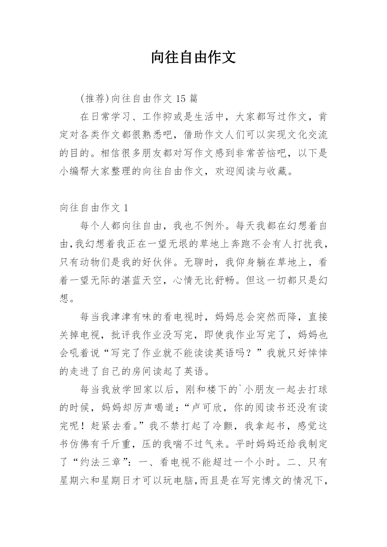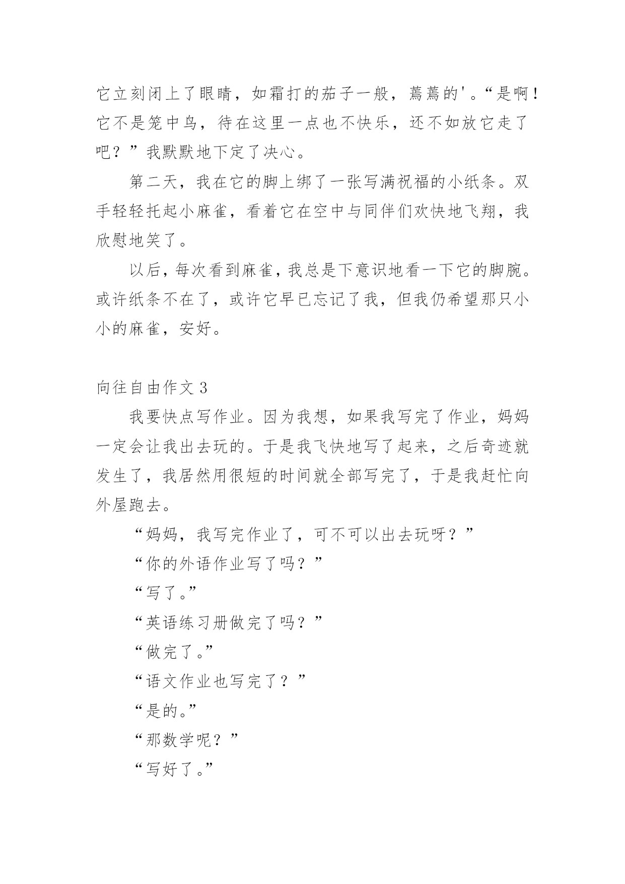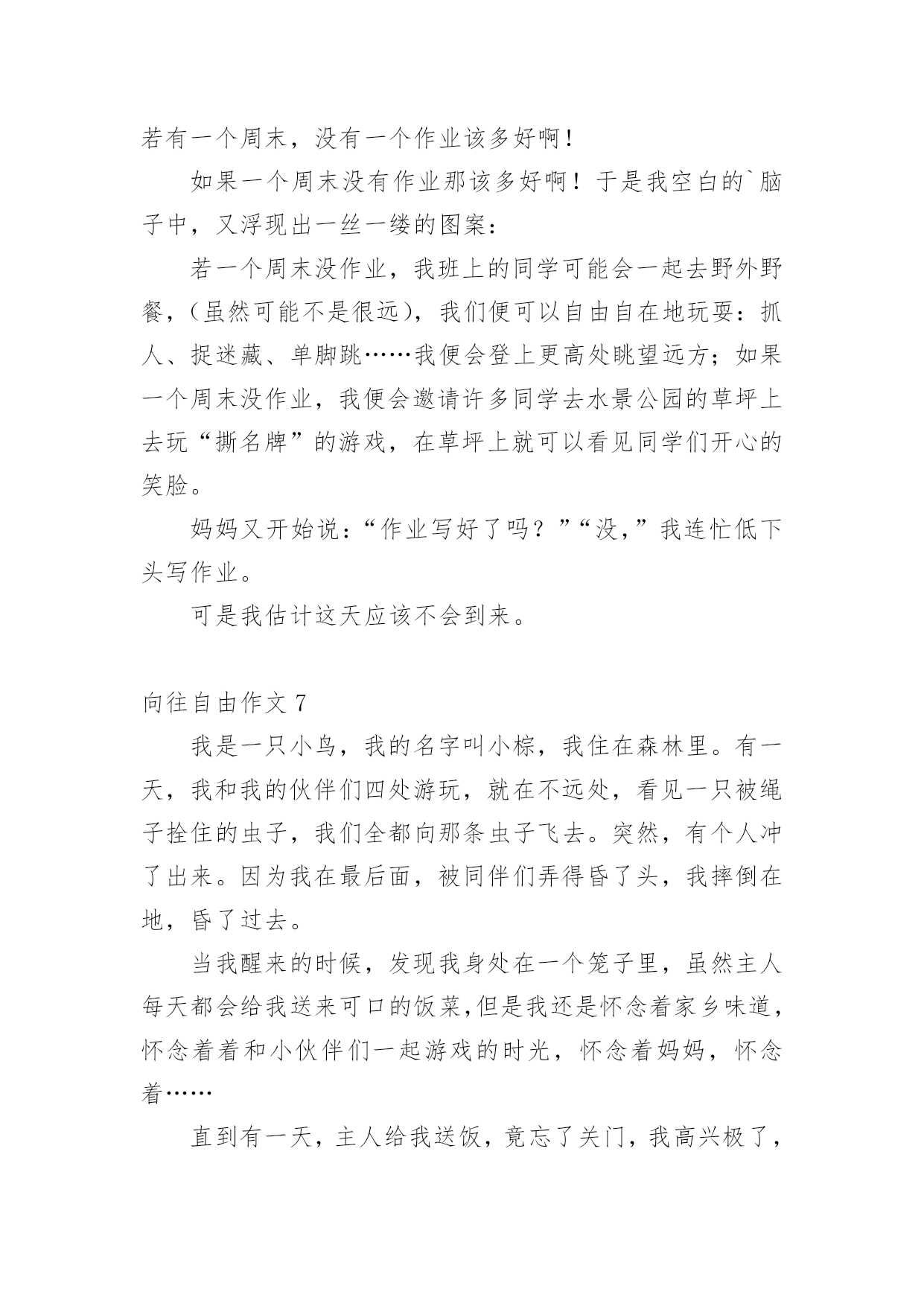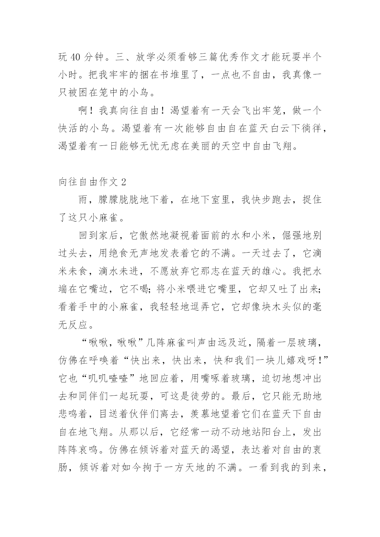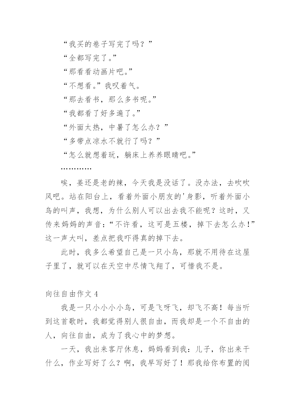 向往自由作文(推荐)向往自由作文15篇在日常学习、工作抑或是生活中,大家都写过作文,肯定对各类作文都很熟悉吧,借助作文人们可以实现文化交流的目的。相信很多朋友都对写作文感到非常苦恼吧,以下是小编帮大家整理的向往自由作文,欢迎阅读与收藏。向往自由作文1每个人都向往自由,我也不例外。每天我都在幻想着自由,我幻想着我正在一望无垠的草地上奔跑不会有人打扰我,只有动物们是我的好伙伴。无聊时,我仰身躺在草地上,看着一望无际的湛蓝天空,心情无比舒畅。但这一切都只是幻想。每当我津津有味的看电视时,妈妈总会突然而降,直接关掉电视,批评我作业没写完,即使我作业写完了,妈妈也会吼着说“写完了作业就不能读读英语吗?”我就只好悻悻的走进了自己的房间读起了英语。每当我放学回家以后,刚和楼下的`小朋友一起去打球的时候,妈妈却厉声喝道:“卢可欣,你的阅读书还没有读完呢!赶紧去看。”我不禁打起了冷颤,我拿起书,感觉这书仿佛有千斤重,压的我喘不过气来。平时妈妈还给我制定了“约法三章”:一、看电视不能超过一个小时。二、只有星期六和星期日才可以玩电脑,而且是在写完博文的情况下,玩40分钟。三、放学必须看够三篇优秀作文才能玩耍半个小时。把我牢牢的捆在书堆里了,一点也不自由,我真像一只被困在笼中的小鸟。啊!我真向往自由!渴望着有一天会飞出牢笼,做一个快活的小鸟。渴望着有一次能够自由自在蓝天白云下徜徉,渴望着有一日能够无忧无虑在美丽的天空中自由飞翔。向往自由作文2雨,朦朦胧胧地下着,在地下室里,我快步跑去,捉住了这只小麻雀。回到家后,它傲然地凝视着面前的水和小米,倔强地别过头去,用绝食无声地发表着它的不满。一天过去了,它滴米未食,滴水未进,不愿放弃它那志在蓝天的雄心。我把水端在它嘴边,它不喝;将小米喂进它嘴里,它却又吐了出来;看着手中的小麻雀,我轻轻地逗弄它,它却像块木头似的毫无反应。“啾啾,啾啾”几阵麻雀叫声由远及近,隔着一层玻璃,仿佛在呼唤着“快出来,快出来,快和我们一块儿嬉戏呀!”它也“叽叽喳喳”地回应着,用嘴啄着玻璃,迫切地想冲出去和同伴们一起玩耍,可这是徒劳的。最后,它只能无助地悲鸣着,目送着伙伴们离去,羡慕地望着它们在蓝天下自由自在地飞翔。从那以后,它经常一动不动地站阳台上,发出阵阵哀鸣。仿佛在倾诉着对蓝天的渴望,表达着对自由的衷肠,倾诉着对如今拘于一方天地的不满。一看到我的到来,它立刻闭上了眼睛,如霜打的茄子一般,蔫蔫的'。“是啊!它不是笼中鸟,待在这里一点也不快乐,还不如放它走了吧?”我默默地下定了决心。第二天,我在它的脚上绑了一张写满祝福的小纸条。双手轻轻托起小麻雀,看着它在空中与同伴们欢快地飞翔,我欣慰地笑了。以后,每次看到麻雀,我总是下意识地看一下它的脚腕。或许纸条不在了,或许它早已忘记了我,但我仍希望那只小小的麻雀,安好。向往自由作文3我要快点写作业。因为我想,如果我写完了作业,妈妈一定会让我出去玩的。于是我飞快地写了起来,之后奇迹就发生了,我居然用很短的时间就全部写完了,于是我赶忙向外屋跑去。“妈妈,我写完作业了,可不可以出去玩呀?”“你的外语作业写了吗?”“写了。”“英语练习册做完了吗?”“做完了。”“语文作业也写完了?”“是的。”“那数学呢?”“写好了。”“我买的卷子写完了吗?”“全都写完了。”“那看看动画片吧。”“不想看。”我叹着气。“那去看书,那么多书呢。”“我都看了好多遍了。”“外面太热,中暑了怎么办?”“多带点凉水不就行了吗?”“怎么就想着玩,躺床上养养眼睛吧。”…………唉,姜还是老的辣,今天我是没话了。没办法,去吹吹风吧。站在阳台上,看着外面小朋友的'身影,听着外面小鸟的叫声,我想,为什么别人可以出去我不能呢?这时,又传来妈妈的声音:“不许看,这可是五楼,掉下去怎么办!”这一声大叫,差点把我吓得真的掉下去。此时,我多么希望自己是一只小鸟,那就不用待在这屋子里了,就可以在天空中尽情飞翔了,可惜我不是。向往自由作文4我是一只小小小小鸟,可是飞呀飞,却飞不高!每当听到这首歌时,我都觉得别人很自由,而我却是一个不自由的人,向往自由,成为了我心中的梦想。一天,我出来客厅休息,妈妈看到我:儿子,你出来干什么,作业写好了么?啊,我早写好了!那我给你布置的阅读题写好了没?还有30道数学题也要做!你还出来玩,都马上考试了,游手好闲一大堆烦人的话让我听得很恼怒,感觉自己就像关在笼子里的小鸟,没有一点自由。我在房间里只有不停地看书,写作业。感觉自己就像被猎人抓住的一只野兽,困在无人岛上没有任何自由我向往自由,想象着自己可以随心所欲地走路,想象着自己骑马在草原上自由奔跑,想象着自己无忧无虑地坐在车上记得一次,妈妈叫我去楼下买盐,但楼下商店没开门,于是我去更远点的地方买盐。突然间,我就觉得自己自由了许多。路上,我看见一辆很帅的跑车,呼的`一声从眼前一晃而