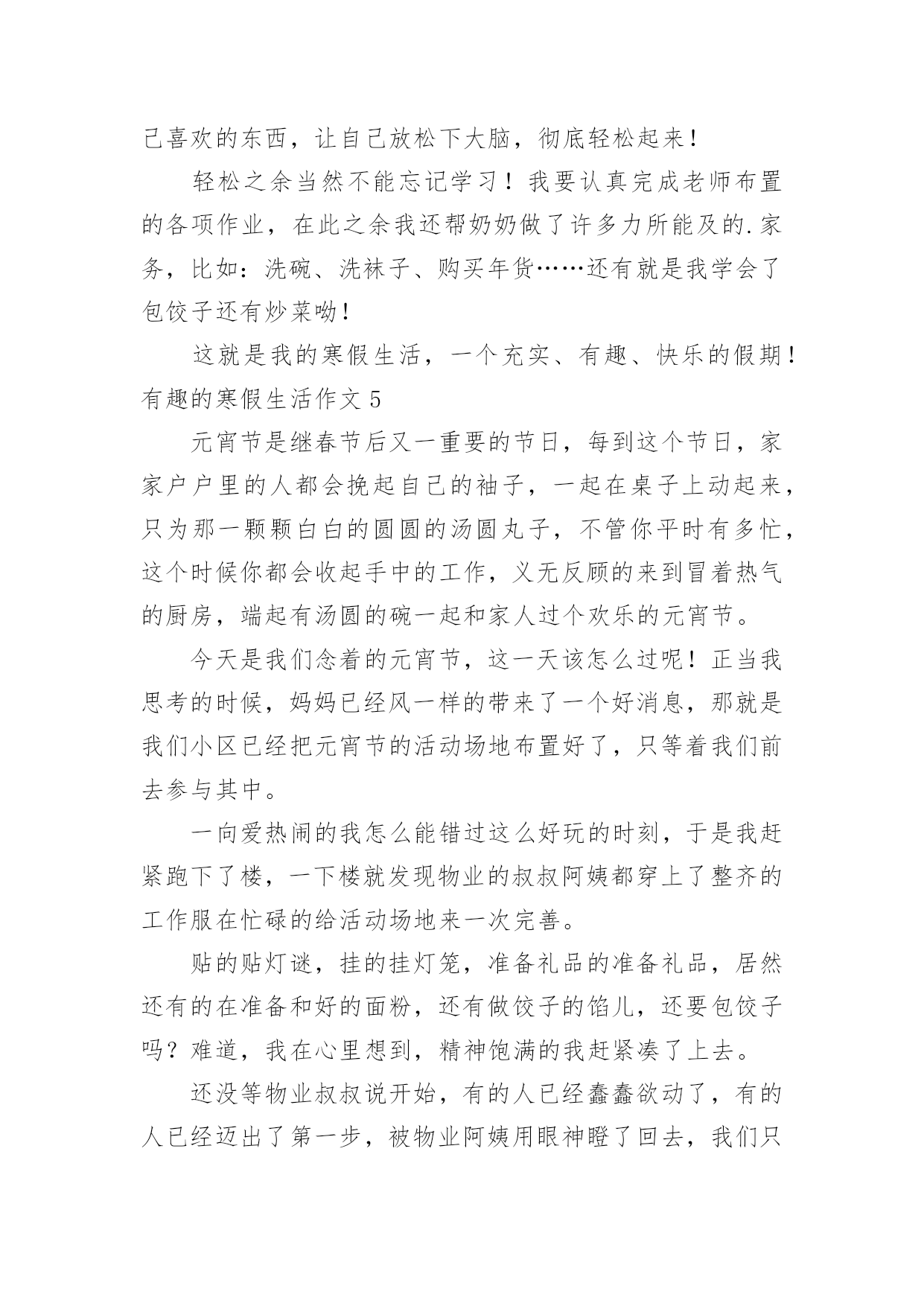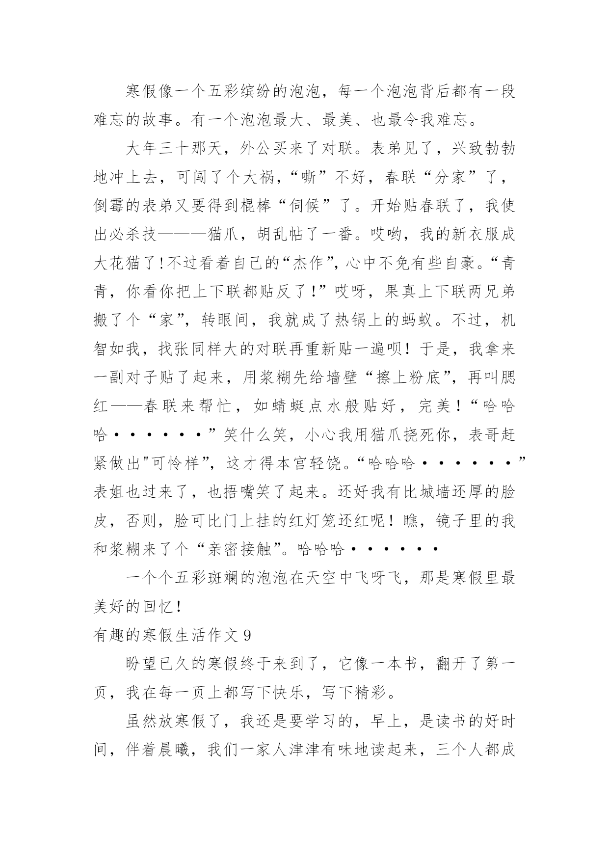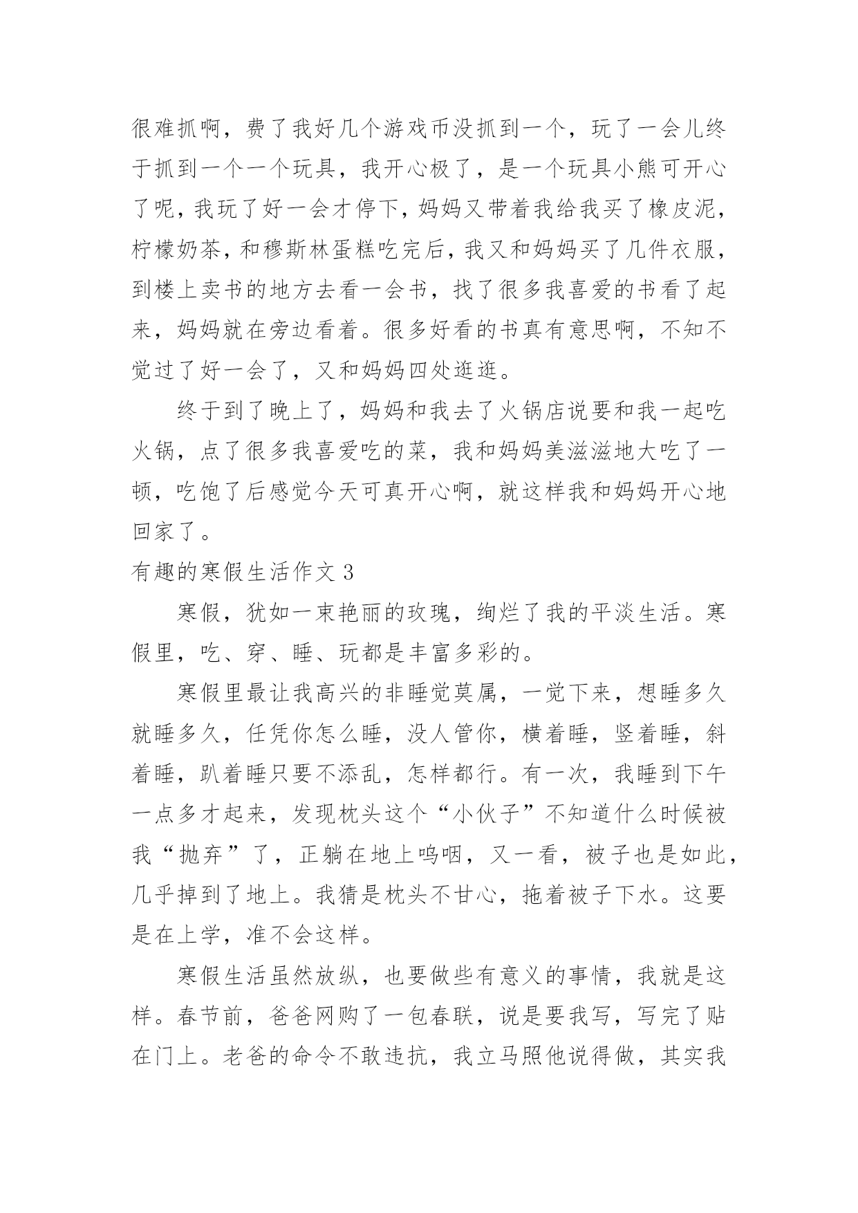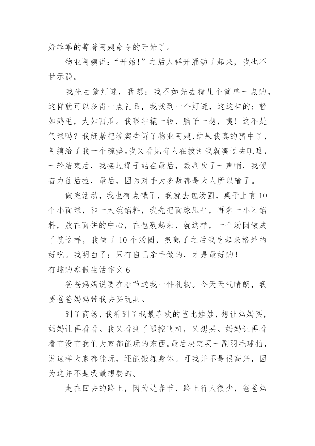 有趣的寒假生活作文有趣的寒假生活作文15篇在平时的学习、工作或生活中,大家都不可避免地要接触到作文吧,作文根据体裁的不同可以分为记叙文、说明文、应用文、议论文。那么,怎么去写作文呢?以下是小编为大家整理的有趣的寒假生活作文,欢迎阅读,希望大家能够喜欢。有趣的寒假生活作文1眼看寒假将近了,大家都在细心筹划着自己的假期生活。大家都在默默地期盼着假期的来临,我们可以通过假期来完成某些我们想要完成的事情。假期终于来临了,大家的假期生活开始了。首先我们回到了久别的家里,来到家里大家都吃到了父母为我们准备的丰盛的饭菜。然后大家都洗了一个热水澡,洗去了自己身上的风尘。我们开始自己理想的假期生活了,说实话我的假期生活之中不包含学习哟。我首先去了我家附近同学的家,去他们的家里和他们一起玩耍。慢慢长假一个人在家玩不是很无聊吗?大家一起玩不是很好嘛?然后我开始努力筹钱准备去外地玩耍。我打算在这个寒假我可以去外面的世界看看,领略一下外面的奇异风光。于是,在我的努力下,我终于攒够了钱,随着旅游社我们一行来到了云南。大家都说:“云南山水甲天下”。今天一见果然与众不同啊!云南的风景是那么的美丽迷人,云南的水是那样的清澈,那高山是那样的挺拔。看到这美丽的风景,我感叹到了大自然的神奇啊!我同时也明白到了,人要多出去走走开阔自己的视野,不要一直在自己所处的环境里面,犹如坐井观天一般,将自己的视野越看越小。这就是我的假期生活,我觉得我的假期生活非常的开心,非常的充实。有趣的寒假生活作文2同学们,放寒假那么久,应该有不少开心或重要的事情吧,来看看我寒假里的趣事吧。放寒假了,放寒假了,考完试后,我回到家里兴奋地大喊着。别喊了,妈妈说了一句,学习要是有如此兴致就好了,我立马就不喊了,心里还是很开心,妈妈说放假了,那我就带着你去大润发好好玩一下,放松一下吧,妈妈说完,顿时我高兴得活蹦乱跳。到了大润发后,一进来就人山人海,人声鼎沸,里面有好多考完试来玩的孩子,我们先来到一楼,妈妈给我买了一些好吃的,可香了呢,妈妈又给我买了一些发卡,真漂亮呀,我们来到了二楼,里面有卖衣服的,玩了一会儿又到了四楼有好多游戏机。妈妈给我买了一些游戏币,我喜欢玩抓娃娃,可是娃娃很难抓啊,费了我好几个游戏币没抓到一个,玩了一会儿终于抓到一个一个玩具,我开心极了,是一个玩具小熊可开心了呢,我玩了好一会才停下,妈妈又带着我给我买了橡皮泥,柠檬奶茶,和穆斯林蛋糕吃完后,我又和妈妈买了几件衣服,到楼上卖书的地方去看一会书,找了很多我喜爱的书看了起来,妈妈就在旁边看着。很多好看的书真有意思啊,不知不觉过了好一会了,又和妈妈四处逛逛。终于到了晚上了,妈妈和我去了火锅店说要和我一起吃火锅,点了很多我喜爱吃的菜,我和妈妈美滋滋地大吃了一顿,吃饱了后感觉今天可真开心啊,就这样我和妈妈开心地回家了。有趣的寒假生活作文3寒假,犹如一束艳丽的玫瑰,绚烂了我的平淡生活。寒假里,吃、穿、睡、玩都是丰富多彩的。寒假里最让我高兴的非睡觉莫属,一觉下来,想睡多久就睡多久,任凭你怎么睡,没人管你,横着睡,竖着睡,斜着睡,趴着睡只要不添乱,怎样都行。有一次,我睡到下午一点多才起来,发现枕头这个“小伙子”不知道什么时候被我“抛弃”了,正躺在地上呜咽,又一看,被子也是如此,几乎掉到了地上。我猜是枕头不甘心,拖着被子下水。这要是在上学,准不会这样。寒假生活虽然放纵,也要做些有意义的事情,我就是这样。春节前,爸爸网购了一包春联,说是要我写,写完了贴在门上。老爸的命令不敢违抗,我立马照他说得做,其实我也挺乐意的。但这份热情坚持了没多久,我才刚写完一个横批,就受不了了,对老爸话说:“爸,我写不了,要不你来写吧!”原以为老爸不会同意,没想到老爸很快就答应了,可惜老爸也没坚持多久,我们就轮流着写。终于,我们在当天傍晚时,把五幅春联都写好了,看着写好的春联,我心中有着满满的成就感。等到第二天早上,我和爸爸齐力把春联贴在门上,我心里可激动了!寒假里吃的东西应有尽有:饮料、大虾、大闸蟹、鱼、牛肉各种山珍海味,吃得可爽了。快乐的时间总是那么短暂,现在寒假留给我们的只是美好的回忆。有趣的寒假生活作文4时间过的真快!不知不觉我的寒假生活就要过去了。寒假是轻松和愉快的!可我不想因为轻松而随心所欲的玩,应该劳逸结合,在玩的同时不忘充实自己,给自己补充点课外的知识营养!短暂的寒假和忙碌于工作的妈妈没有时间允许我去外地游玩。因而我去的最多的就是书店了。我喜欢在那浩瀚的书海中遨游……“书中自有黄金屋,书中自有颜如玉”,一点儿不错,从科普图书到中外名著,一个个不断增加的知识在启蒙我教导我,真是受益匪浅呀!下午时分,我会去公园跳绳、玩双杆,骑车或者轮滑。这个寒假中的两场雪天更让我淋漓尽致的玩个痛快!当然我也会玩玩电脑,看看电视电影,陪妈妈逛逛街,收集下自己喜欢的东西,让自己