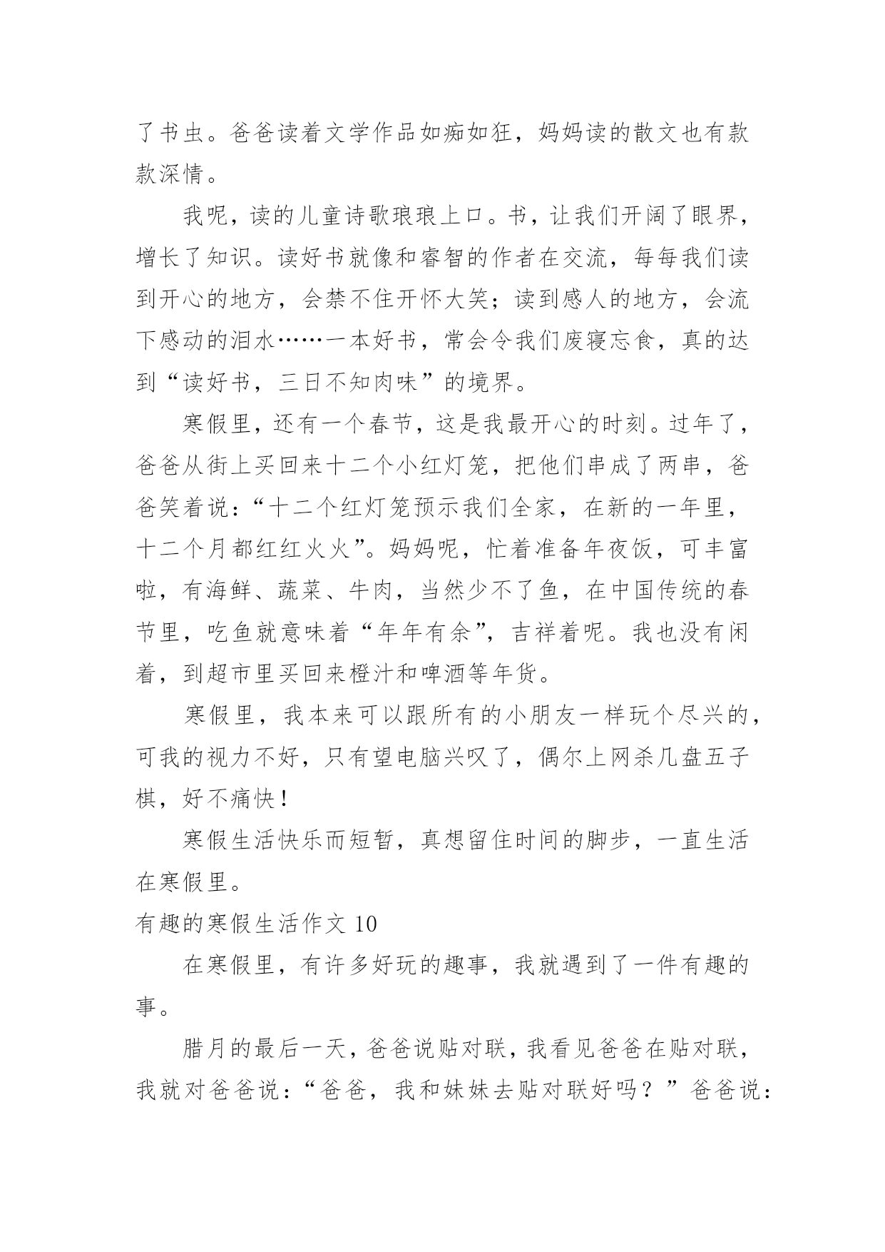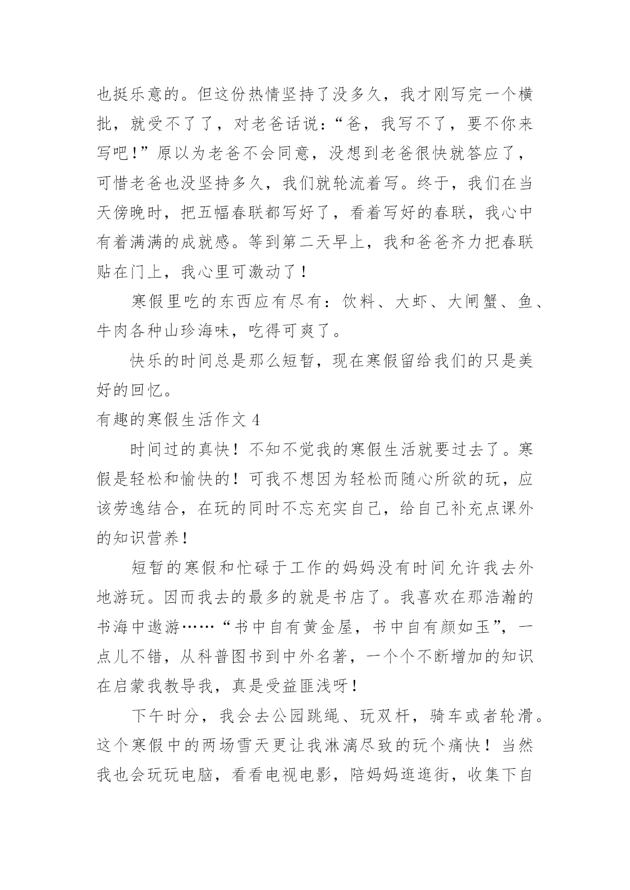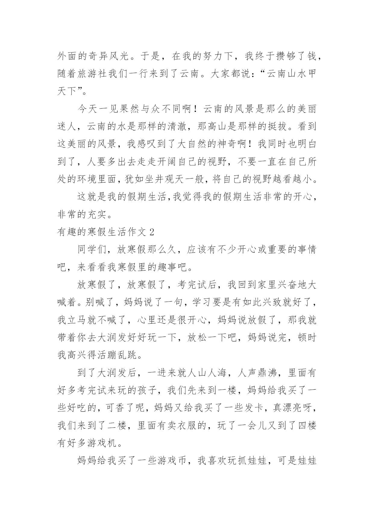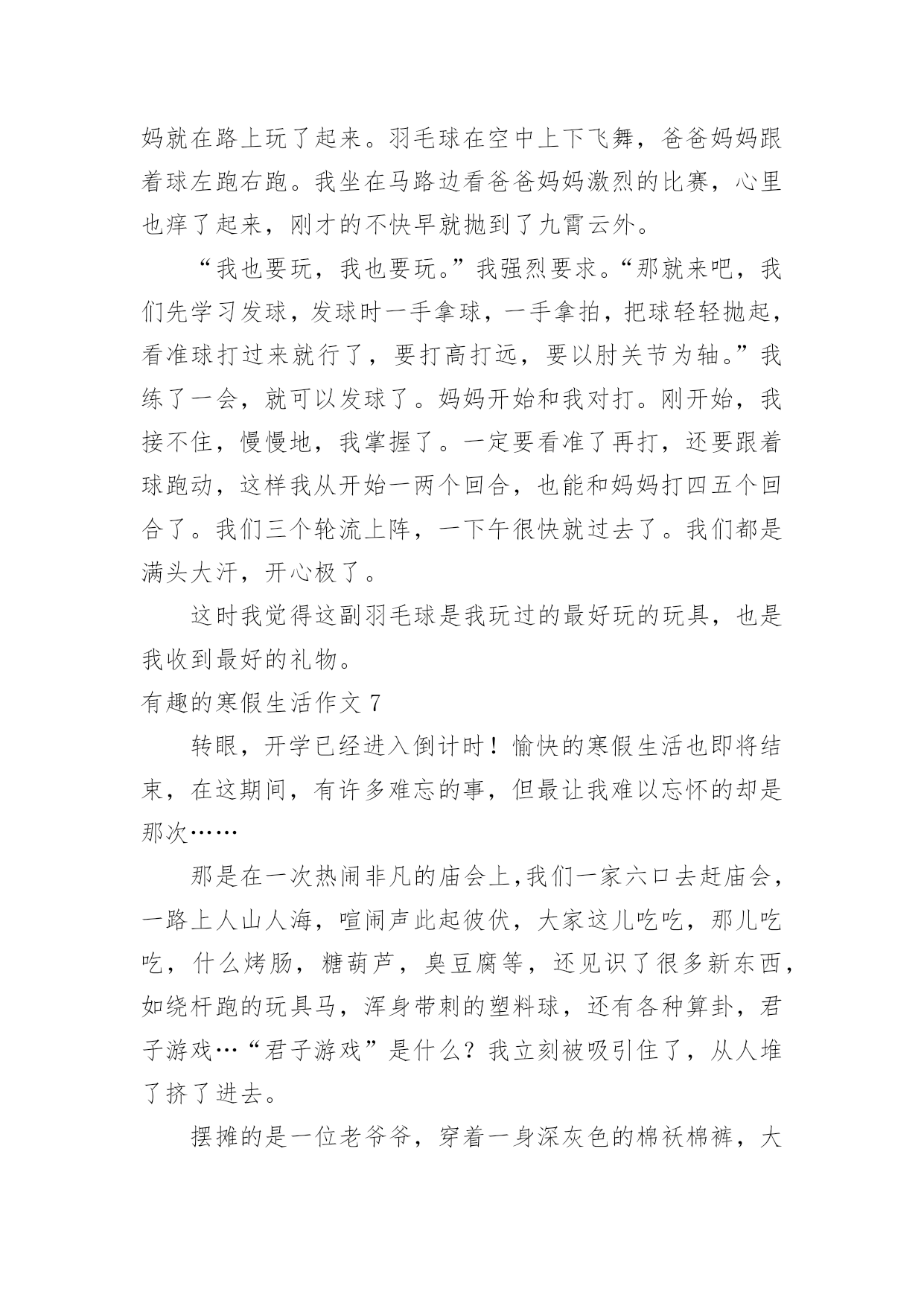 有趣的寒假生活作文有趣的寒假生活作文15篇在平时的学习、工作或生活中,大家都不可避免地要接触到作文吧,作文根据体裁的不同可以分为记叙文、说明文、应用文、议论文。那么,怎么去写作文呢?以下是小编为大家整理的有趣的寒假生活作文,欢迎阅读,希望大家能够喜欢。有趣的寒假生活作文1眼看寒假将近了,大家都在细心筹划着自己的假期生活。大家都在默默地期盼着假期的来临,我们可以通过假期来完成某些我们想要完成的事情。假期终于来临了,大家的假期生活开始了。首先我们回到了久别的家里,来到家里大家都吃到了父母为我们准备的丰盛的饭菜。然后大家都洗了一个热水澡,洗去了自己身上的风尘。我们开始自己理想的假期生活了,说实话我的假期生活之中不包含学习哟。我首先去了我家附近同学的家,去他们的家里和他们一起玩耍。慢慢长假一个人在家玩不是很无聊吗?大家一起玩不是很好嘛?然后我开始努力筹钱准备去外地玩耍。我打算在这个寒假我可以去外面的世界看看,领略一下外面的奇异风光。于是,在我的努力下,我终于攒够了钱,随着旅游社我们一行来到了云南。大家都说:“云南山水甲天下”。今天一见果然与众不同啊!云南的风景是那么的美丽迷人,云南的水是那样的清澈,那高山是那样的挺拔。看到这美丽的风景,我感叹到了大自然的神奇啊!我同时也明白到了,人要多出去走走开阔自己的视野,不要一直在自己所处的环境里面,犹如坐井观天一般,将自己的视野越看越小。这就是我的假期生活,我觉得我的假期生活非常的开心,非常的充实。有趣的寒假生活作文2同学们,放寒假那么久,应该有不少开心或重要的事情吧,来看看我寒假里的趣事吧。放寒假了,放寒假了,考完试后,我回到家里兴奋地大喊着。别喊了,妈妈说了一句,学习要是有如此兴致就好了,我立马就不喊了,心里还是很开心,妈妈说放假了,那我就带着你去大润发好好玩一下,放松一下吧,妈妈说完,顿时我高兴得活蹦乱跳。到了大润发后,一进来就人山人海,人声鼎沸,里面有好多考完试来玩的孩子,我们先来到一楼,妈妈给我买了一些好吃的,可香了呢,妈妈又给我买了一些发卡,真漂亮呀,我们来到了二楼,里面有卖衣服的,玩了一会儿又到了四楼有好多游戏机。妈妈给我买了一些游戏币,我喜欢玩抓娃娃,可是娃娃很难抓啊,费了我好几个游戏币没抓到一个,玩了一会儿终于抓到一个一个玩具,我开心极了,是一个玩具小熊可开心了呢,我玩了好一会才停下,妈妈又带着我给我买了橡皮泥,柠檬奶茶,和穆斯林蛋糕吃完后,我又和妈妈买了几件衣服,到楼上卖书的地方去看一会书,找了很多我喜爱的书看了起来,妈妈就在旁边看着。很多好看的书真有意思啊,不知不觉过了好一会了,又和妈妈四处逛逛。终于到了晚上了,妈妈和我去了火锅店说要和我一起吃火锅,点了很多我喜爱吃的菜,我和妈妈美滋滋地大吃了一顿,吃饱了后感觉今天可真开心啊,就这样我和妈妈开心地回家了。有趣的寒假生活作文3寒假,犹如一束艳丽的玫瑰,绚烂了我的平淡生活。寒假里,吃、穿、睡、玩都是丰富多彩的。寒假里最让我高兴的非睡觉莫属,一觉下来,想睡多久就睡多久,任凭你怎么睡,没人管你,横着睡,竖着睡,斜着睡,趴着睡只要不添乱,怎样都行。有一次,我睡到下午一点多才起来,发现枕头这个“小伙子”不知道什么时候被我“抛弃”了,正躺在地上呜咽,又一看,被子也是如此,几乎掉到了地上。我猜是枕头不甘心,拖着被子下水。这要是在上学,准不会这样。寒假生活虽然放纵,也要做些有意义的事情,我就是这样。春节前,爸爸网购了一包春联,说是要我写,写完了贴在门上。老爸的命令不敢违抗,我立马照他说得做,其实我也挺乐意的。但这份热情坚持了没多久,我才刚写完一个横批,就受不了了,对老爸话说:“爸,我写不了,要不你来写吧!”原以为老爸不会同意,没想到老爸很快就答应了,可惜老爸也没坚持多久,我们就轮流着写。终于,我们在当天傍晚时,把五幅春联都写好了,看着写好的春联,我心中有着满满的成就感。等到第二天早上,我和爸爸齐力把春联贴在门上,我心里可激动了!寒假里吃的东西应有尽有:饮料、大虾、大闸蟹、鱼、牛肉各种山珍海味,吃得可爽了。快乐的时间总是那么短暂,现在寒假留给我们的只是美好的回忆。有趣的寒假生活作文4时间过的真快!不知不觉我的寒假生活就要过去了。寒假是轻松和愉快的!可我不想因为轻松而随心所欲的玩,应该劳逸结合,在玩的同时不忘充实自己,给自己补充点课外的知识营养!短暂的寒假和忙碌于工作的妈妈没有时间允许我去外地游玩。因而我去的最多的就是书店了。我喜欢在那浩瀚的书海中遨游……“书中自有黄金屋,书中自有颜如玉”,一点儿不错,从科普图书到中外名著,一个个不断增加的知识在启蒙我教导我,真是受益匪浅呀!下午时分,我会去公园跳绳、玩双杆,骑车或者轮滑。这个寒假中的两场雪天更让我淋漓尽致的玩个痛快!当然我也会玩玩电脑,看看电视电影,陪妈妈逛逛街,收集下自己喜欢的东西,让自己